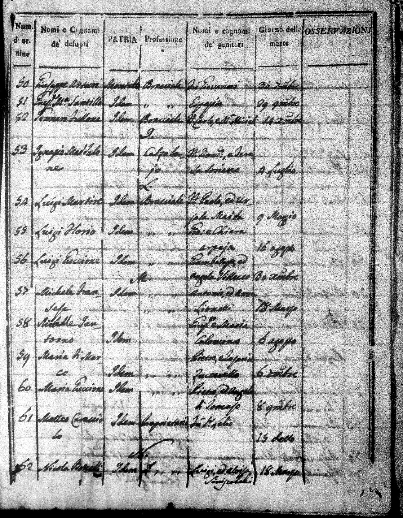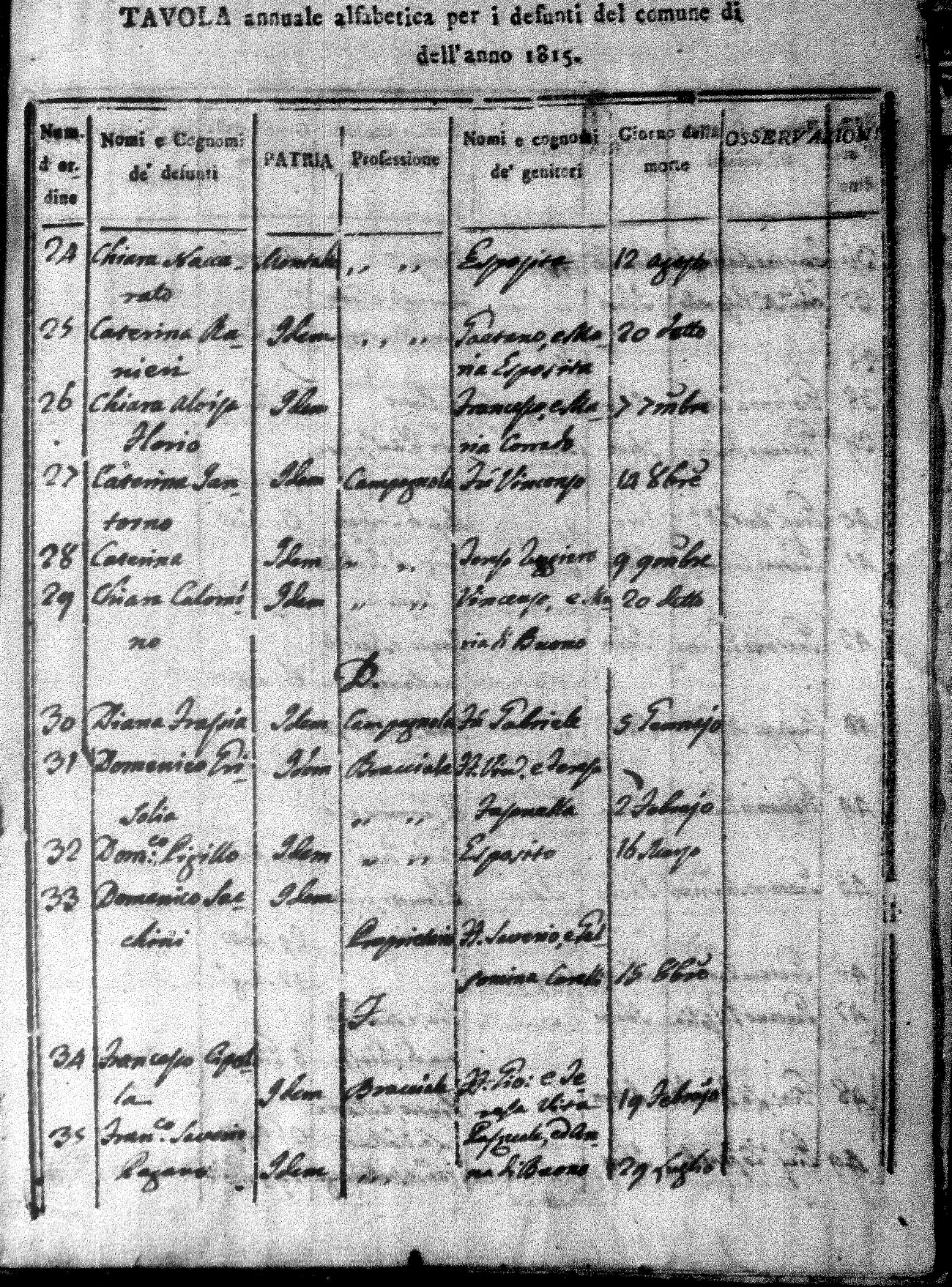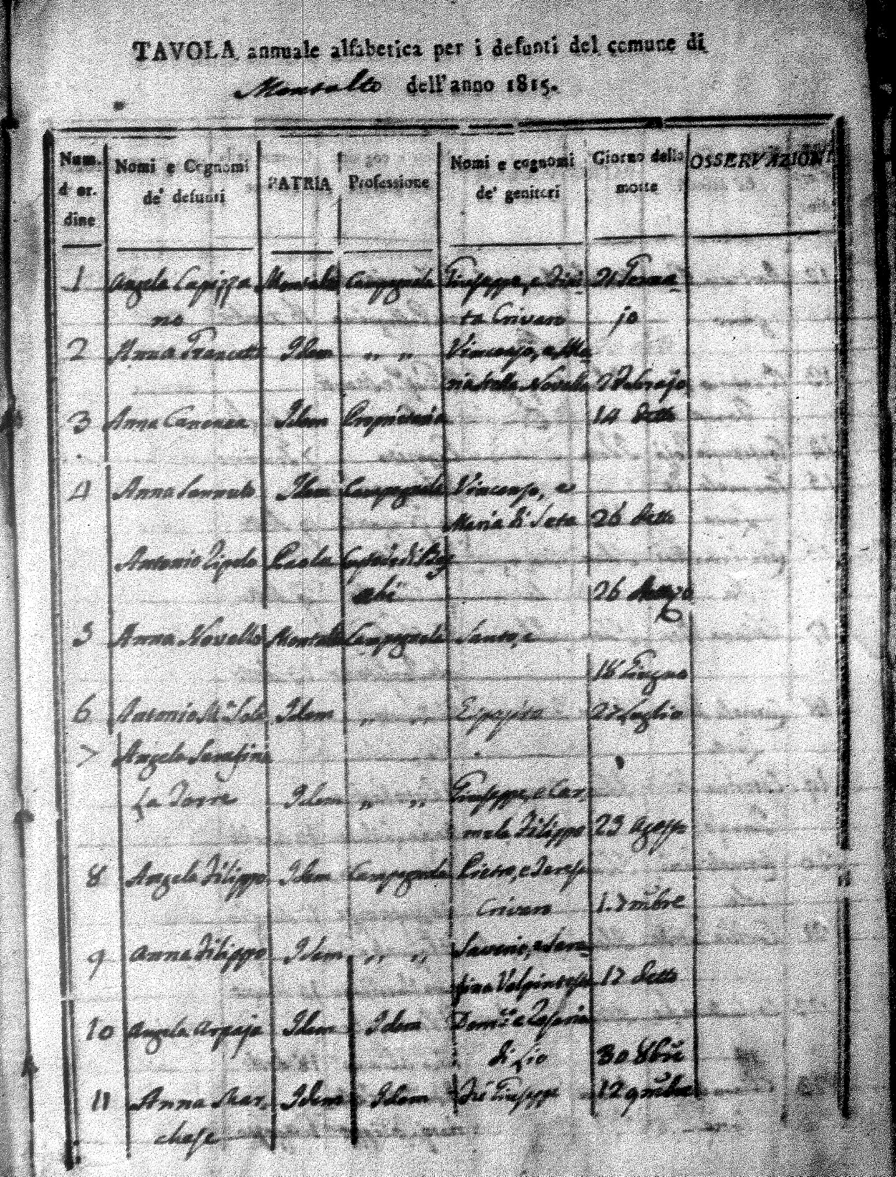 Here are the indexes for all the death acts in 1815 for Montalto Uffugo. On these indexes you can see the name of the deceased followed by their parents names. They also give the place of death, profession and date of death. I hope to have copies of the actual acts here at some point in the future. For now, most of the pertinent data can be seen on the index. These indexes are in alphabetical order of first name, not surname.