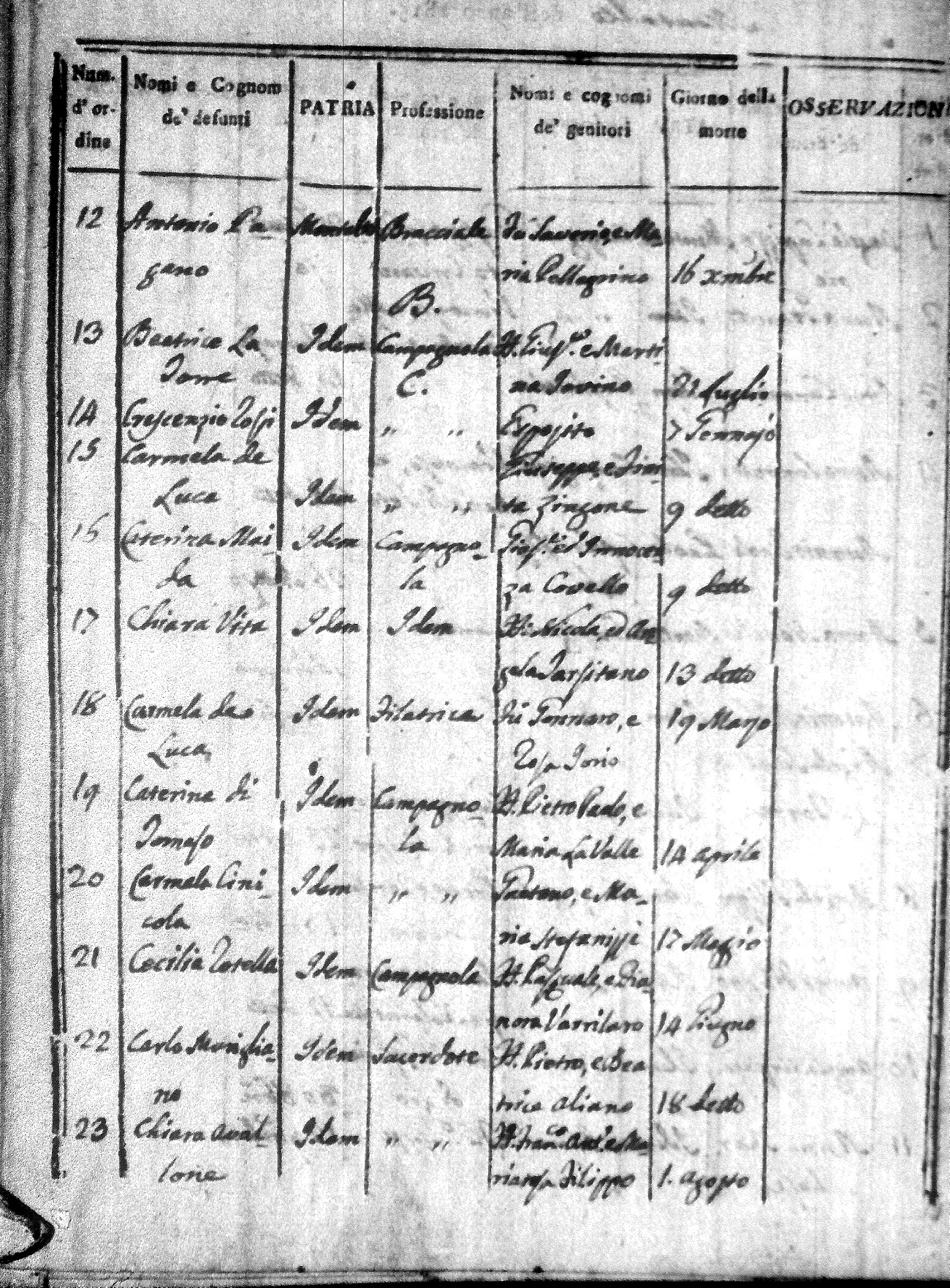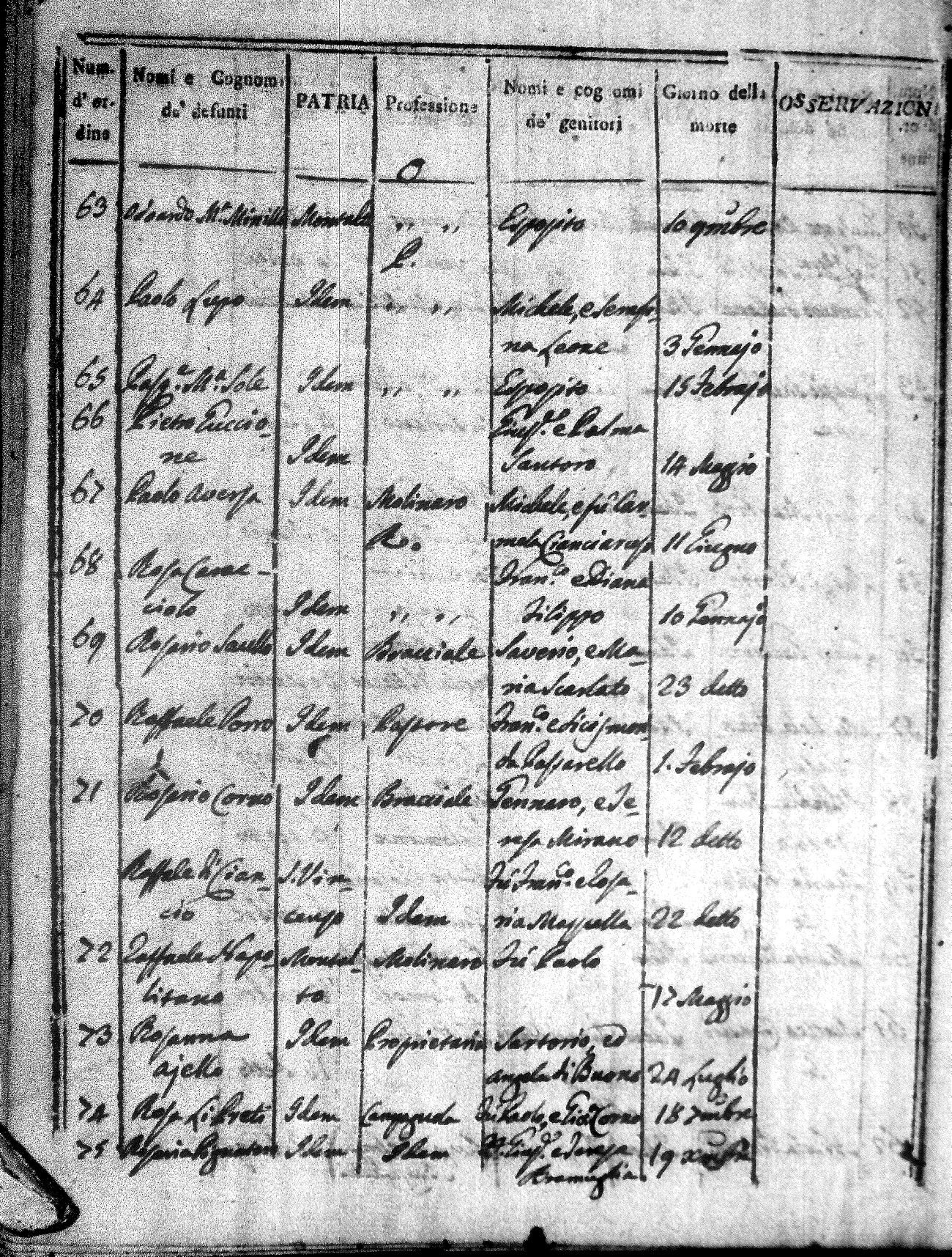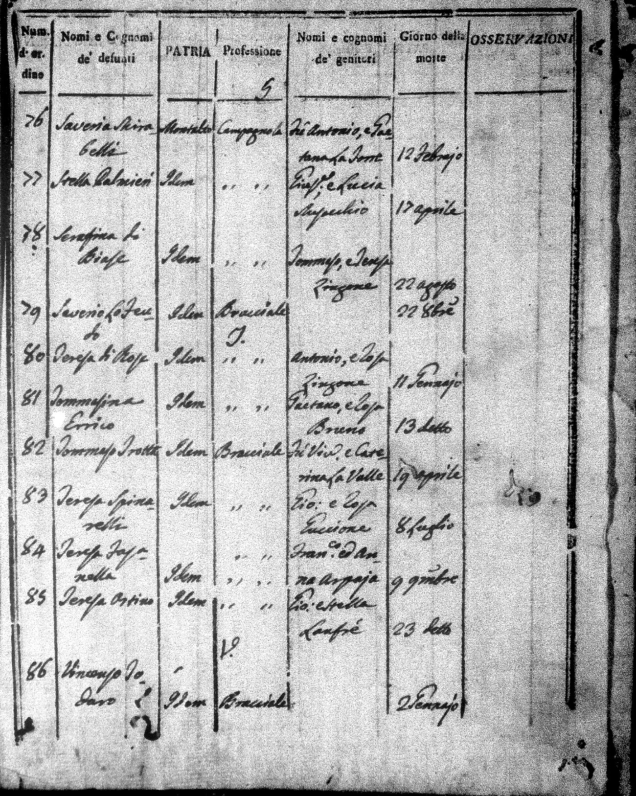 Here are the indexes for all the death acts in 1815 for Montalto Uffugo. On these indexes you can see the name of the deceased followed by their parents names. They also give the place of death, profession and date of death. I hope to have copies of the actual acts here at some point in the future. For now, most of the pertinent data can be seen on the index. These indexes are in alphabetical order of first name, not surname.