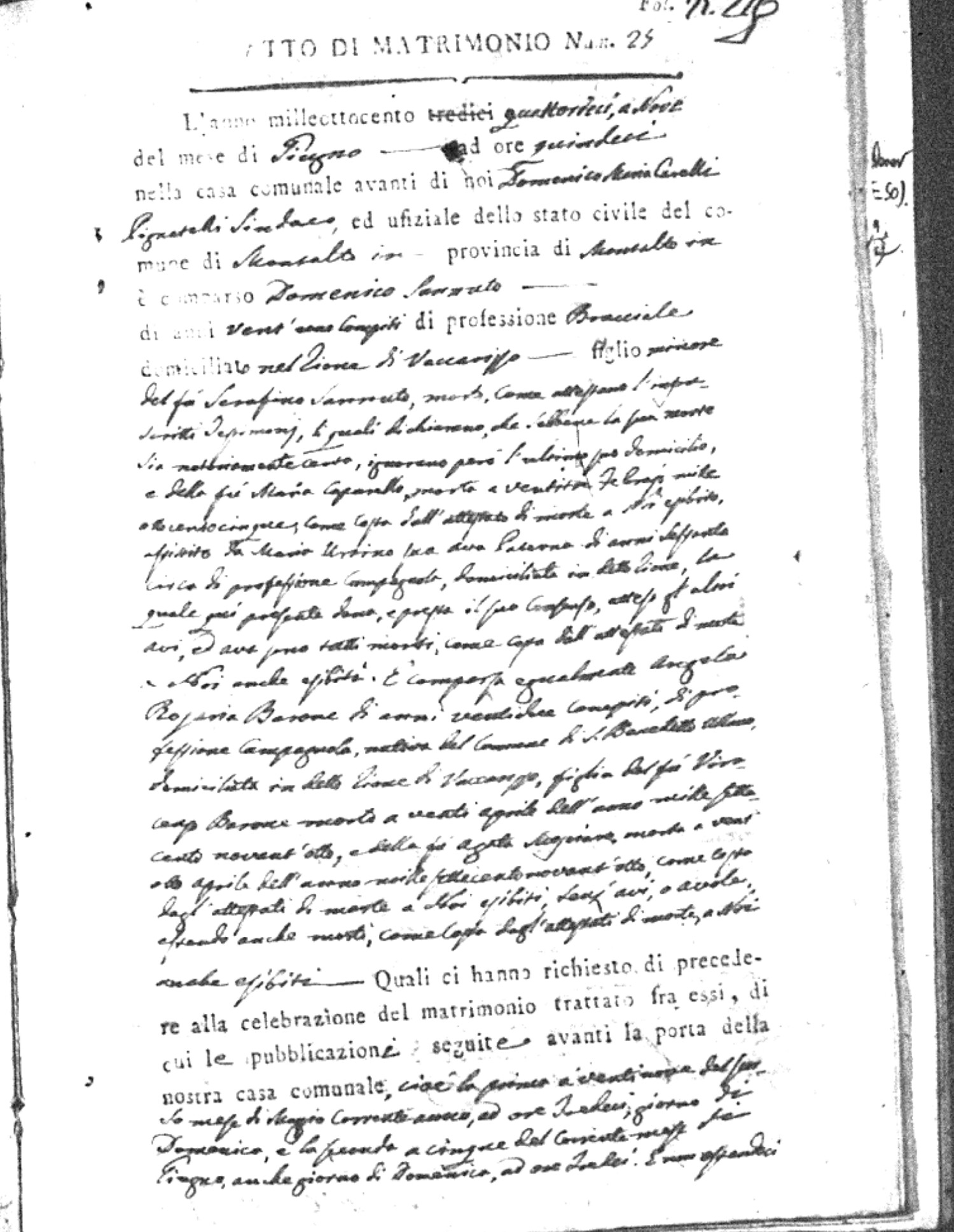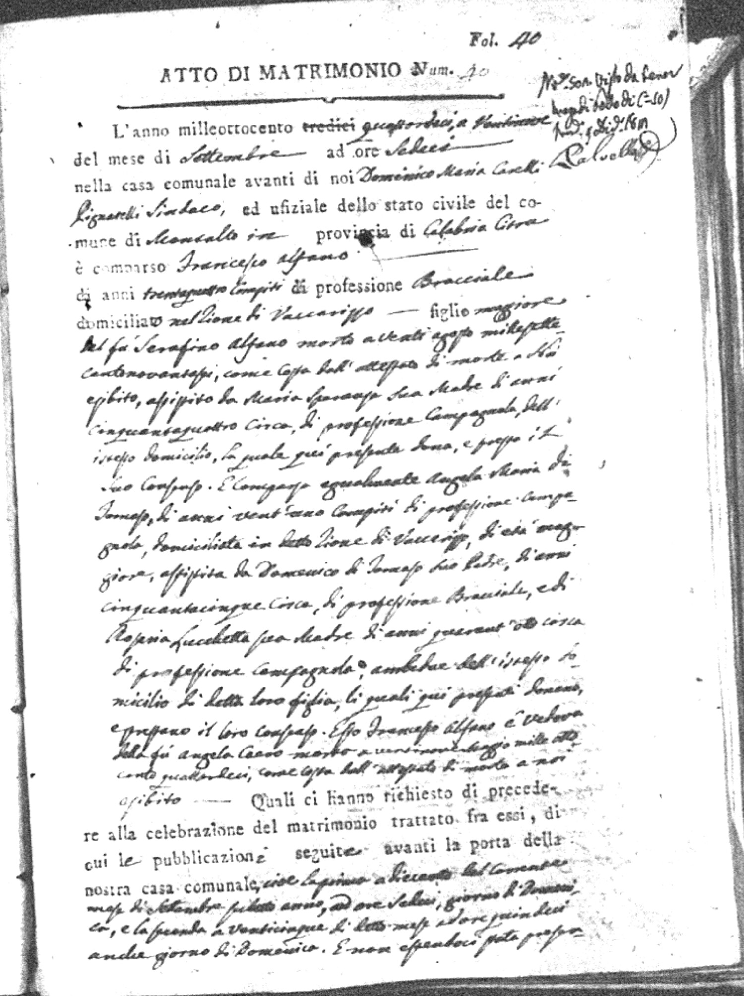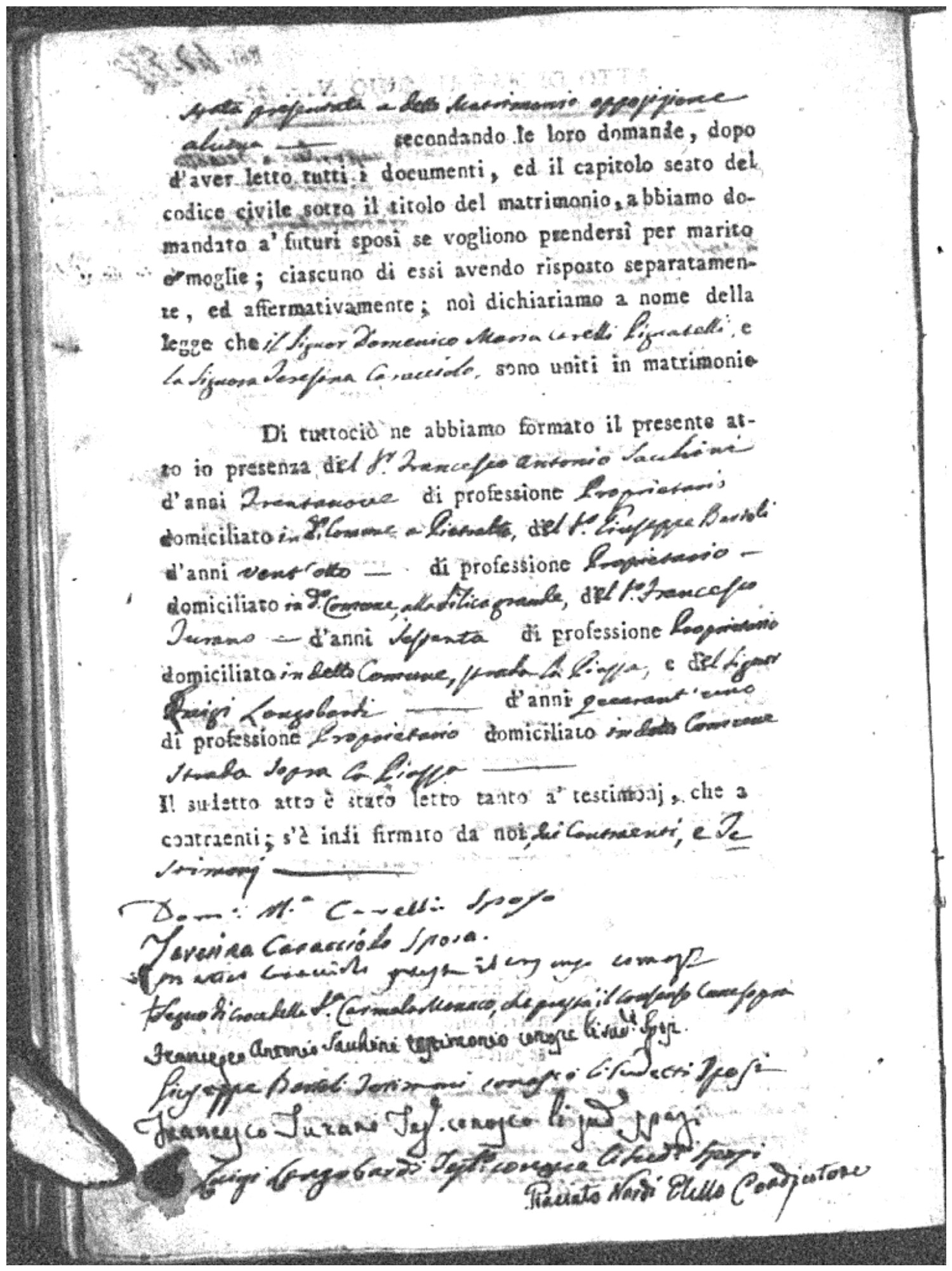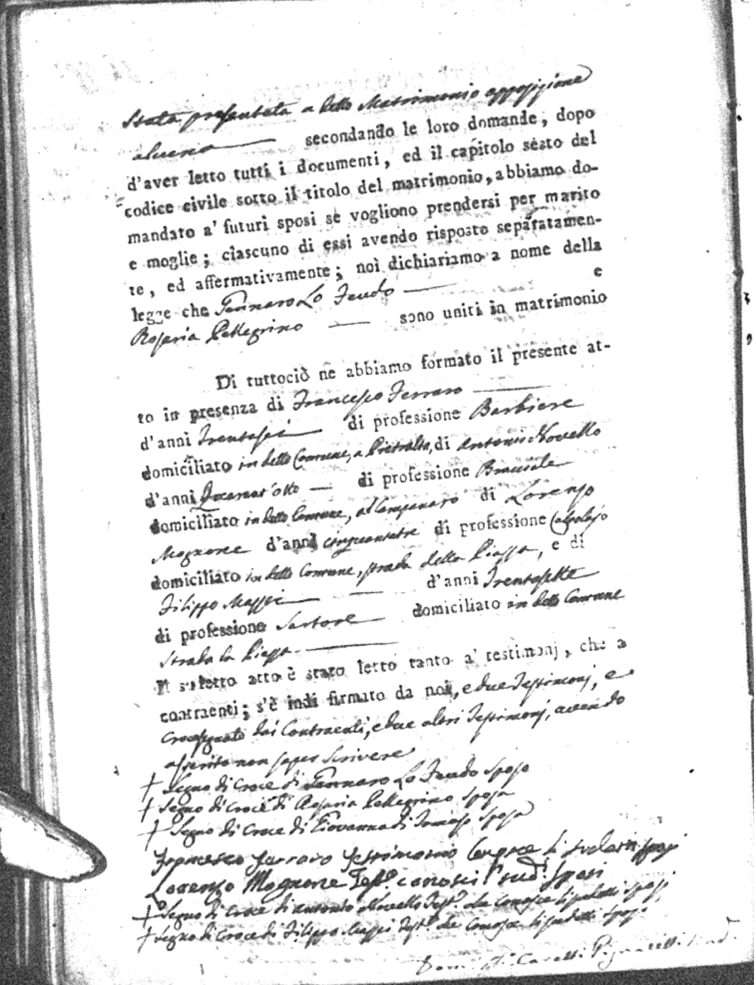 | Sannuto | Domenico | Serofino (fu) | Caparello | Maria (fu) | Barone | Angela Rosaria | Vincenzo (fu) | Mosciaro | Agata (fu) |