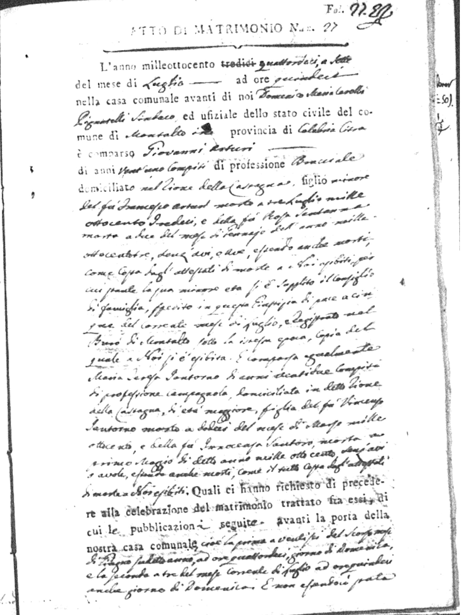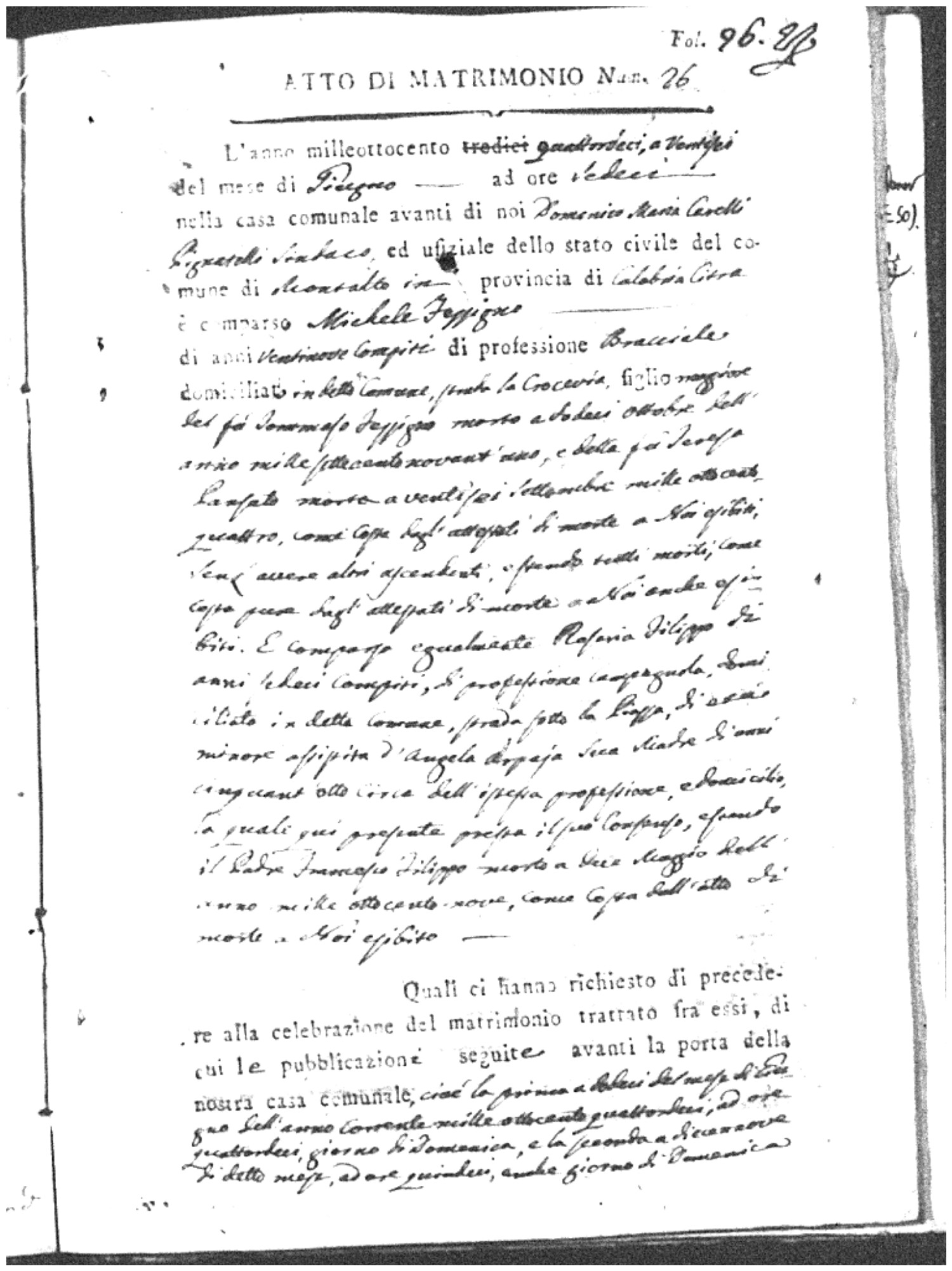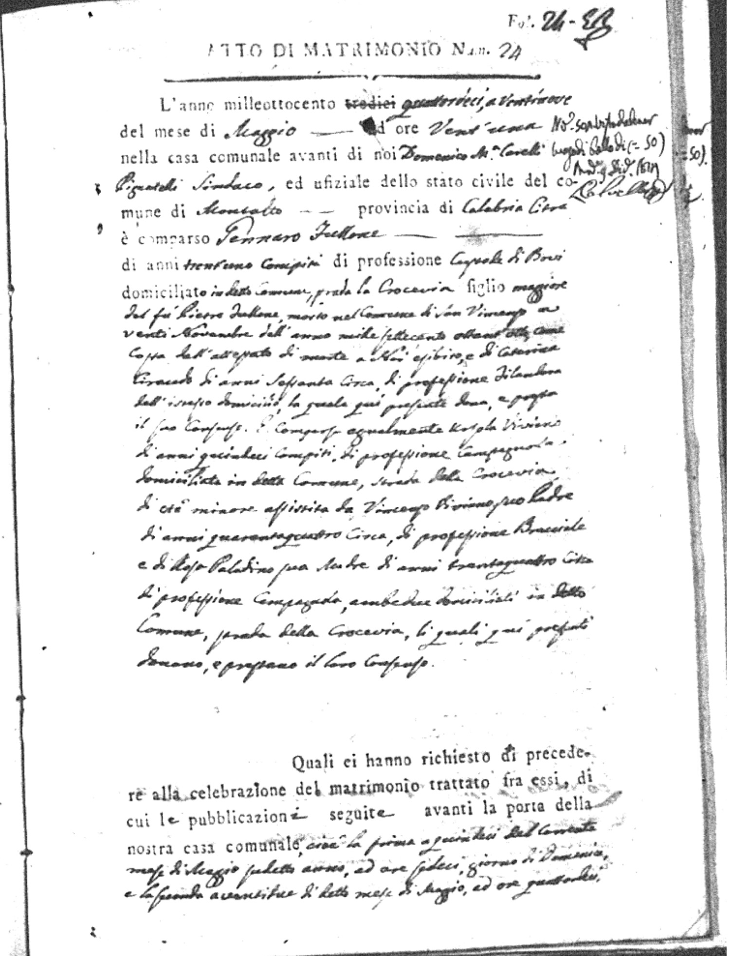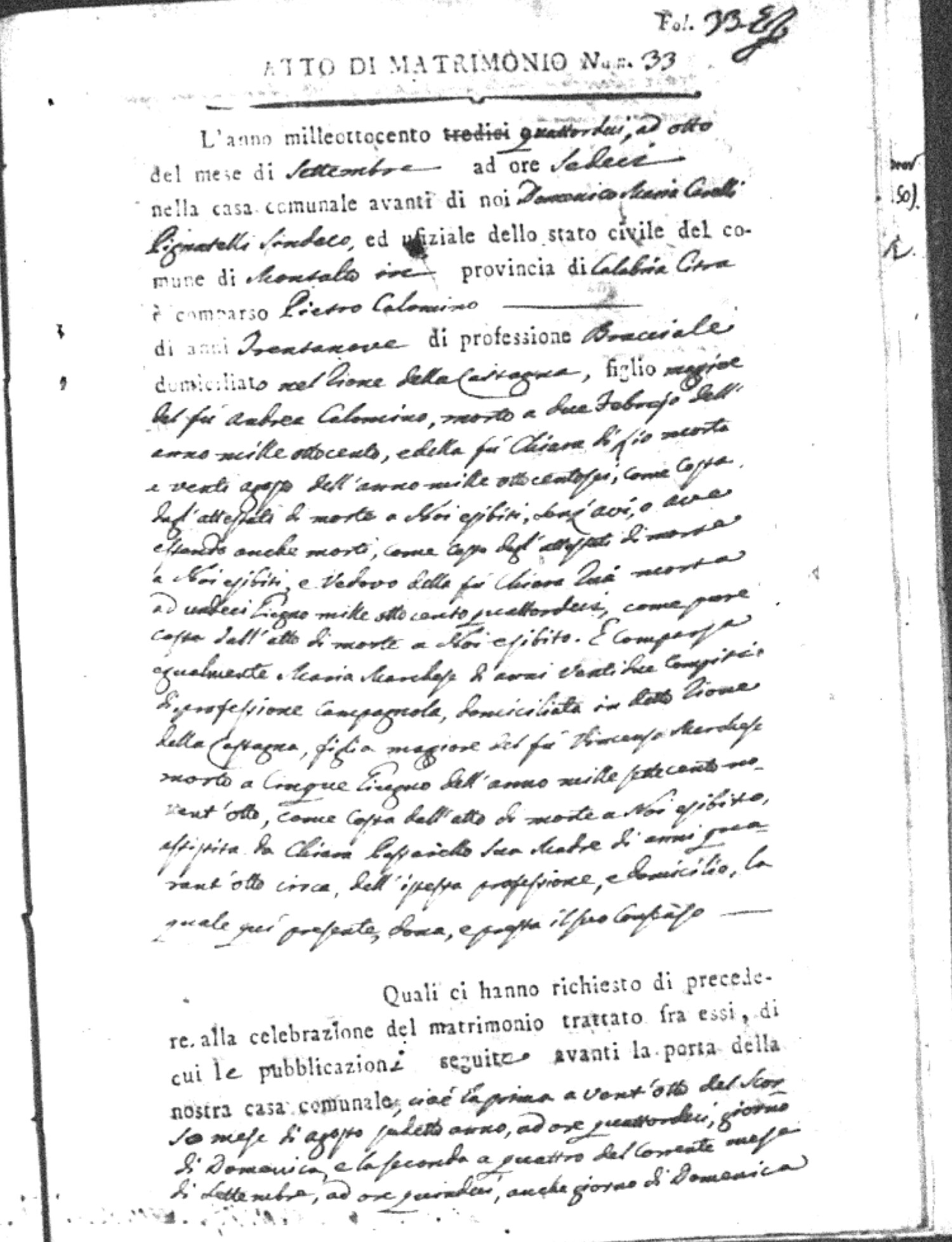 Here are the extractions for all the marriage acts in 1814 for Montalto Uffugo. This year is complete. For more information, click on the groom's surname to view a copy of the original document.