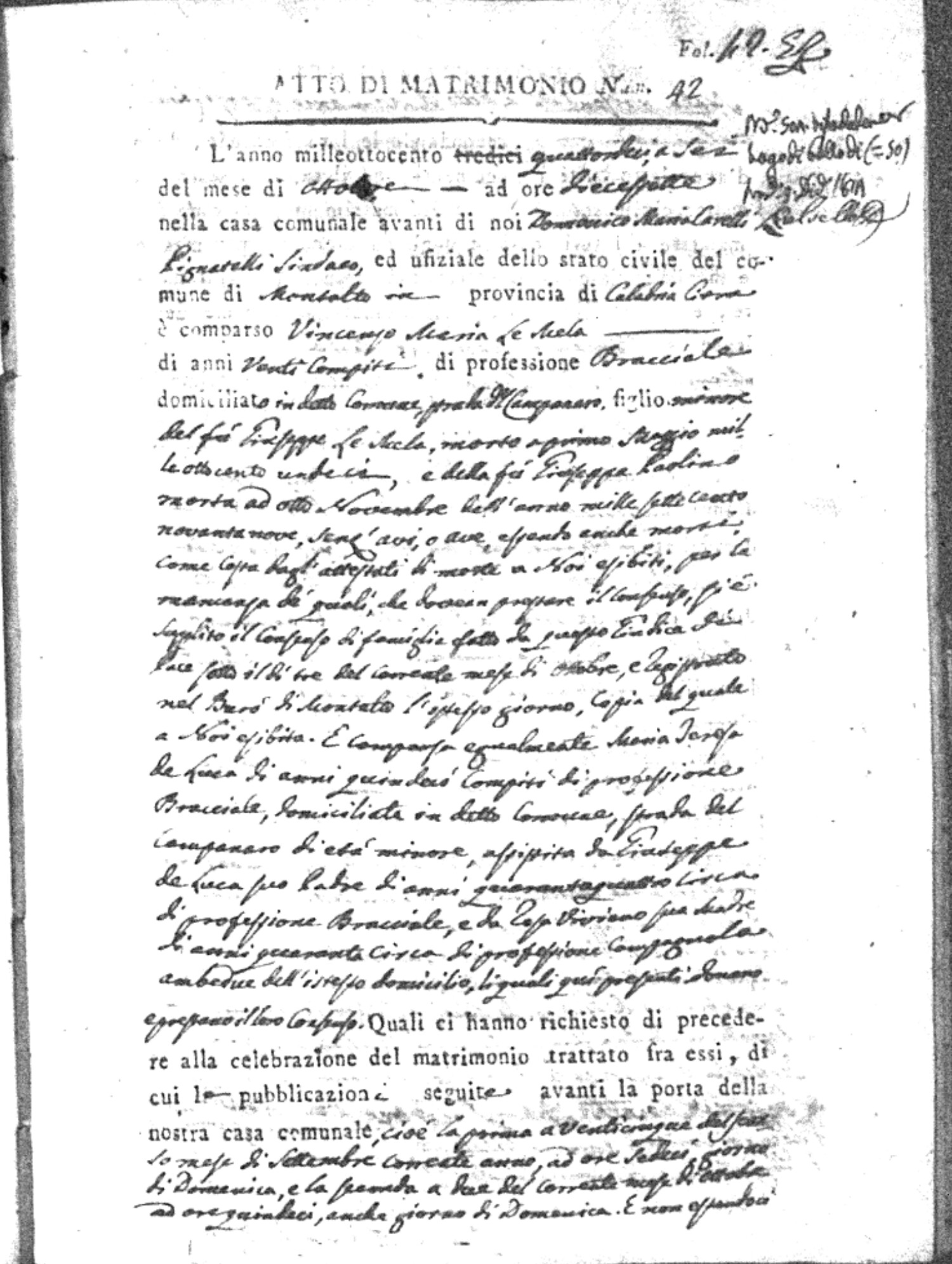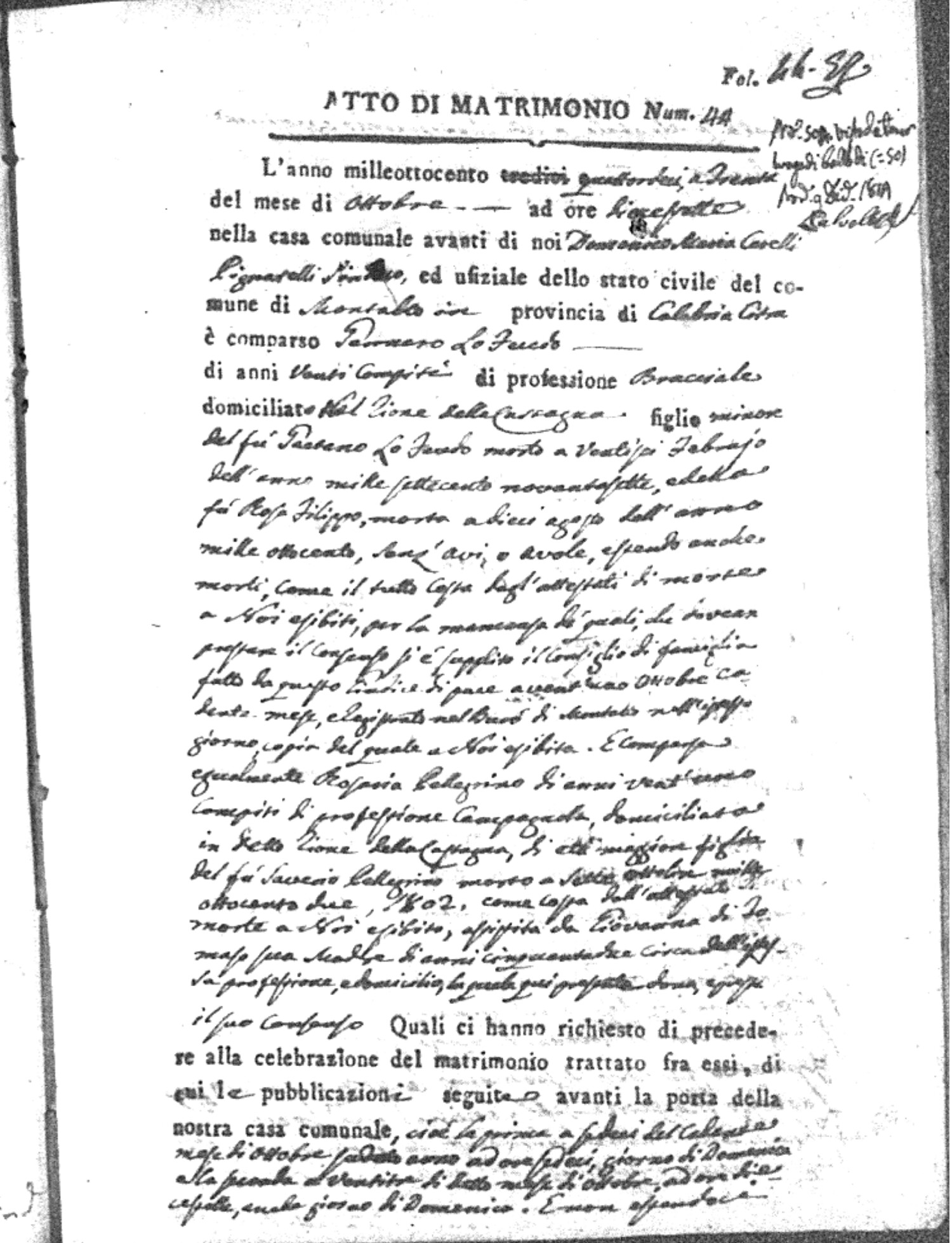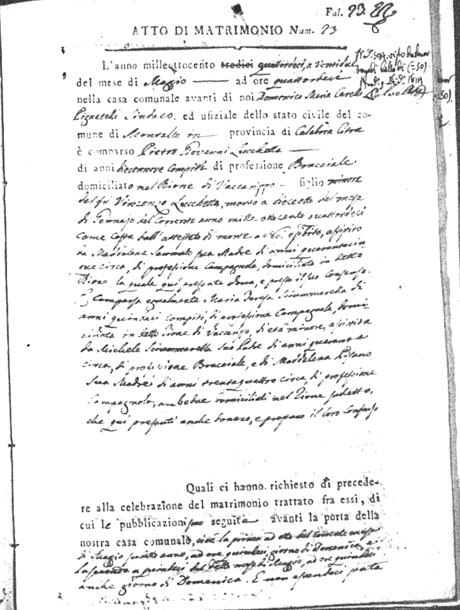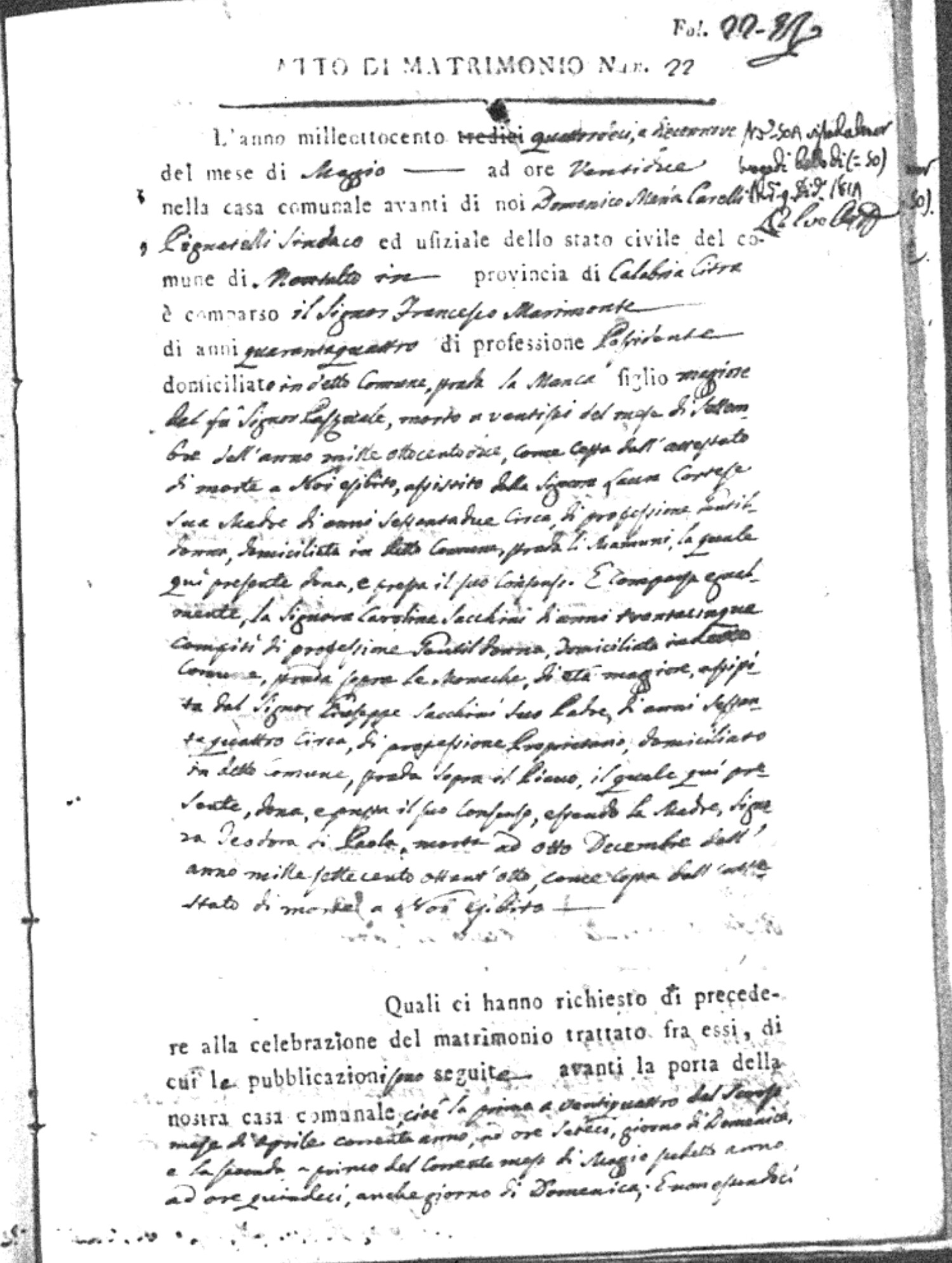 Here are the extractions for all the marriage acts in 1814 for Montalto Uffugo. This year is complete. For more information, click on the groom's surname to view a copy of the original document.