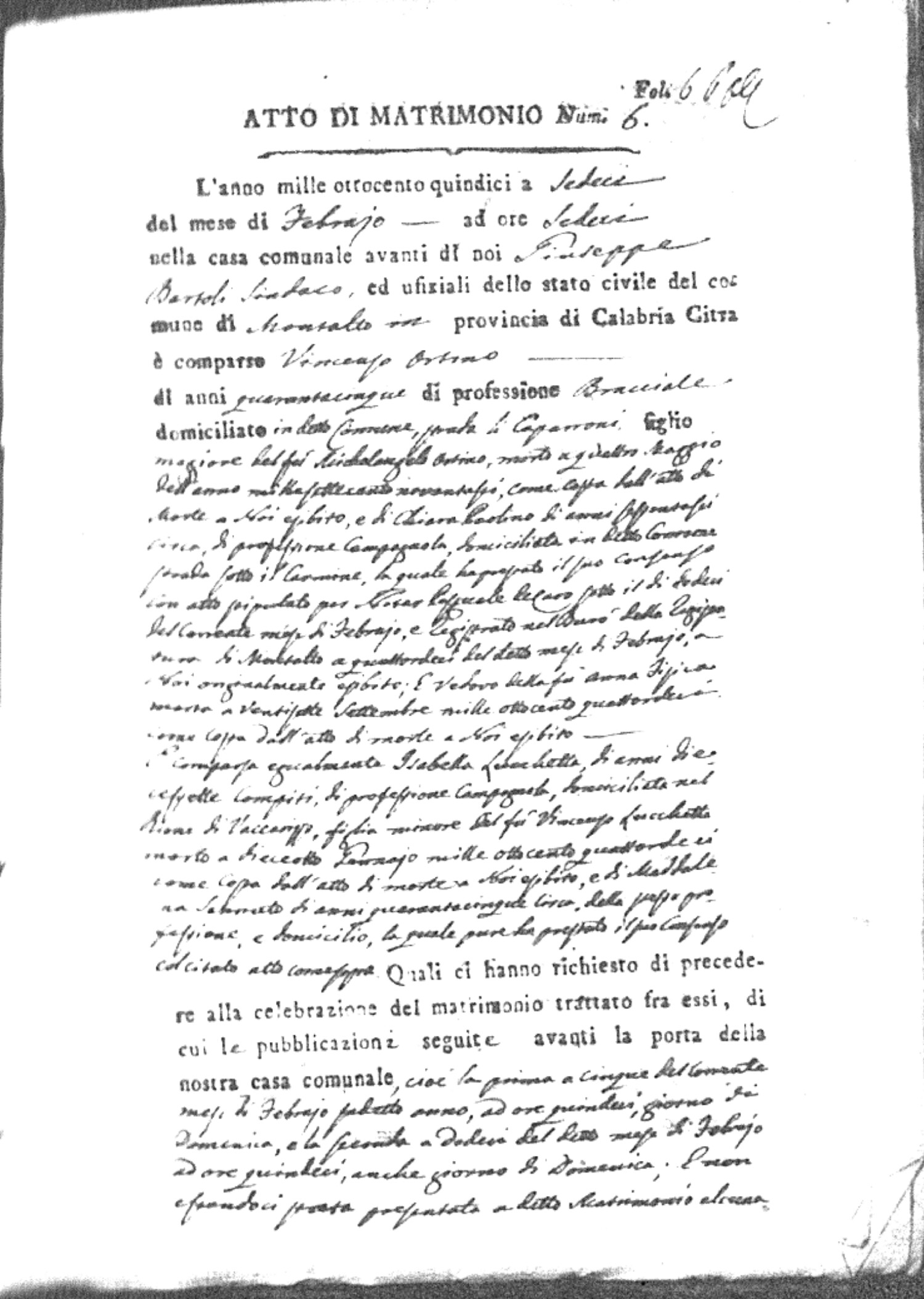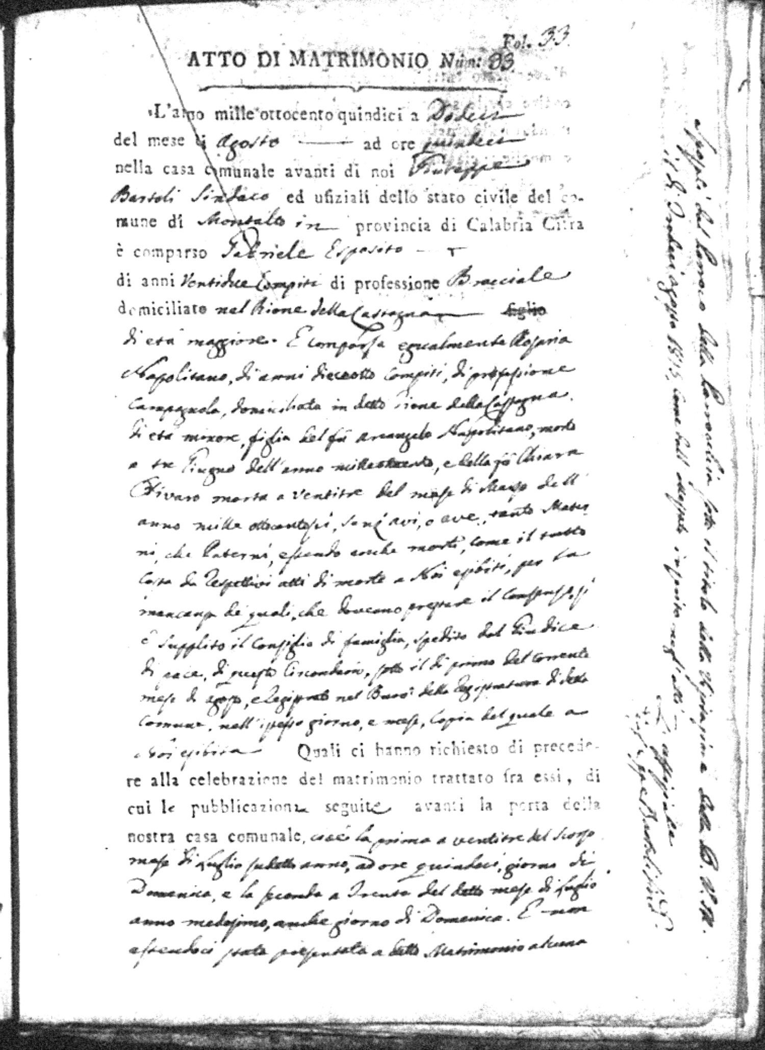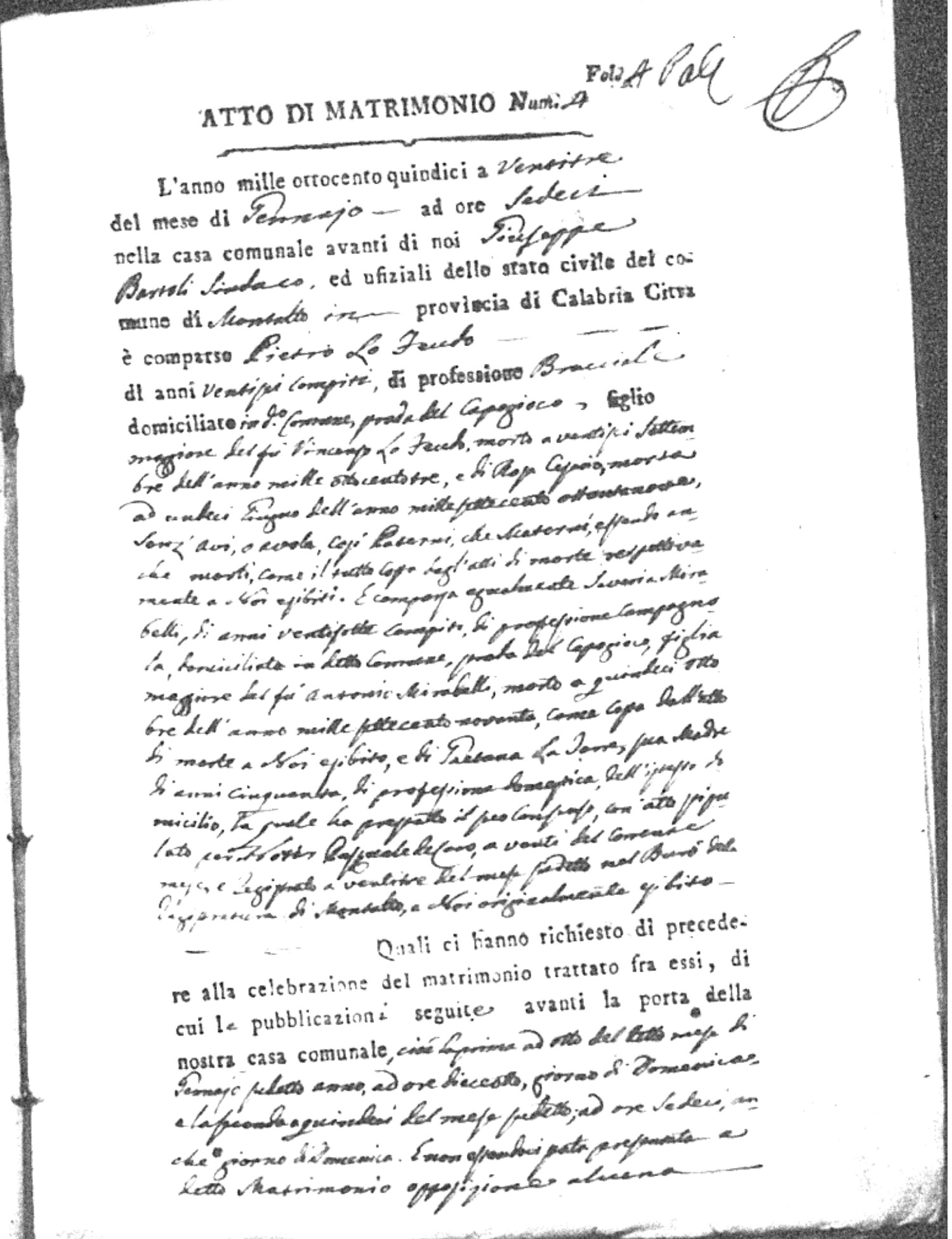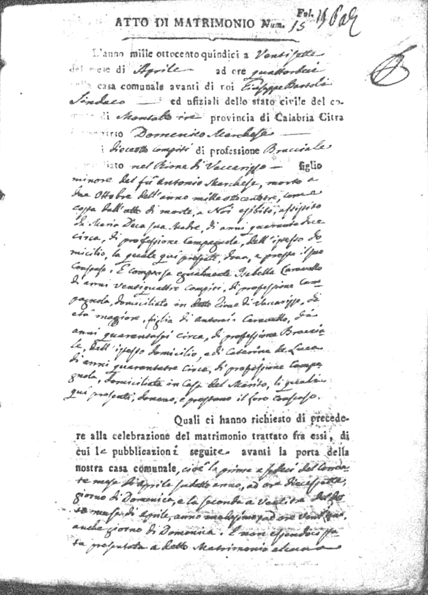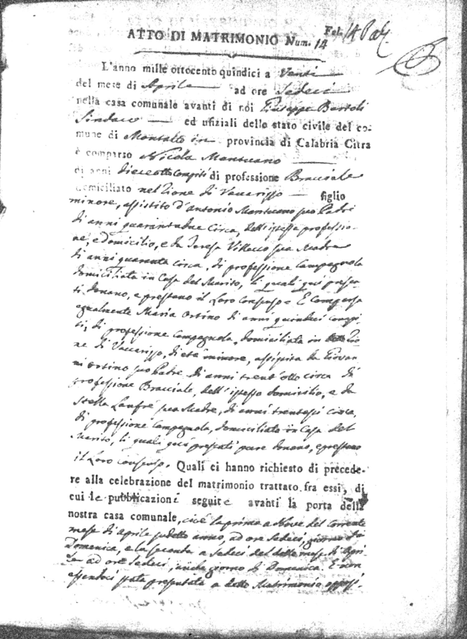 Here are the extractions for all the marriage acts in 1815 for Montalto Uffugo. This year is complete. For more information, click on the groom's surname to view a copy of the original document.