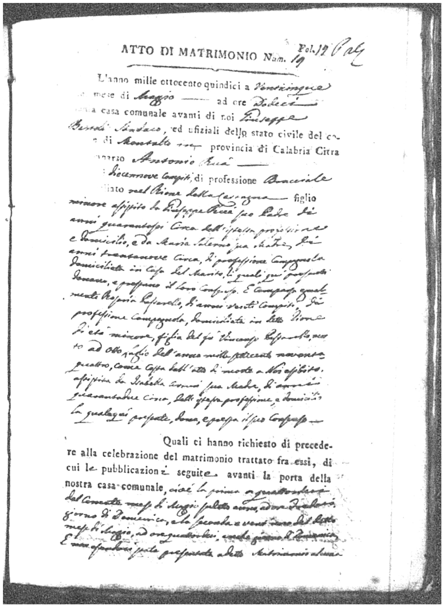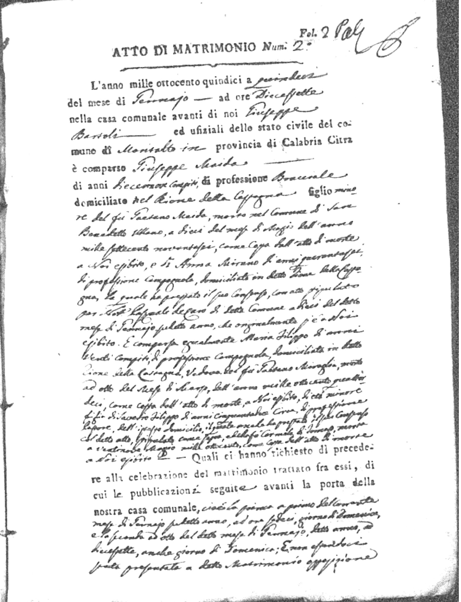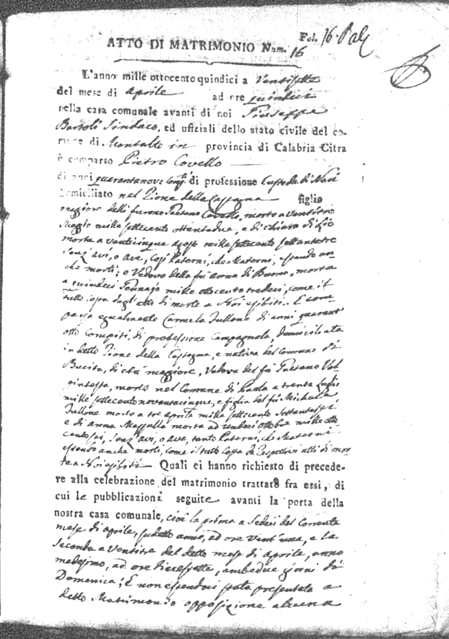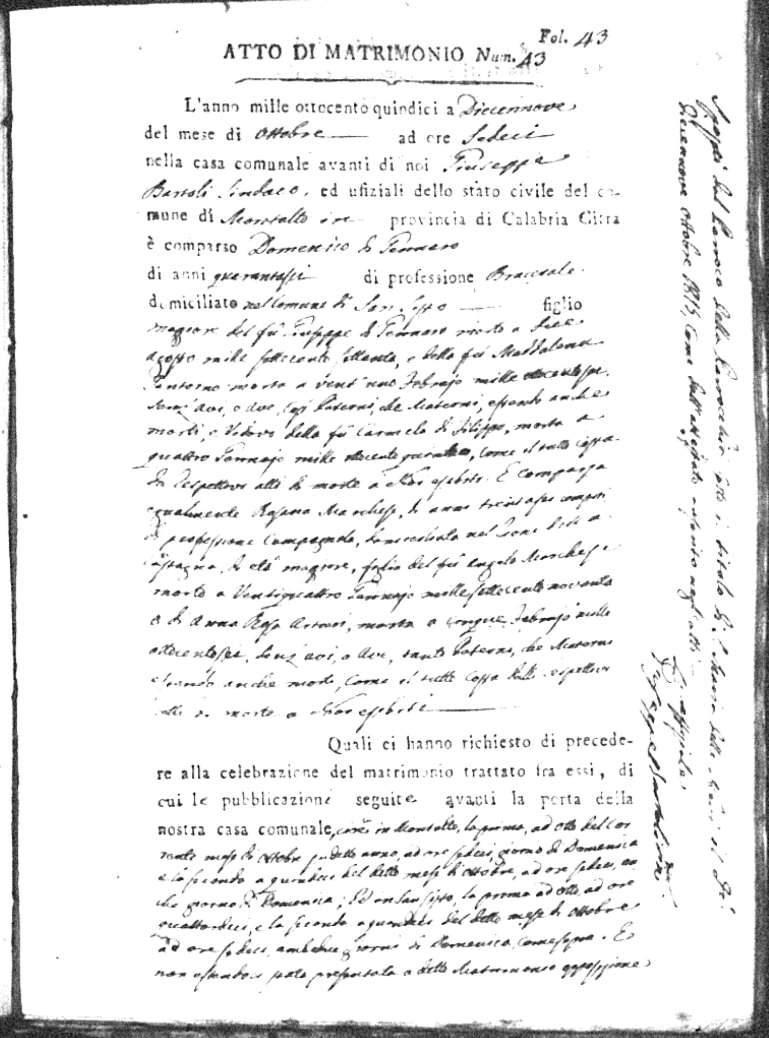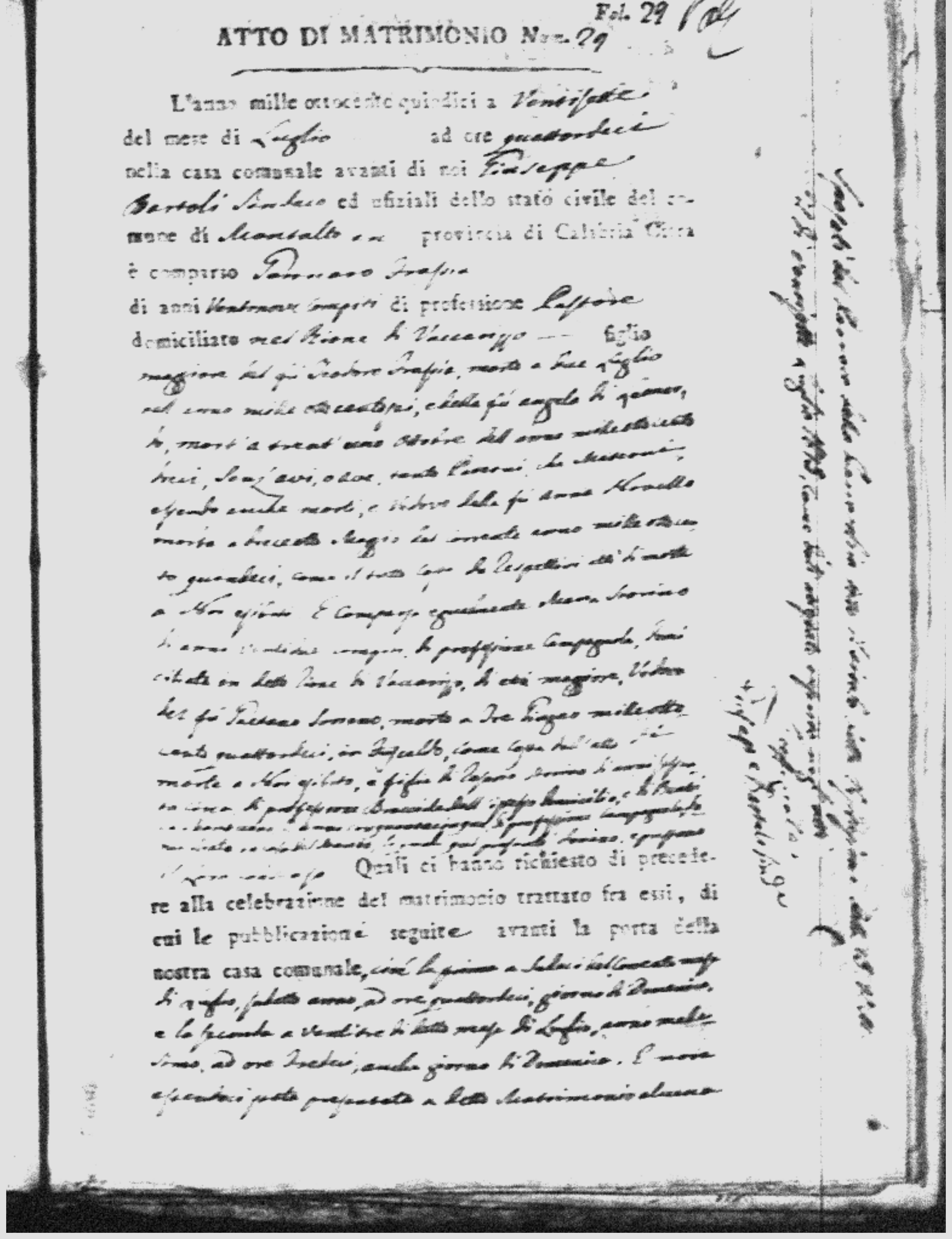 Here are the extractions for all the marriage acts in 1815 for Montalto Uffugo. This year is complete. For more information, click on the groom's surname to view a copy of the original document.