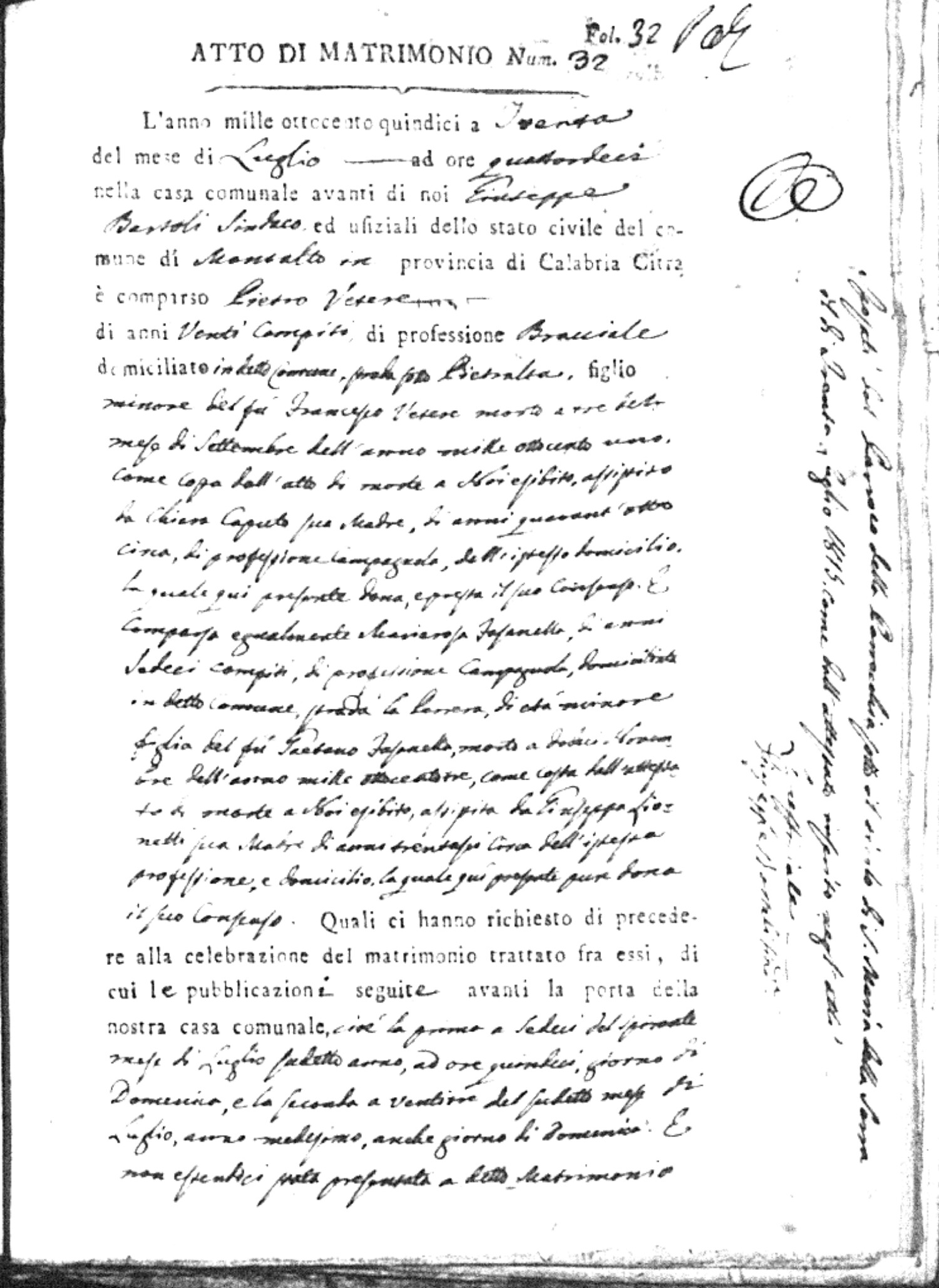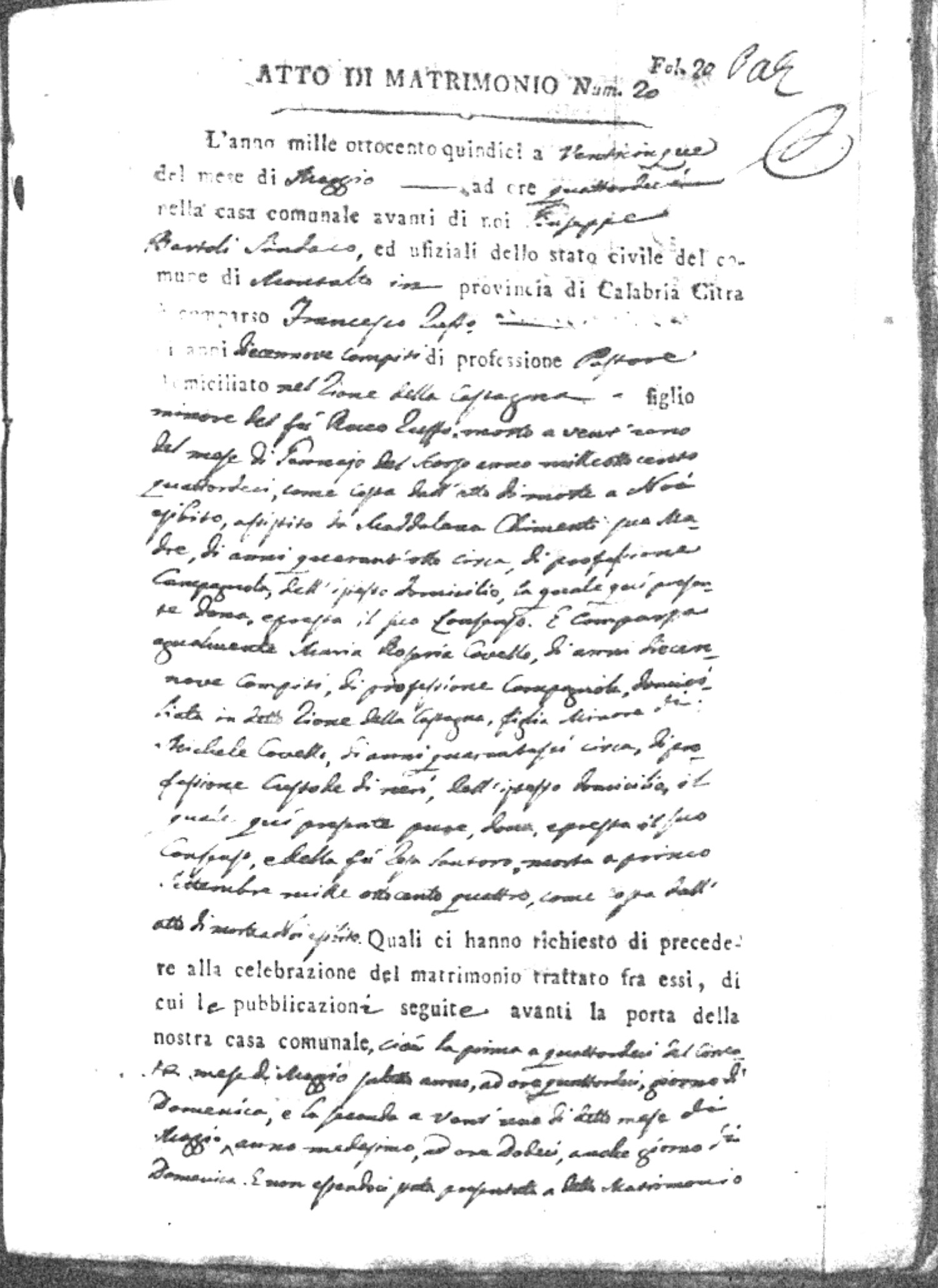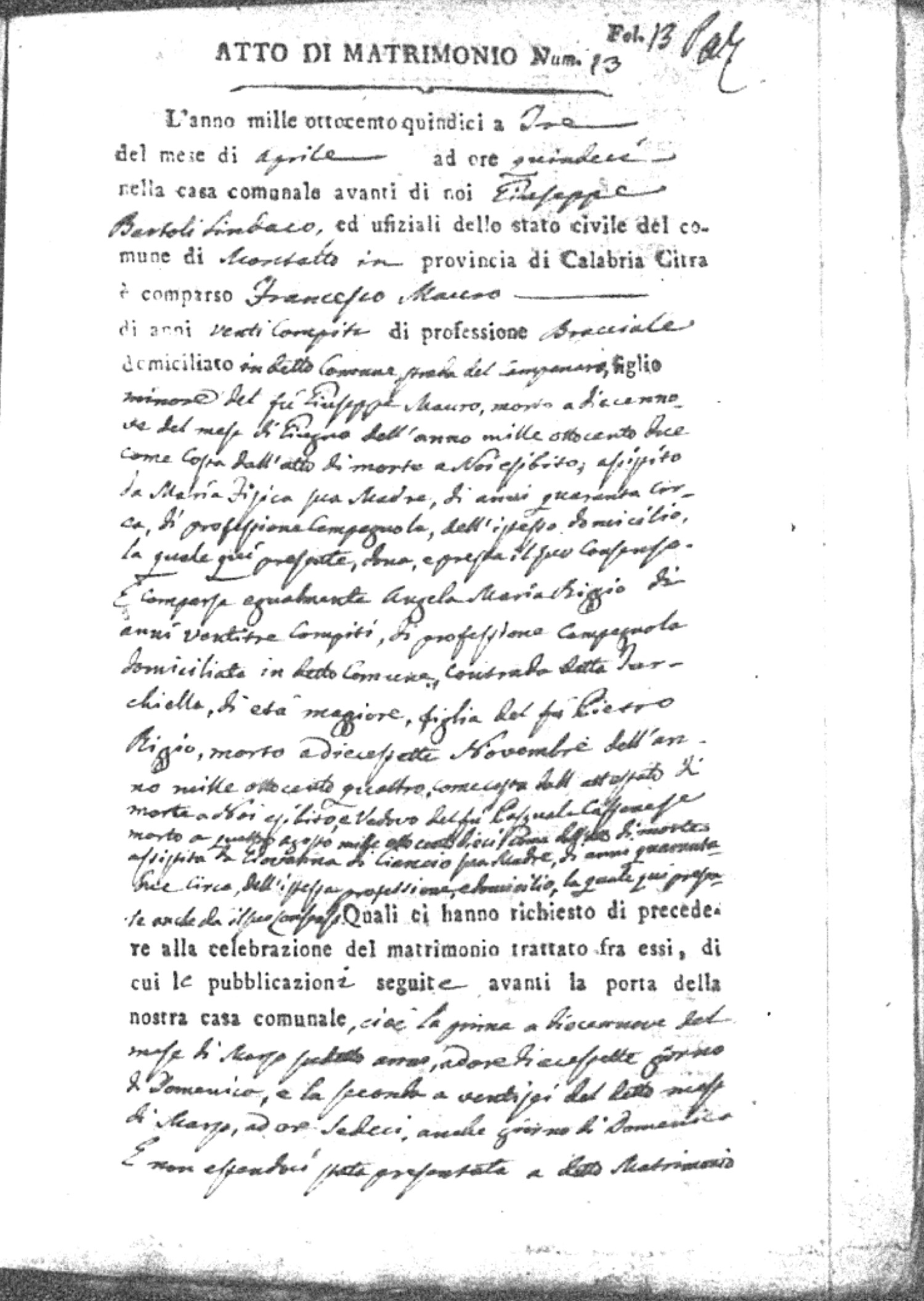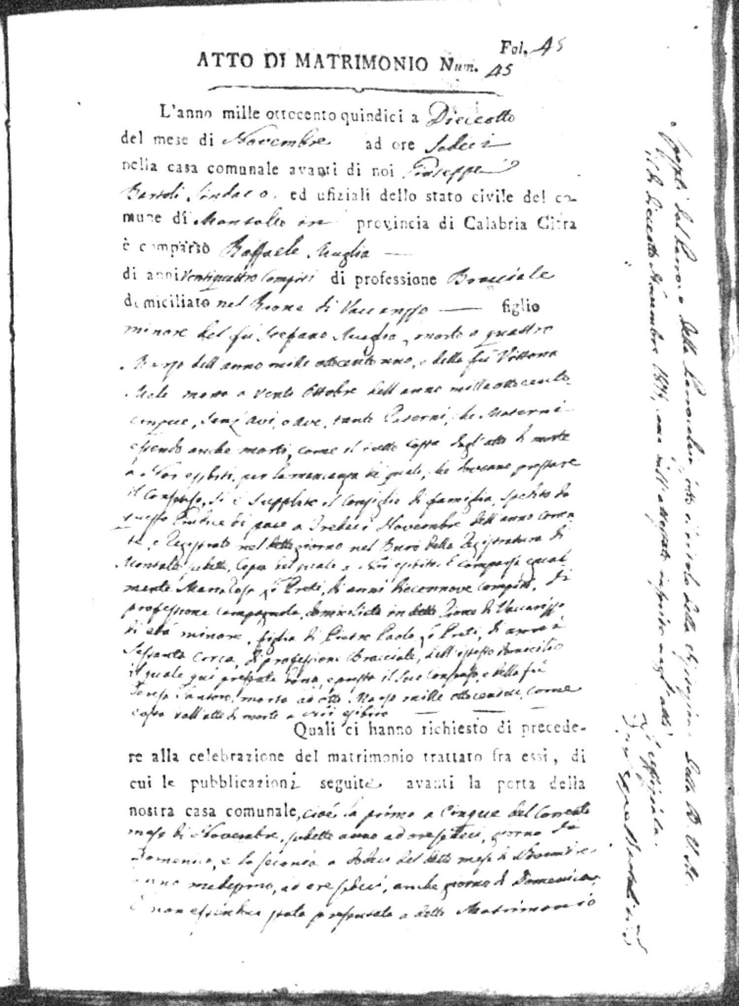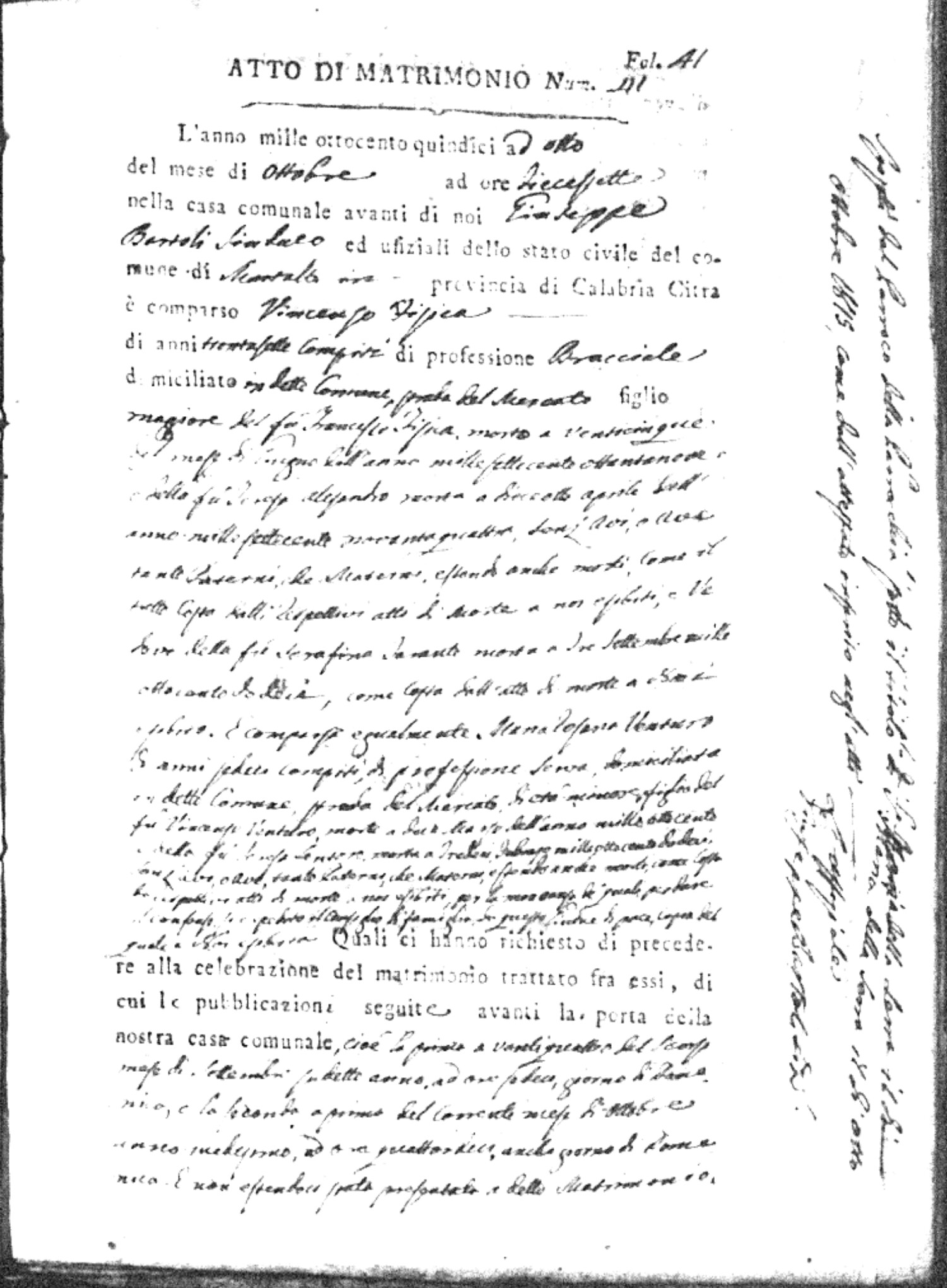 Here are the extractions for all the marriage acts in 1815 for Montalto Uffugo. This year is complete. For more information, click on the groom's surname to view a copy of the original document.