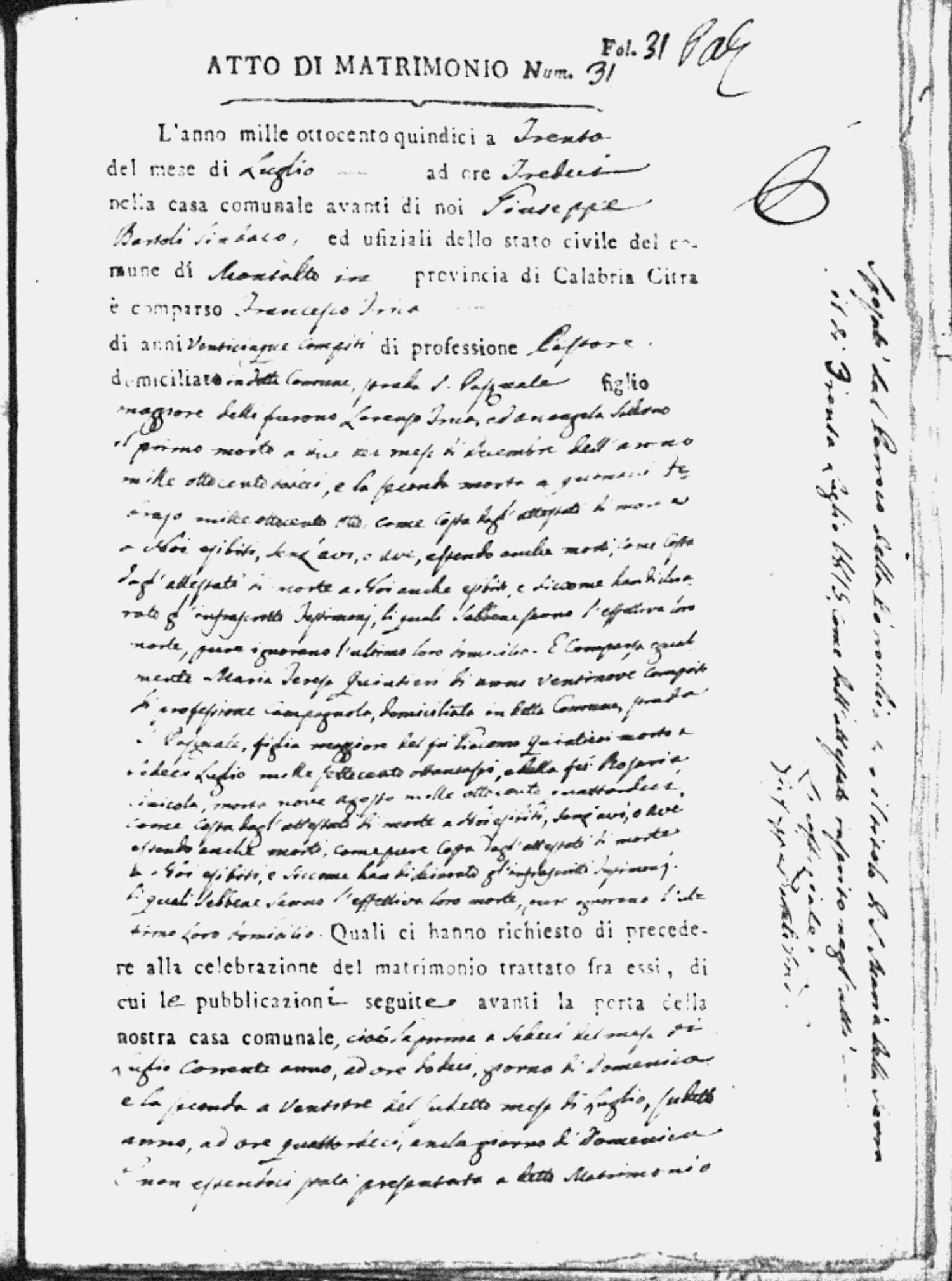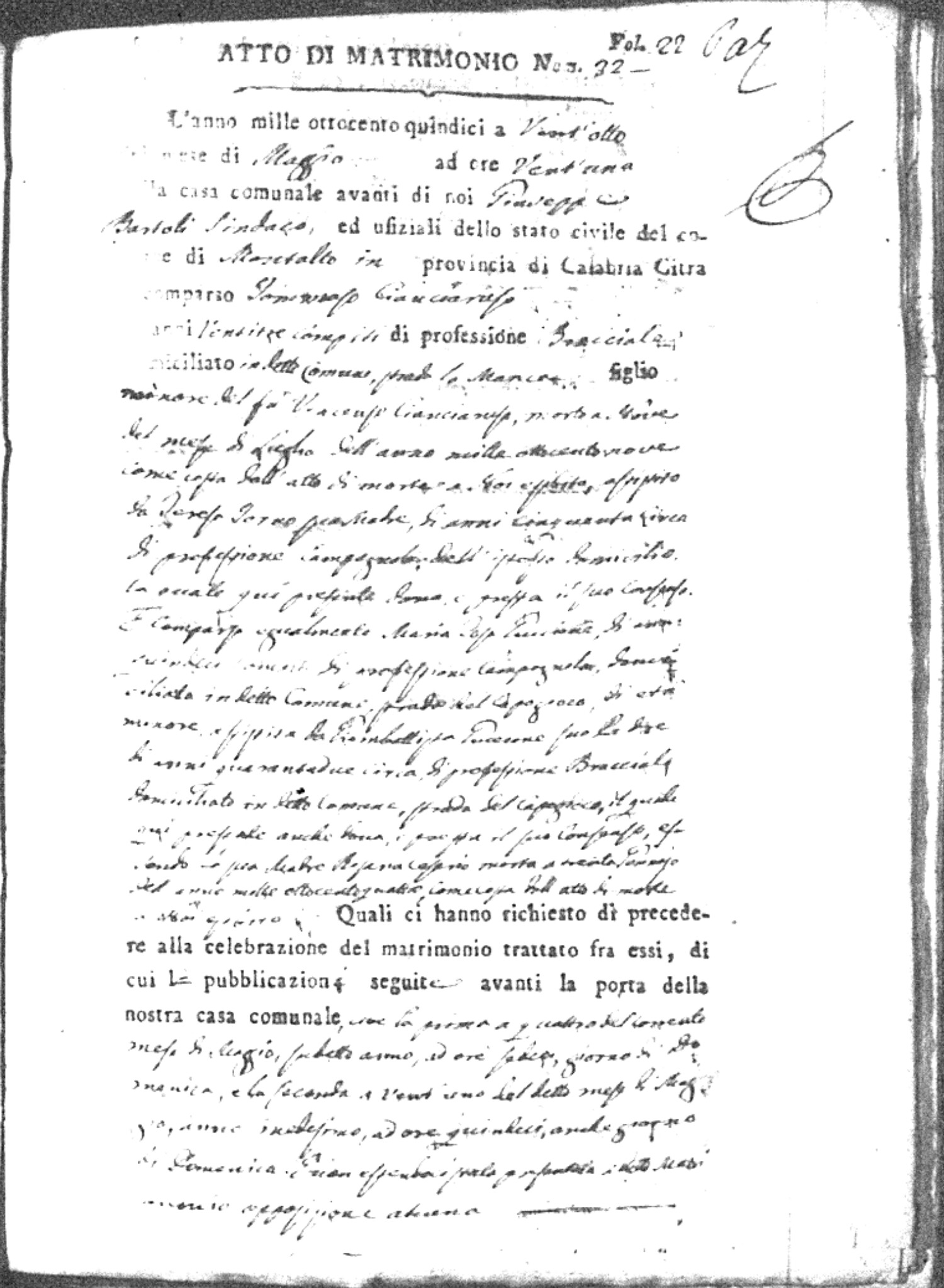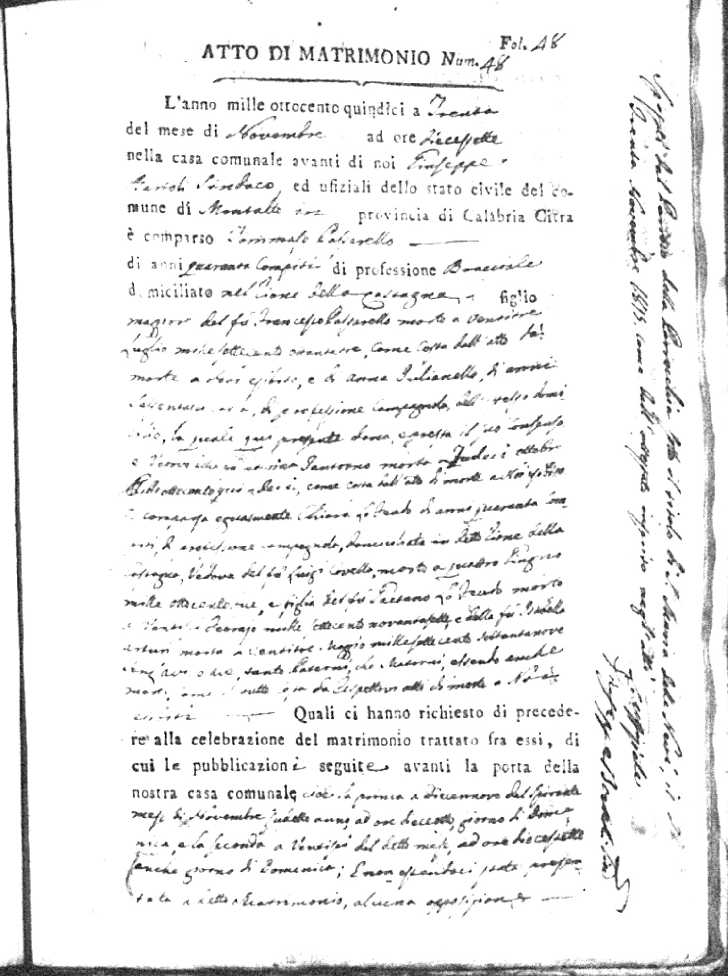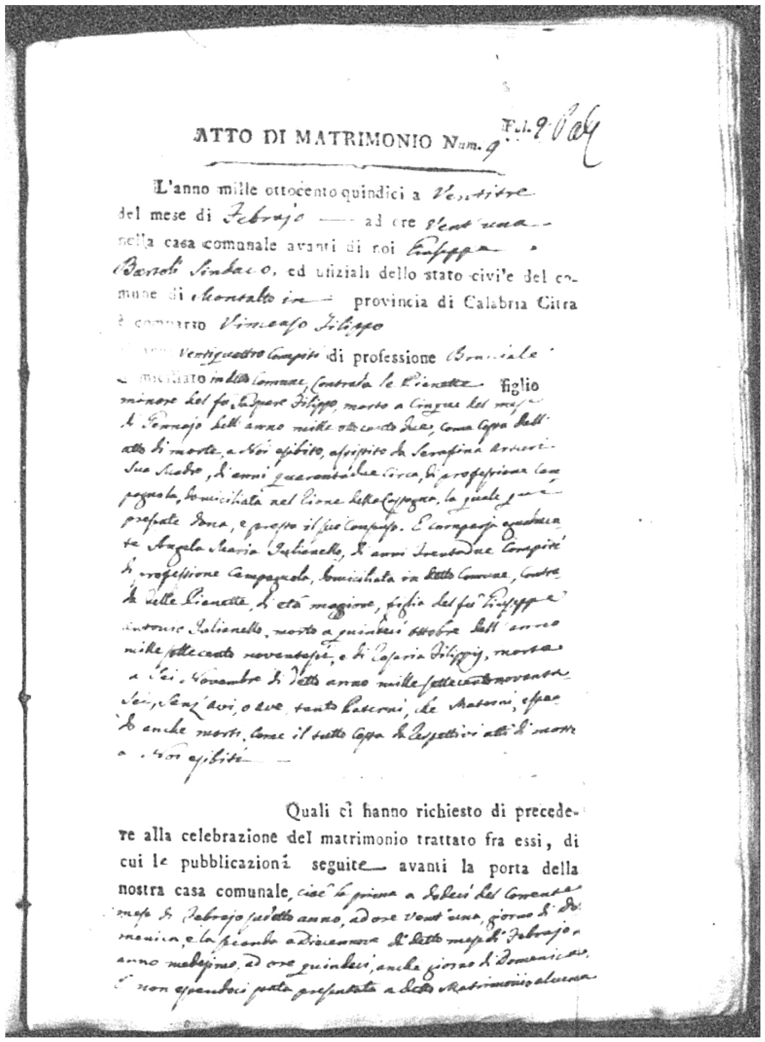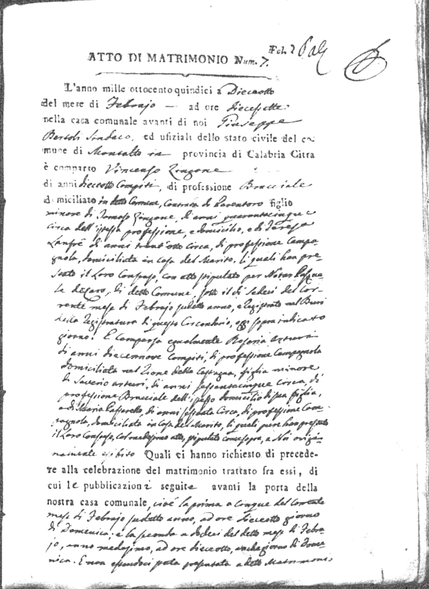 Here are the extractions for all the marriage acts in 1815 for Montalto Uffugo. This year is complete. For more information, click on the groom's surname to view a copy of the original document.