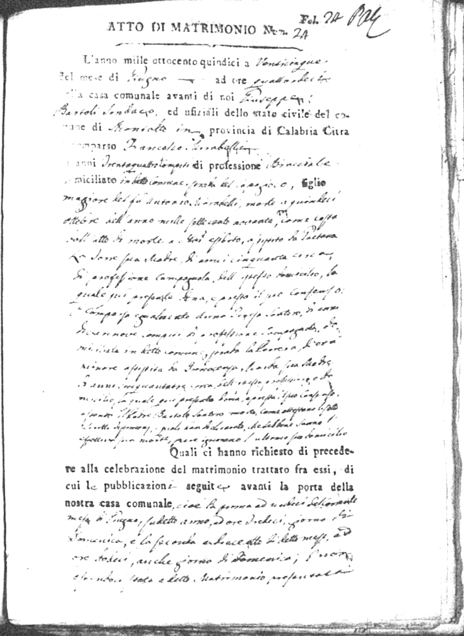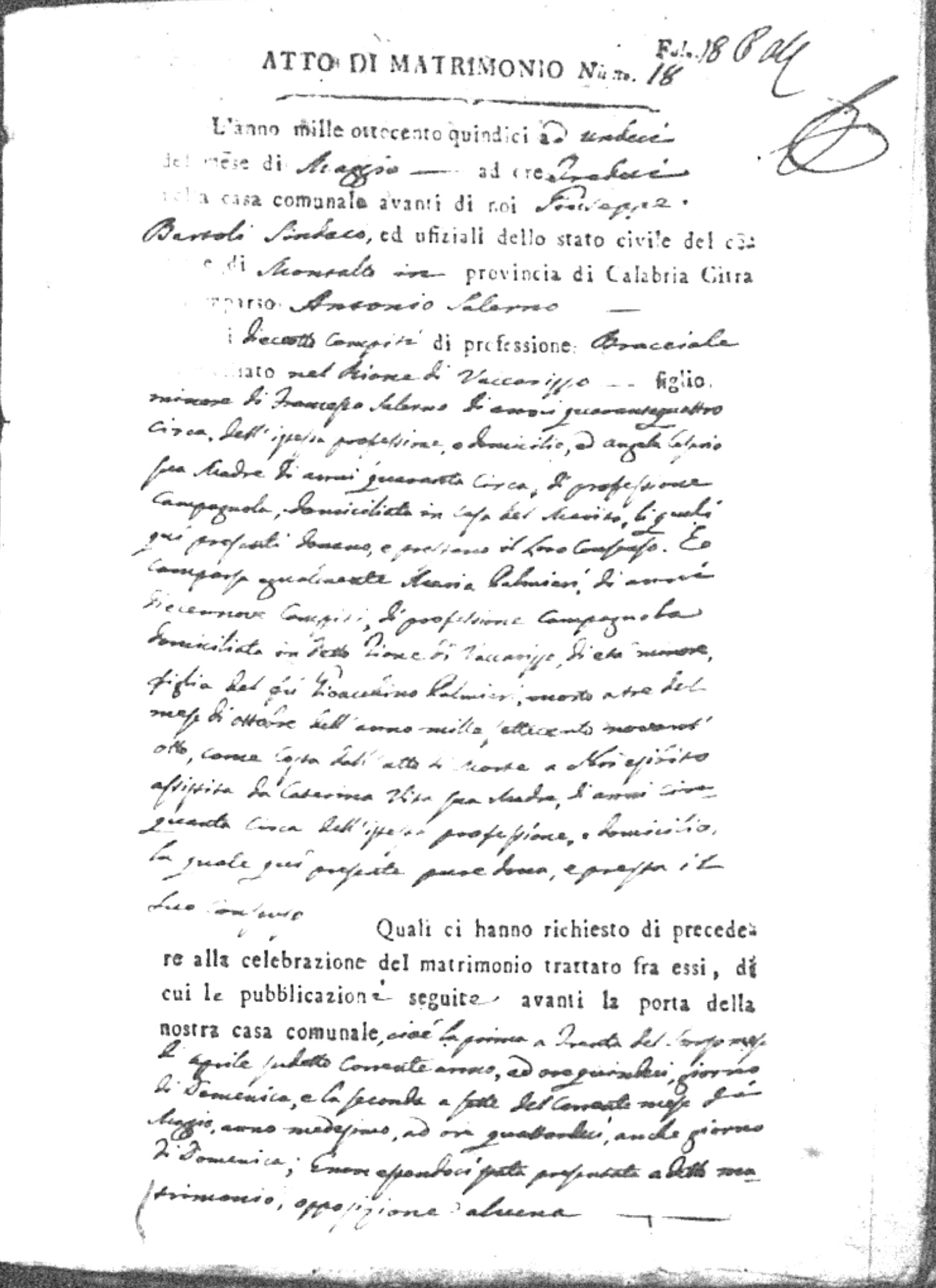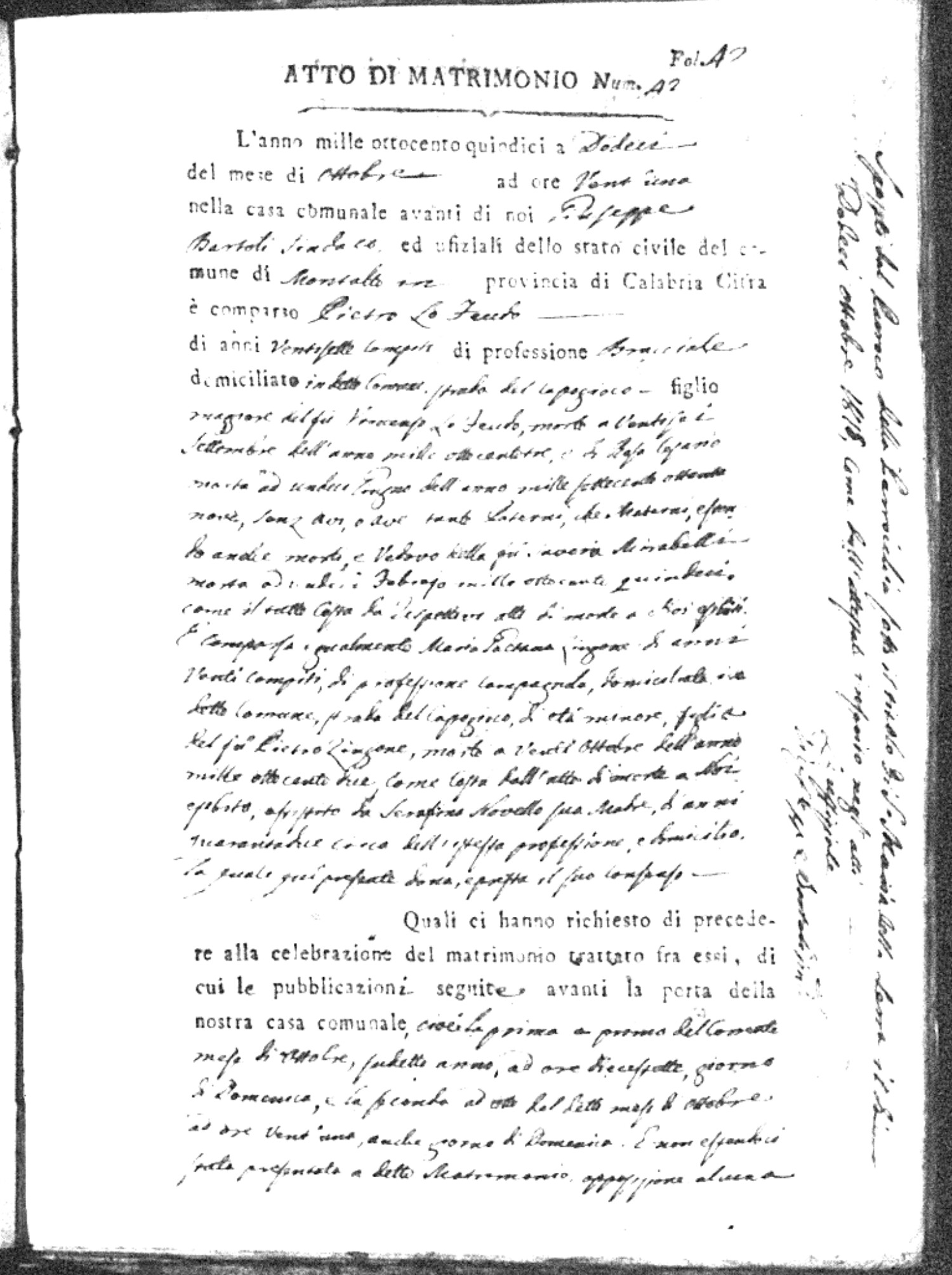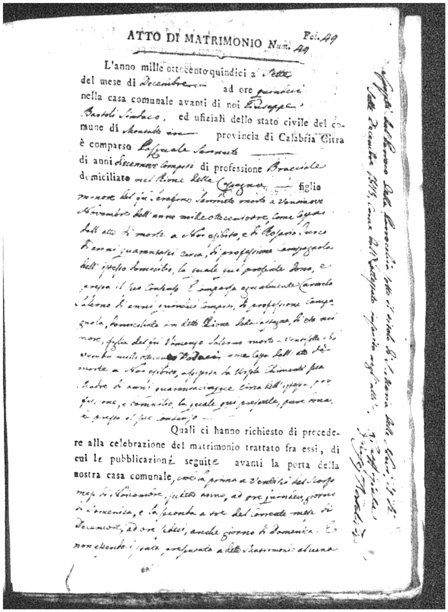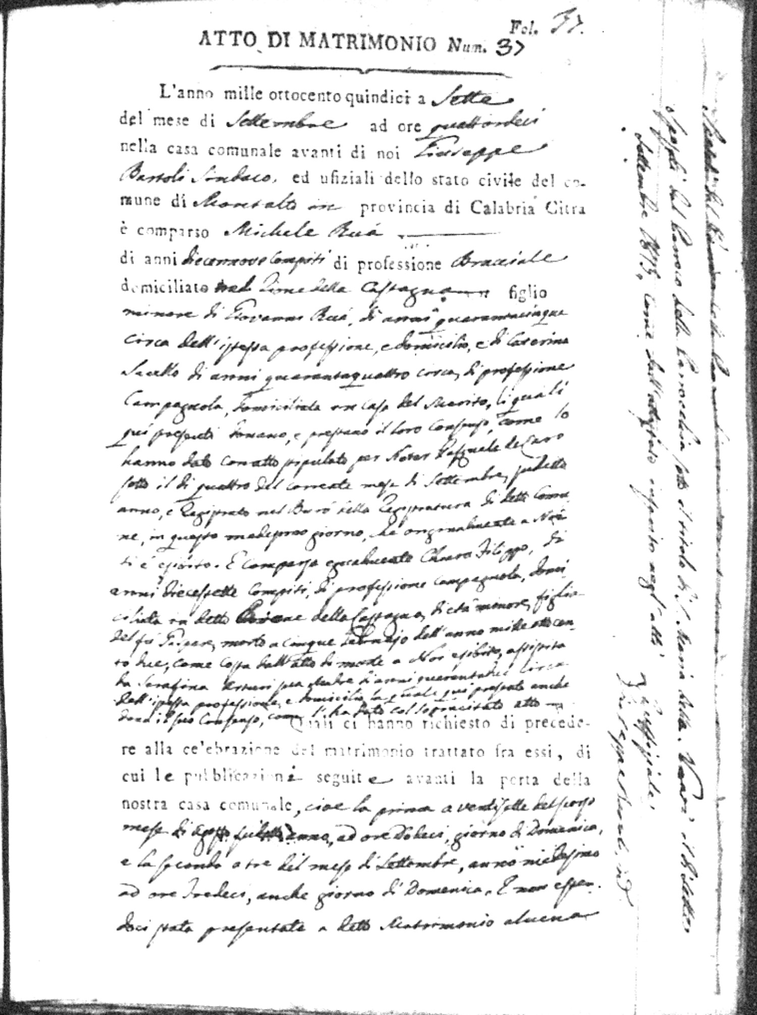 Here are the extractions for all the marriage acts in 1815 for Montalto Uffugo. This year is complete. For more information, click on the groom's surname to view a copy of the original document.