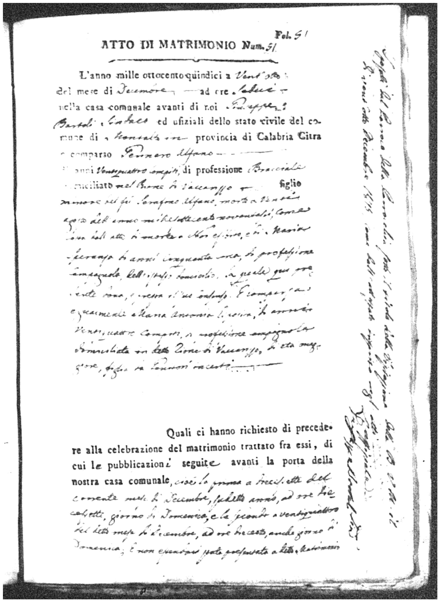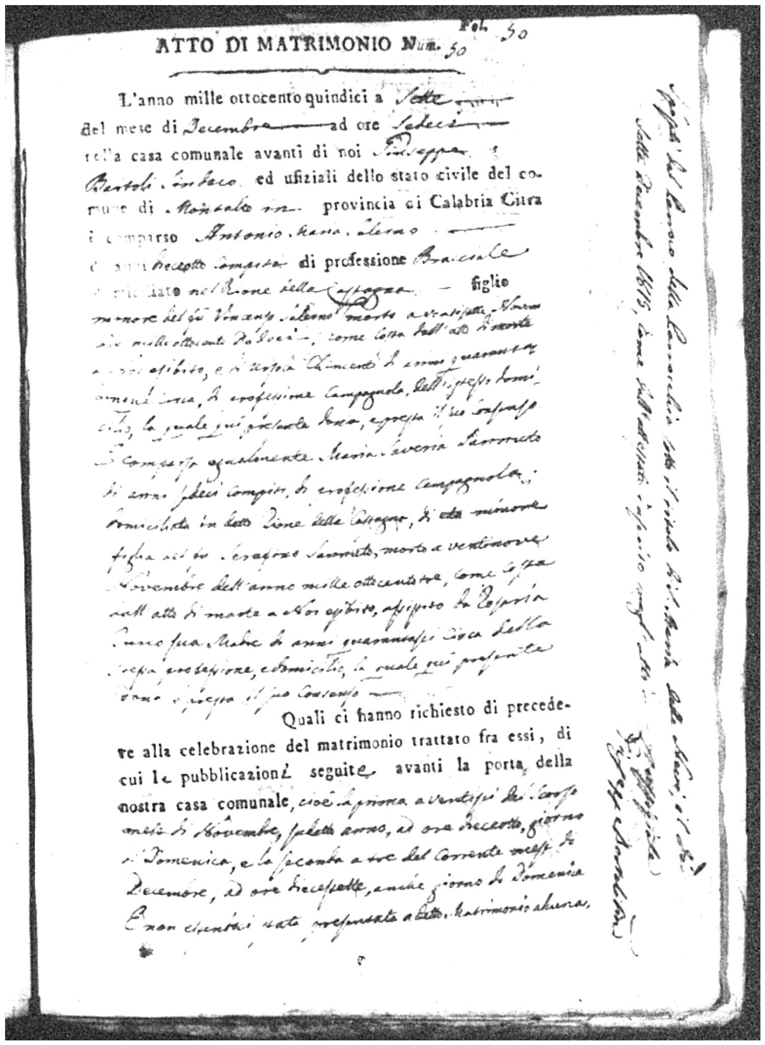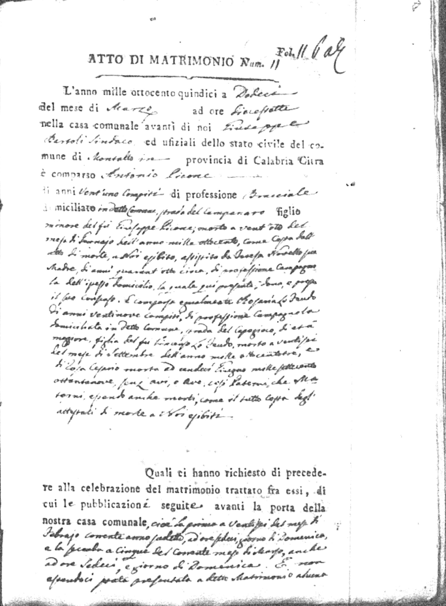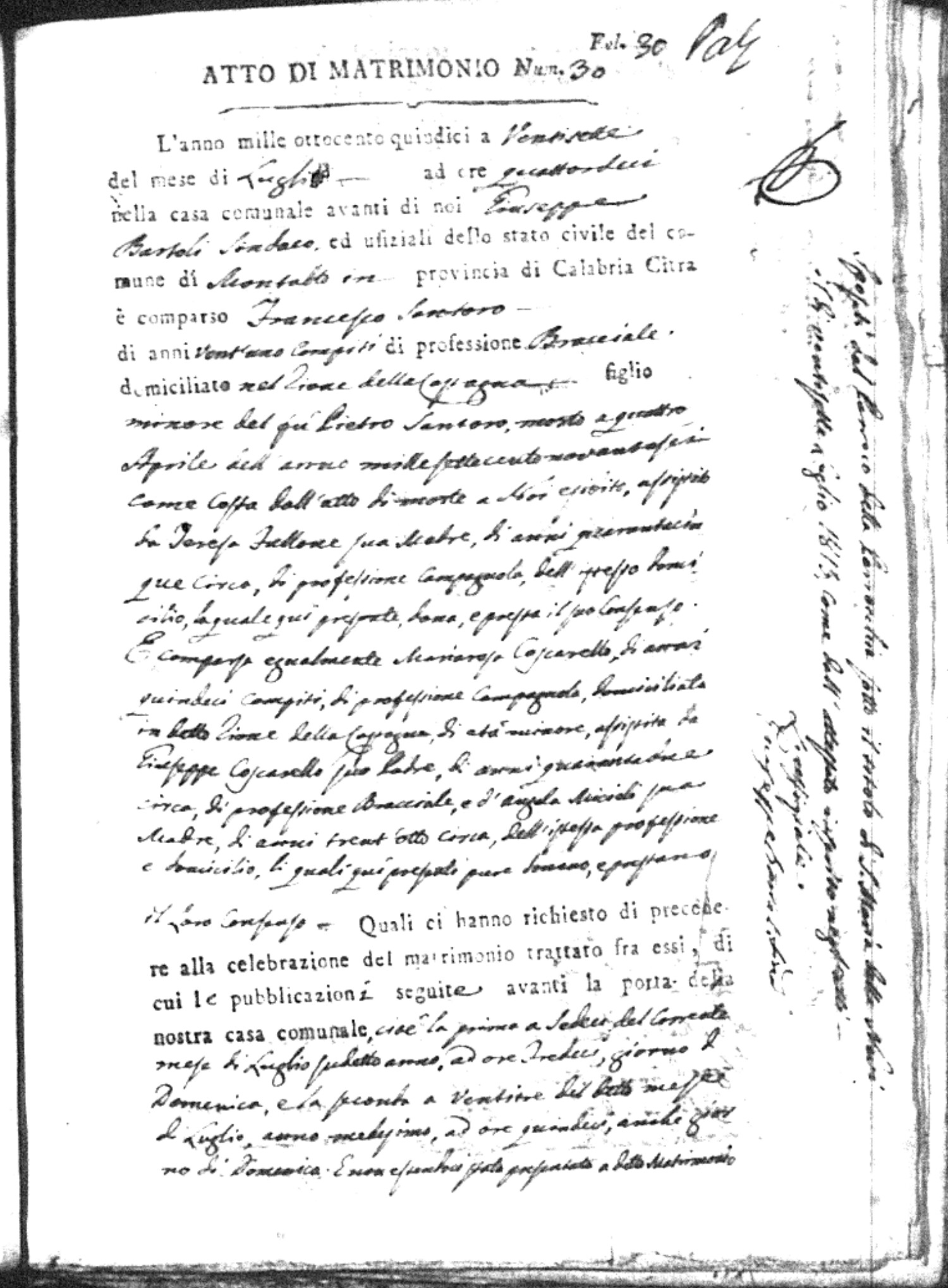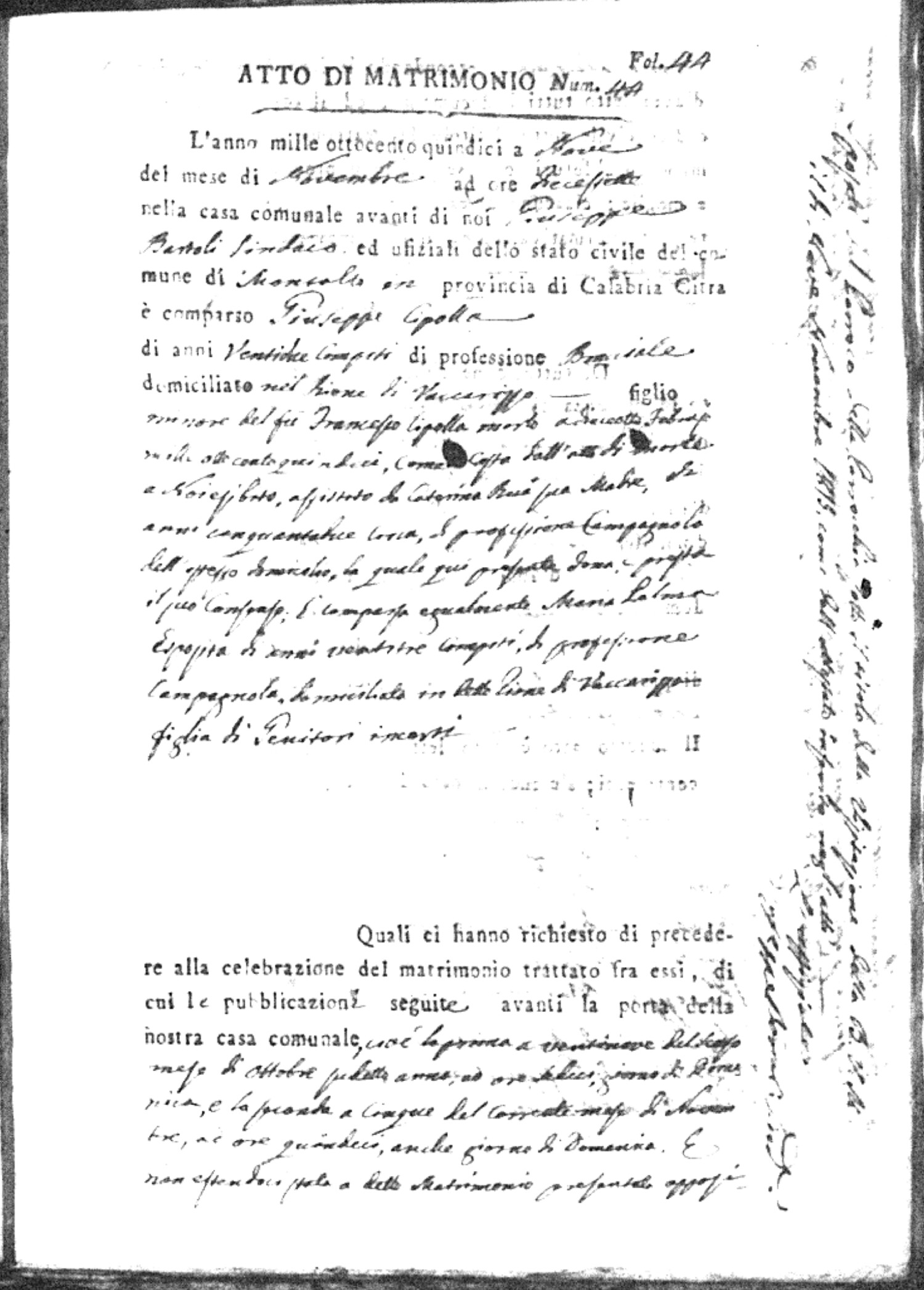 Here are the extractions for all the marriage acts in 1815 for Montalto Uffugo. This year is complete. For more information, click on the groom's surname to view a copy of the original document.