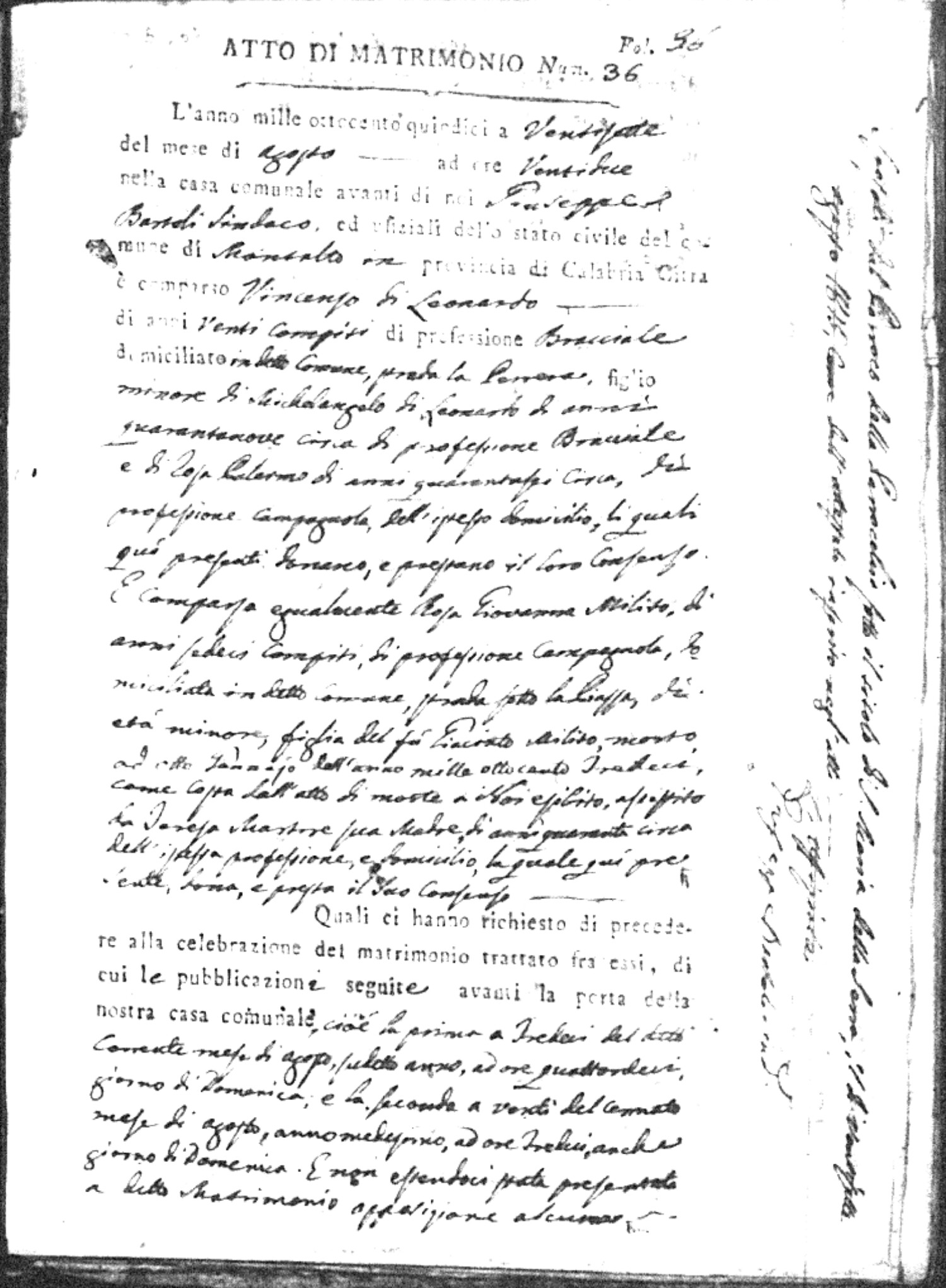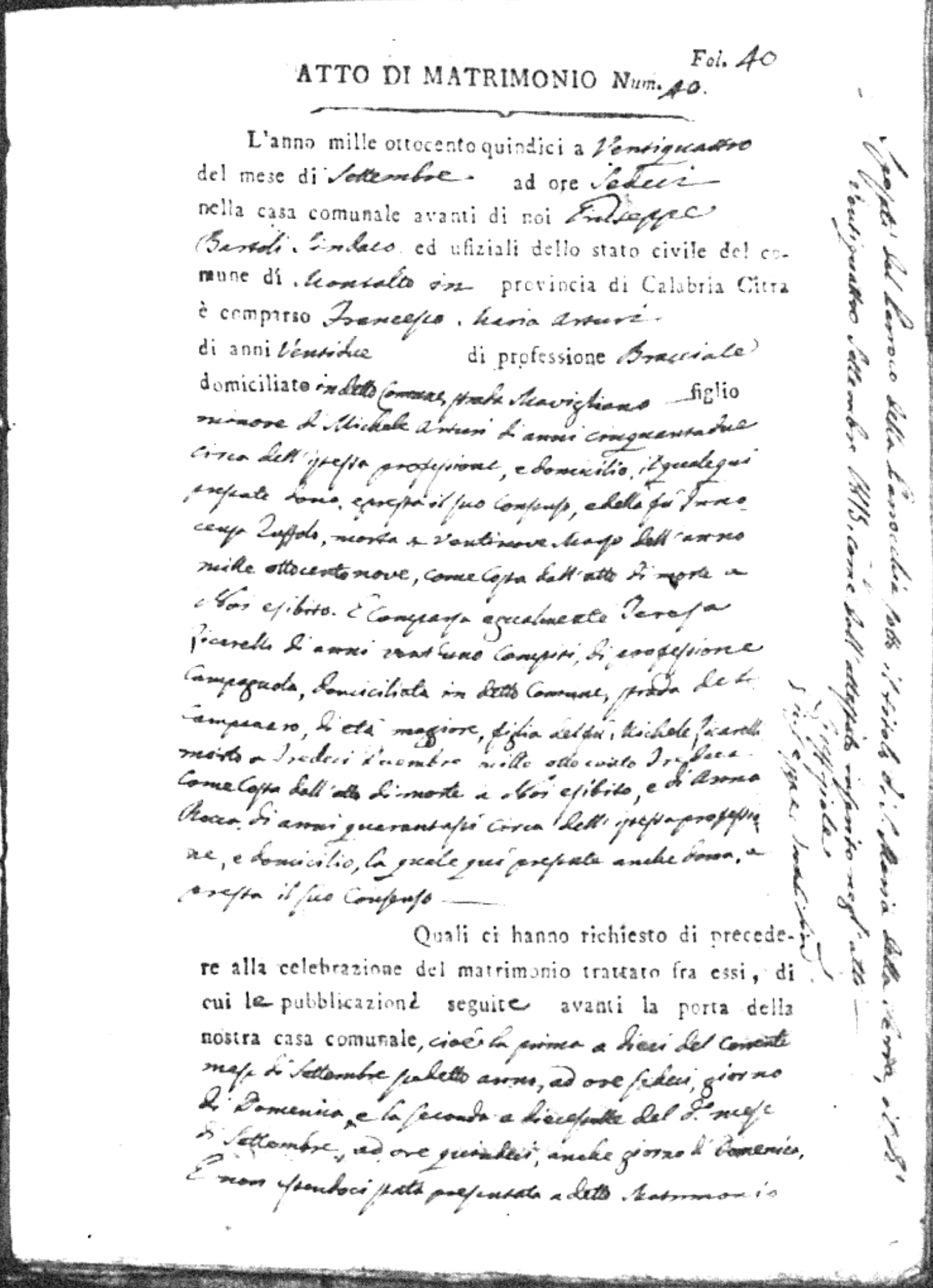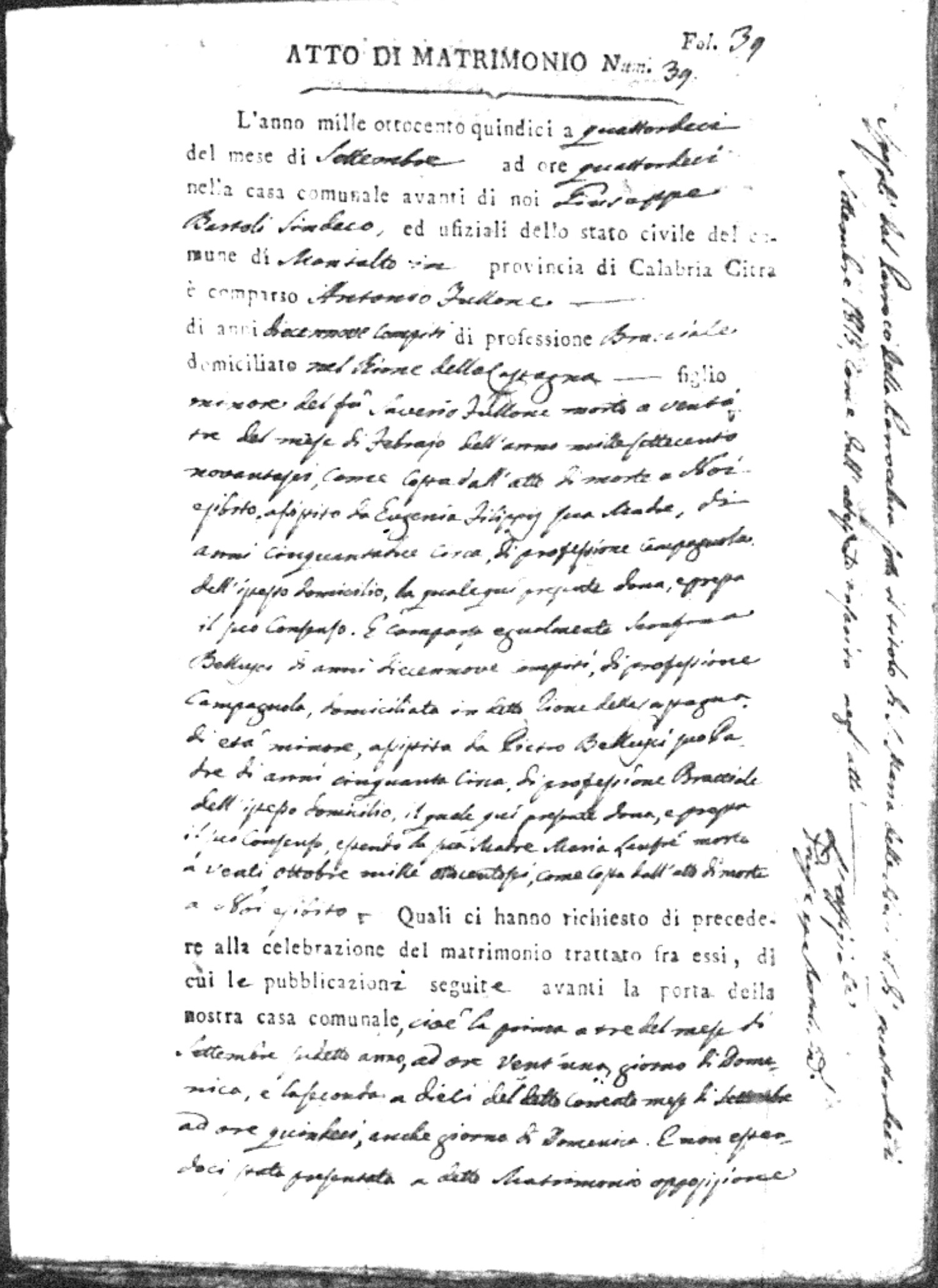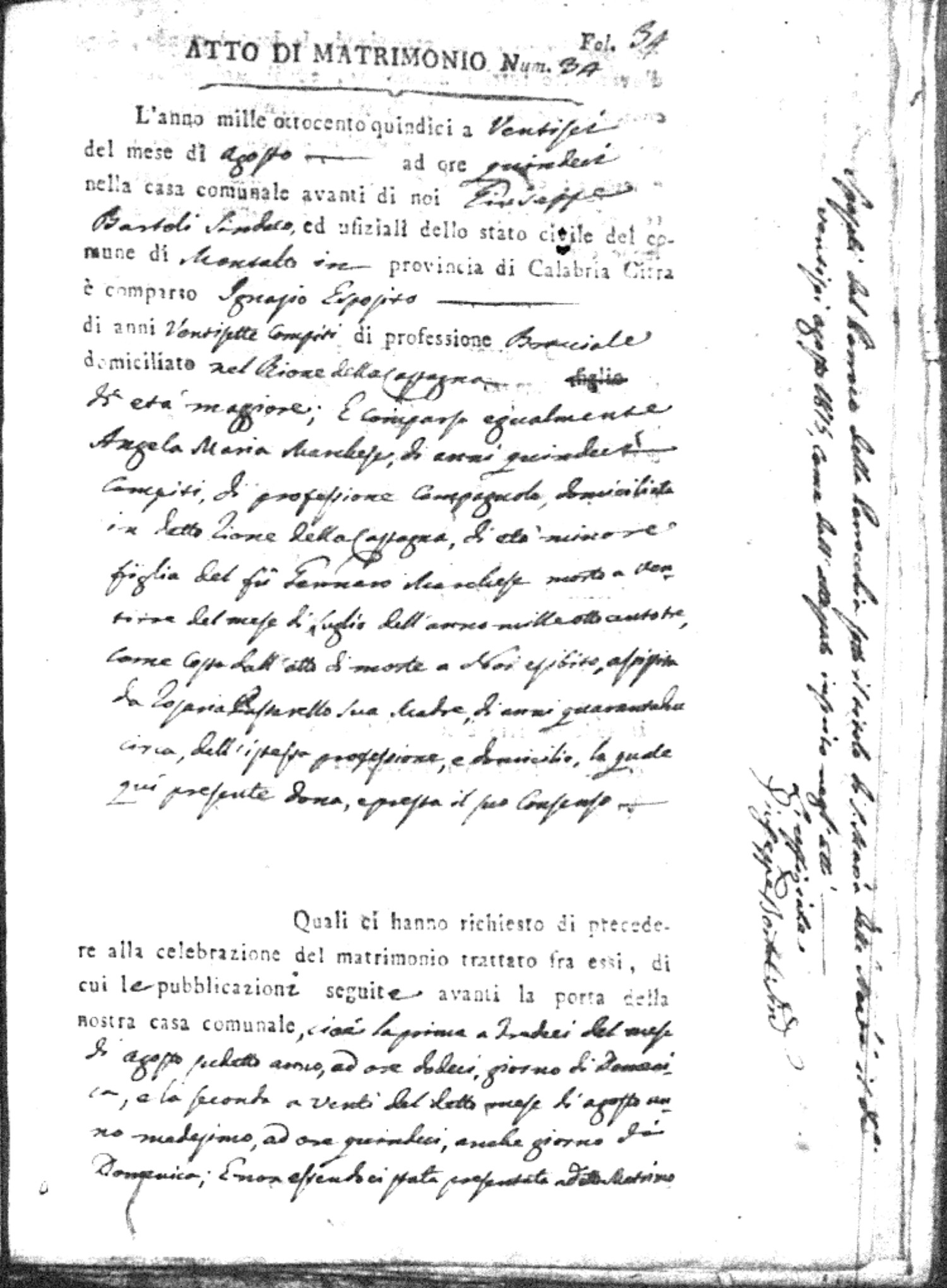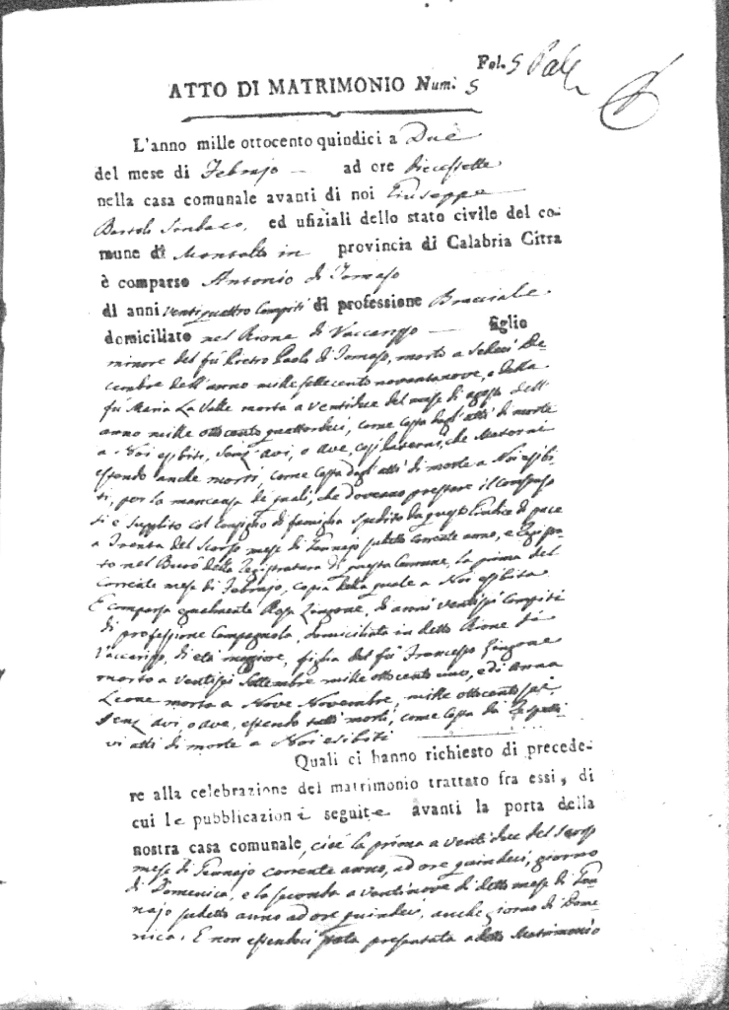 Here are the extractions for all the marriage acts in 1815 for Montalto Uffugo. This year is complete. For more information, click on the groom's surname to view a copy of the original document.