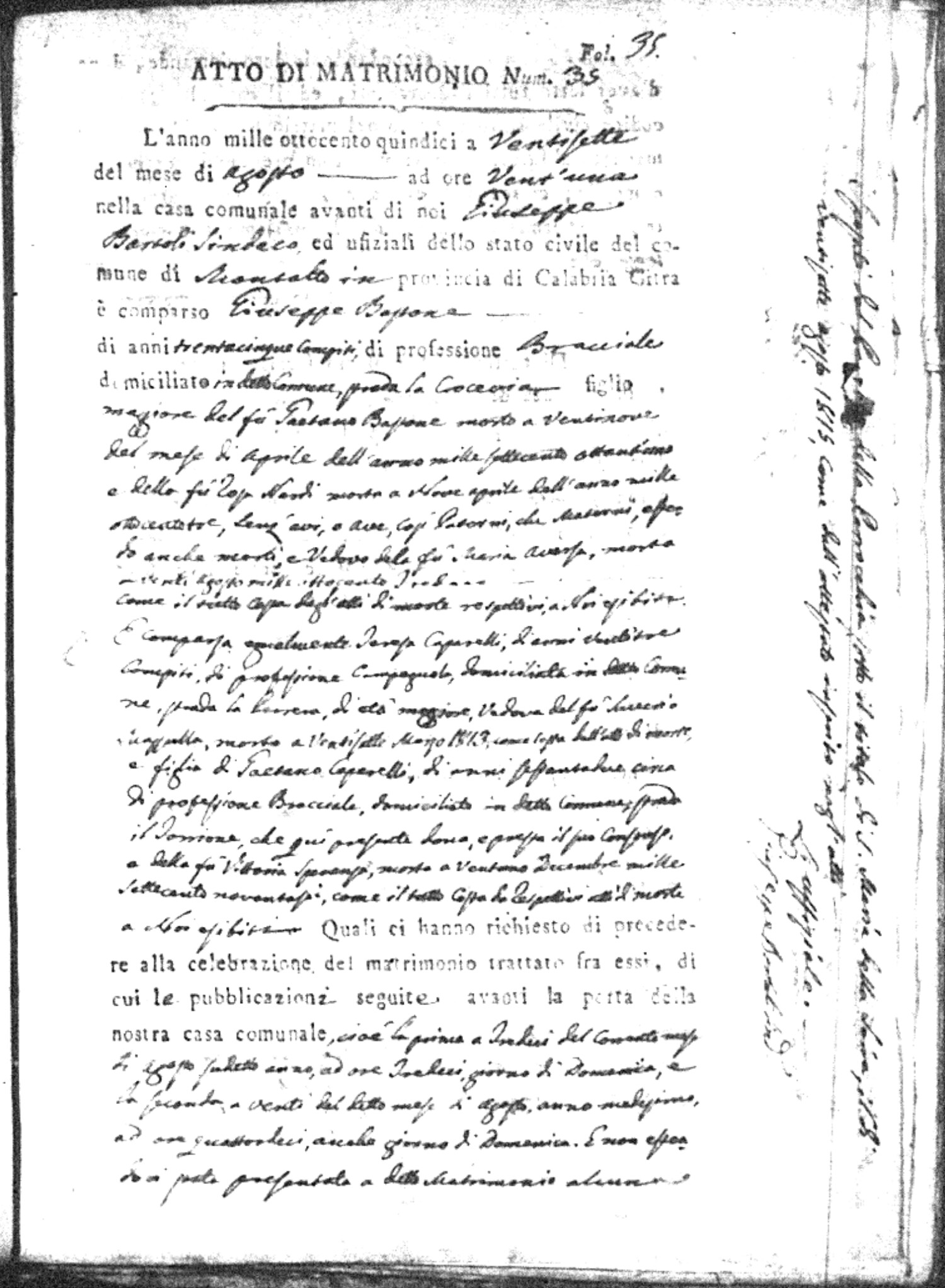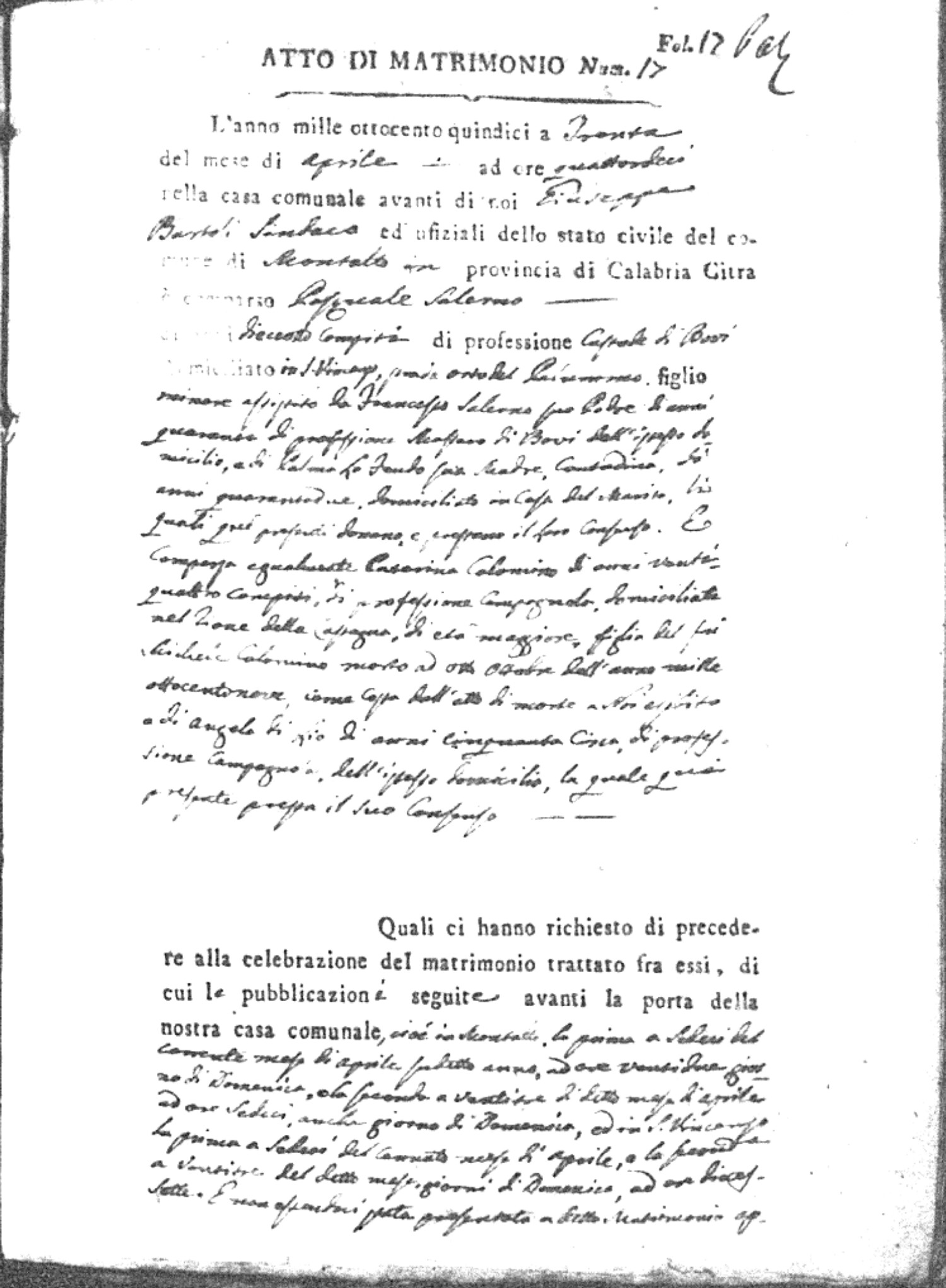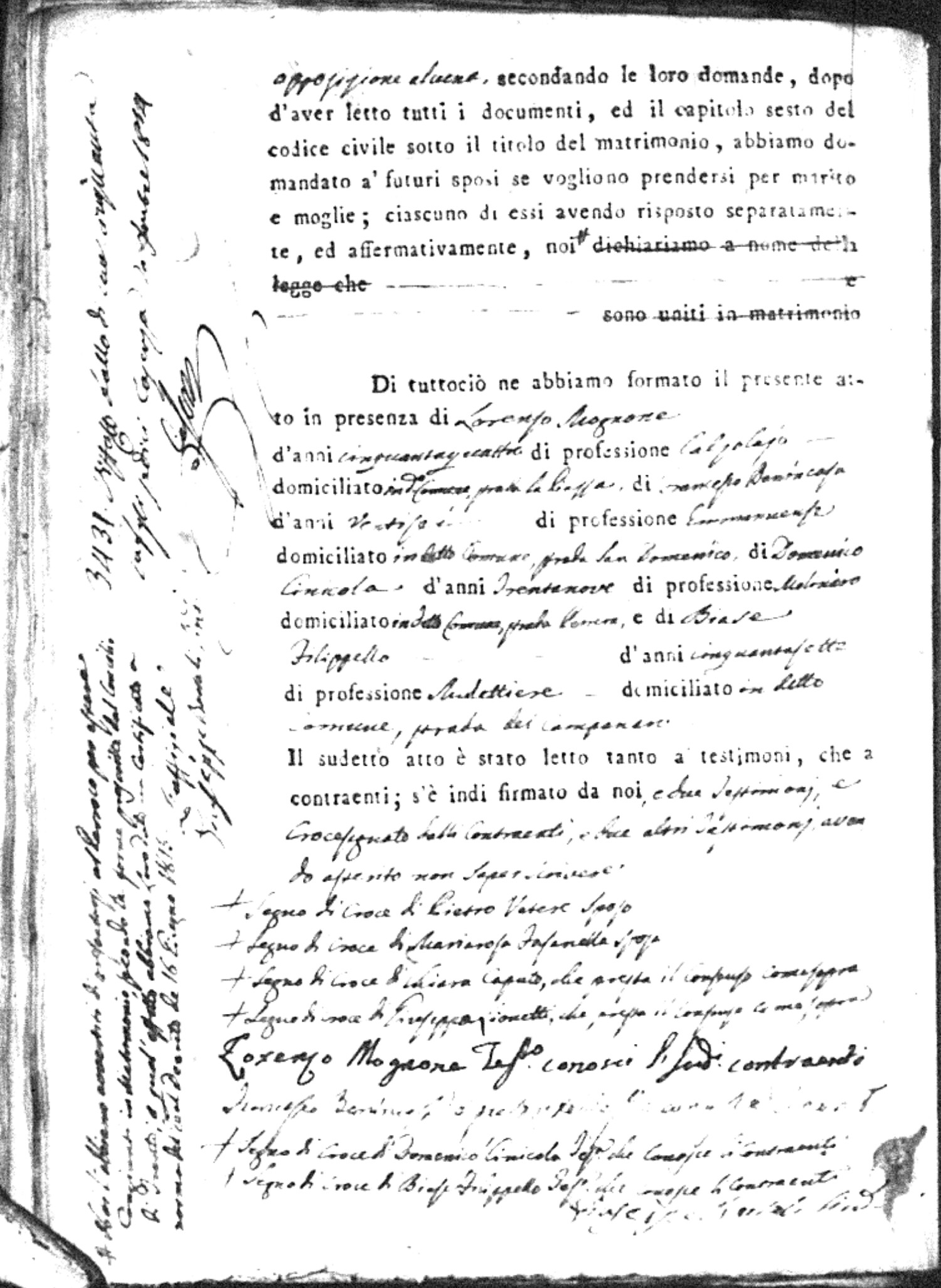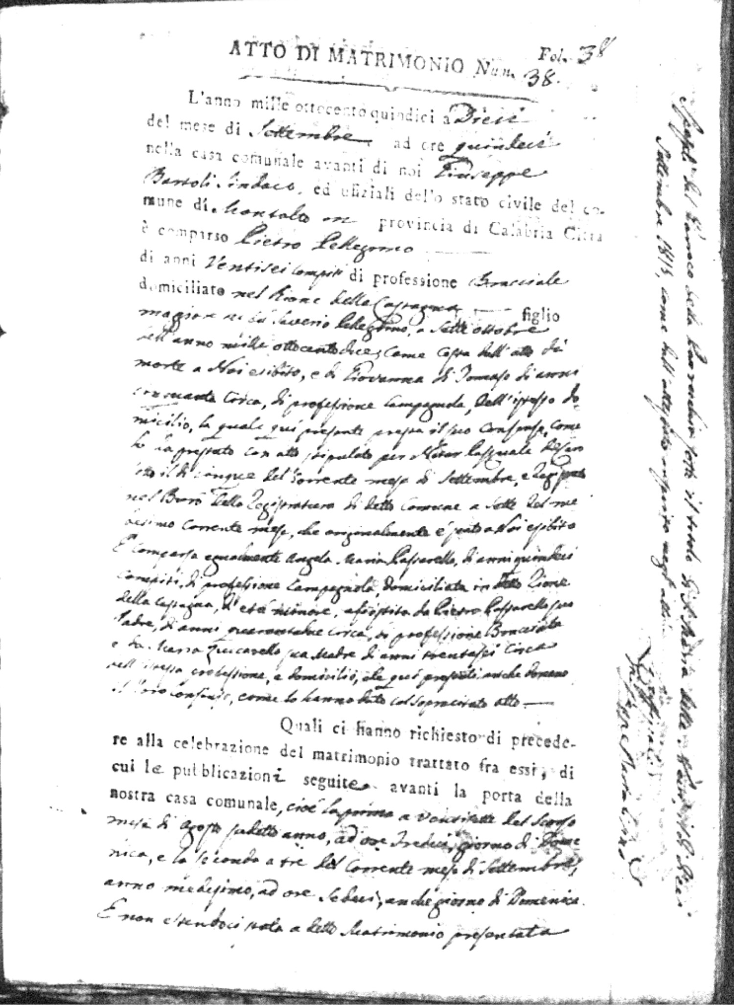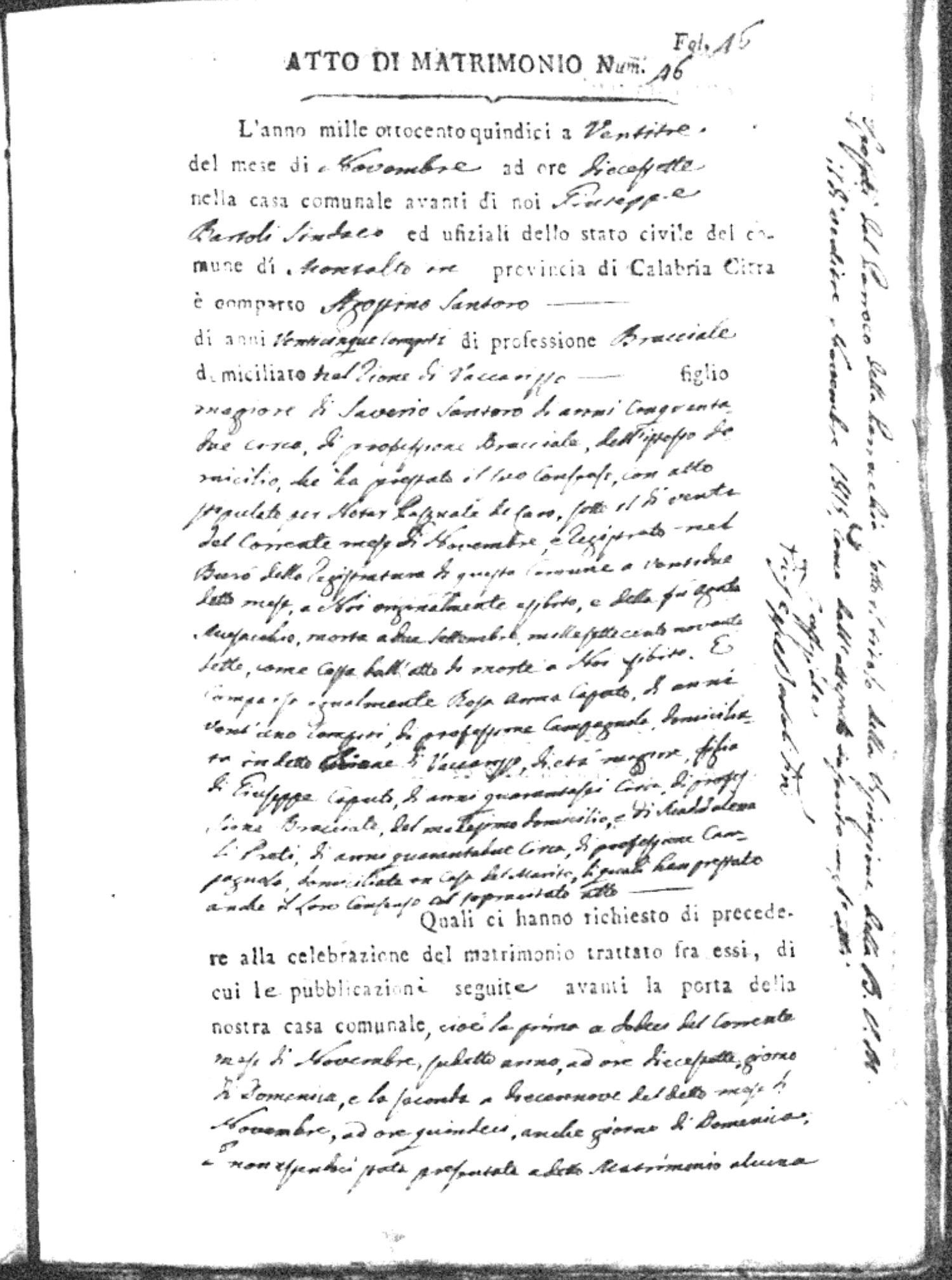 Here are the extractions for all the marriage acts in 1815 for Montalto Uffugo. This year is complete. For more information, click on the groom's surname to view a copy of the original document.