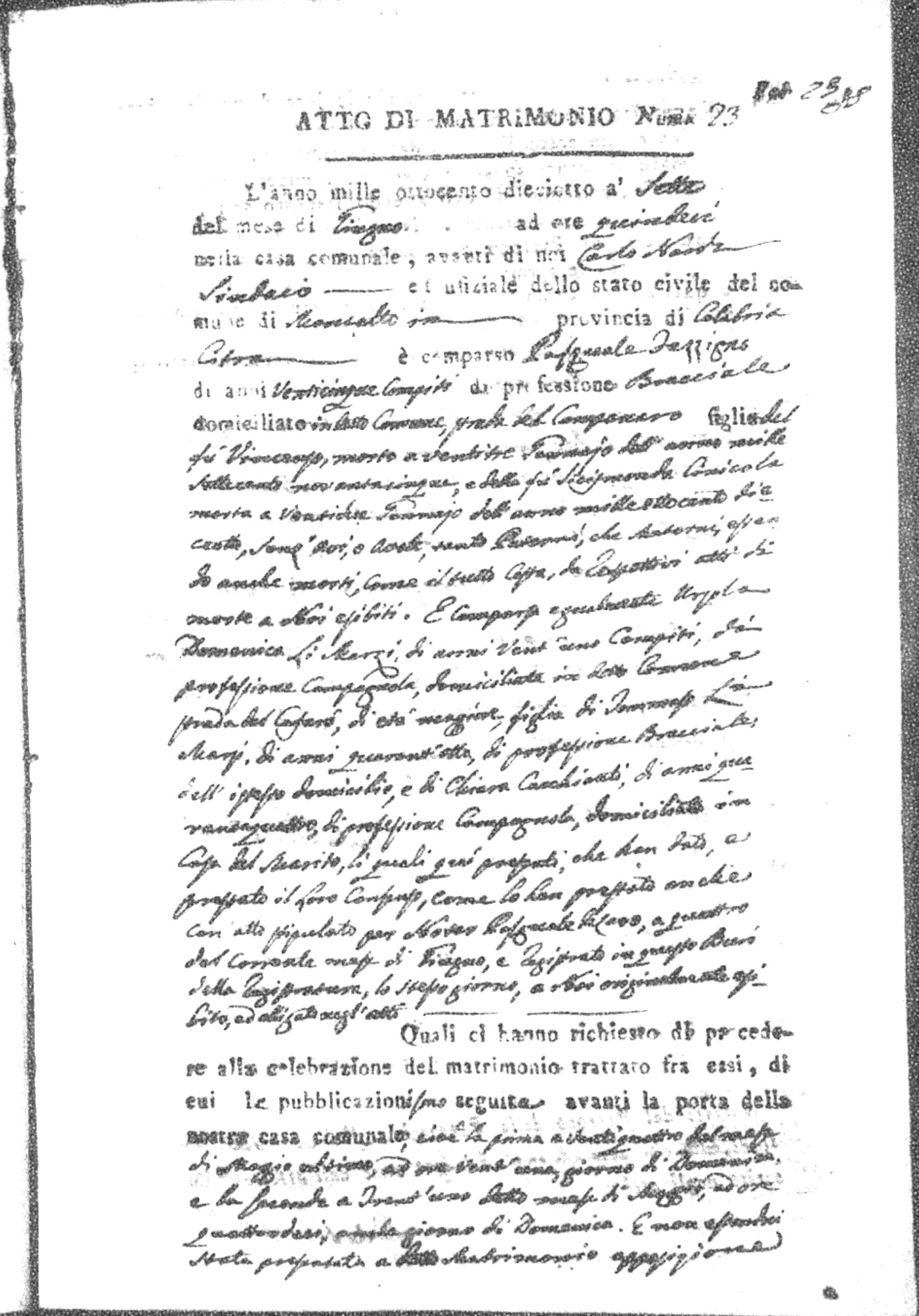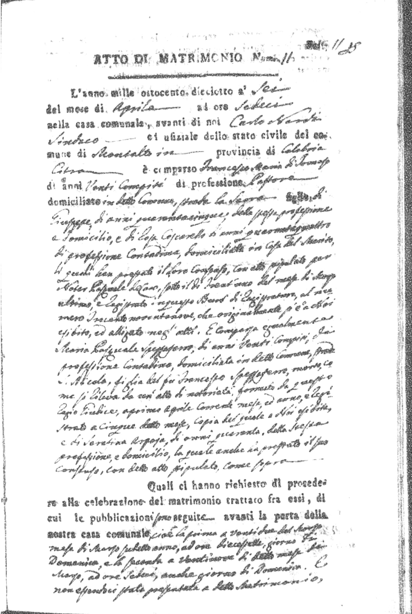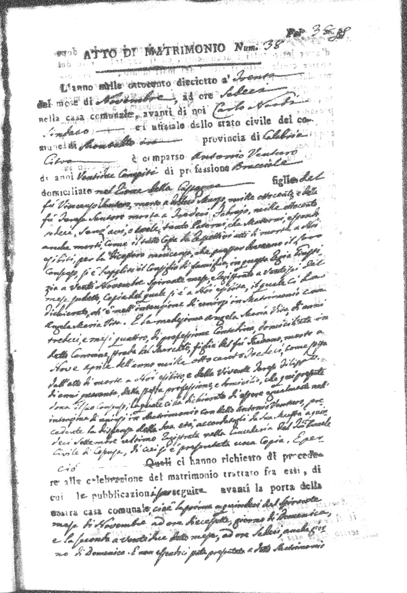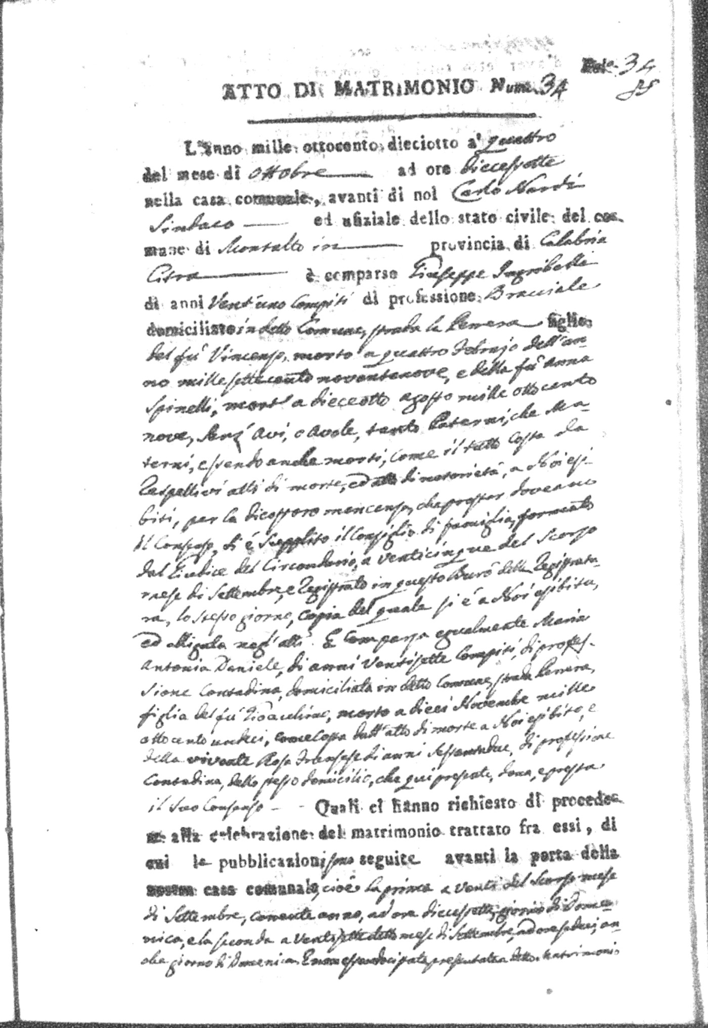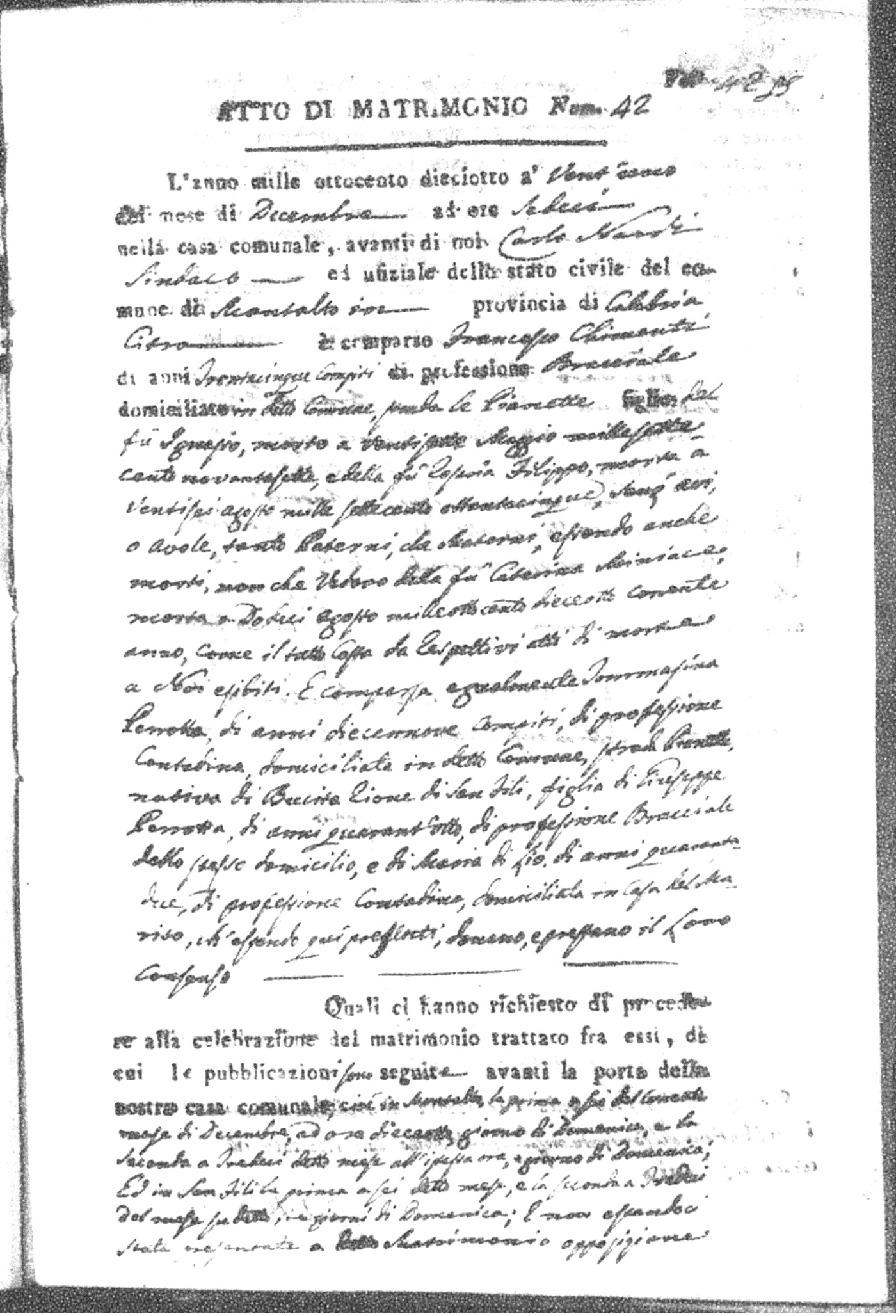 Here are the extractions for all the marriage acts in 1818 for Montalto Uffugo. For more information, click on the groom's surname to view page 1 of the copy of the original document and his first name to view page 2.
