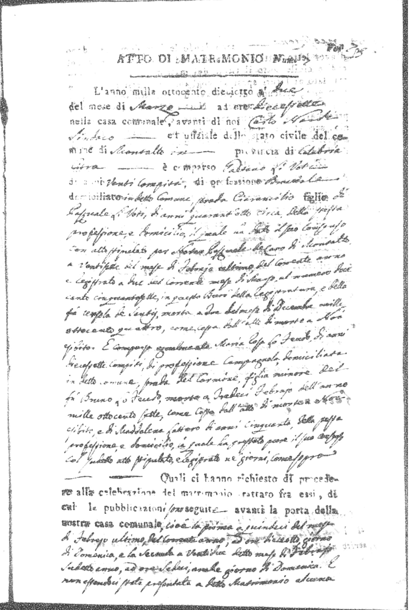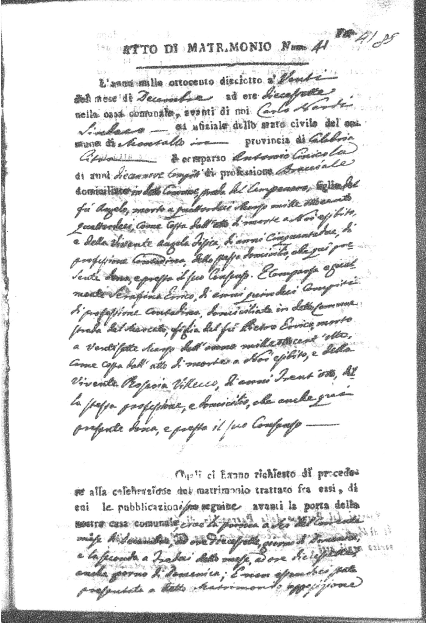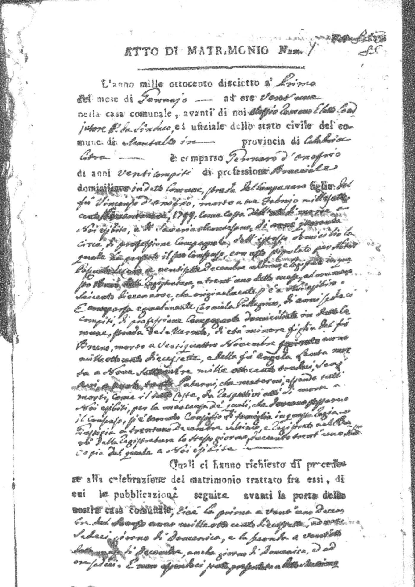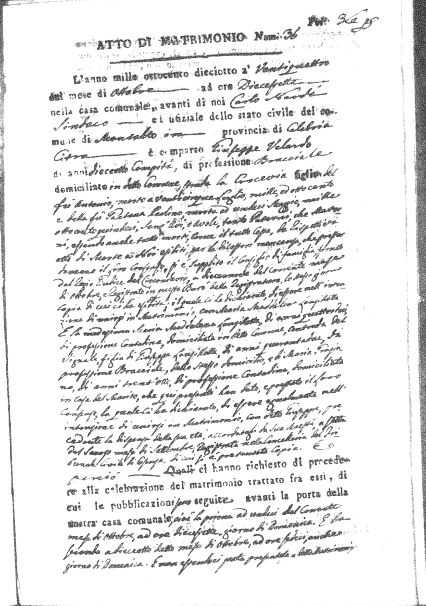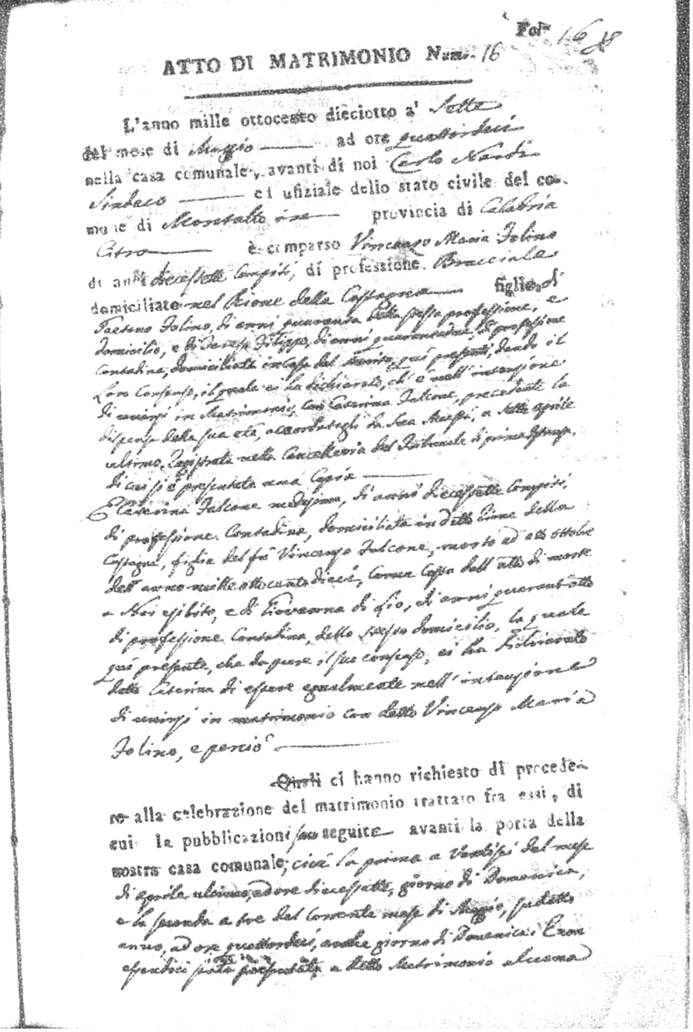 Here are the extractions for all the marriage acts in 1818 for Montalto Uffugo. For more information, click on the groom's surname to view page 1 of the copy of the original document and his first name to view page 2.