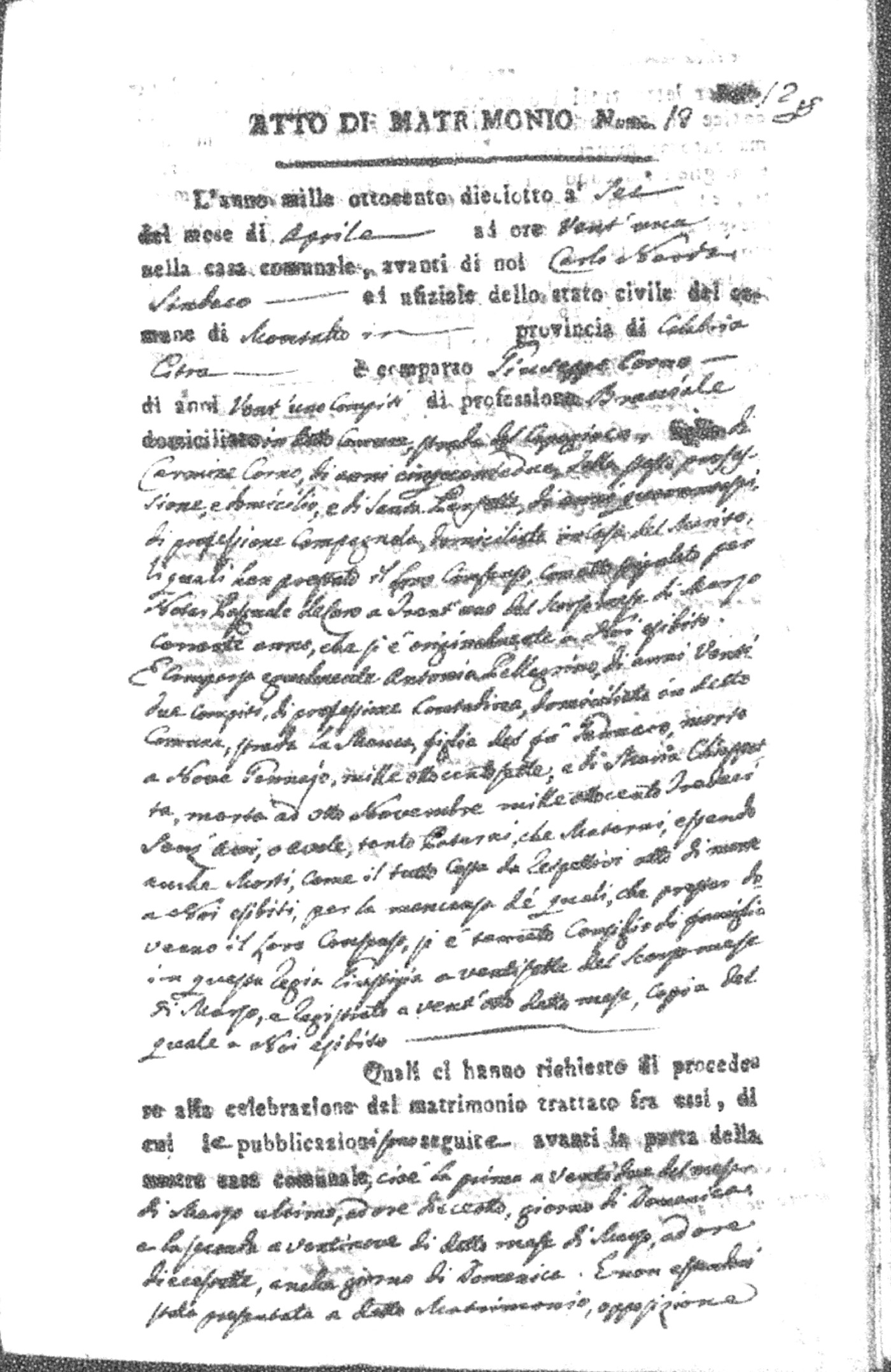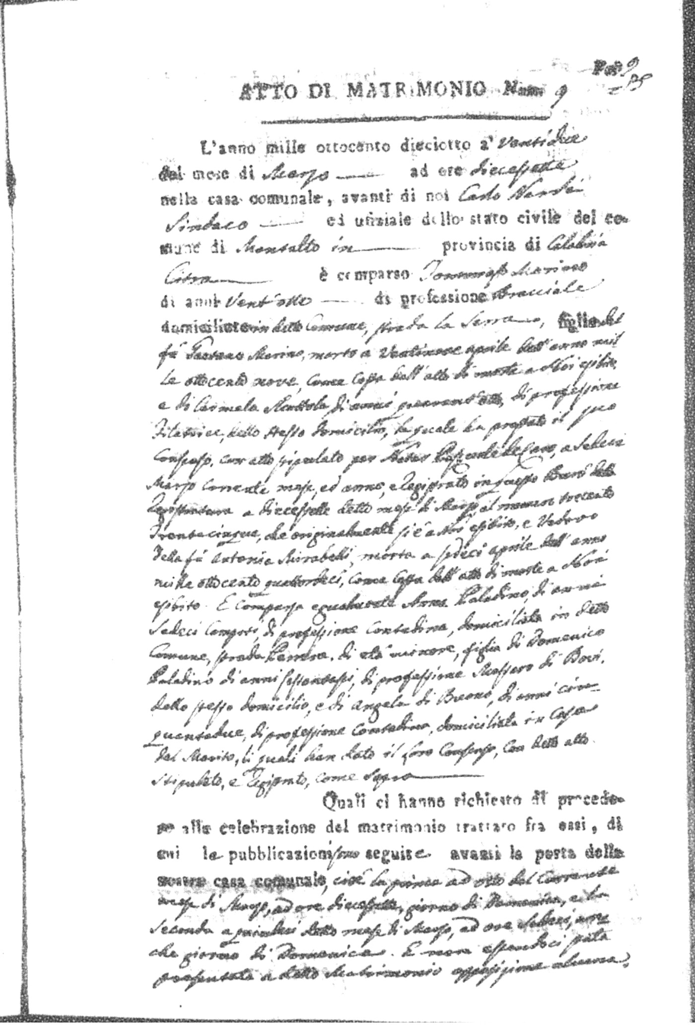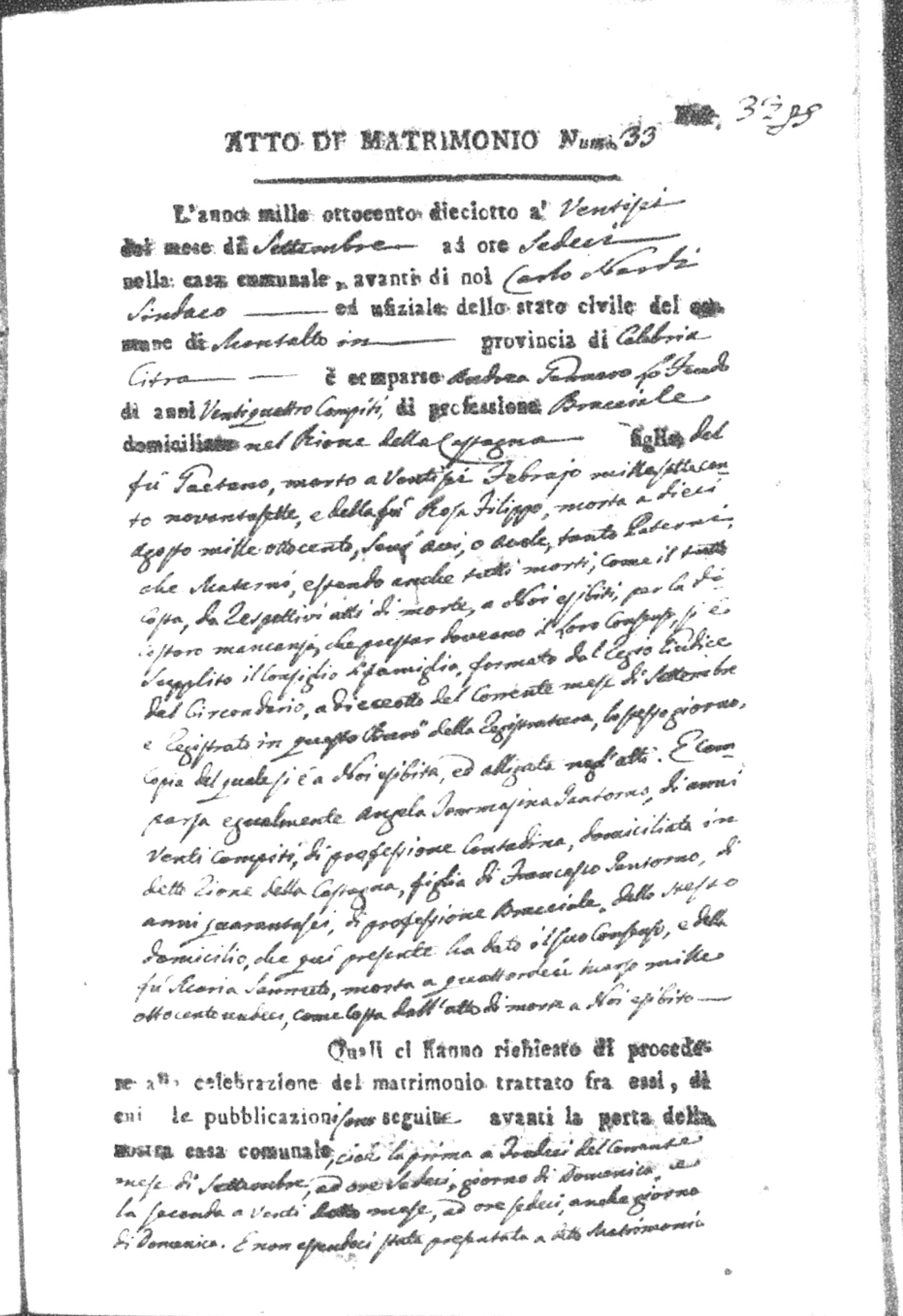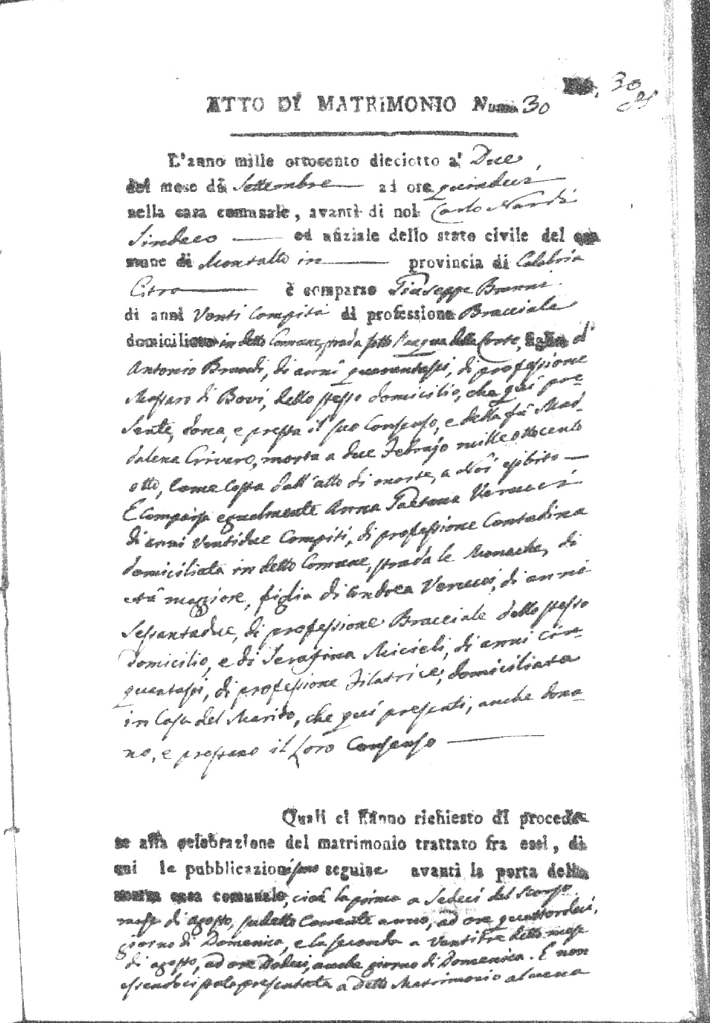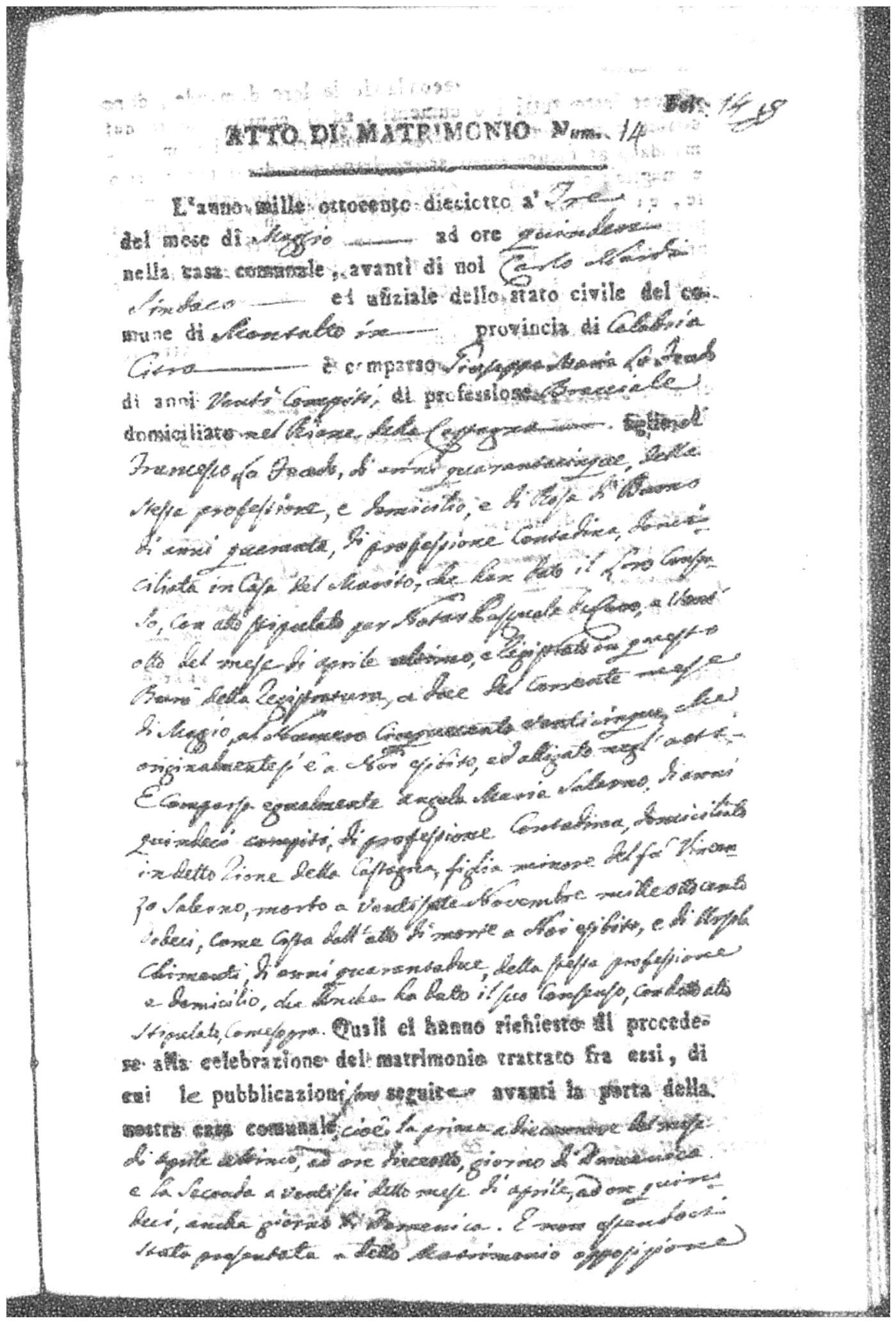 Here are the extractions for all the marriage acts in 1818 for Montalto Uffugo. For more information, click on the groom's surname to view page 1 of the copy of the original document and his first name to view page 2.