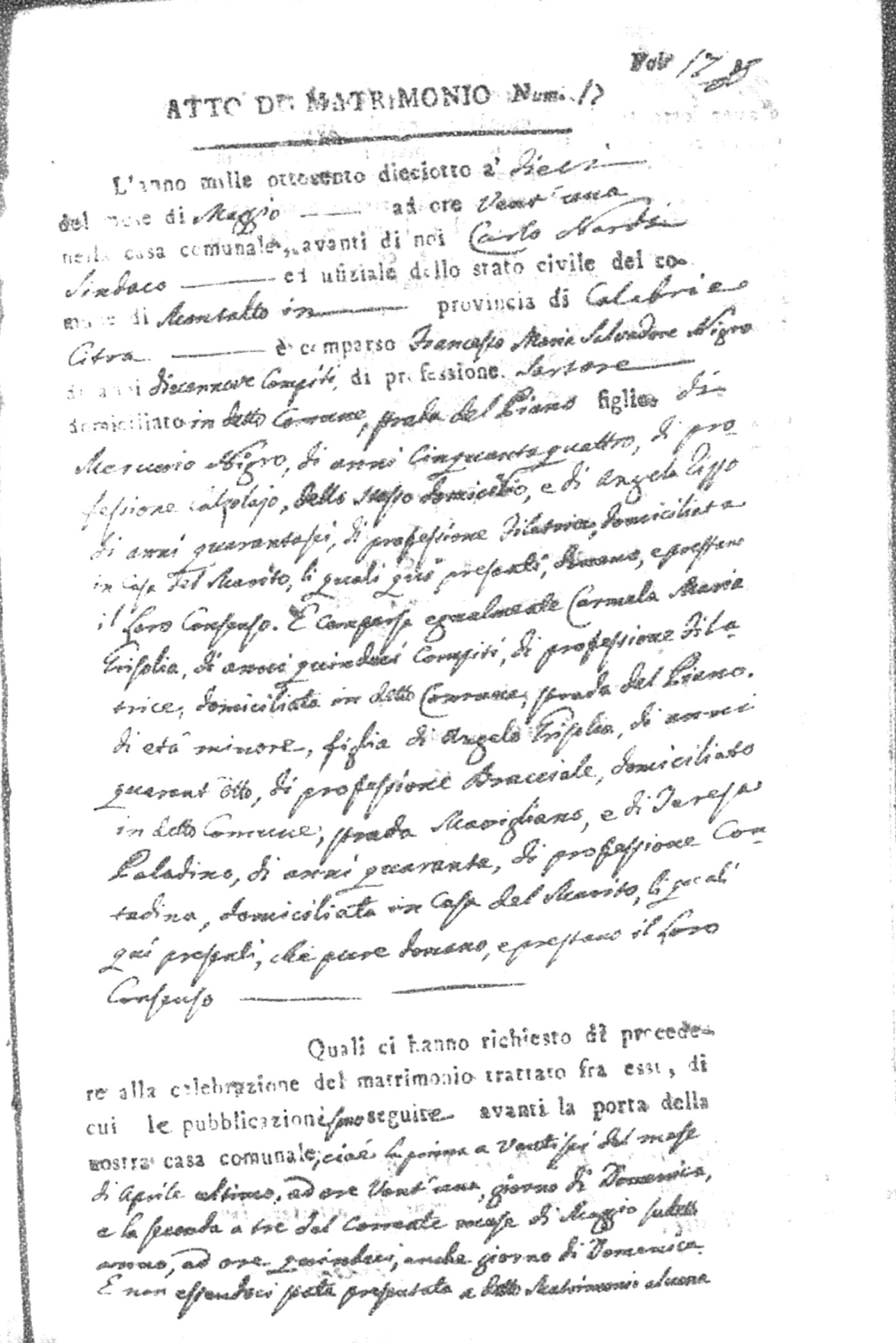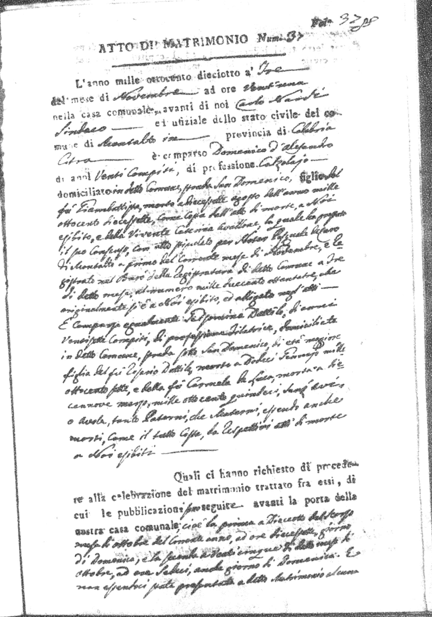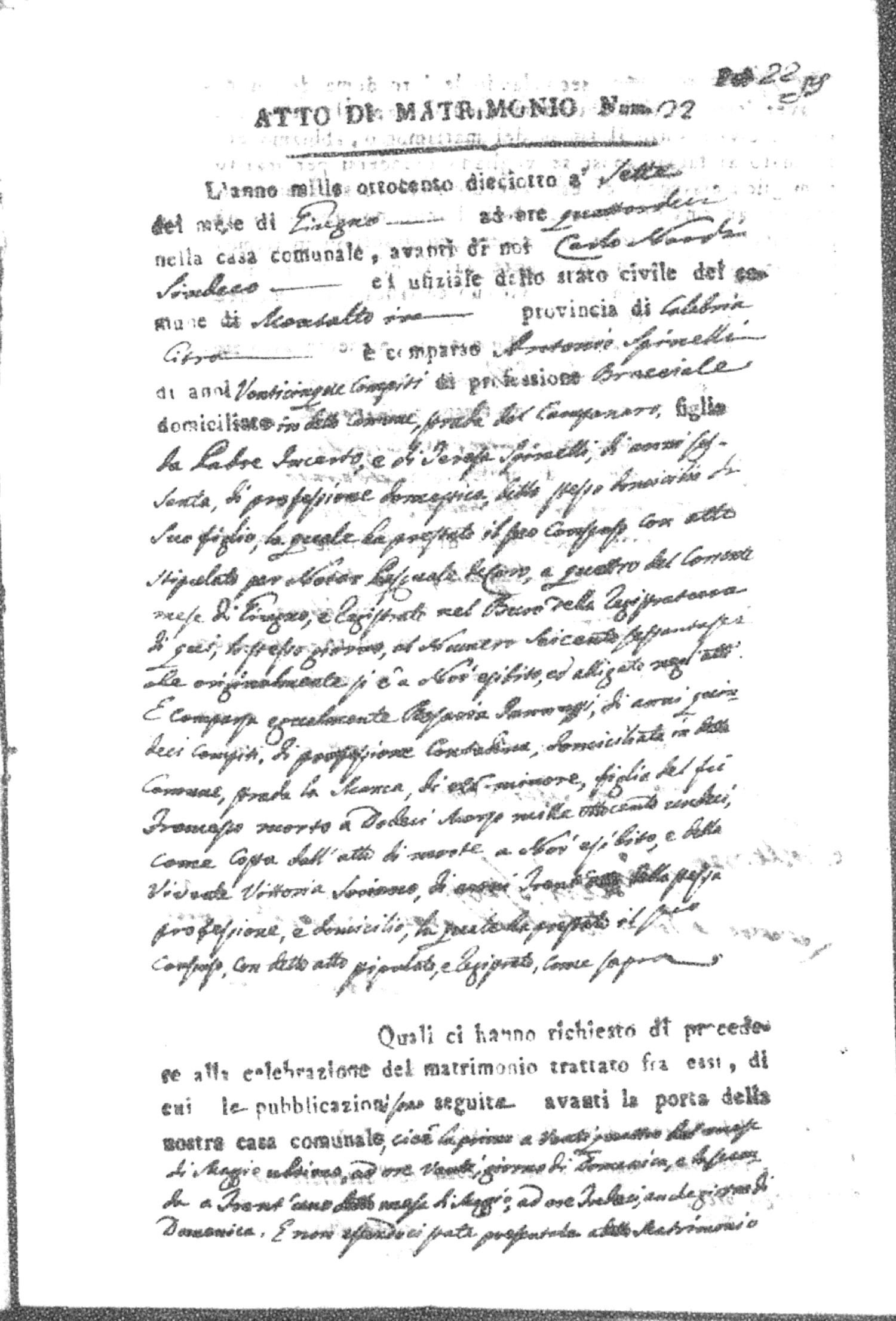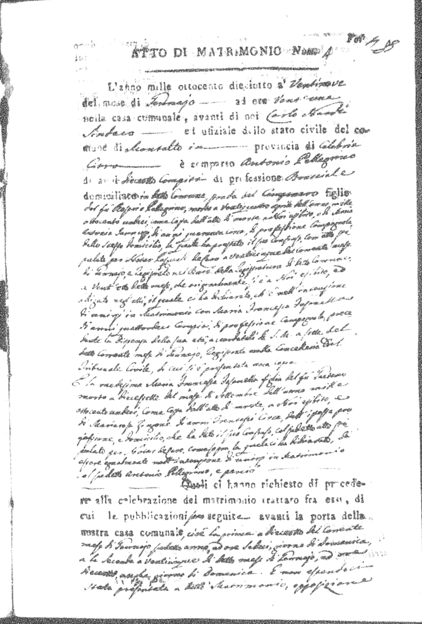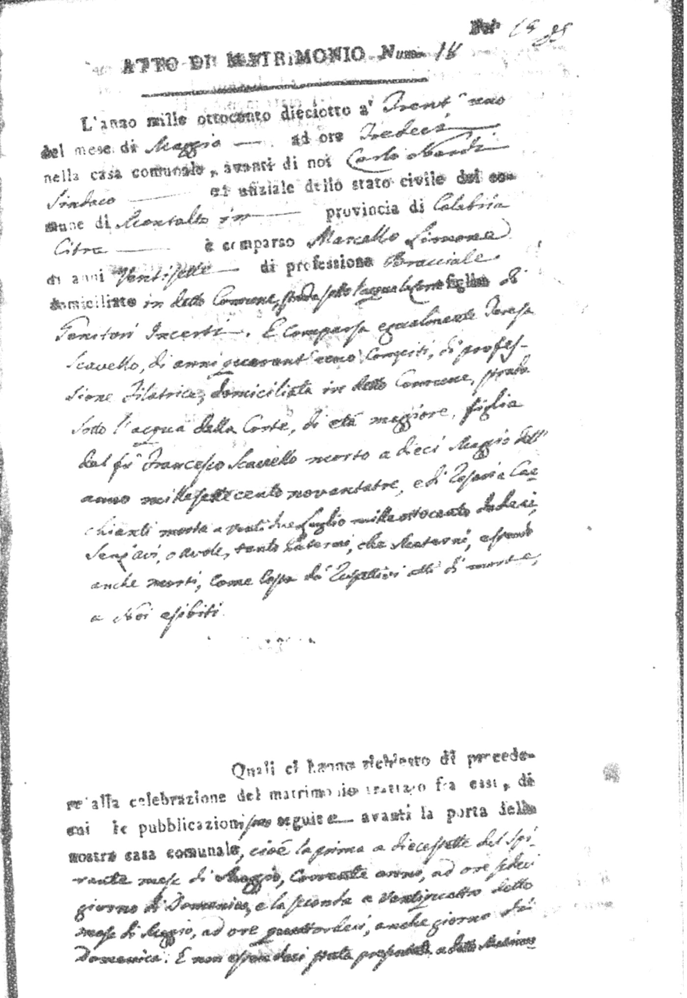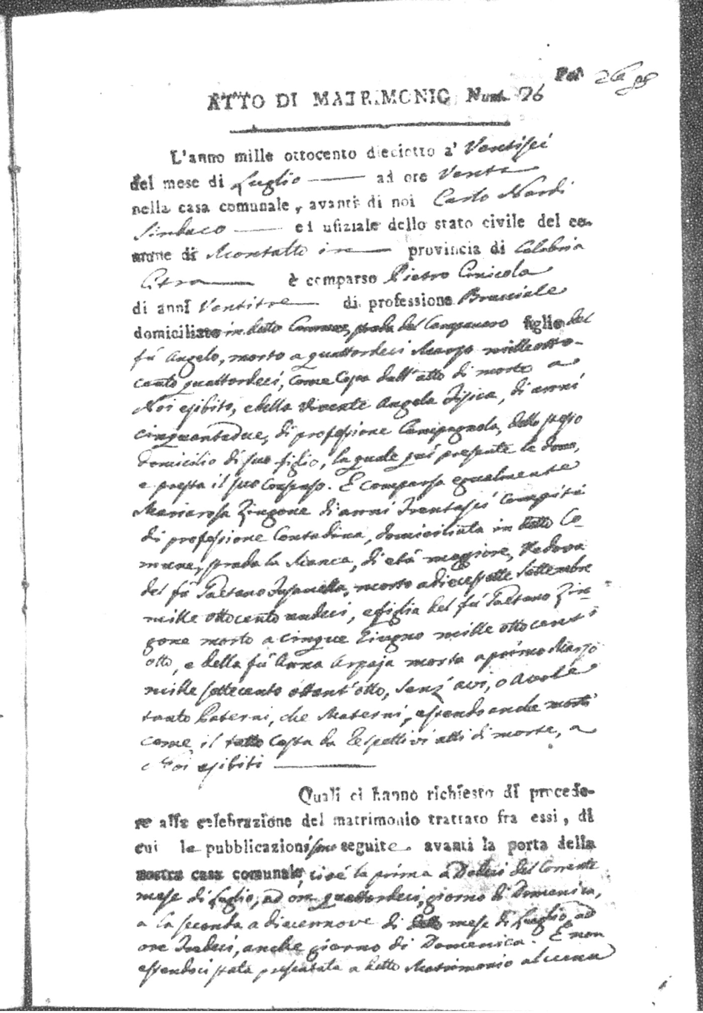 Here are the extractions for all the marriage acts in 1818 for Montalto Uffugo. For more information, click on the groom's surname to view page 1 of the copy of the original document and his first name to view page 2.