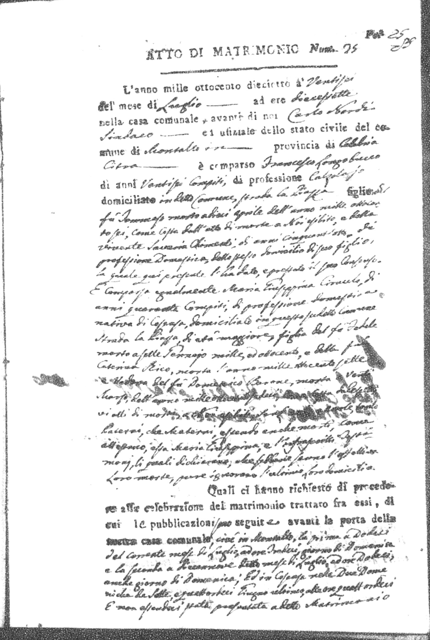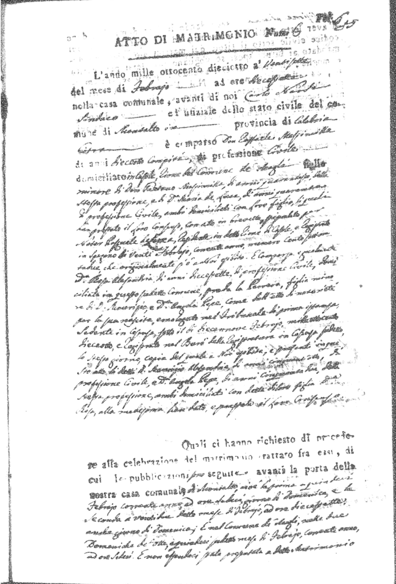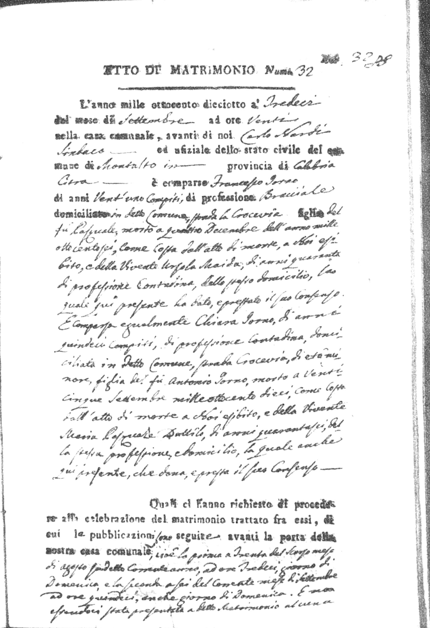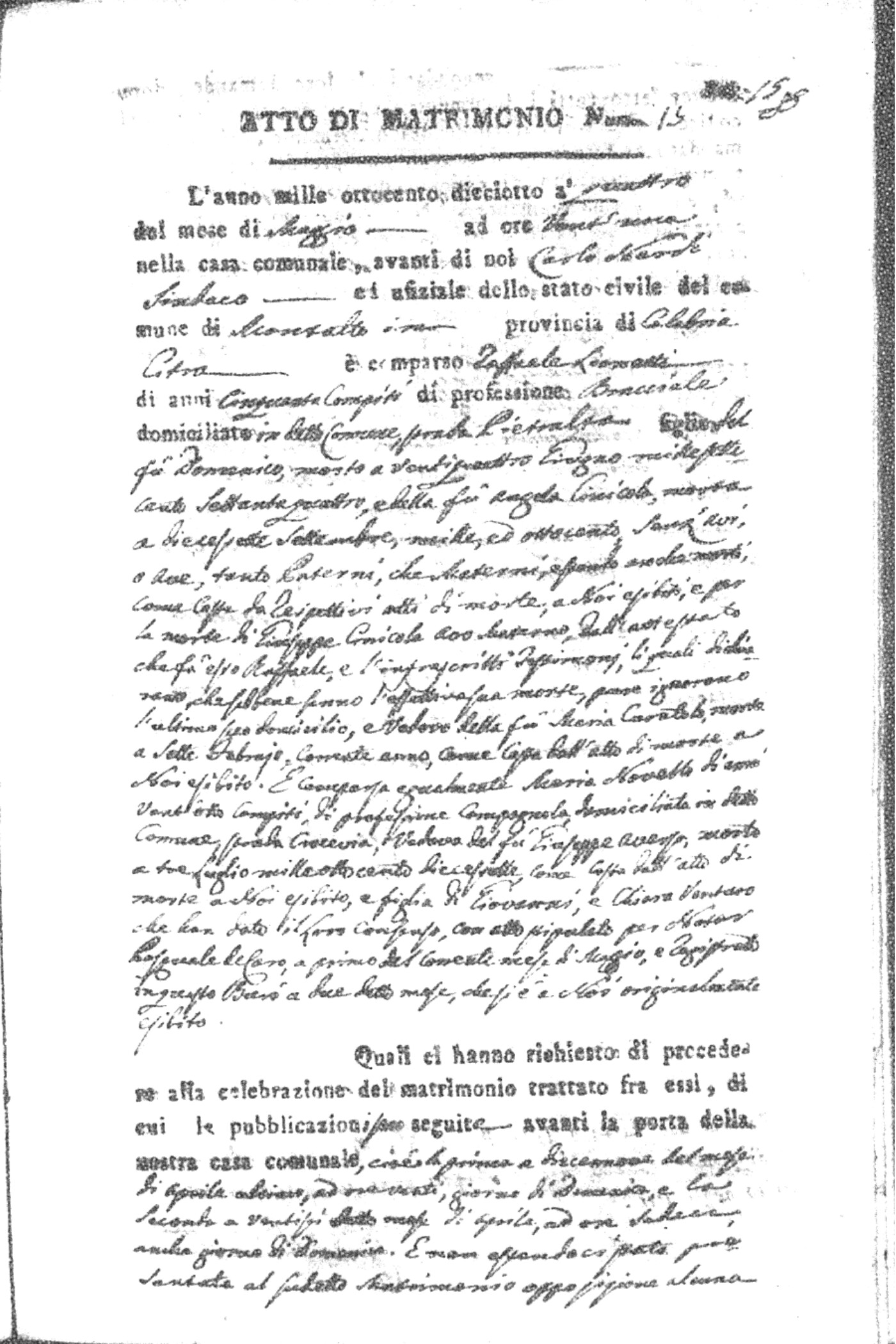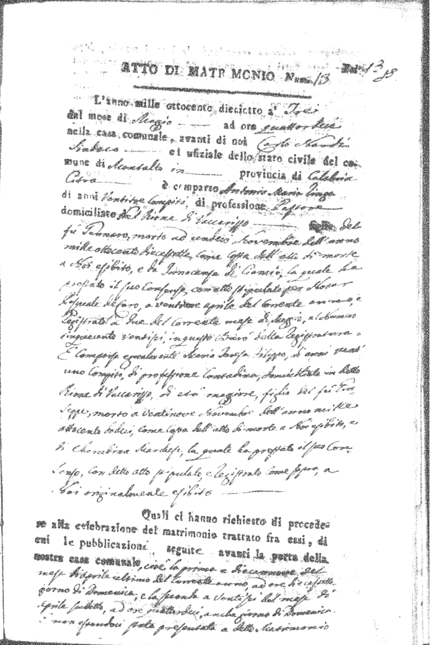 Here are the extractions for all the marriage acts in 1818 for Montalto Uffugo. For more information, click on the groom's surname to view page 1 of the copy of the original document and his first name to view page 2.