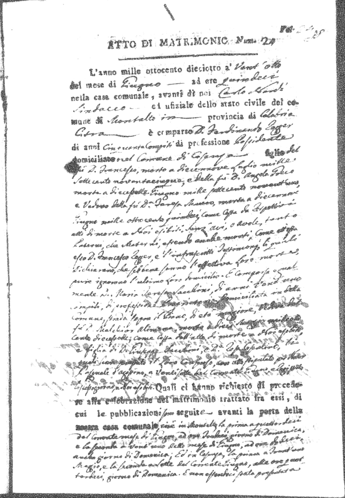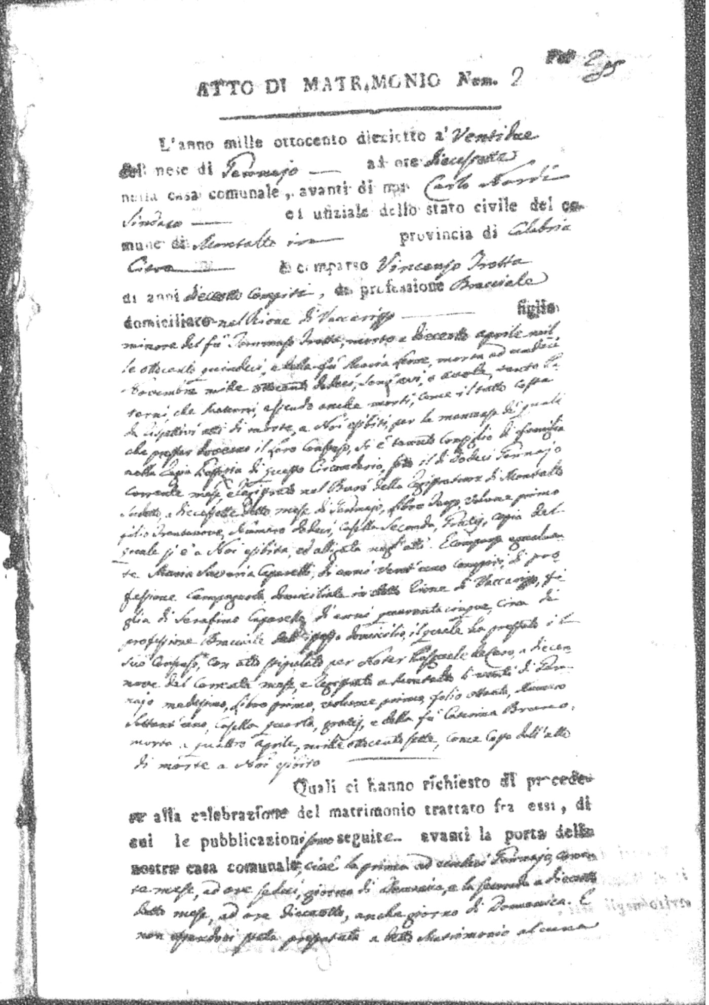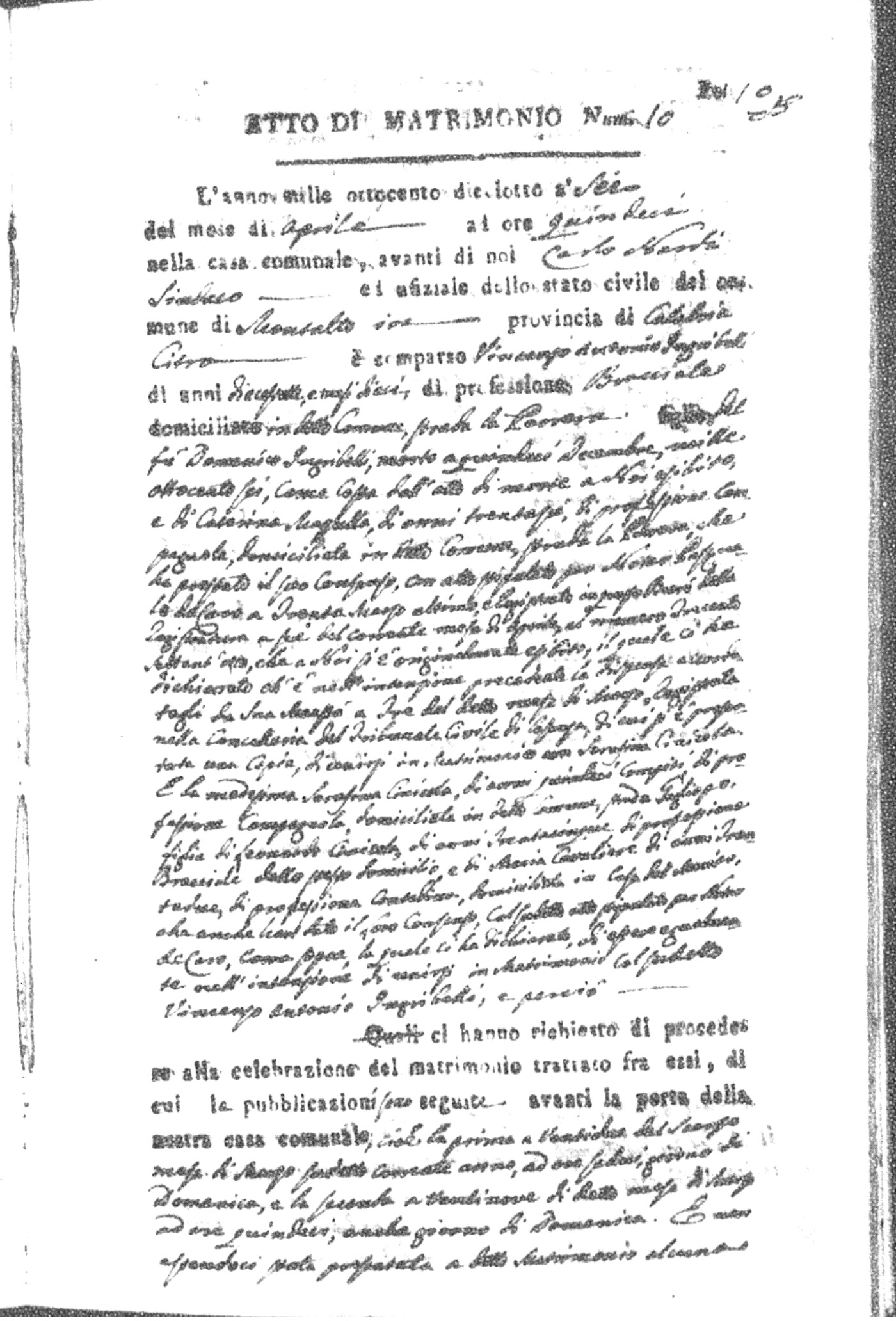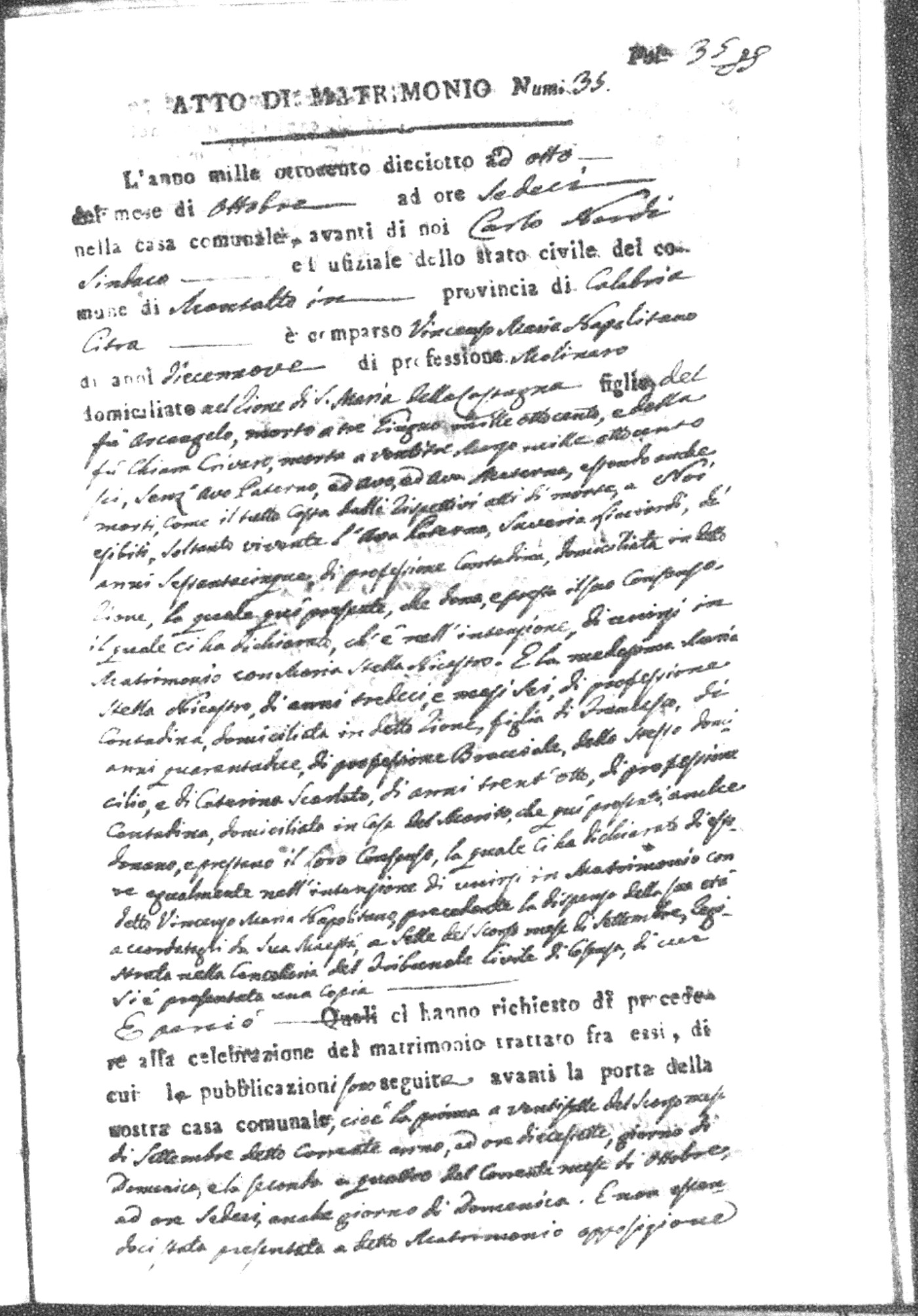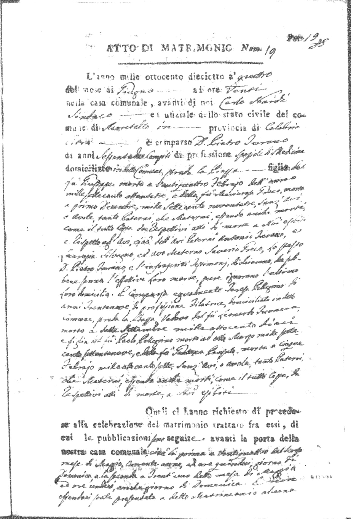 Here are the extractions for all the marriage acts in 1818 for Montalto Uffugo. For more information, click on the groom's surname to view page 1 of the copy of the original document and his first name to view page 2.