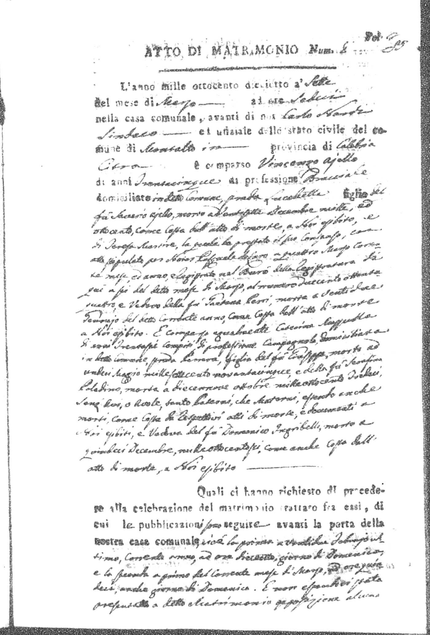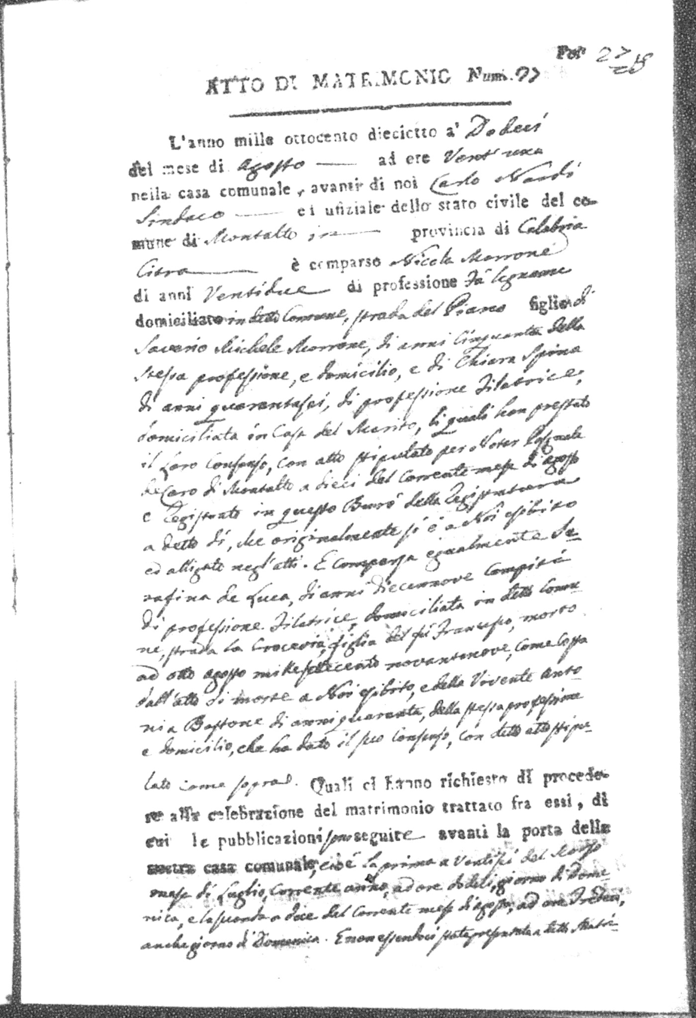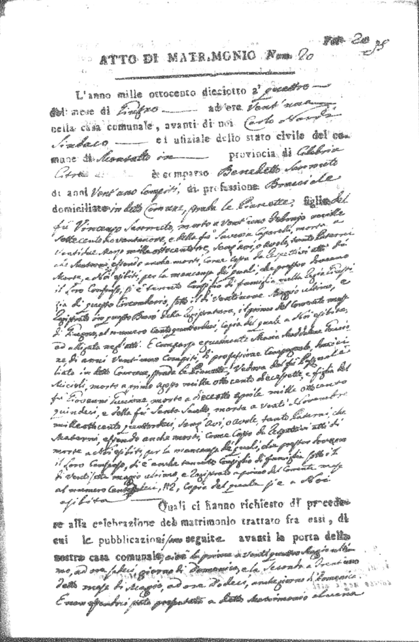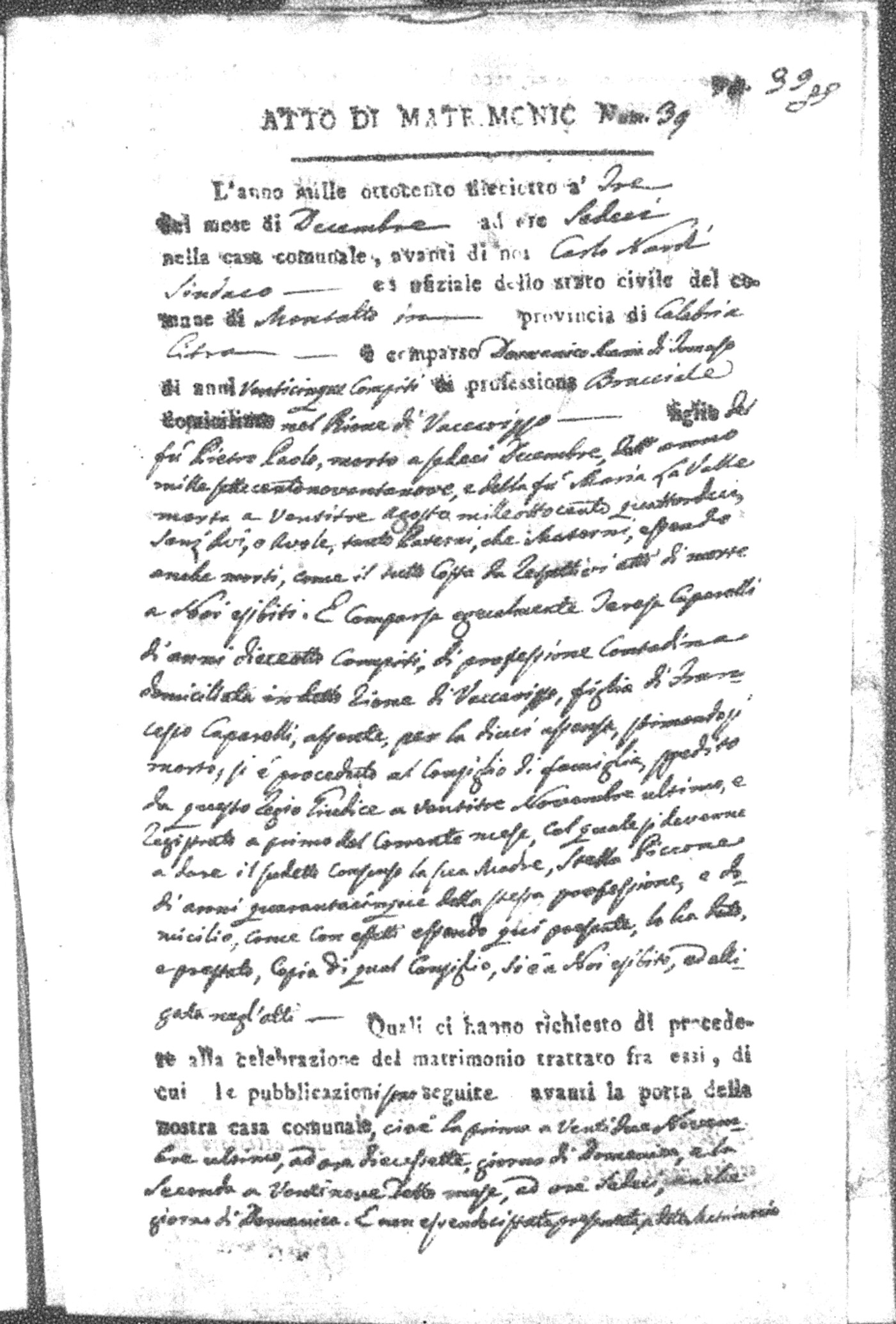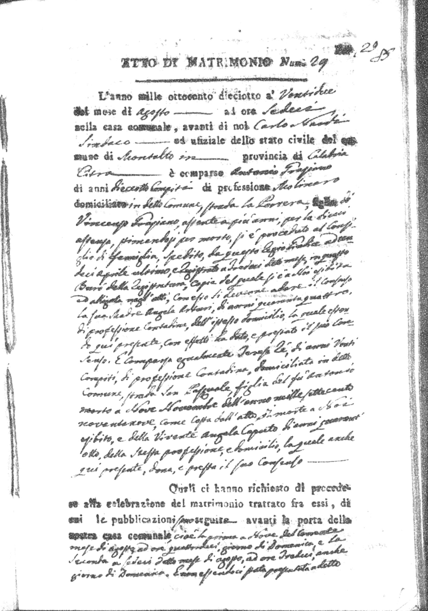 Here are the extractions for all the marriage acts in 1818 for Montalto Uffugo. For more information, click on the groom's surname to view page 1 of the copy of the original document and his first name to view page 2.