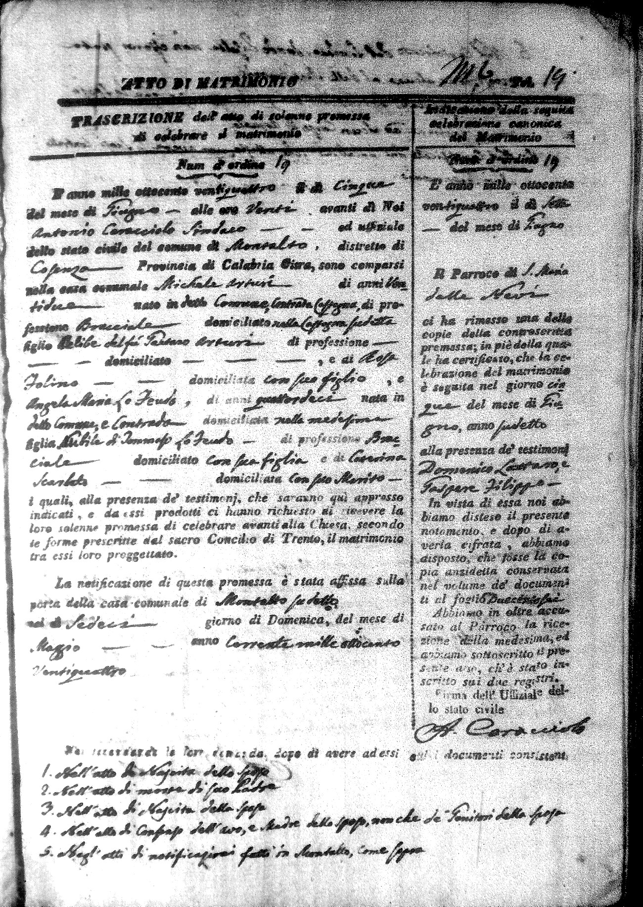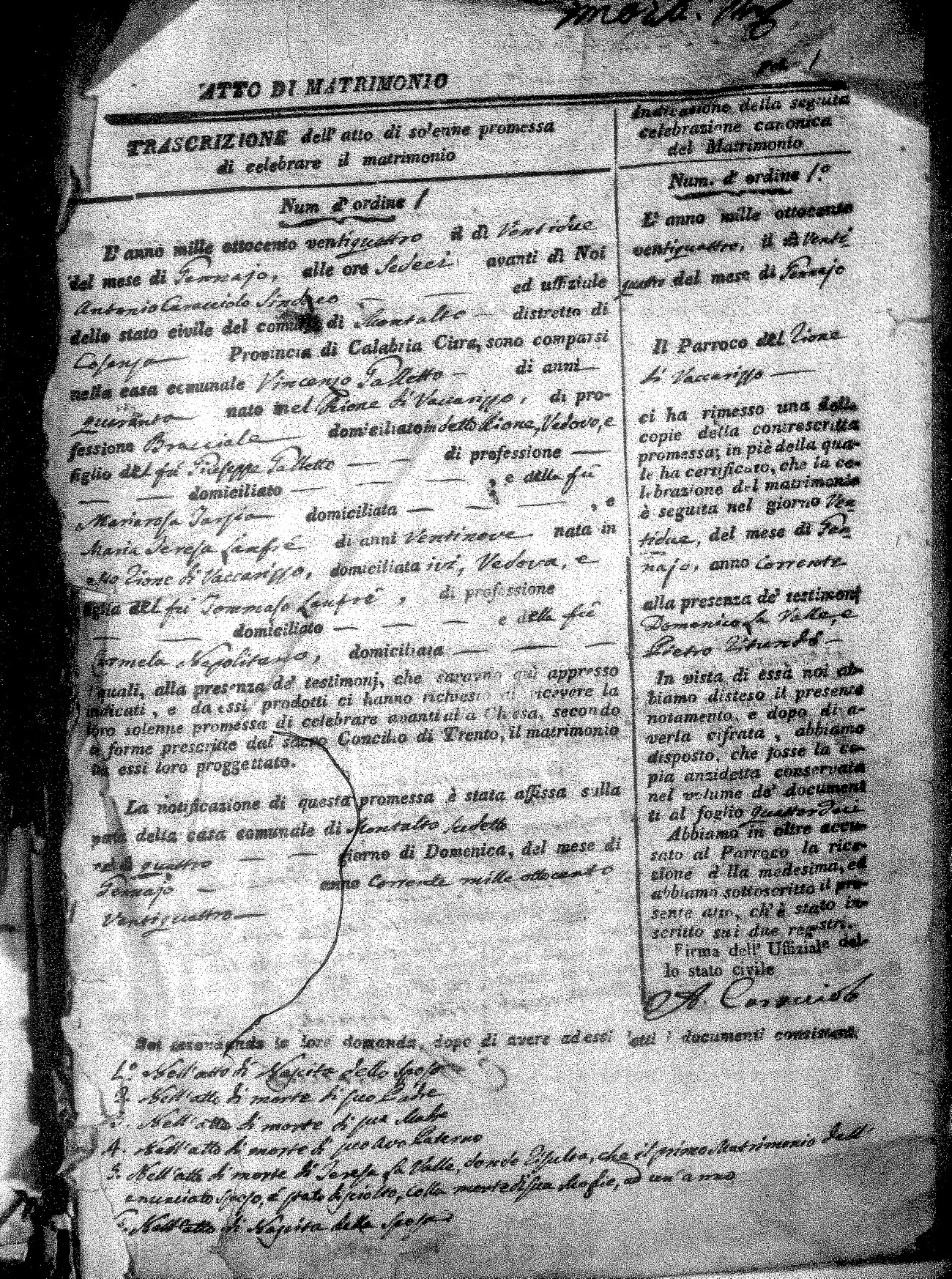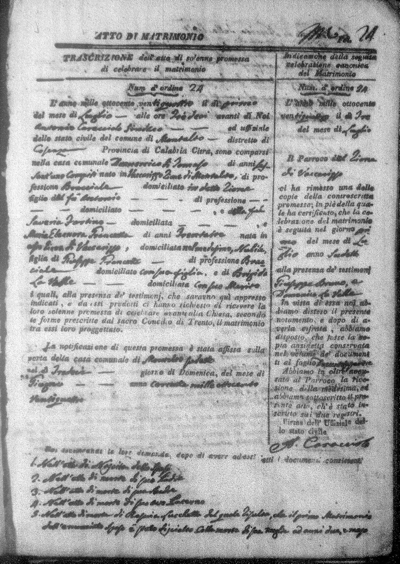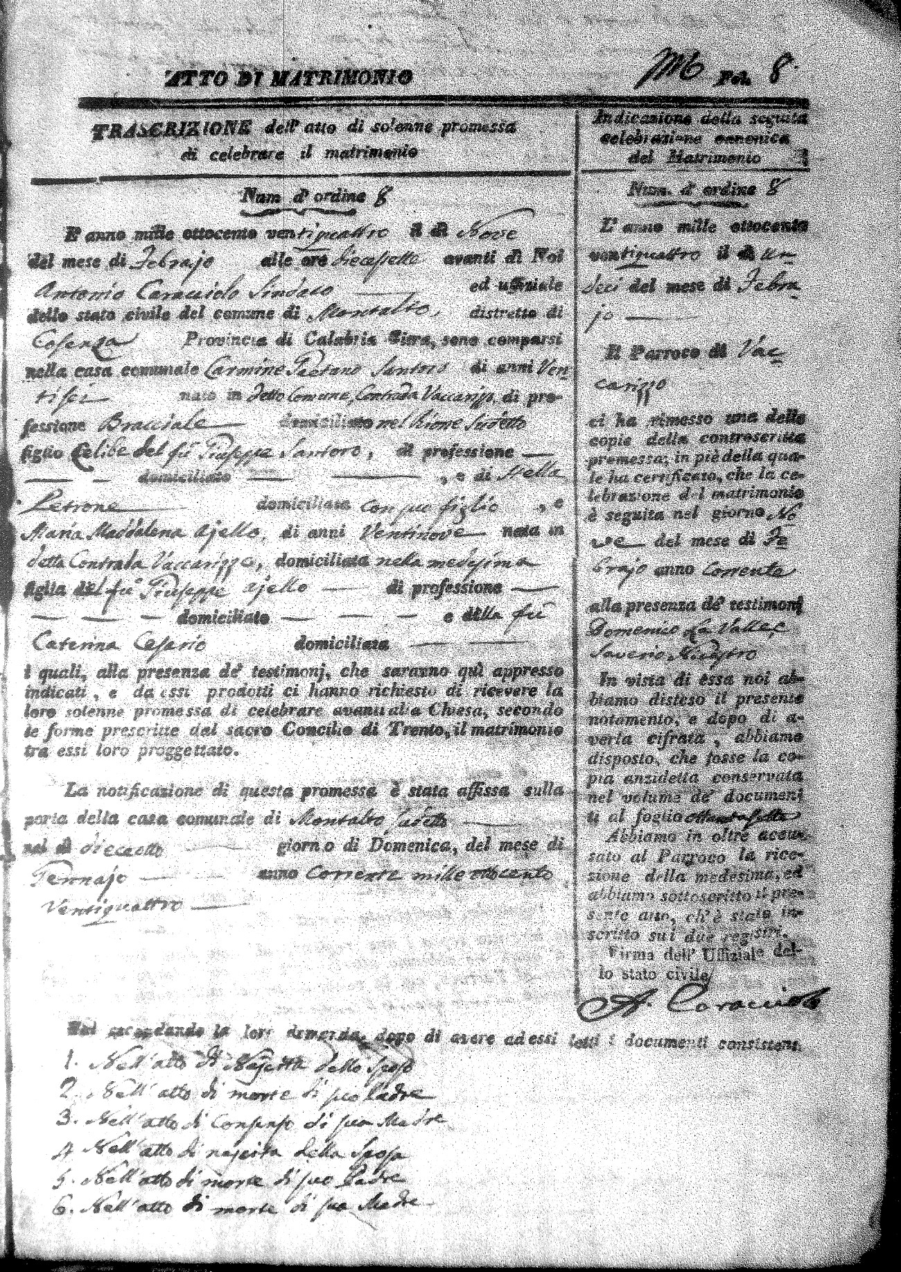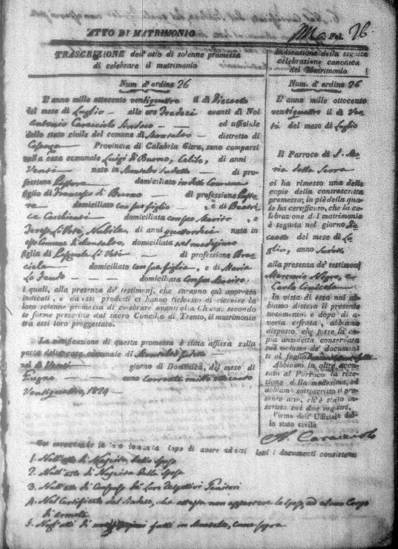 Here are the extractions for all the marriage acts in 1824 for Montalto Uffugo. This year is not complete yet, however it will be complete within a week. For more information, click on the groom's surname to view a copy of the original document.