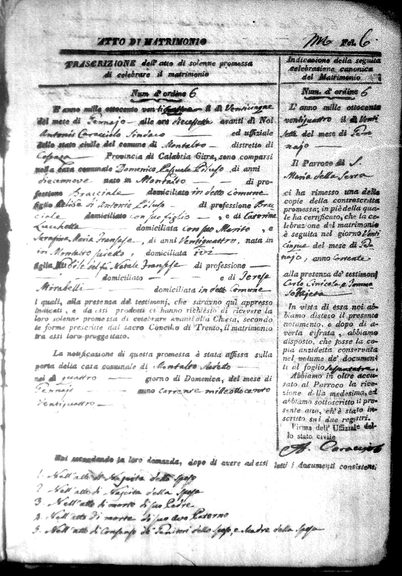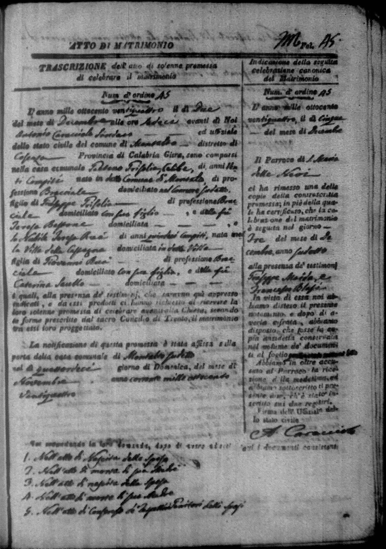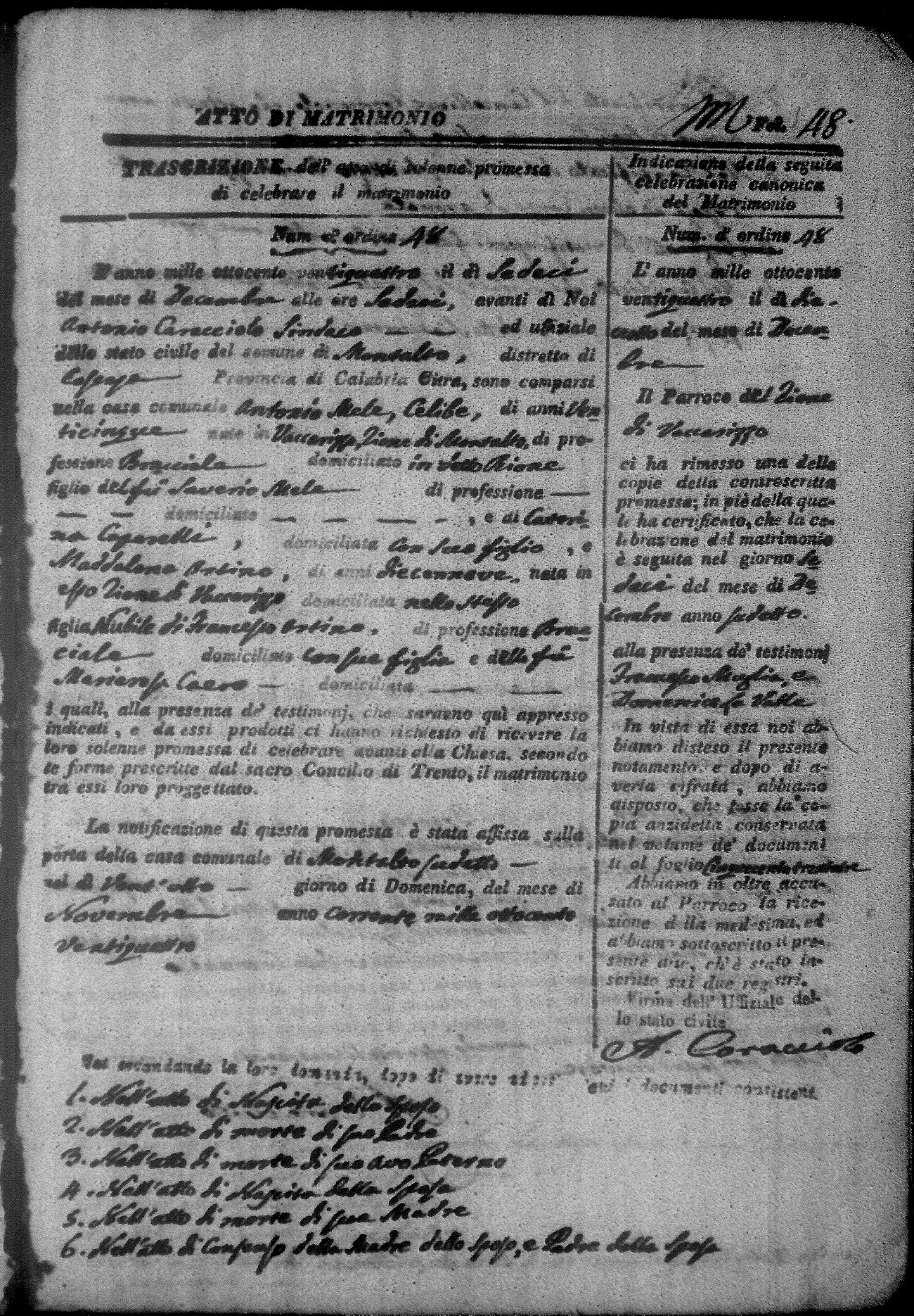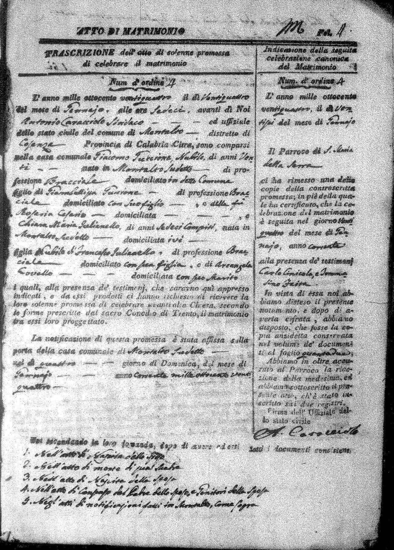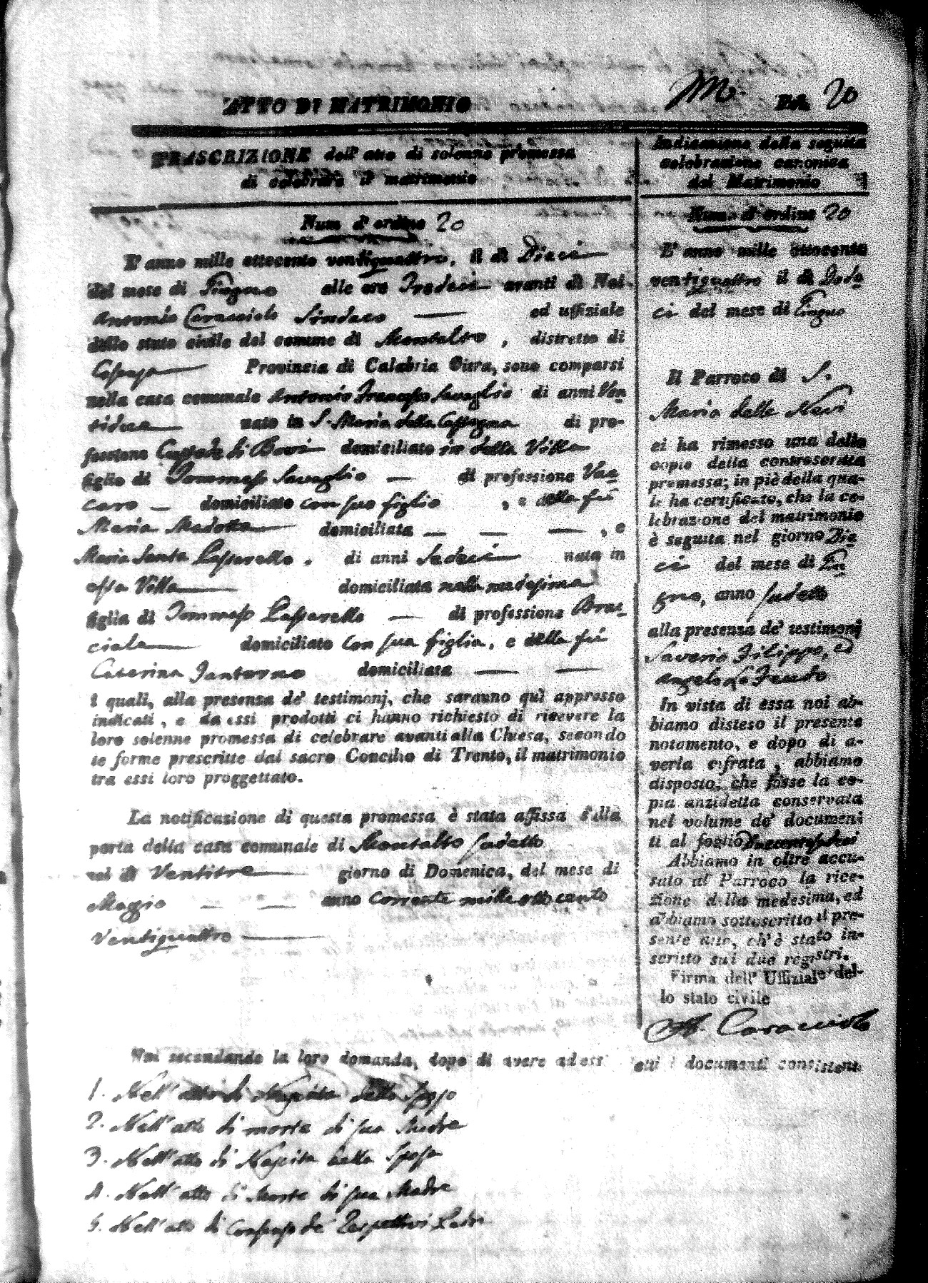 Here are the extractions for all the marriage acts in 1824 for Montalto Uffugo. This year is not complete yet, however it will be complete within a week. For more information, click on the groom's surname to view a copy of the original document.