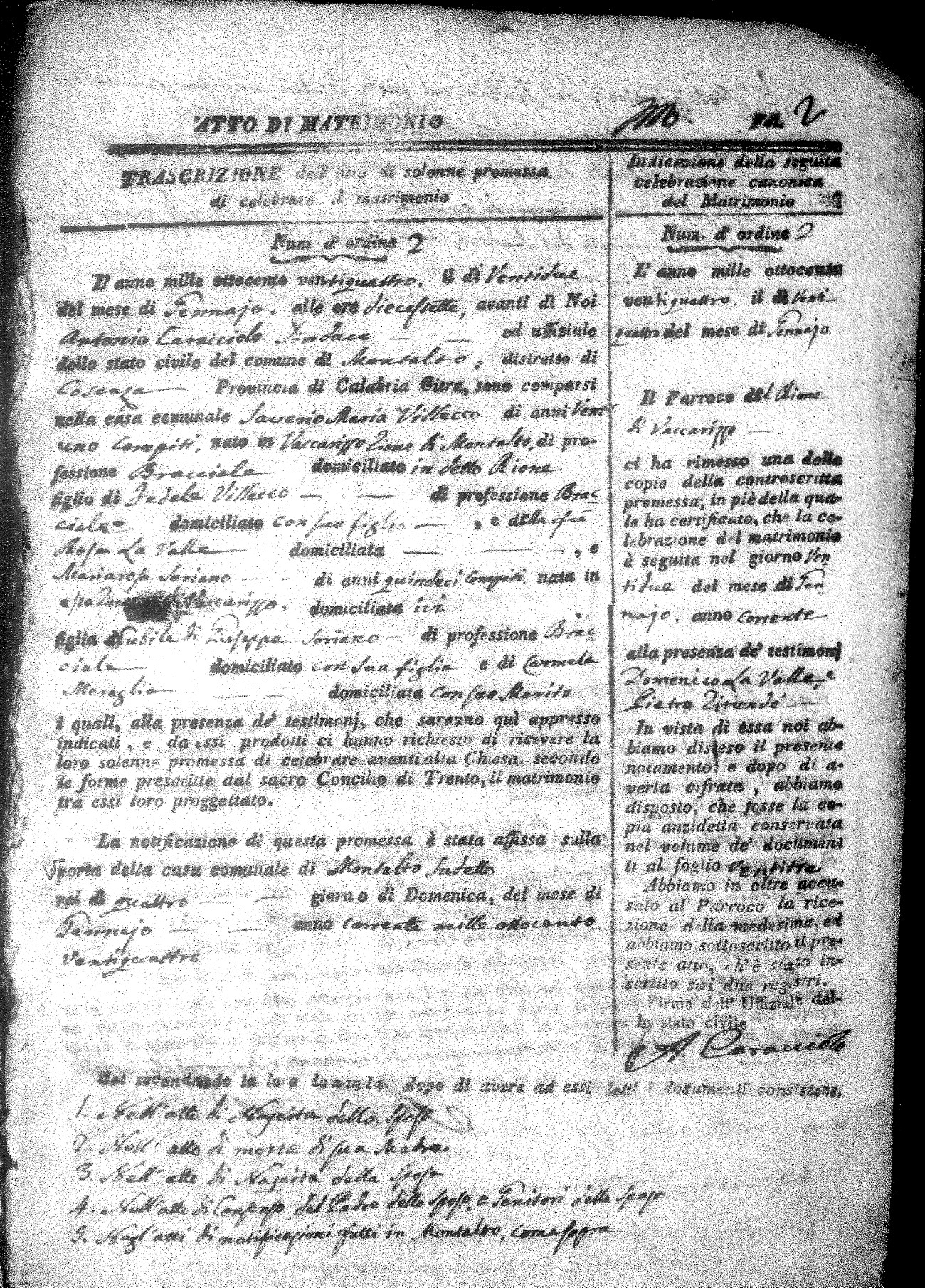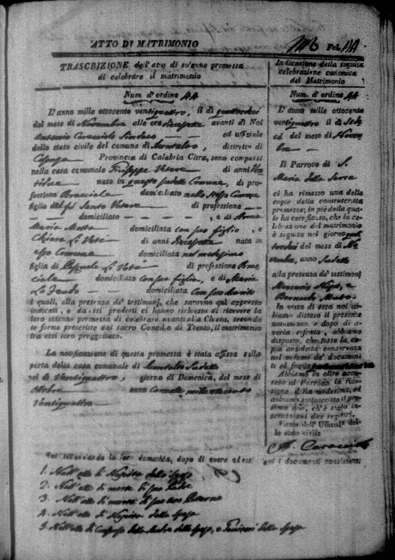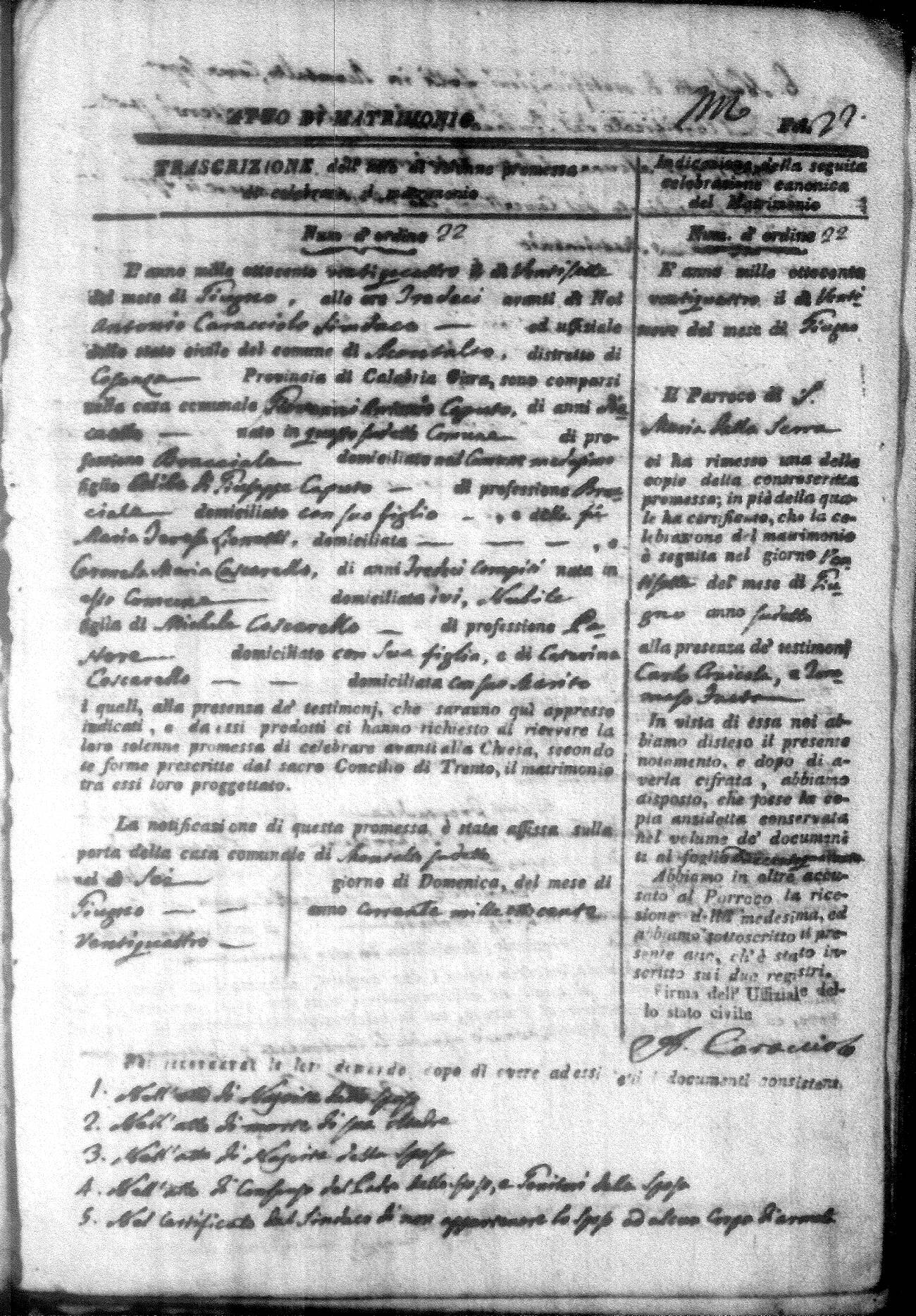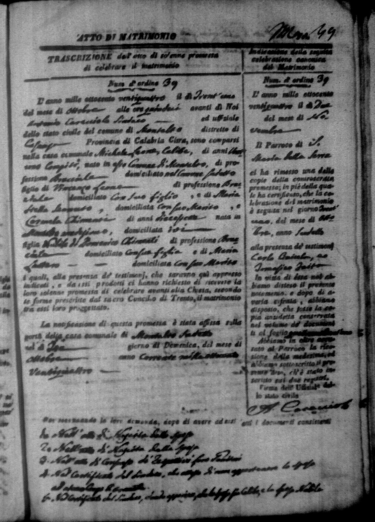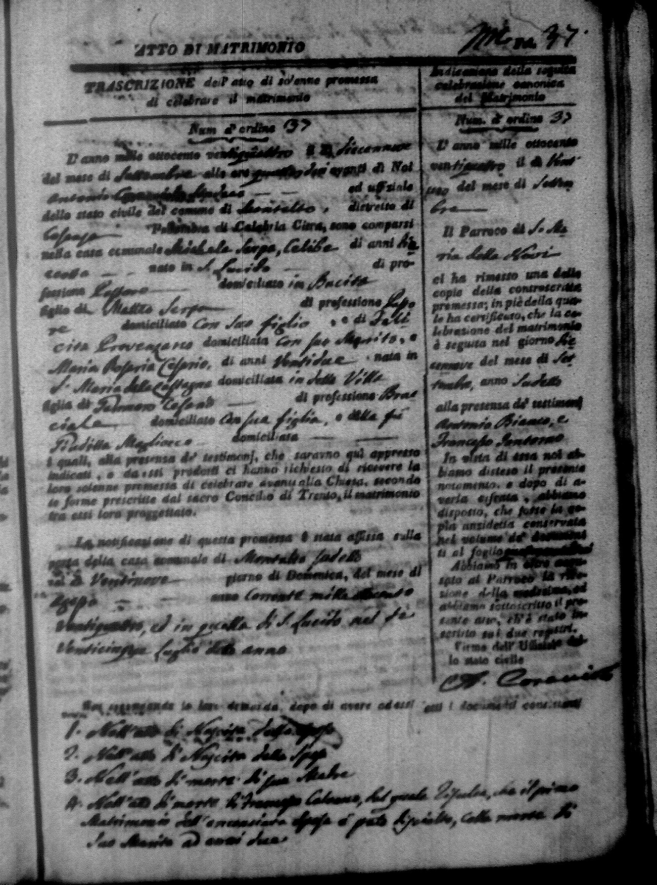 Here are the extractions for all the marriage acts in 1824 for Montalto Uffugo. This year is not complete yet, however it will be complete within a week. For more information, click on the groom's surname to view a copy of the original document.