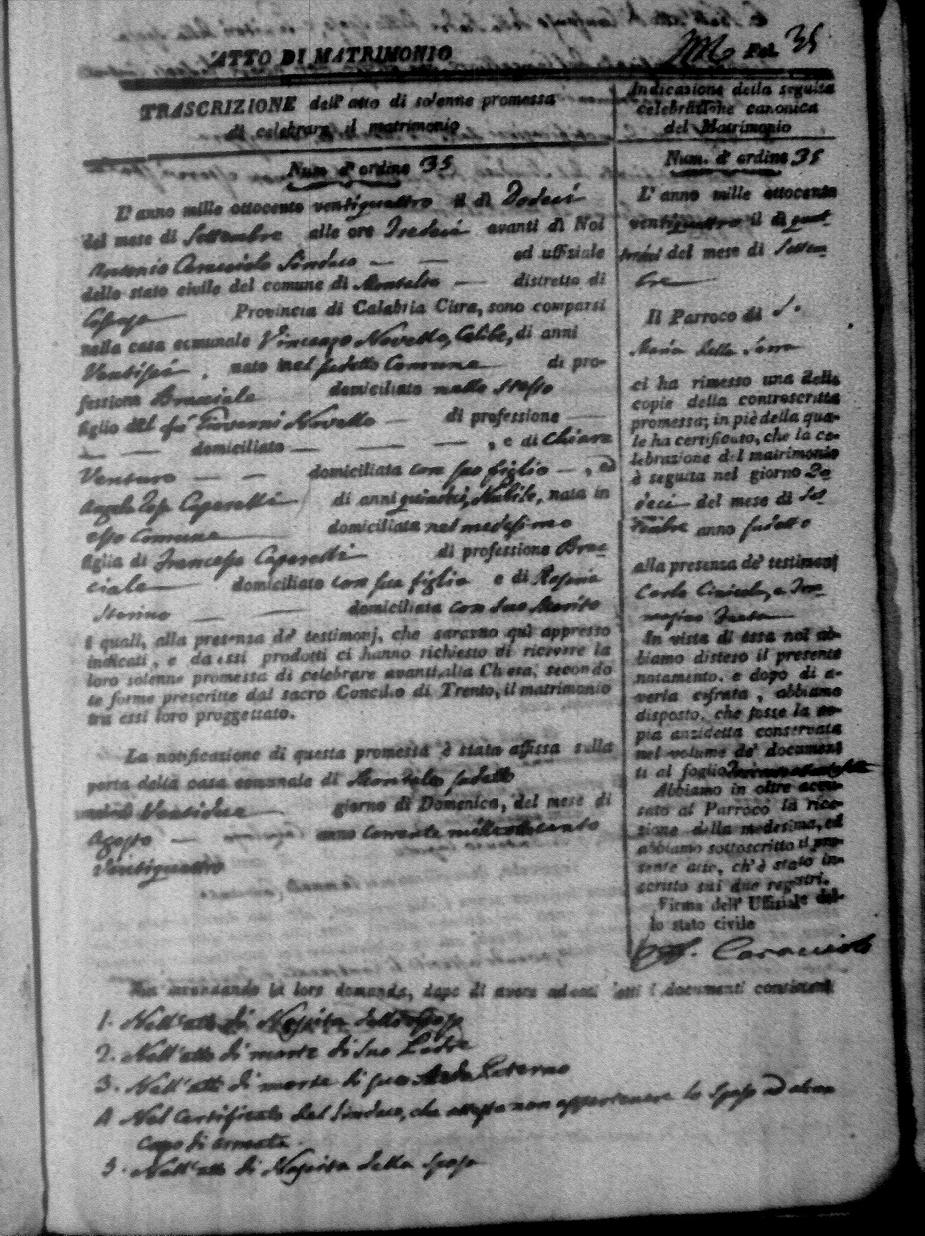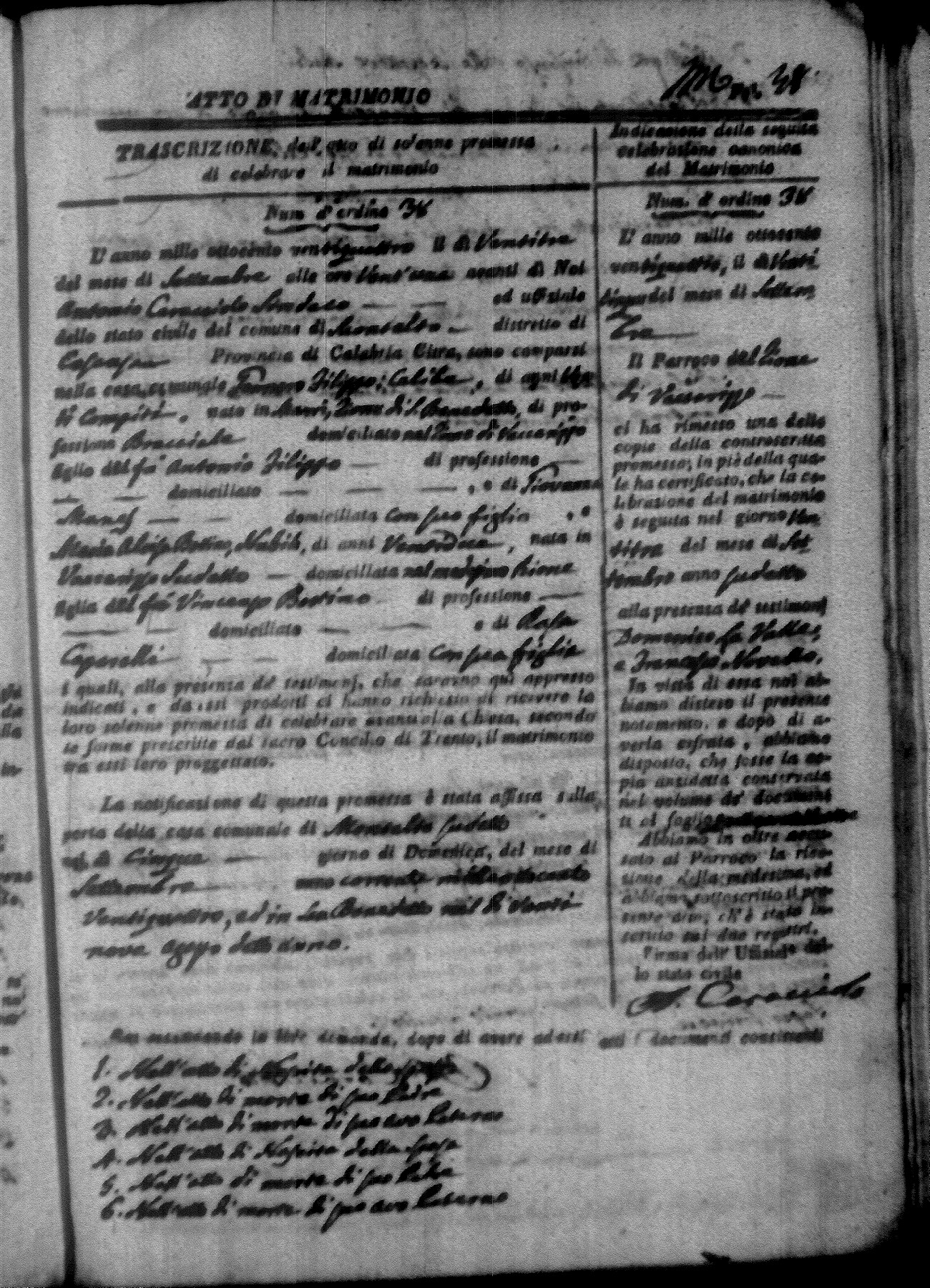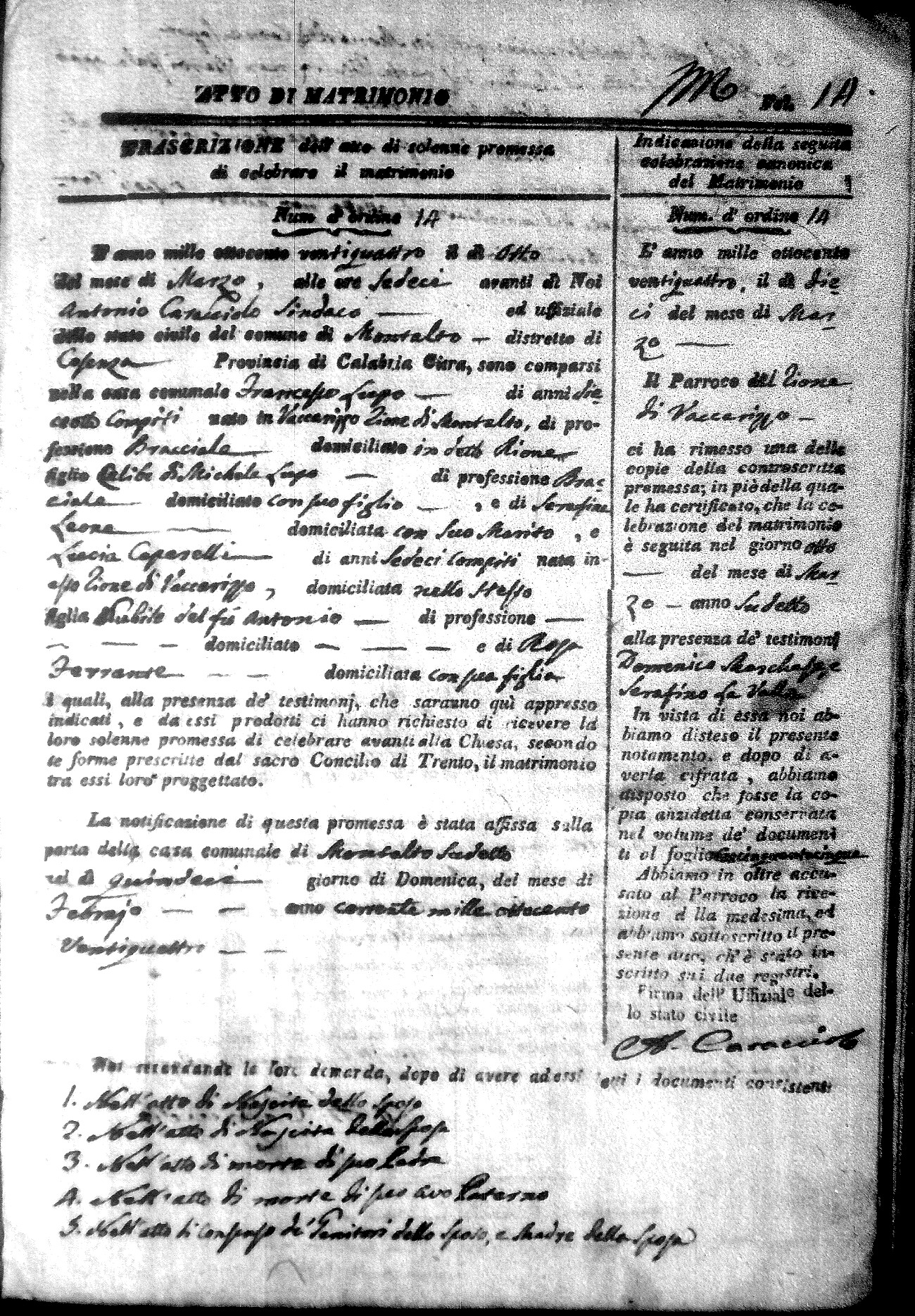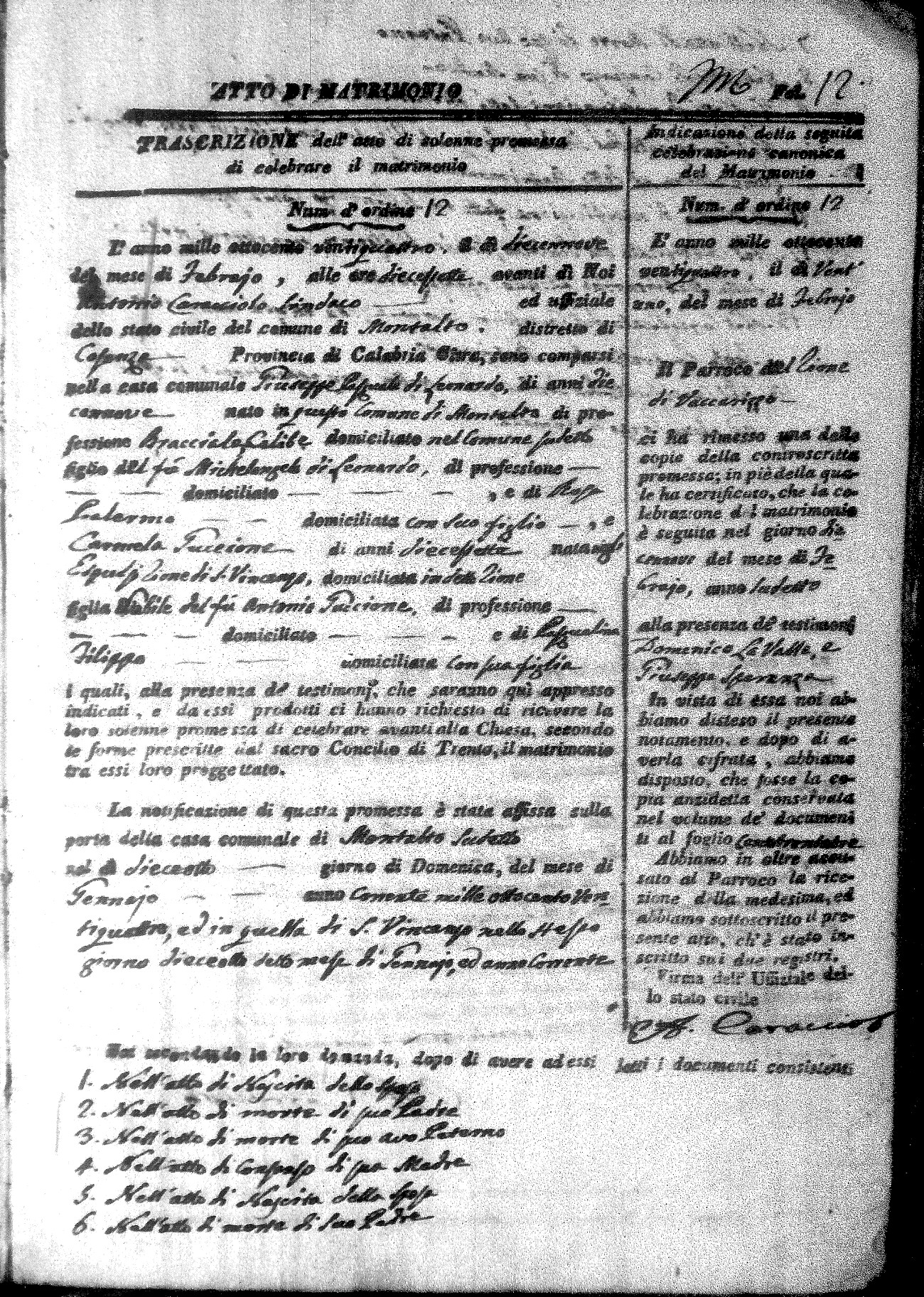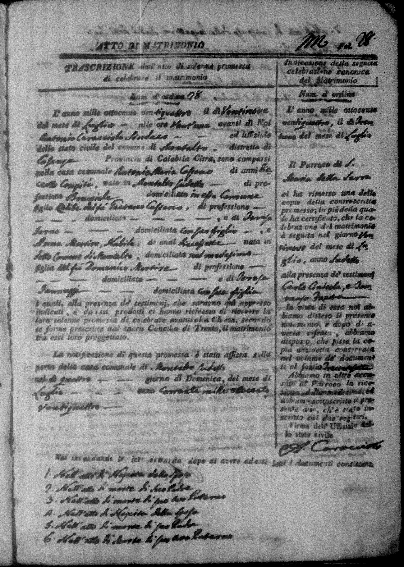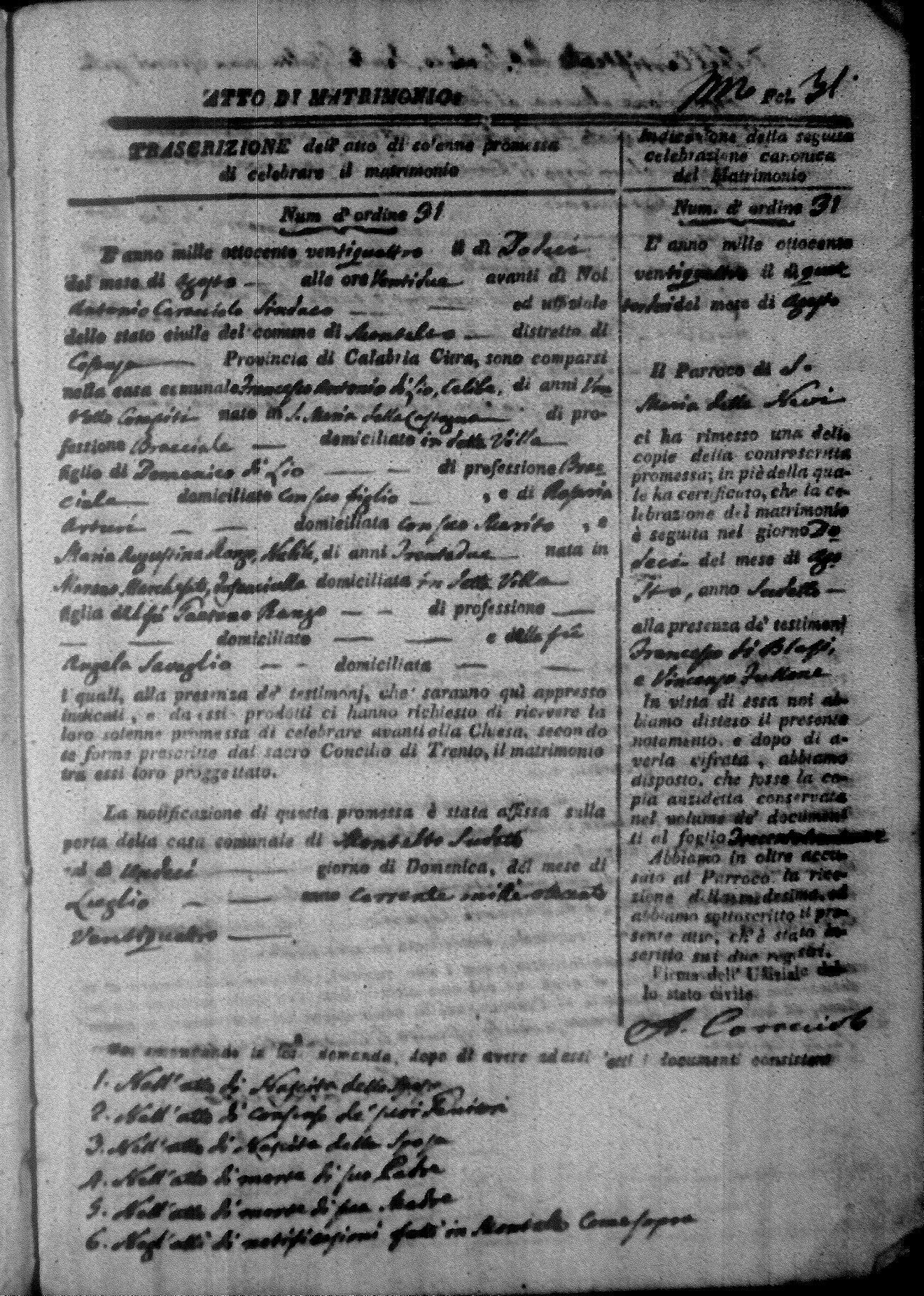 Here are the extractions for all the marriage acts in 1824 for Montalto Uffugo. This year is not complete yet, however it will be complete within a week. For more information, click on the groom's surname to view a copy of the original document.