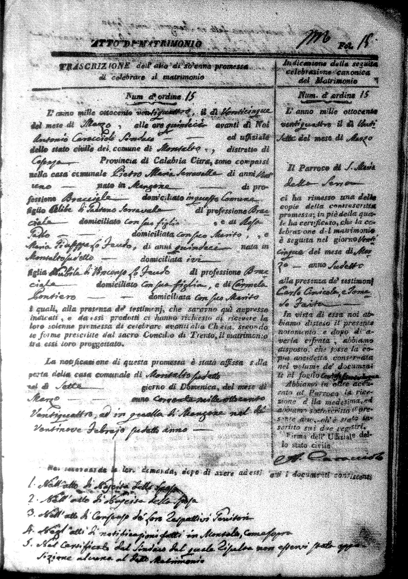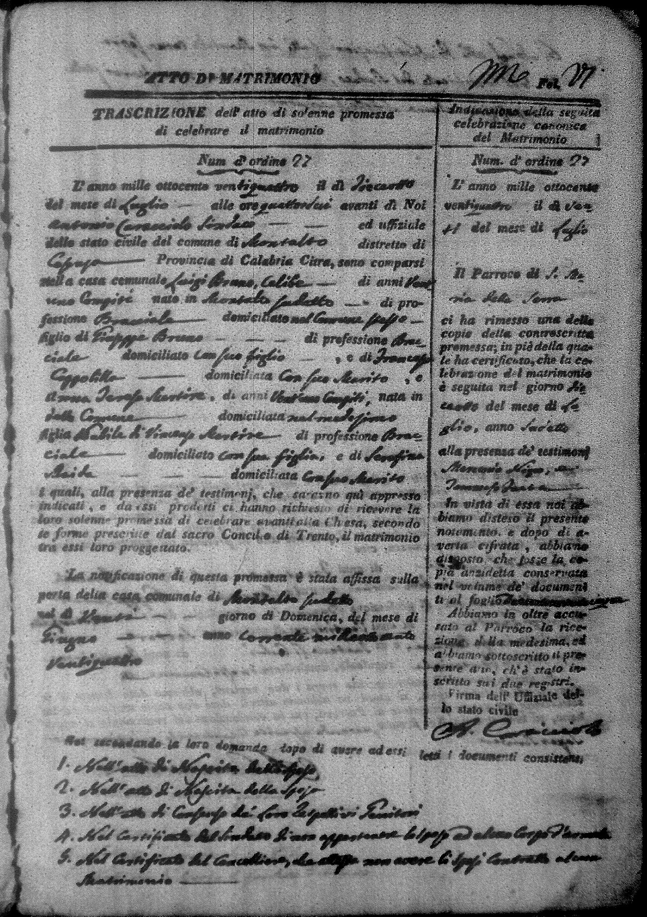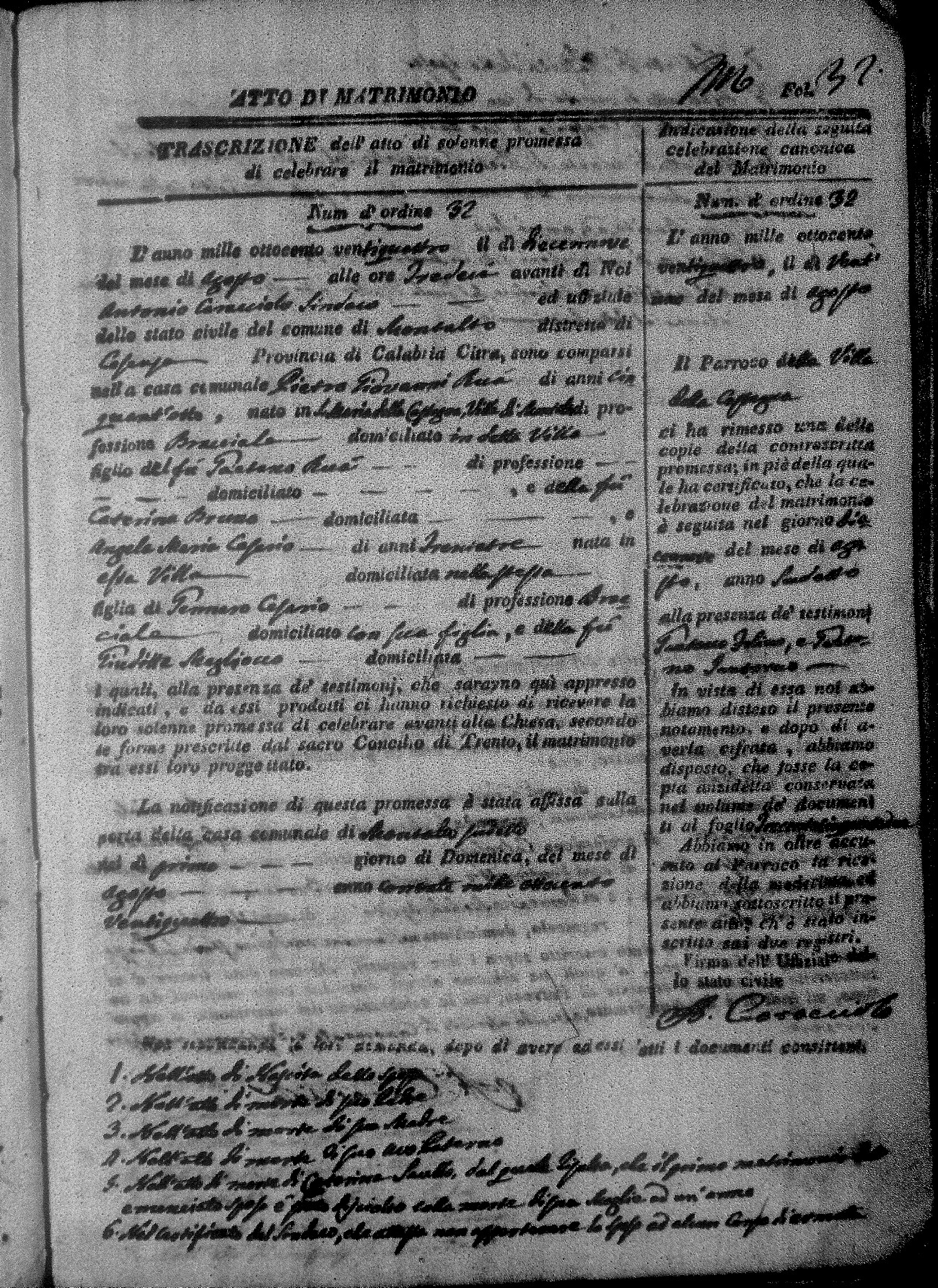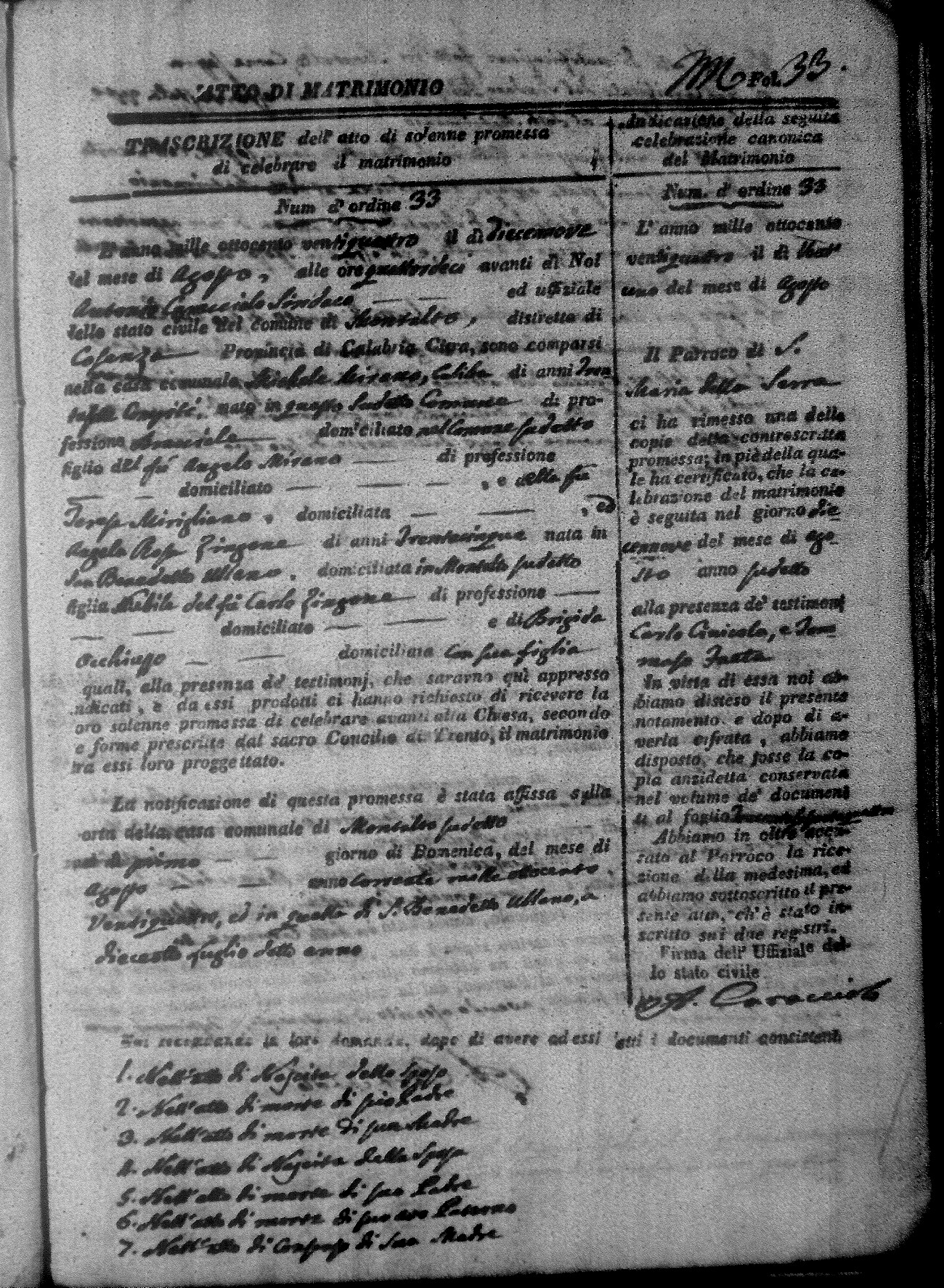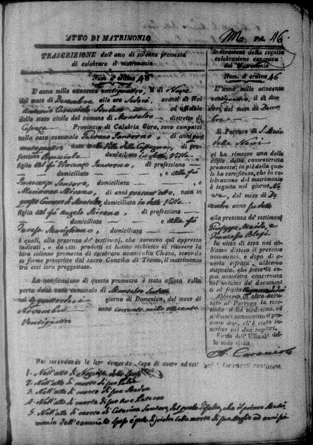Here are the extractions for all the marriage acts in 1824 for Montalto Uffugo. This year is not complete yet, however it will be complete within a week. For more information, click on the groom's surname to view a copy of the original document.