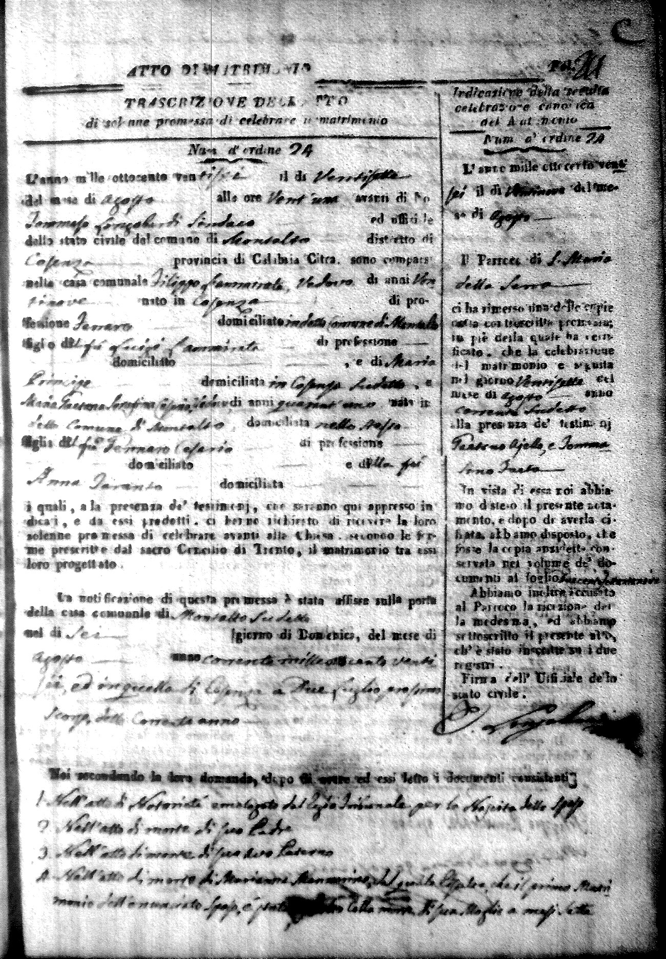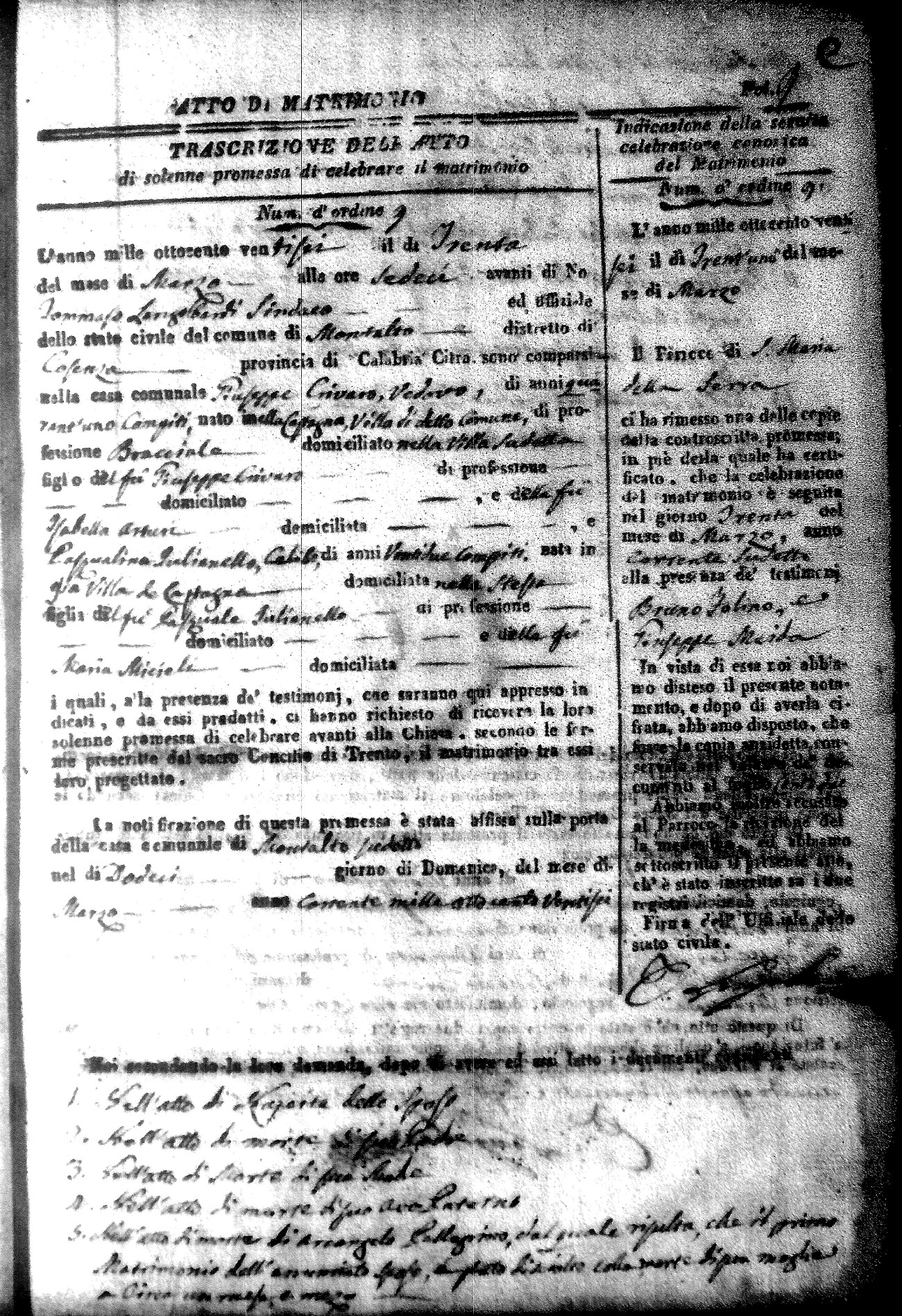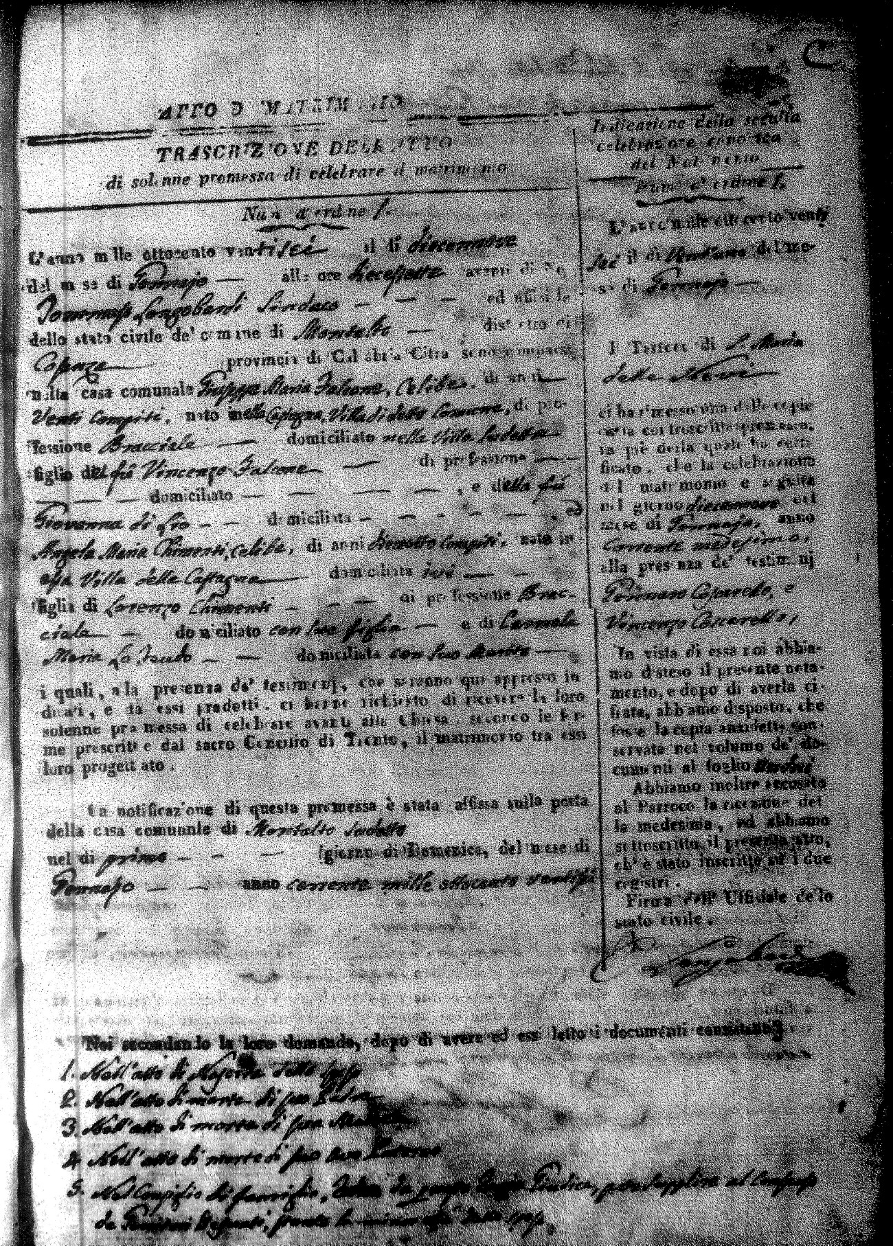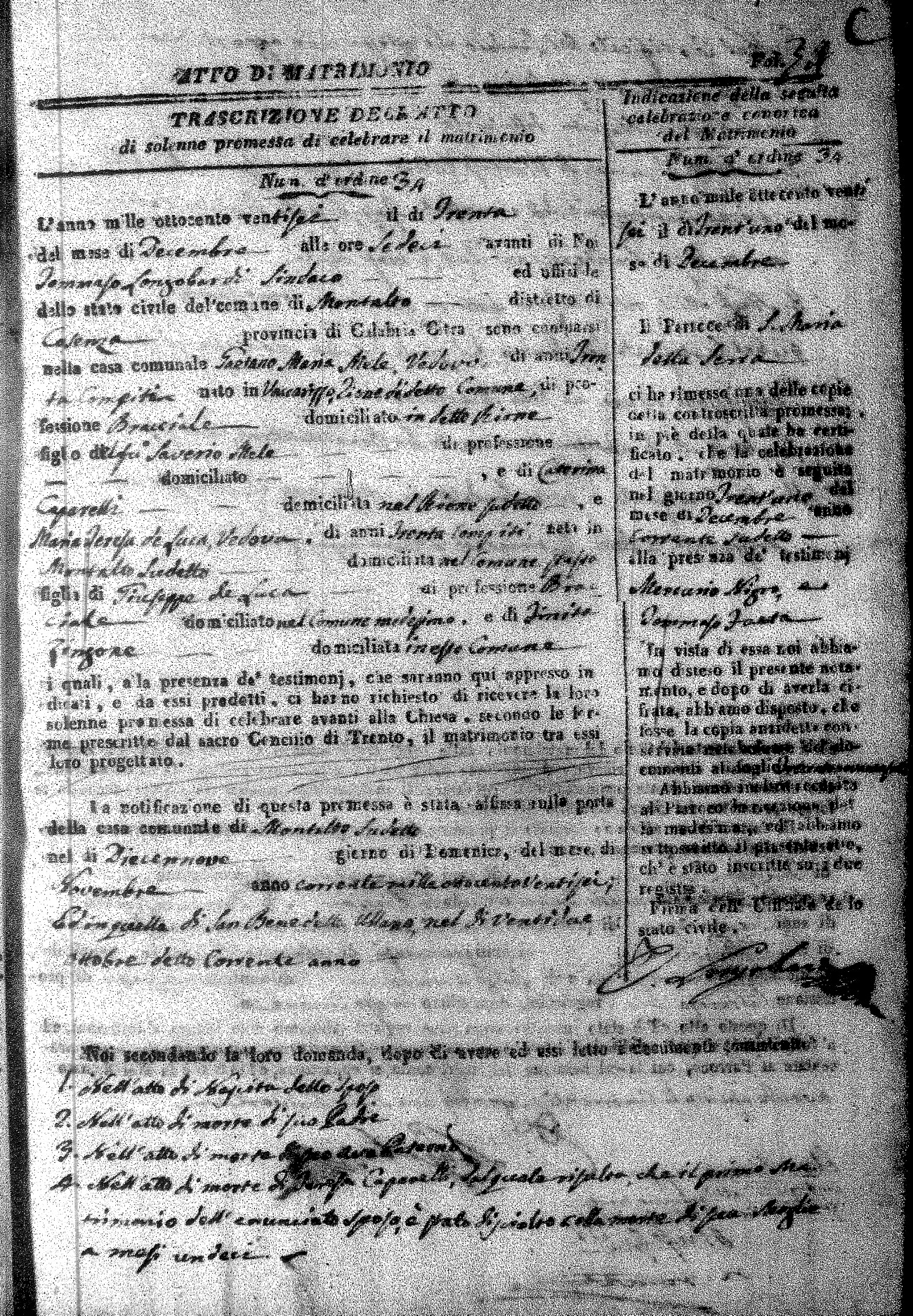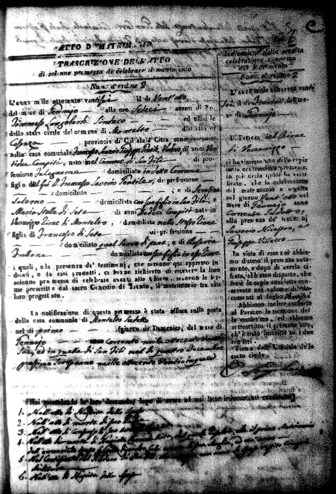 Here are the extractions for all the marriage acts in 1826 for Montalto Uffugo. This year is complete. For more information, click on the groom's surname to view a copy of page 1 of the original document and his first name to view page 2.