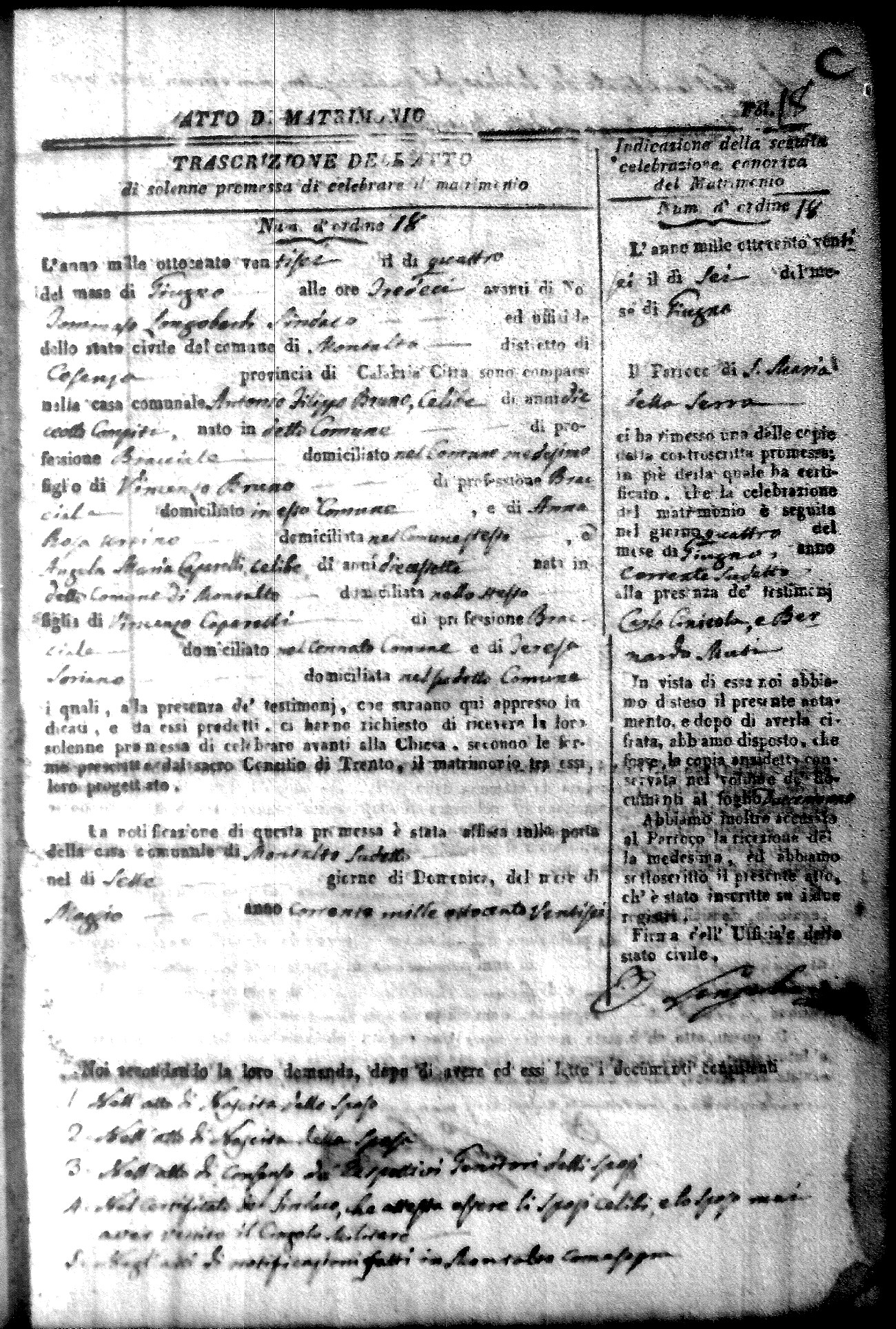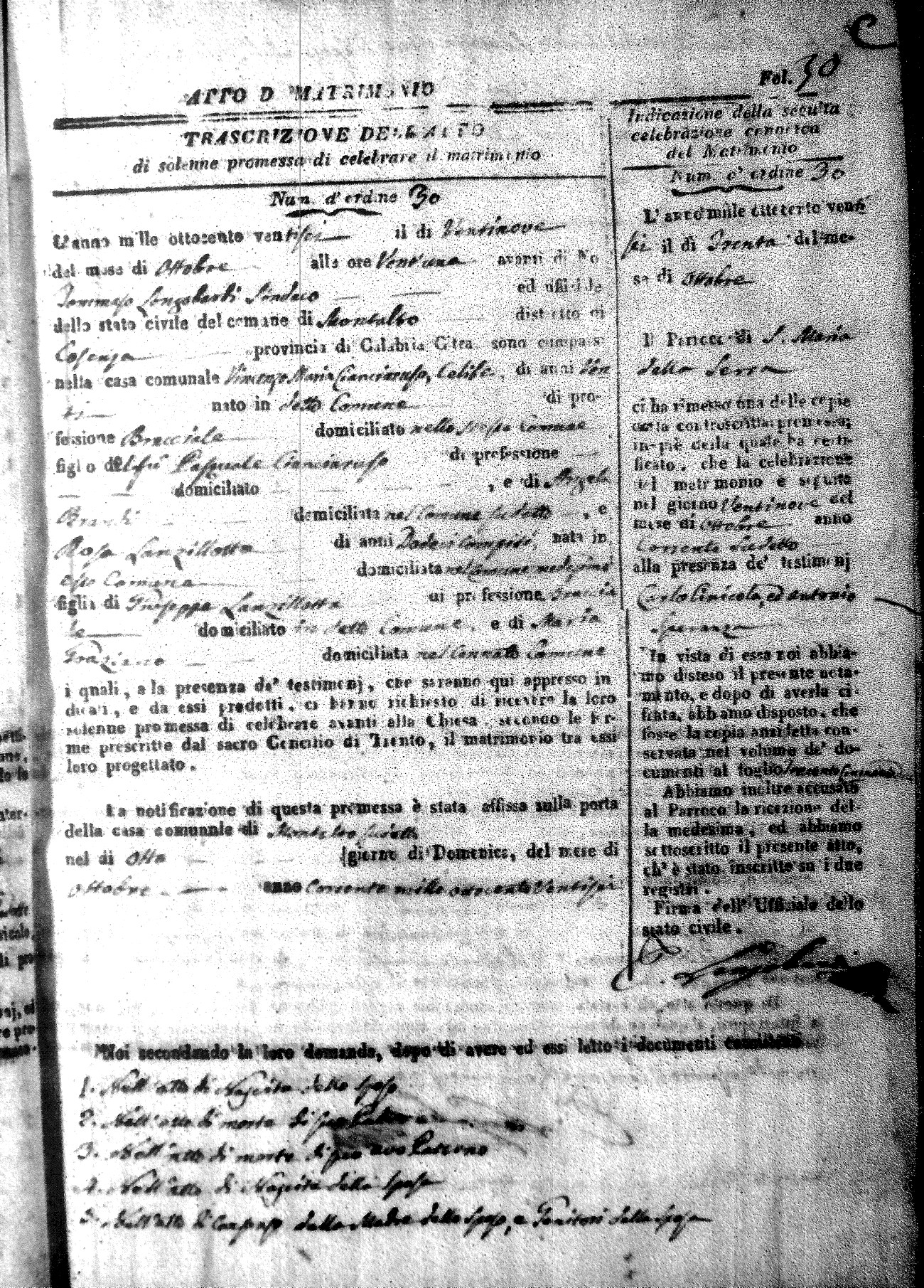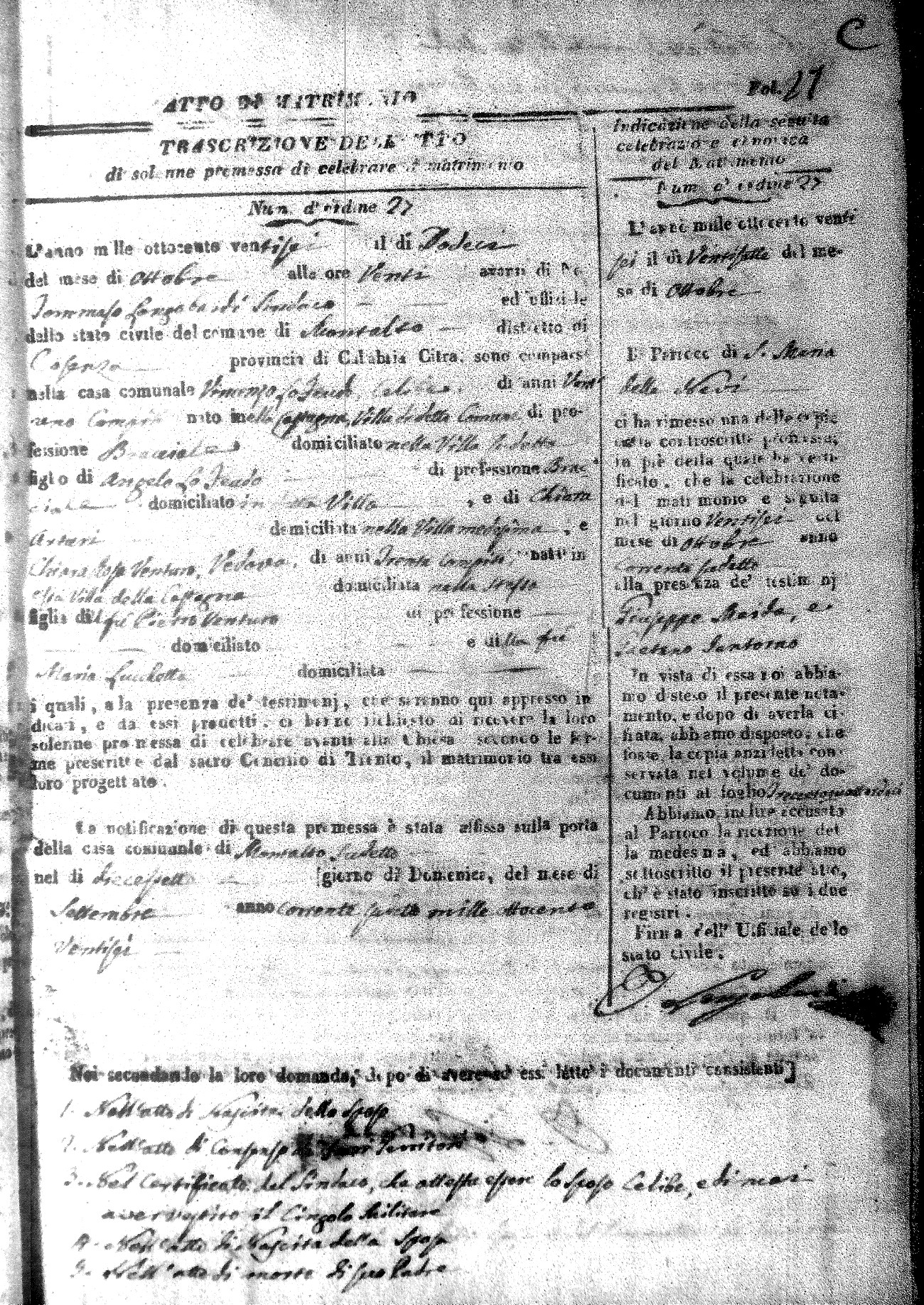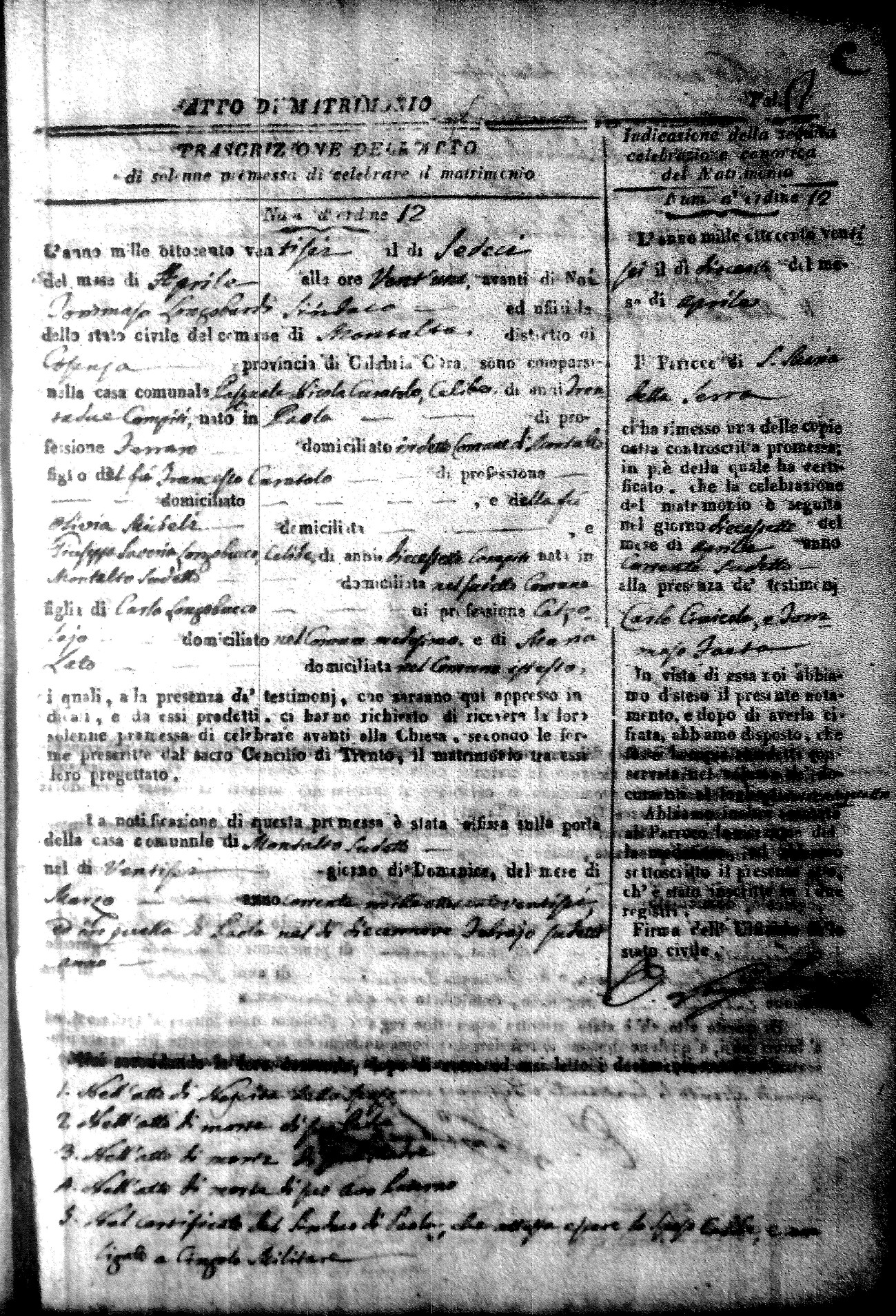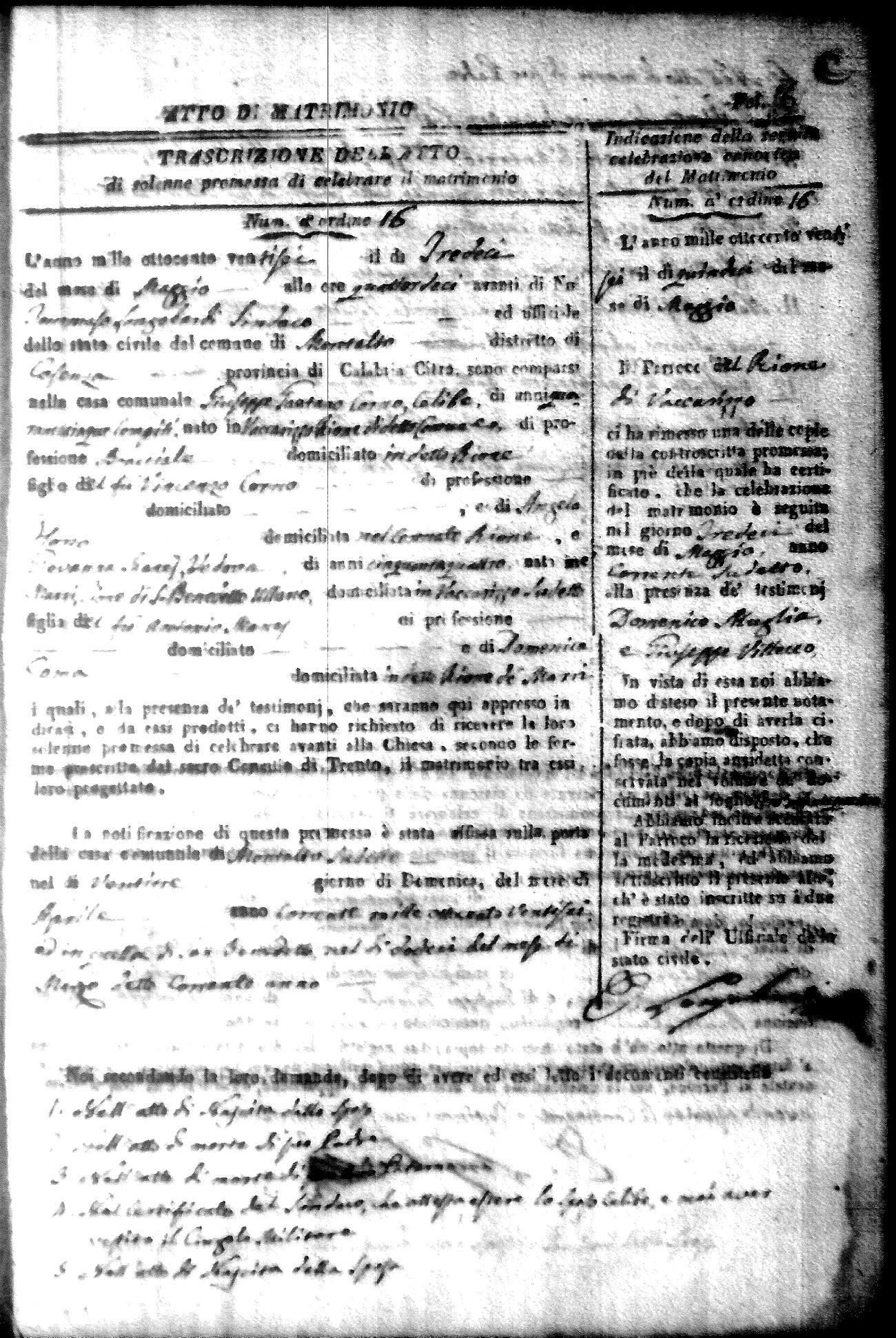 Here are the extractions for all the marriage acts in 1826 for Montalto Uffugo. This year is complete. For more information, click on the groom's surname to view a copy of page 1 of the original document and his first name to view page 2.