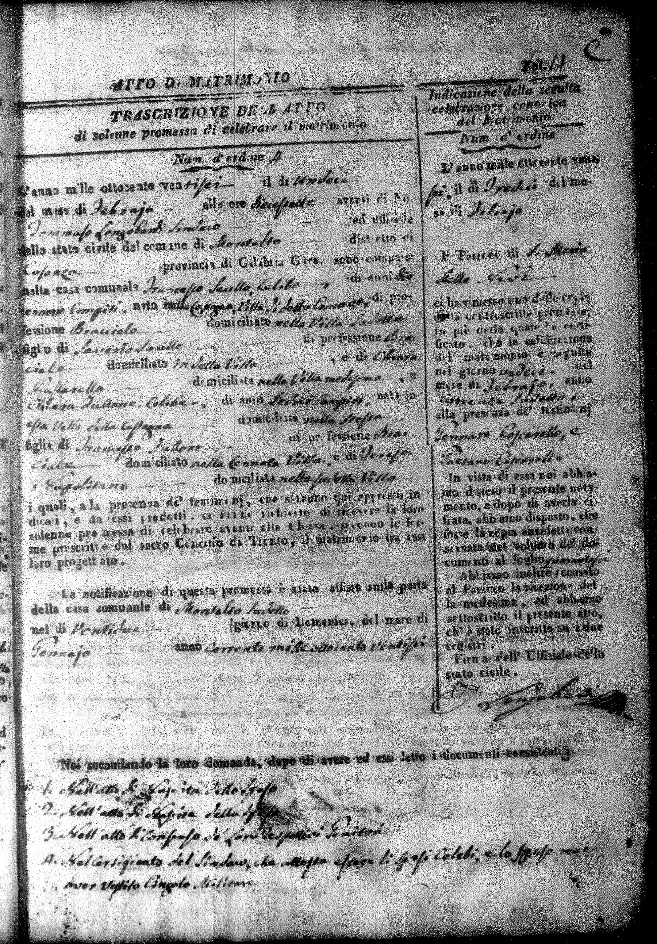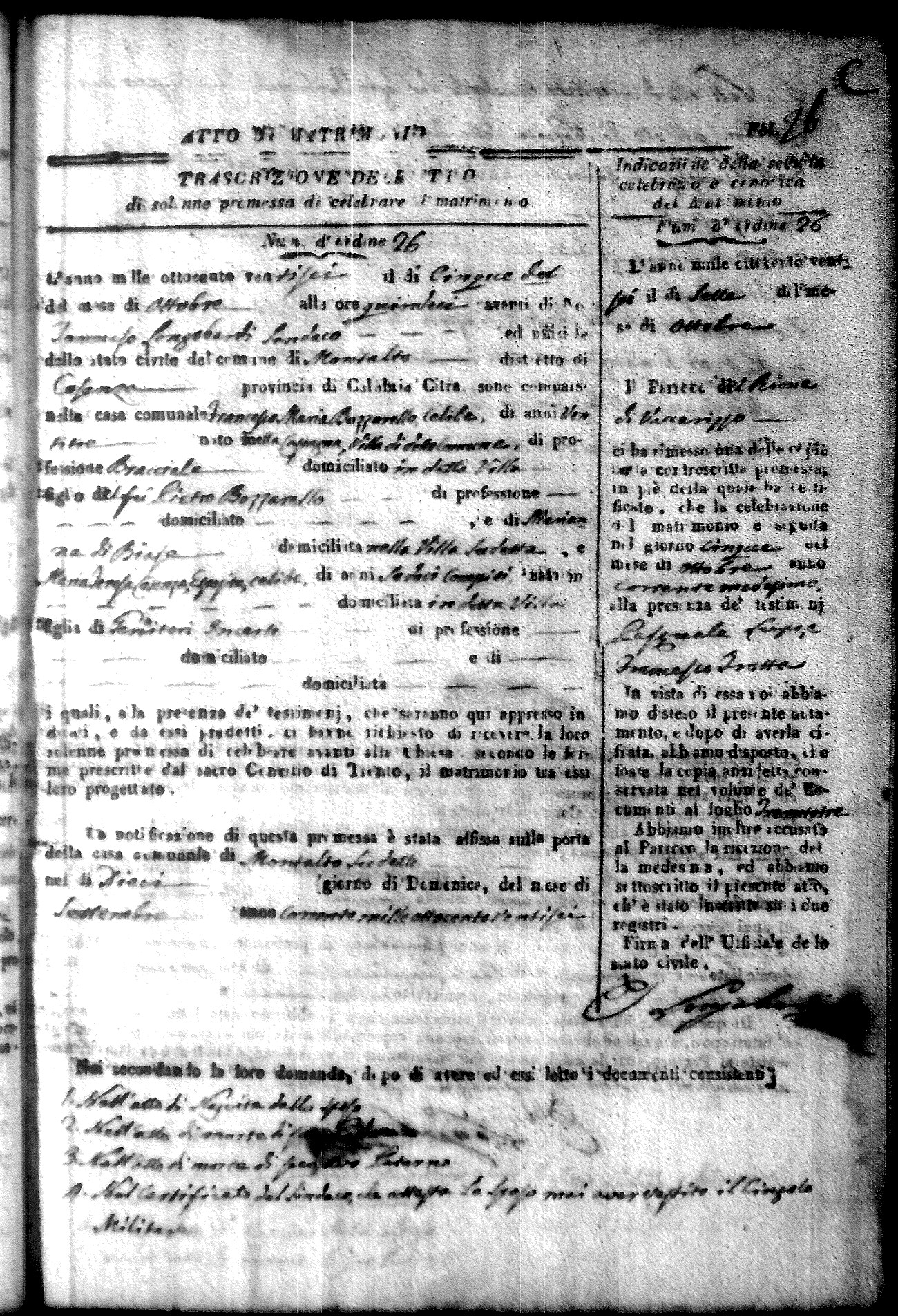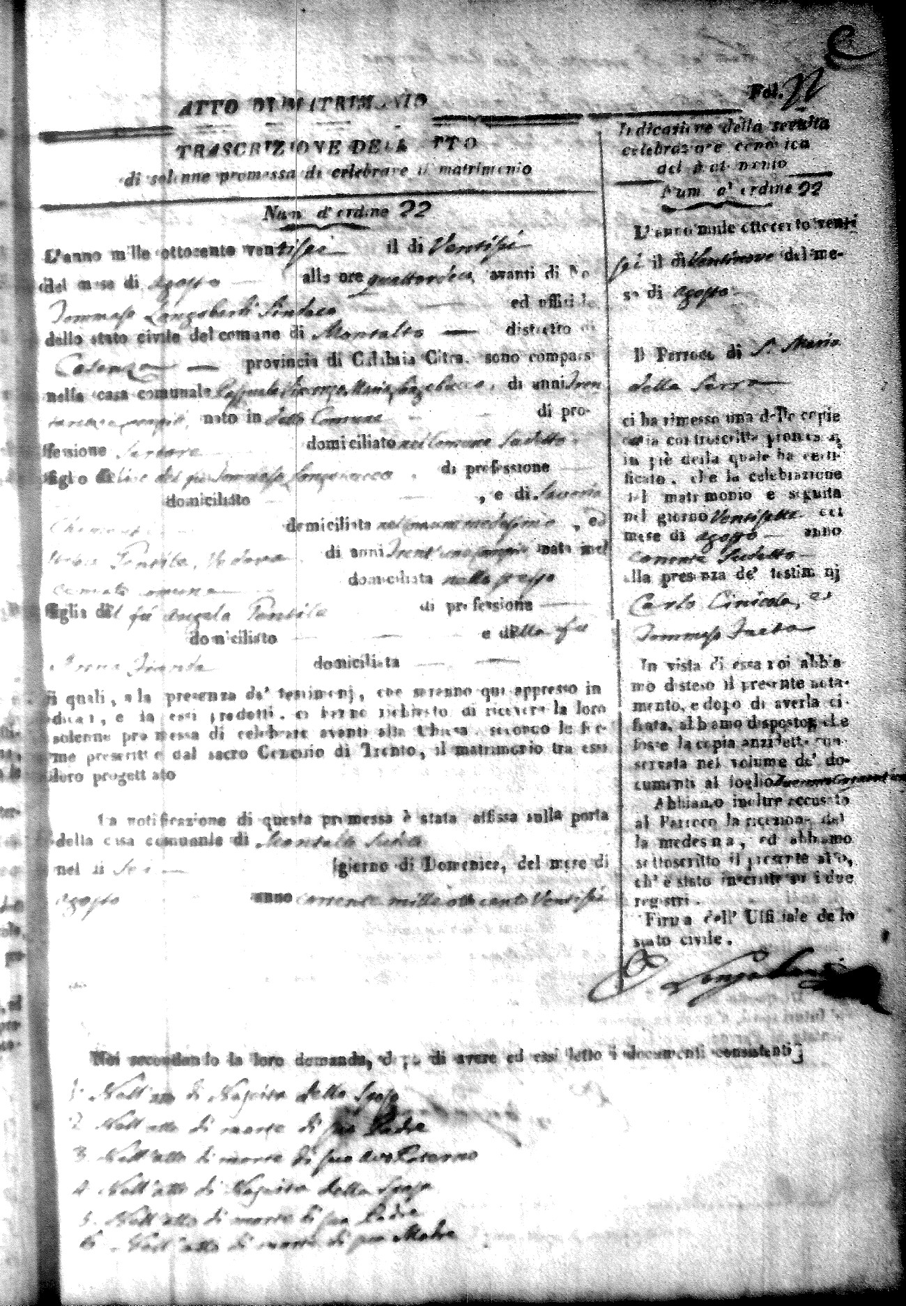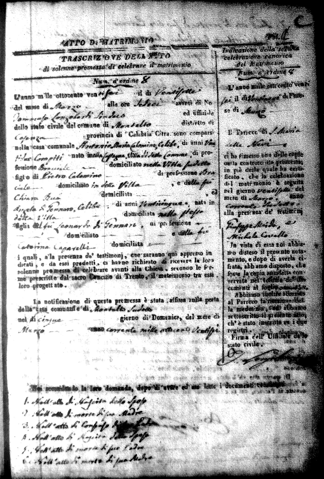 Here are the extractions for all the marriage acts in 1826 for Montalto Uffugo. This year is complete. For more information, click on the groom's surname to view a copy of page 1 of the original document and his first name to view page 2.