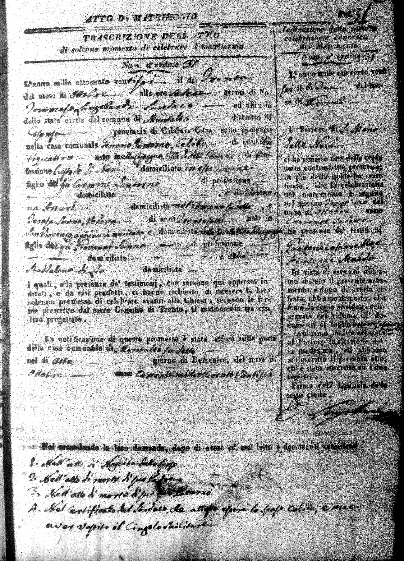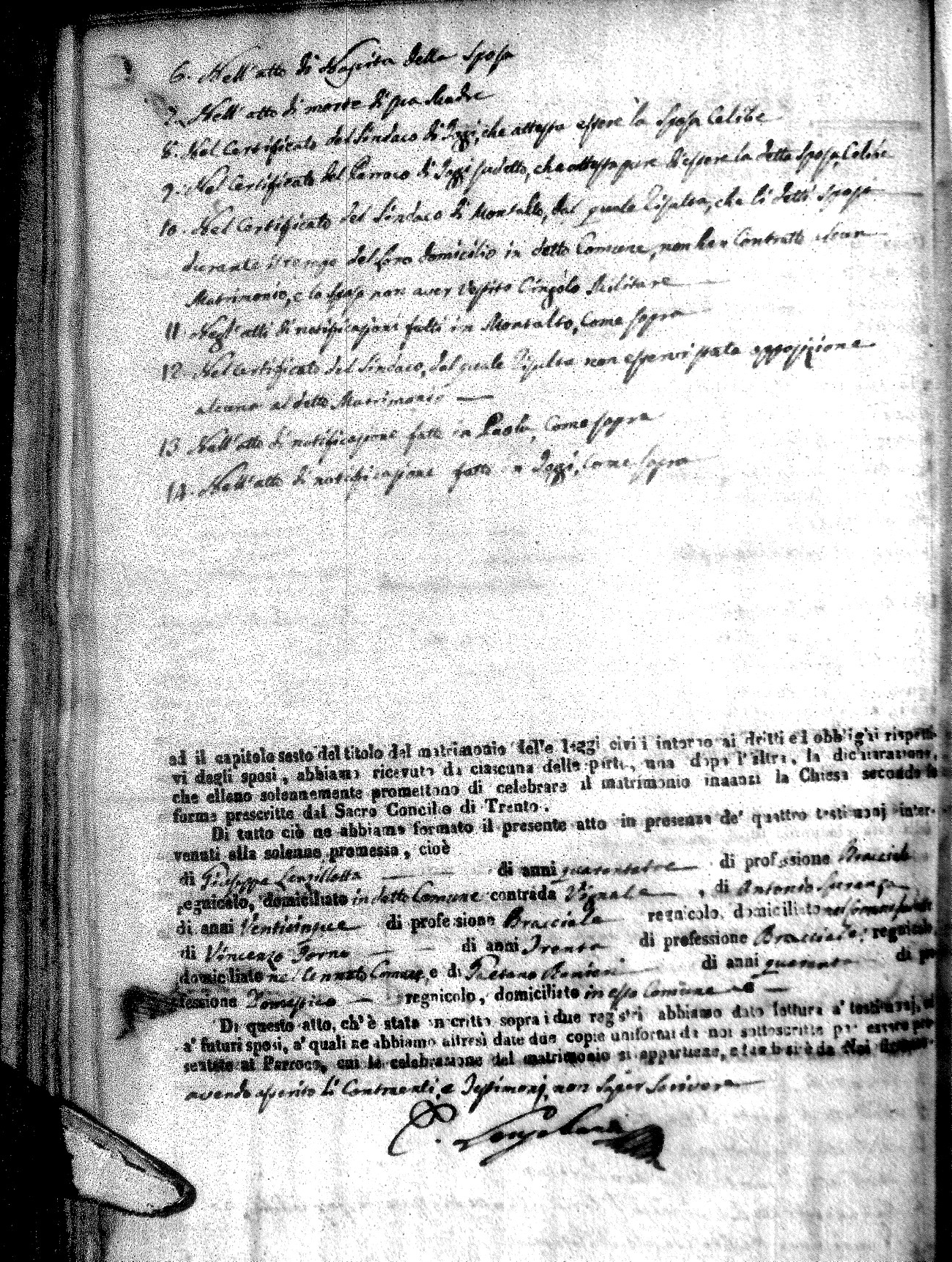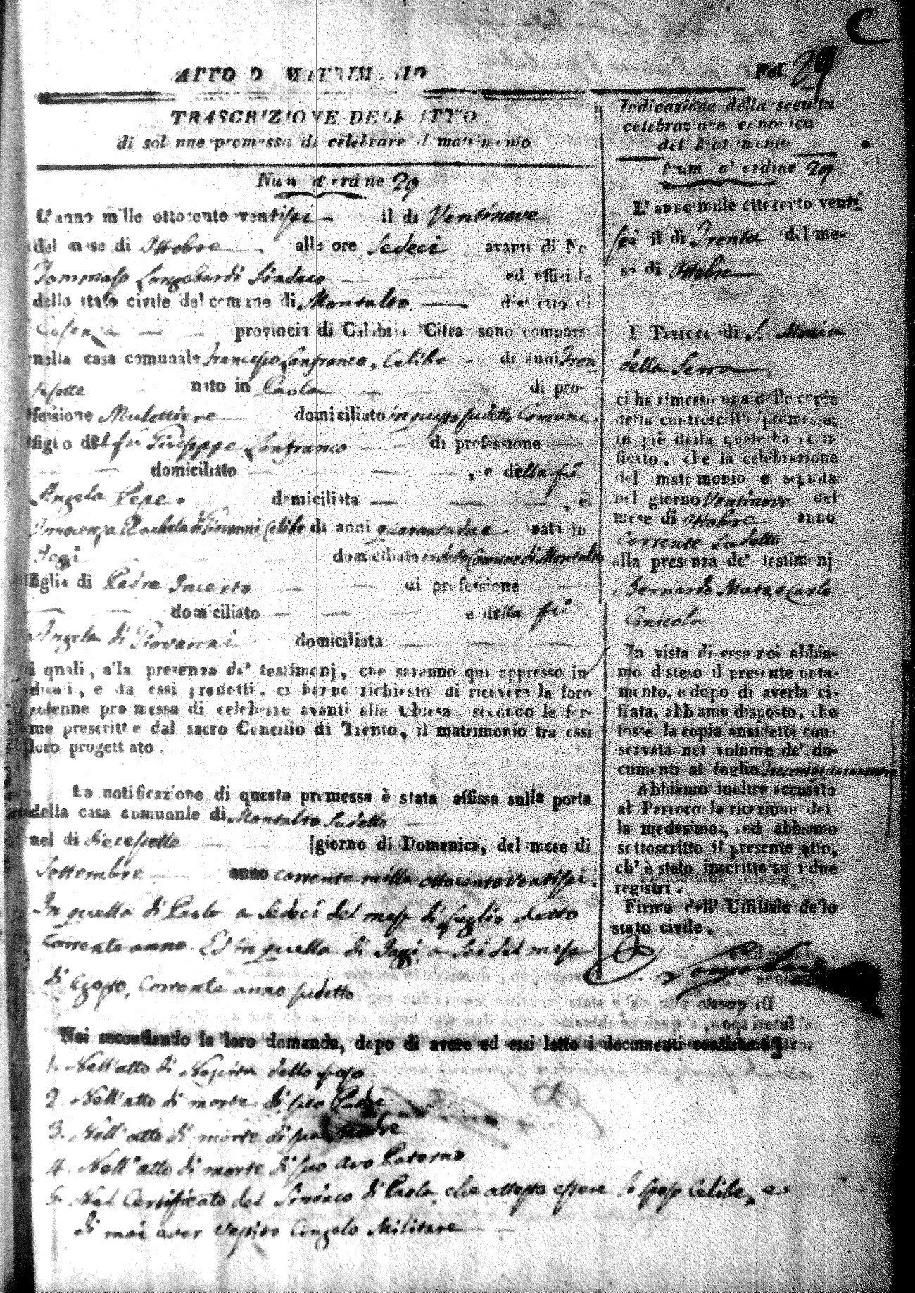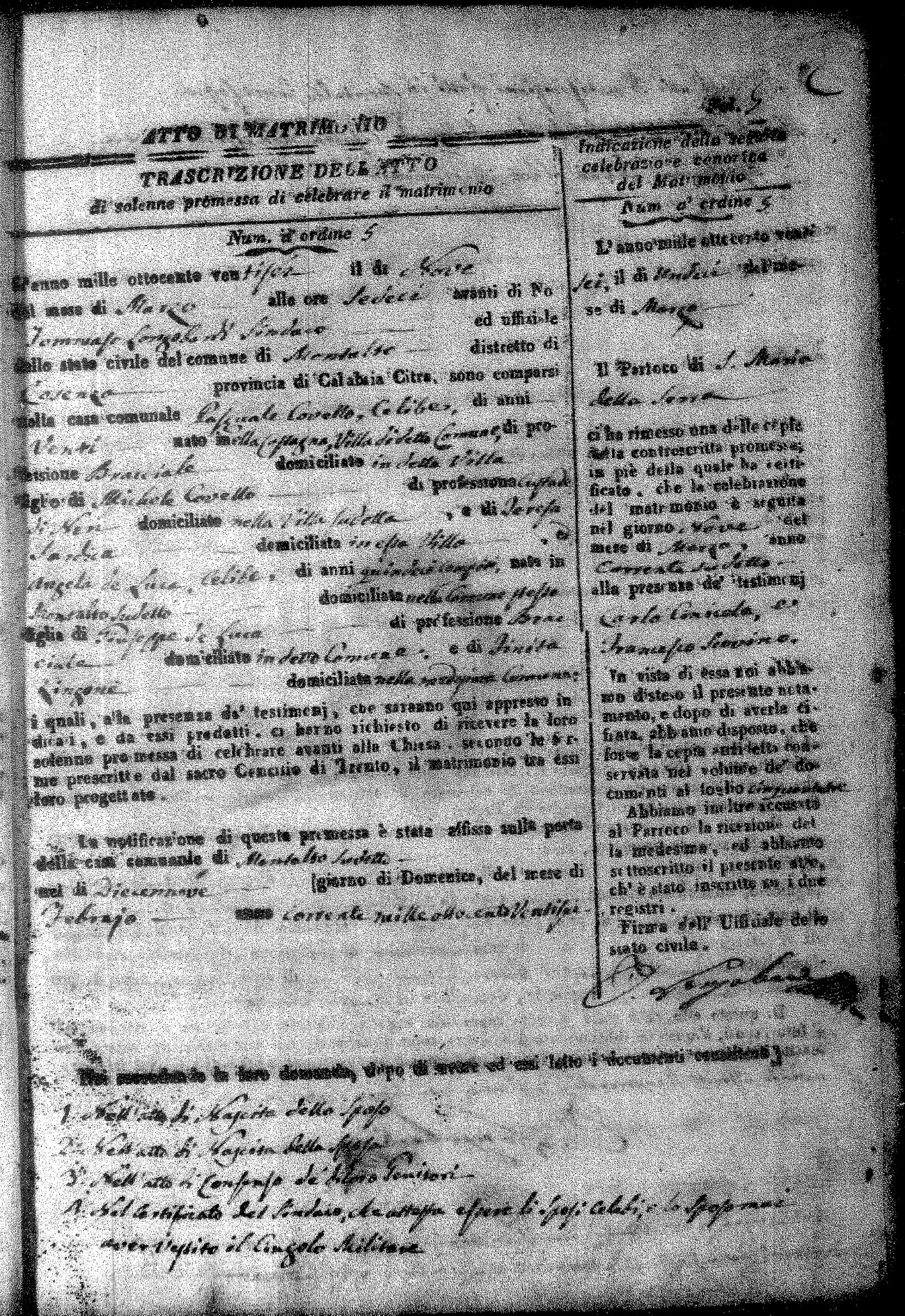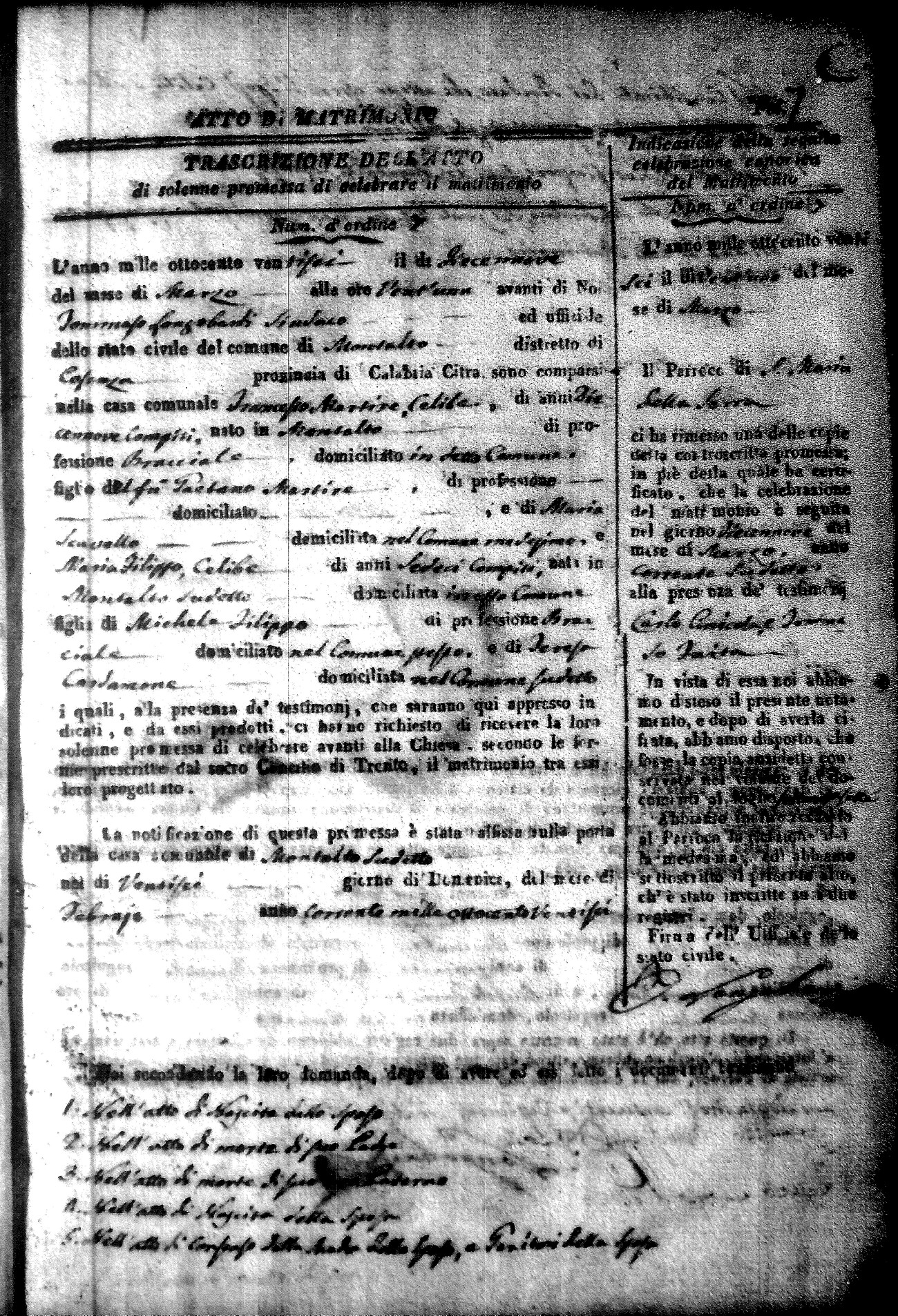 Here are the extractions for all the marriage acts in 1826 for Montalto Uffugo. This year is complete. For more information, click on the groom's surname to view a copy of page 1 of the original document and his first name to view page 2.