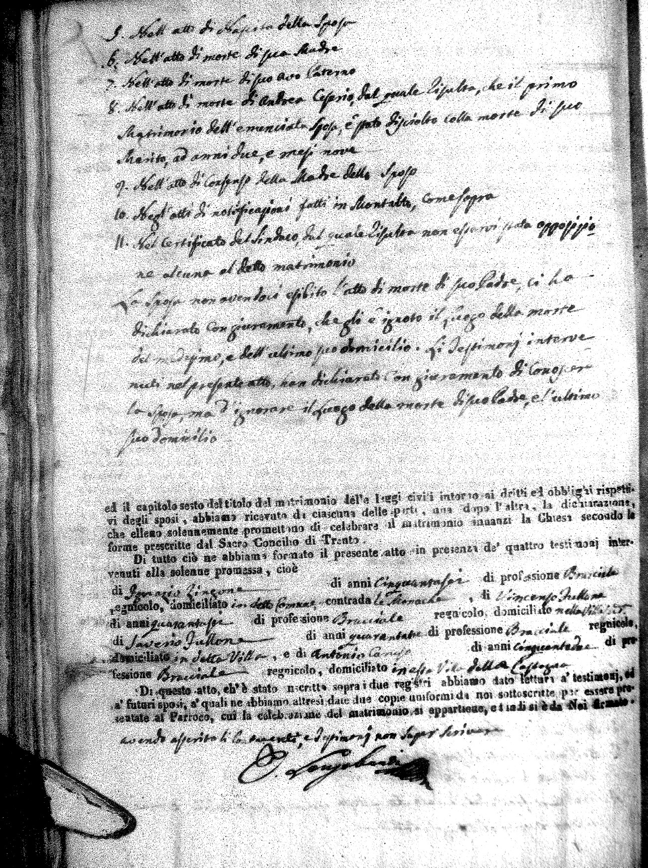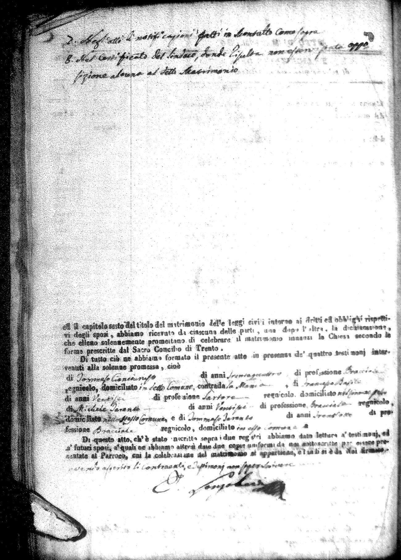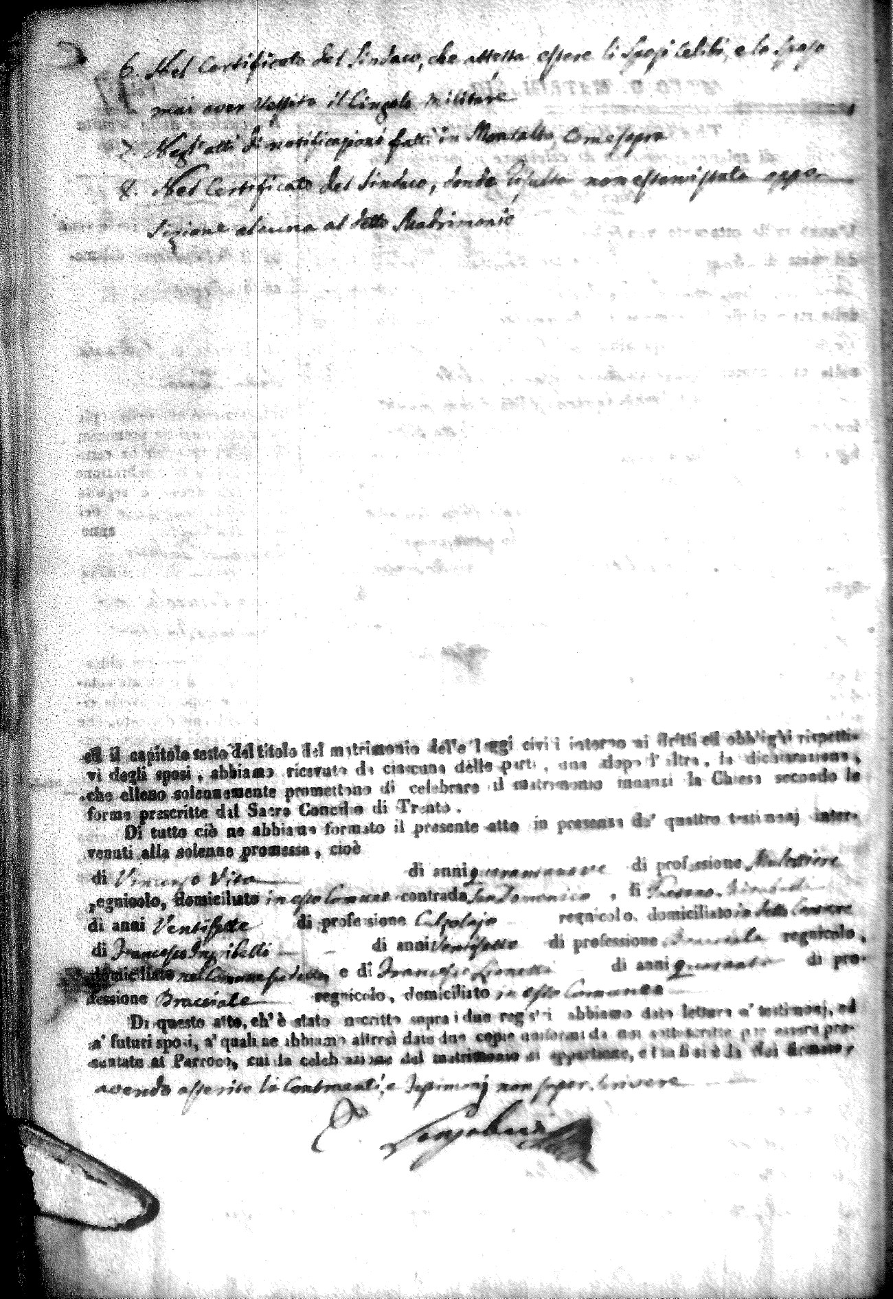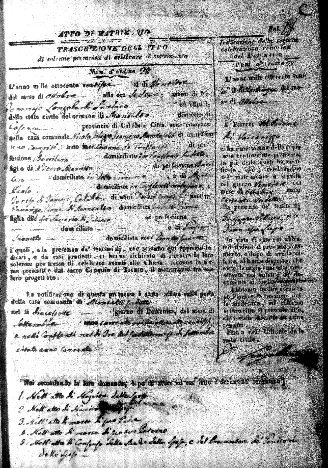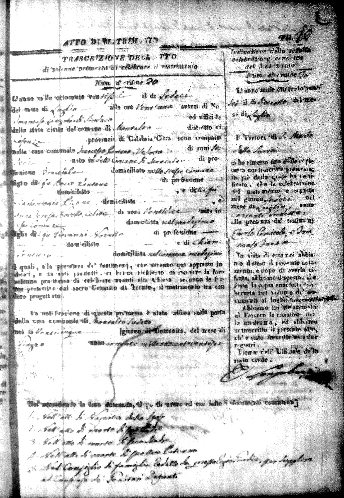 Here are the extractions for all the marriage acts in 1826 for Montalto Uffugo. This year is complete. For more information, click on the groom's surname to view a copy of page 1 of the original document and his first name to view page 2.