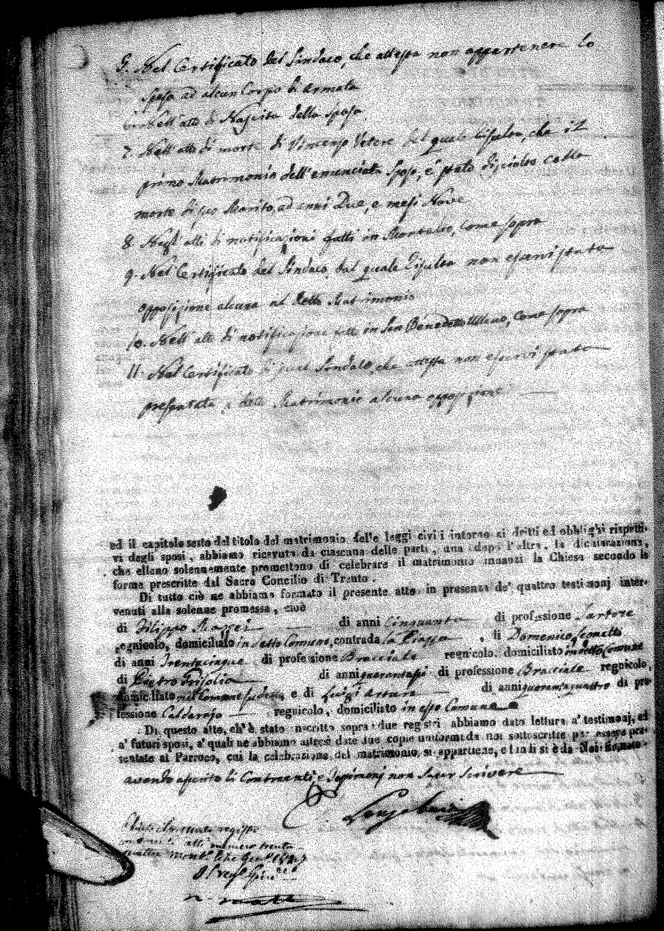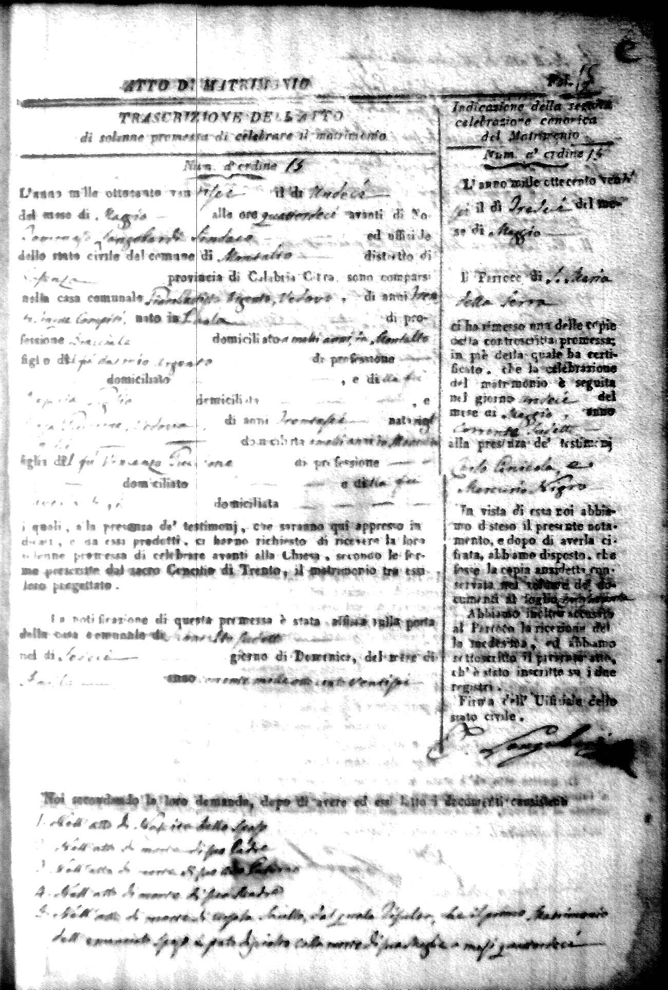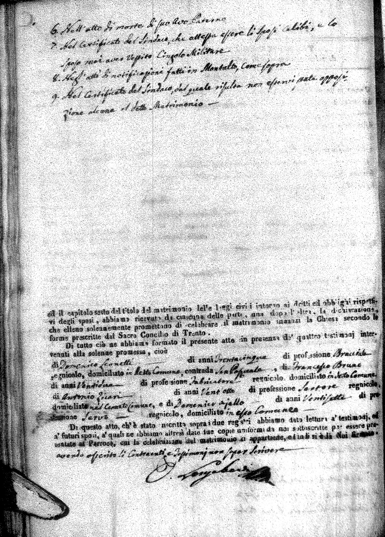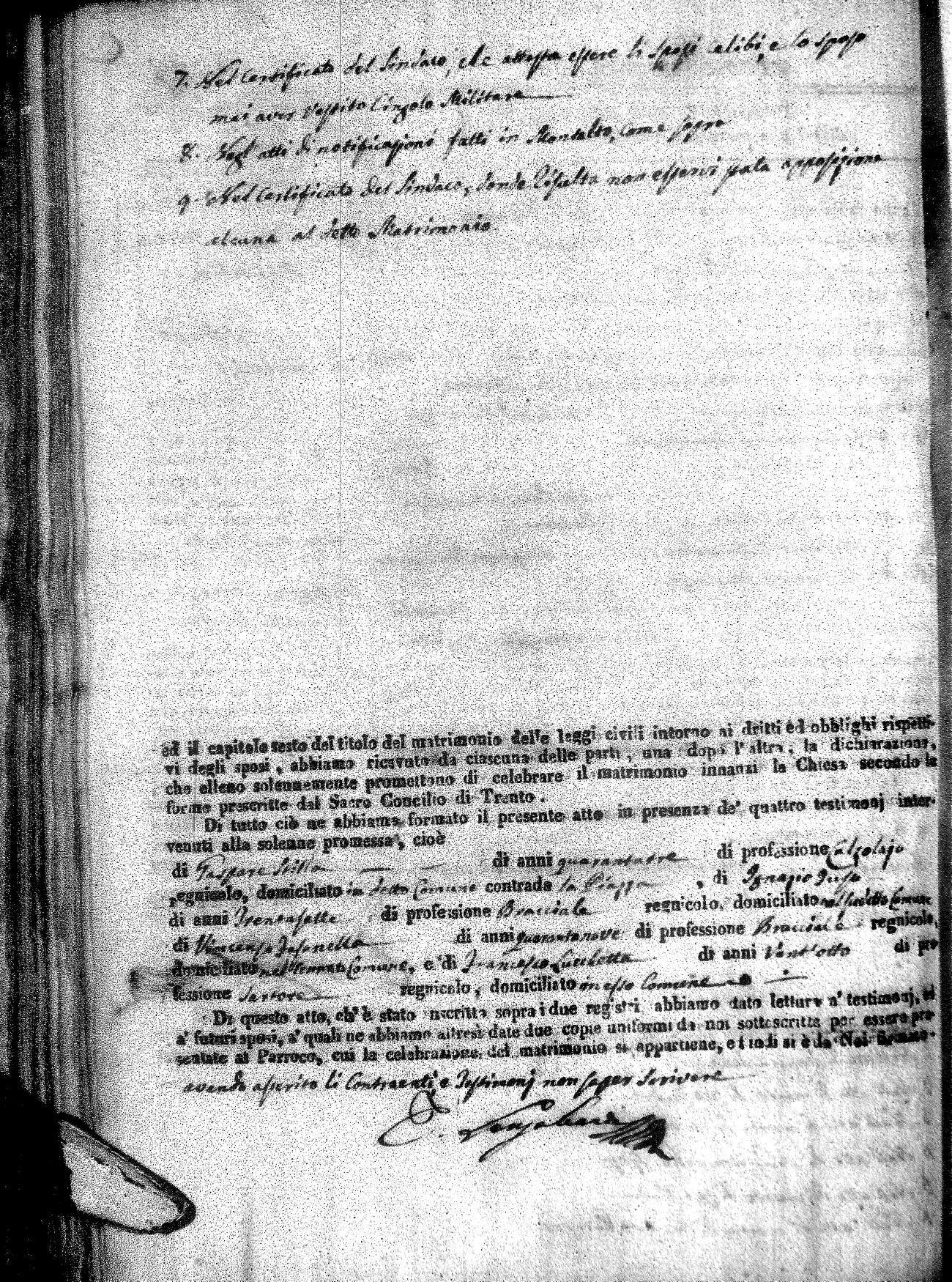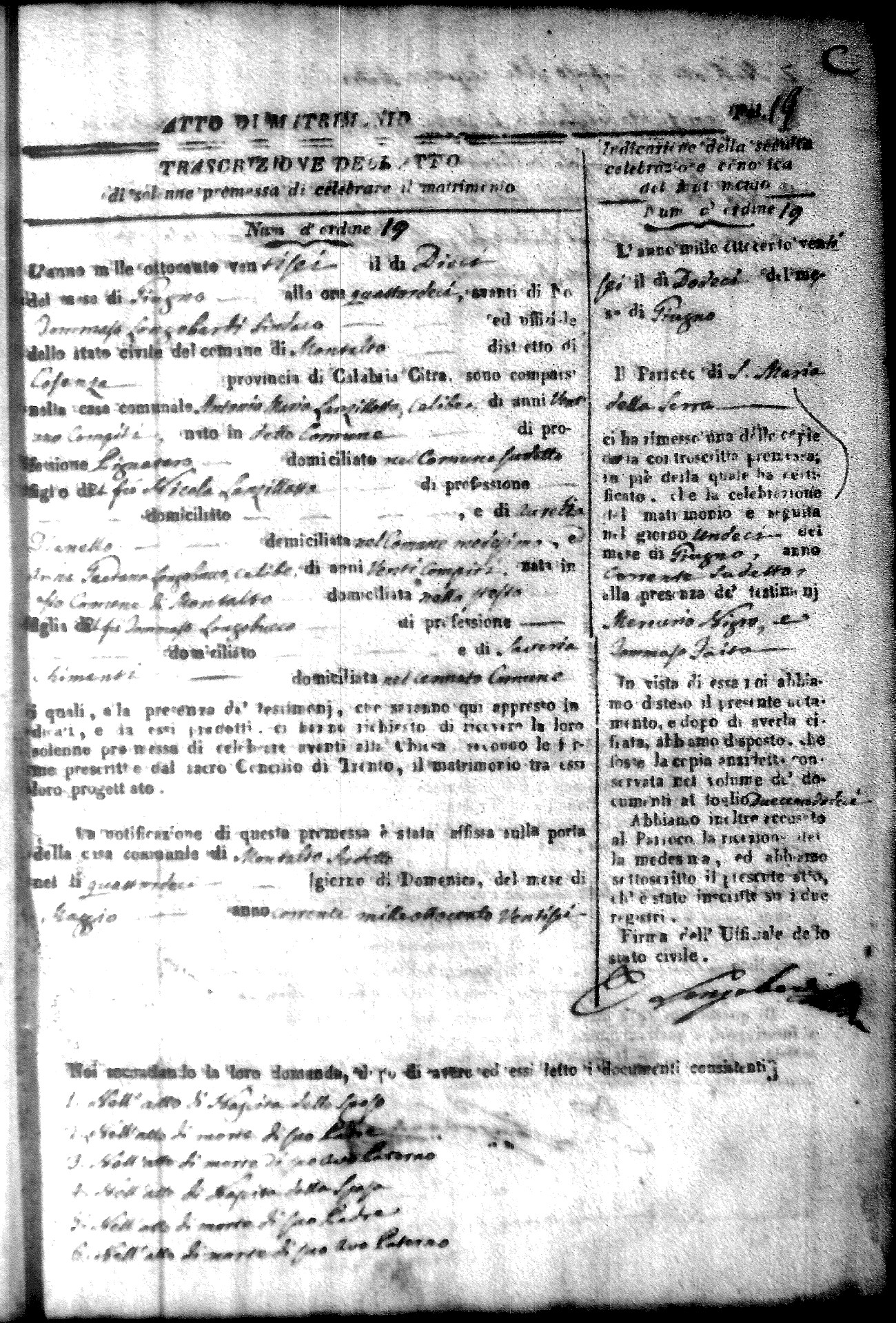 Here are the extractions for all the marriage acts in 1826 for Montalto Uffugo. This year is complete. For more information, click on the groom's surname to view a copy of page 1 of the original document and his first name to view page 2.