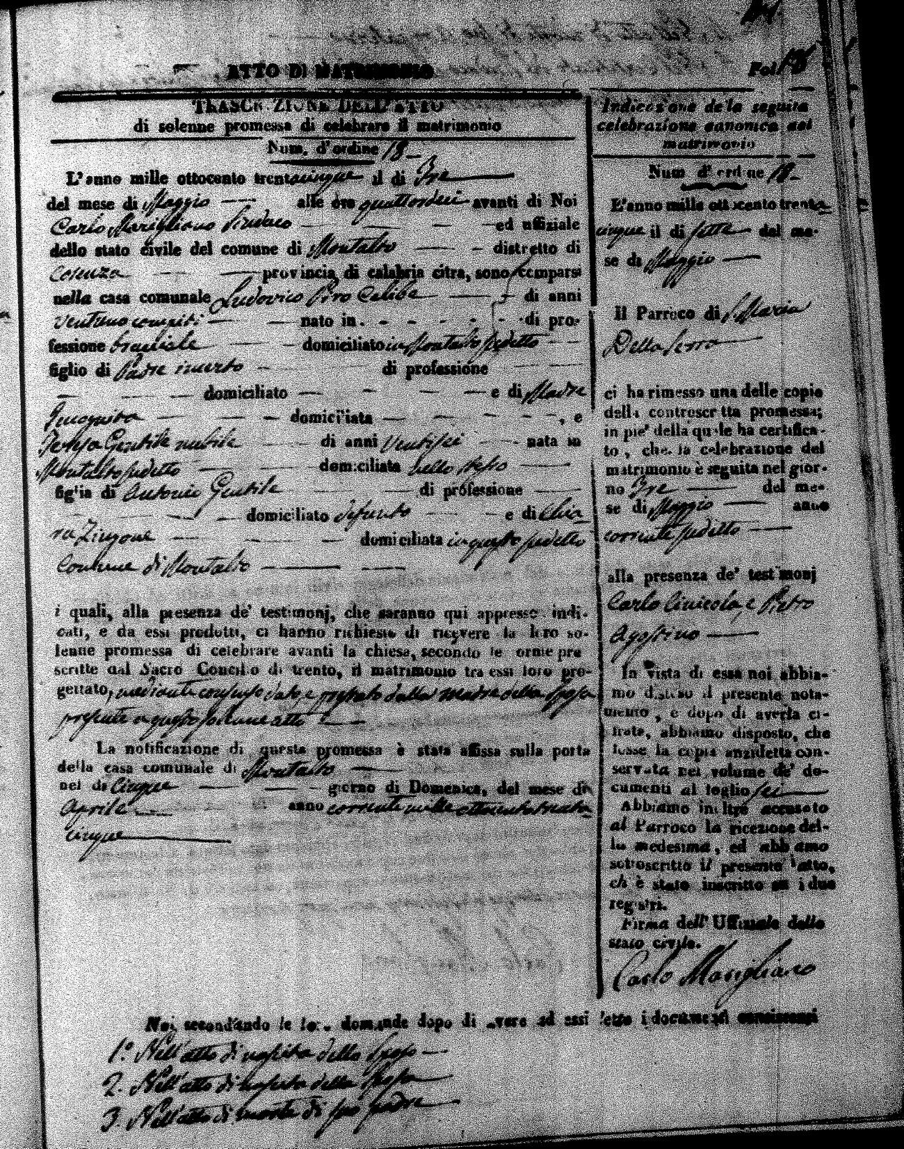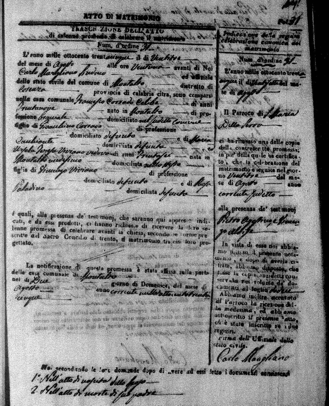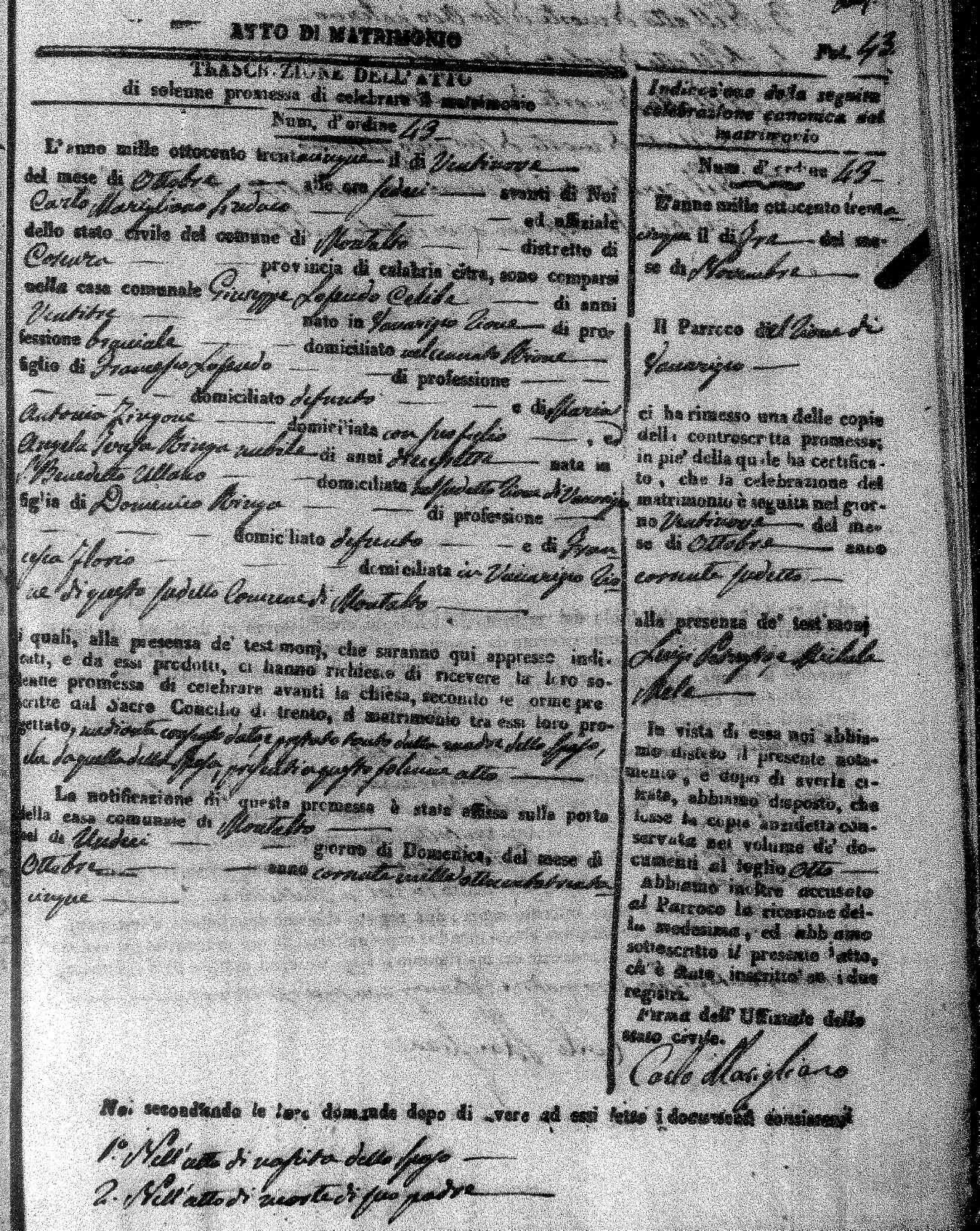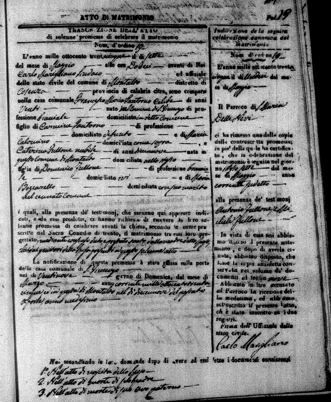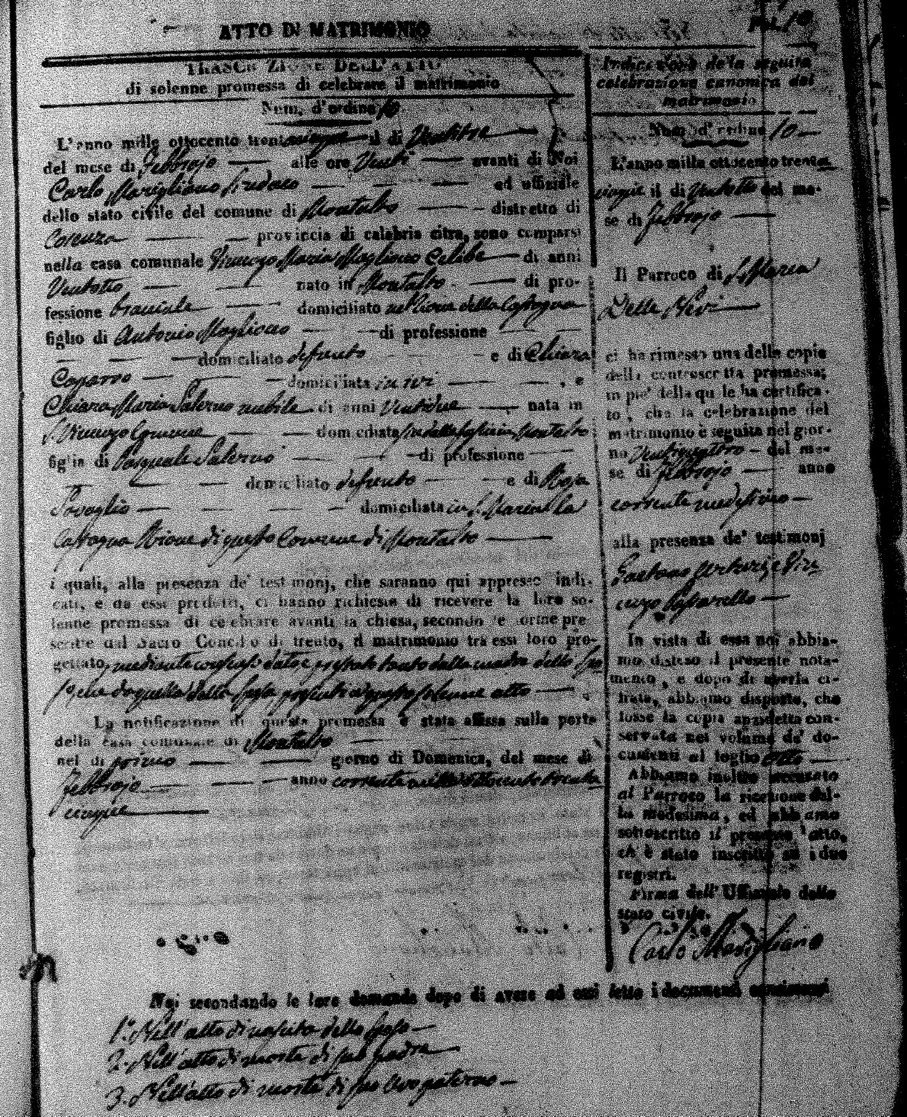 Here are the extractions for the marriage acts in 1835 for Montalto Uffugo. To save time we have only transcribed the names of the groom and bride. For more information, click on the groom's surname to view page 1 of the copy of the original document and his first name to view page 2.