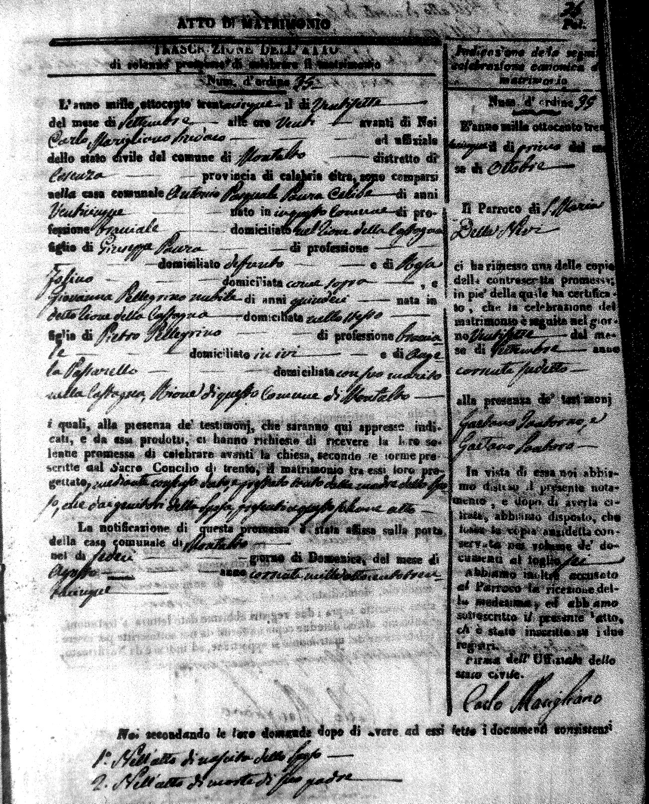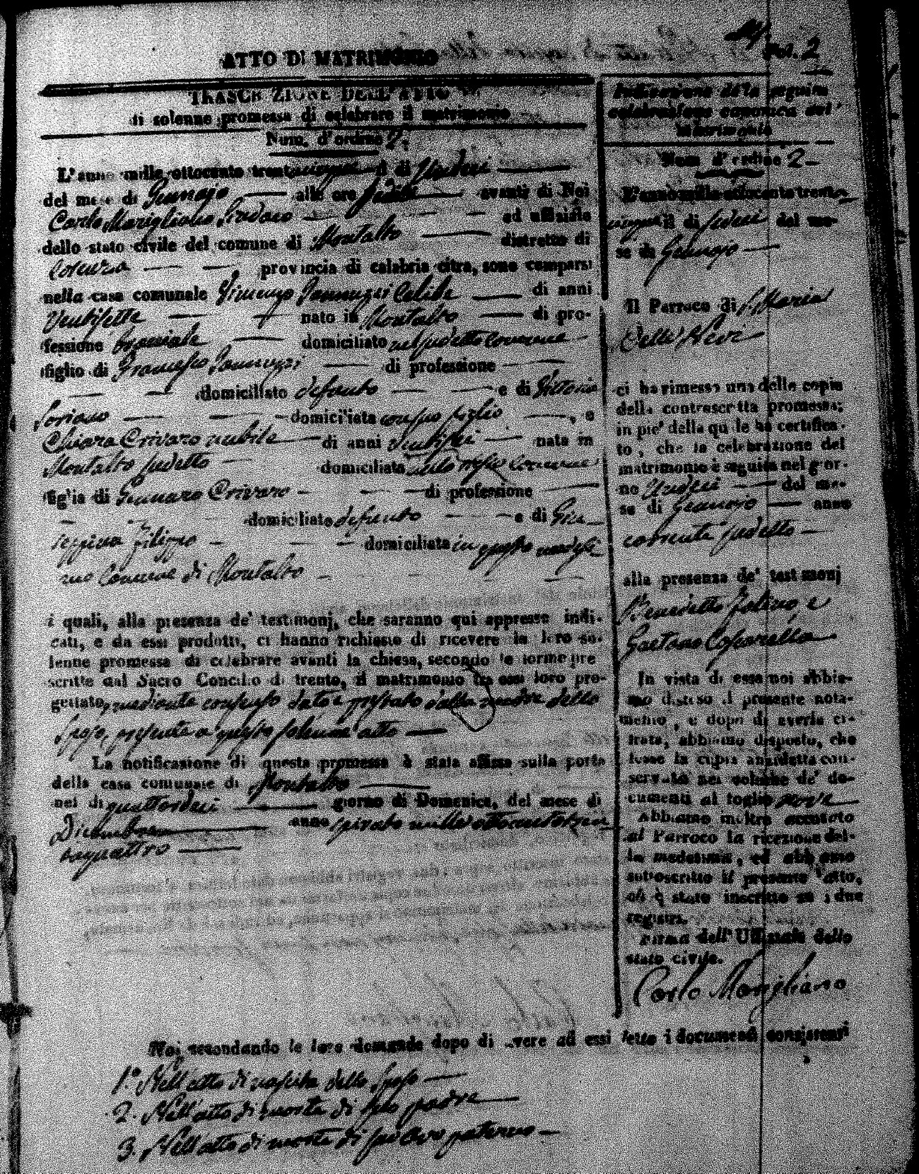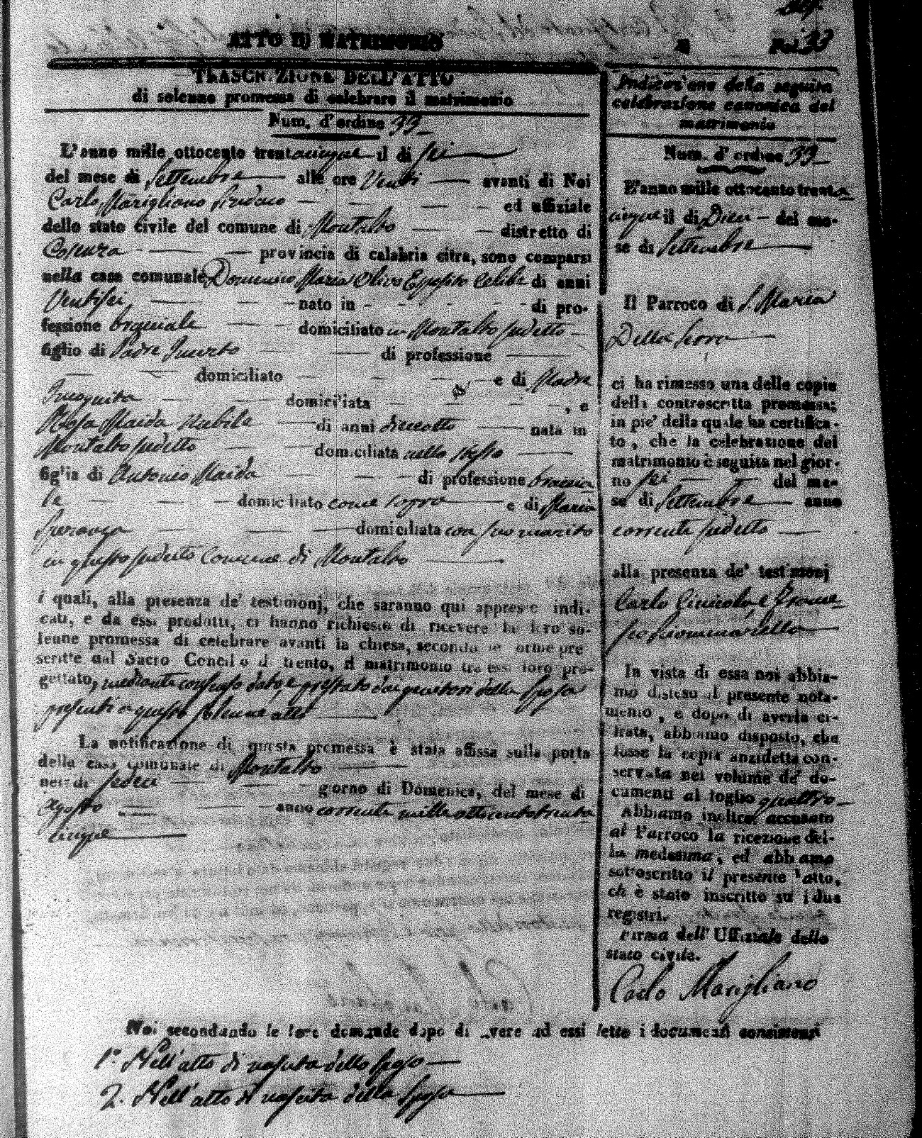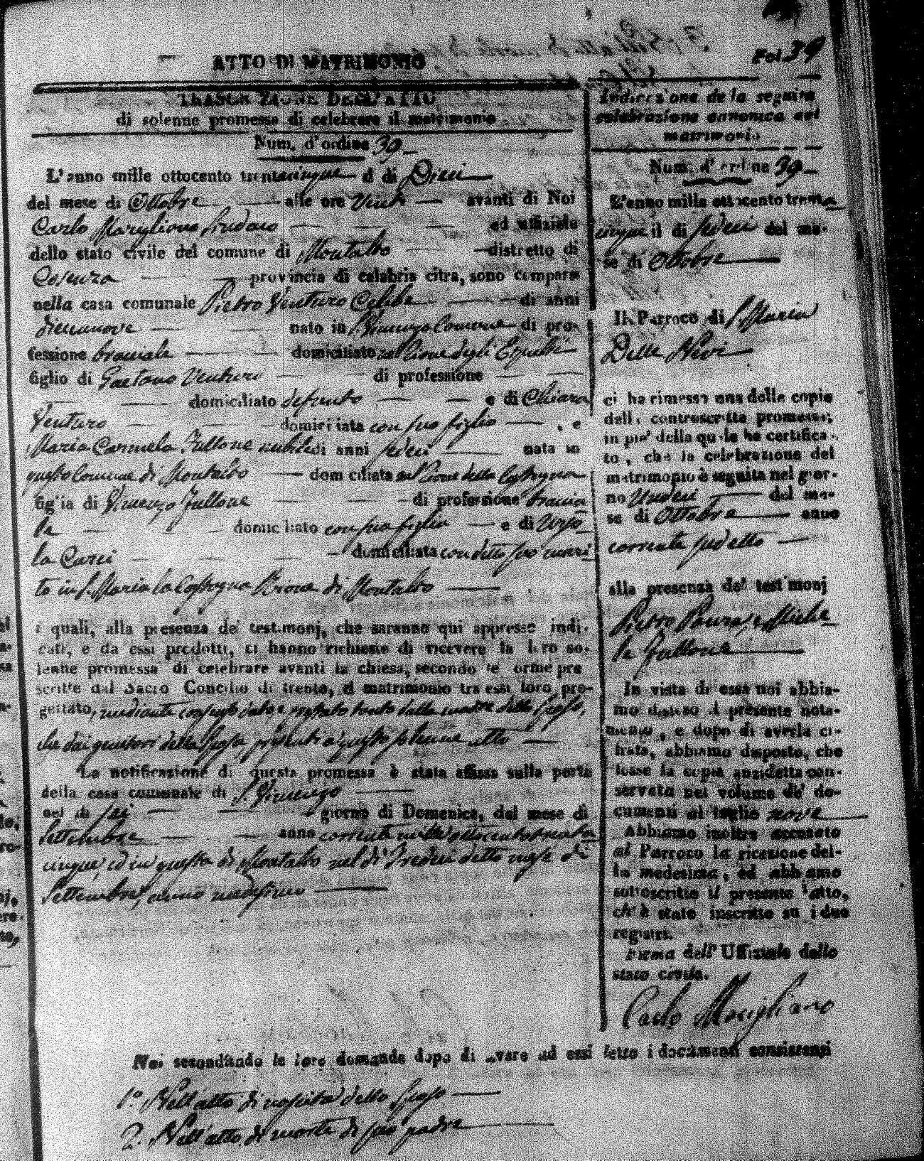 Here are the extractions for the marriage acts in 1835 for Montalto Uffugo. To save time we have only transcribed the names of the groom and bride. For more information, click on the groom's surname to view page 1 of the copy of the original document and his first name to view page 2.