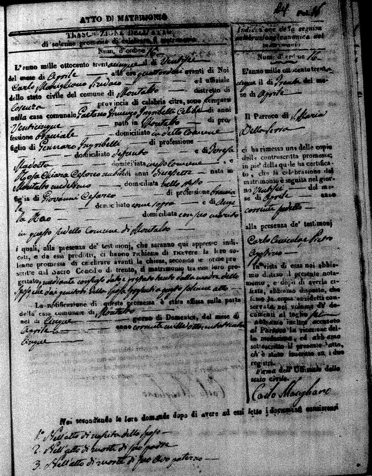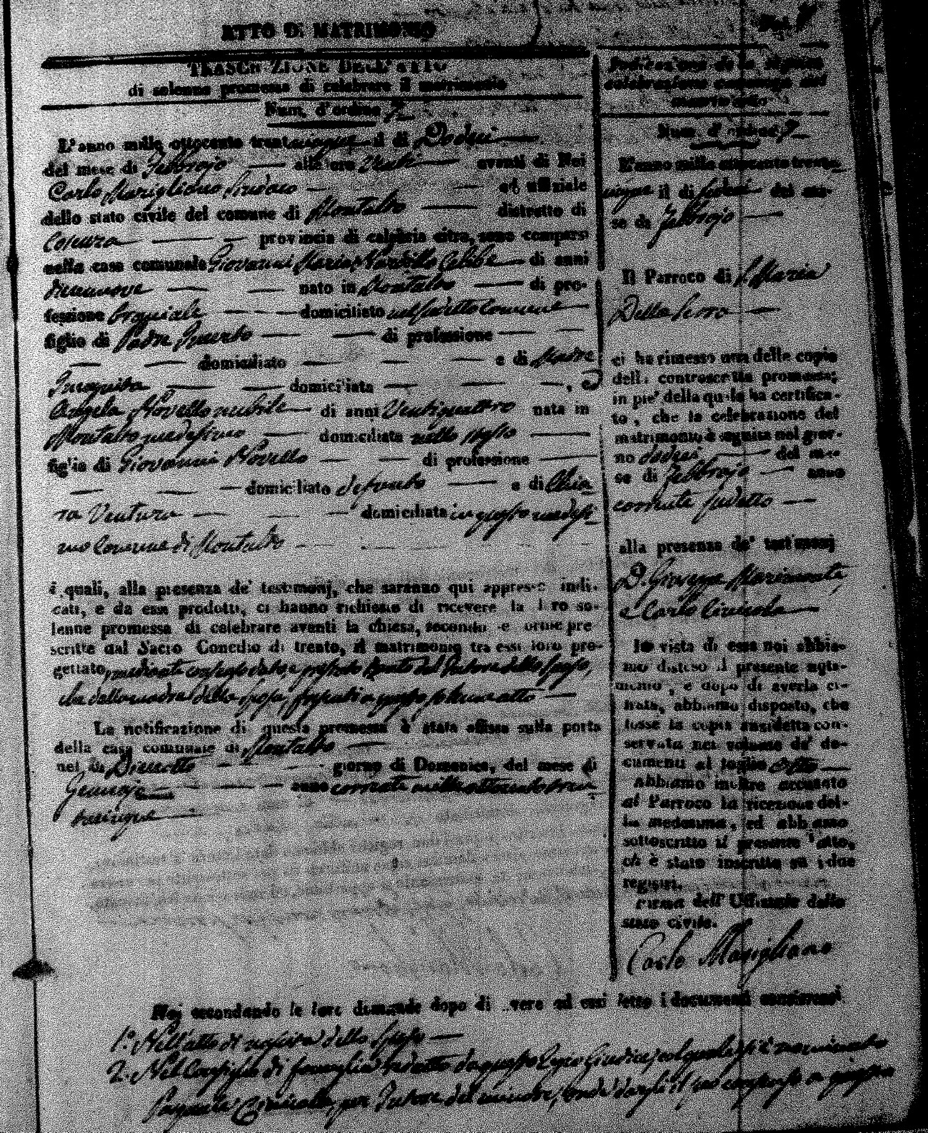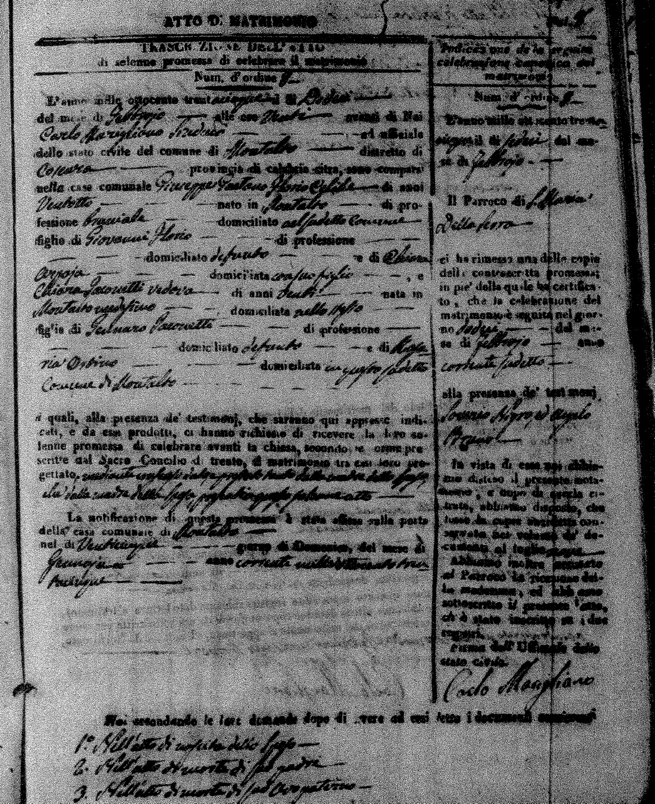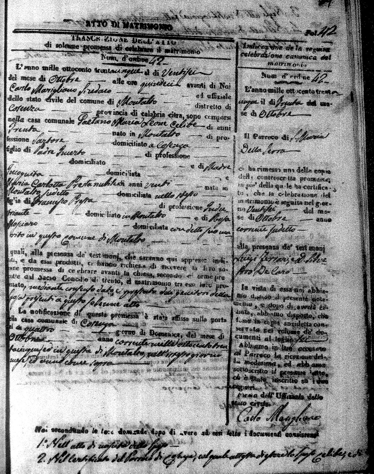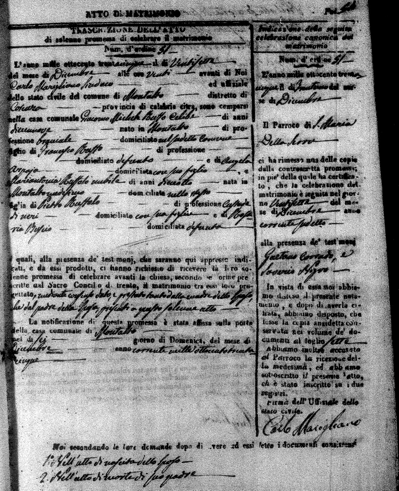 Here are the extractions for the marriage acts in 1835 for Montalto Uffugo. To save time we have only transcribed the names of the groom and bride. For more information, click on the groom's surname to view page 1 of the copy of the original document and his first name to view page 2.