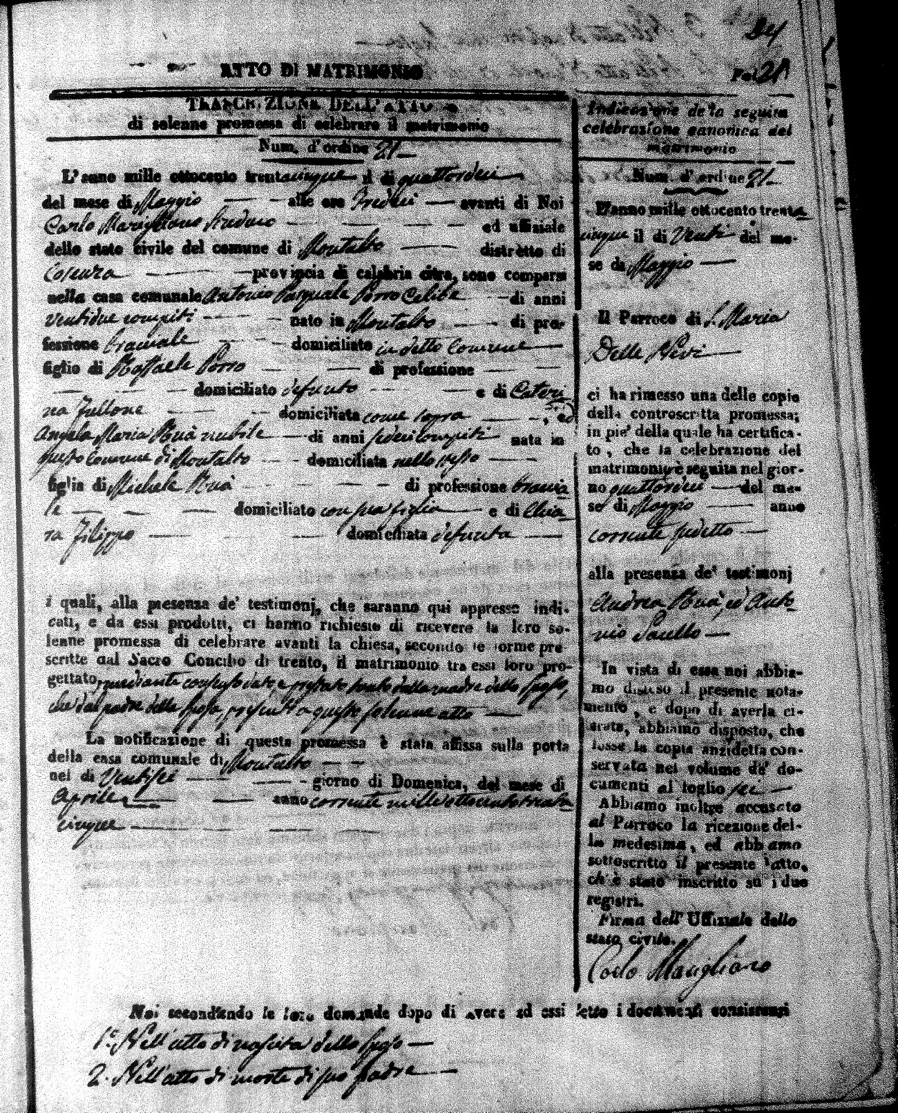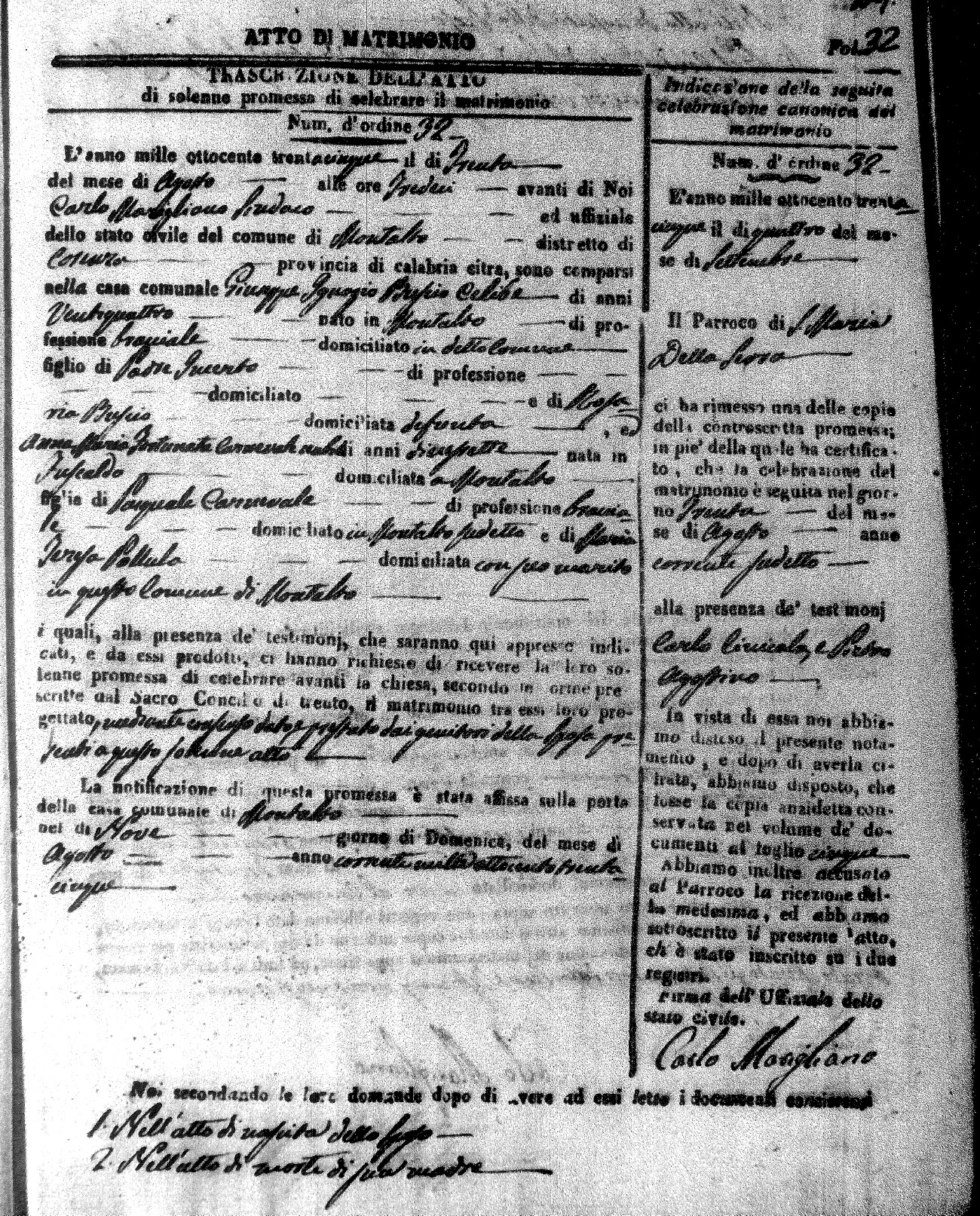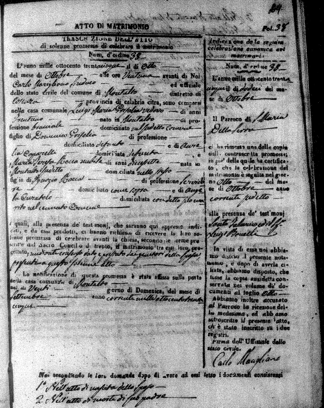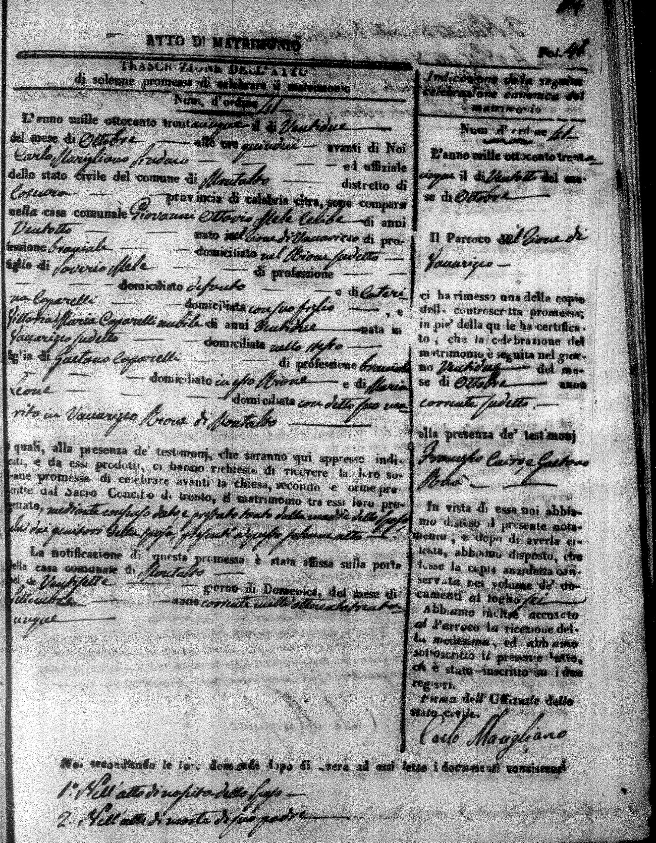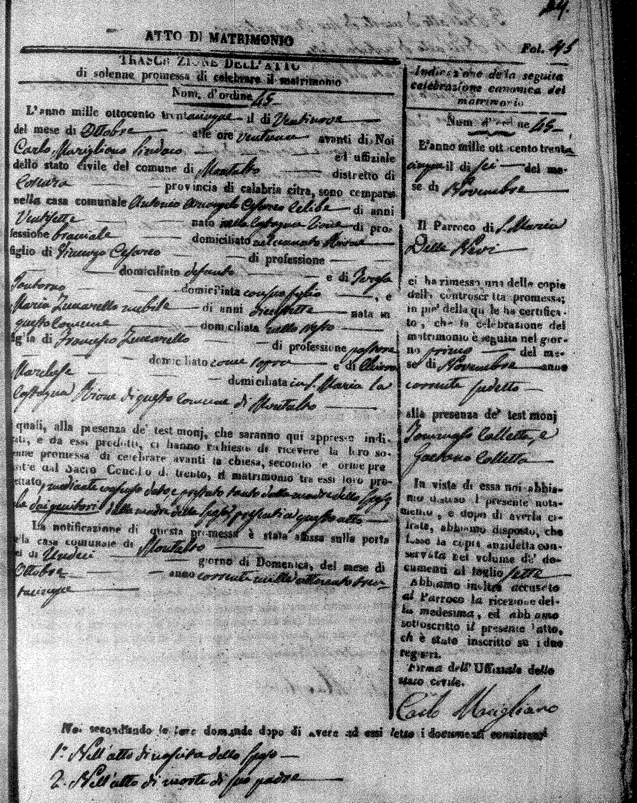 Here are the extractions for the marriage acts in 1835 for Montalto Uffugo. To save time we have only transcribed the names of the groom and bride. For more information, click on the groom's surname to view page 1 of the copy of the original document and his first name to view page 2.