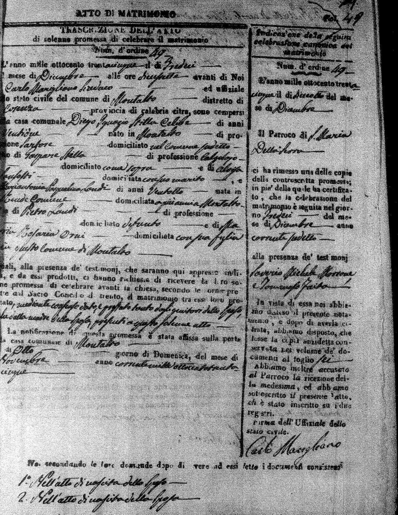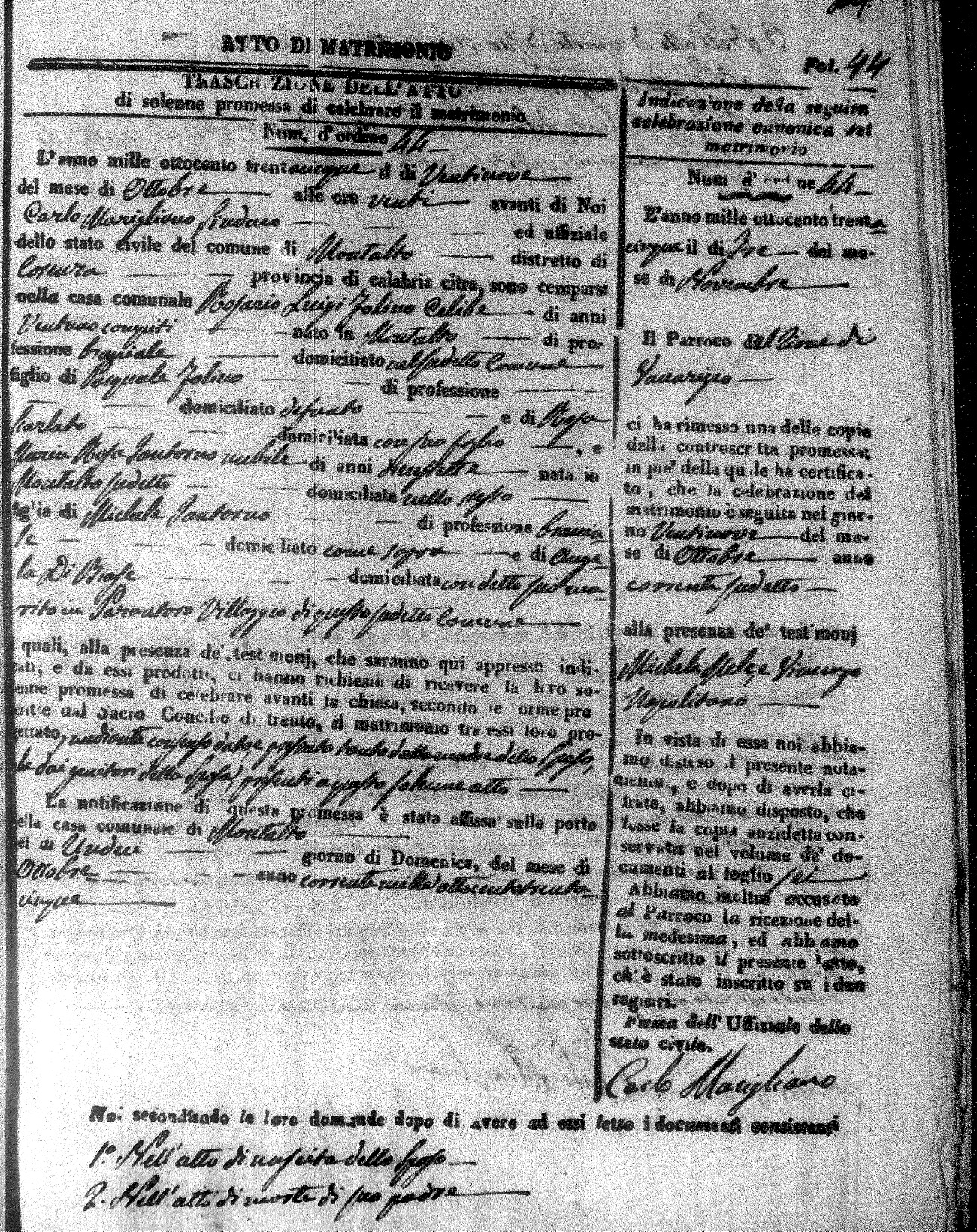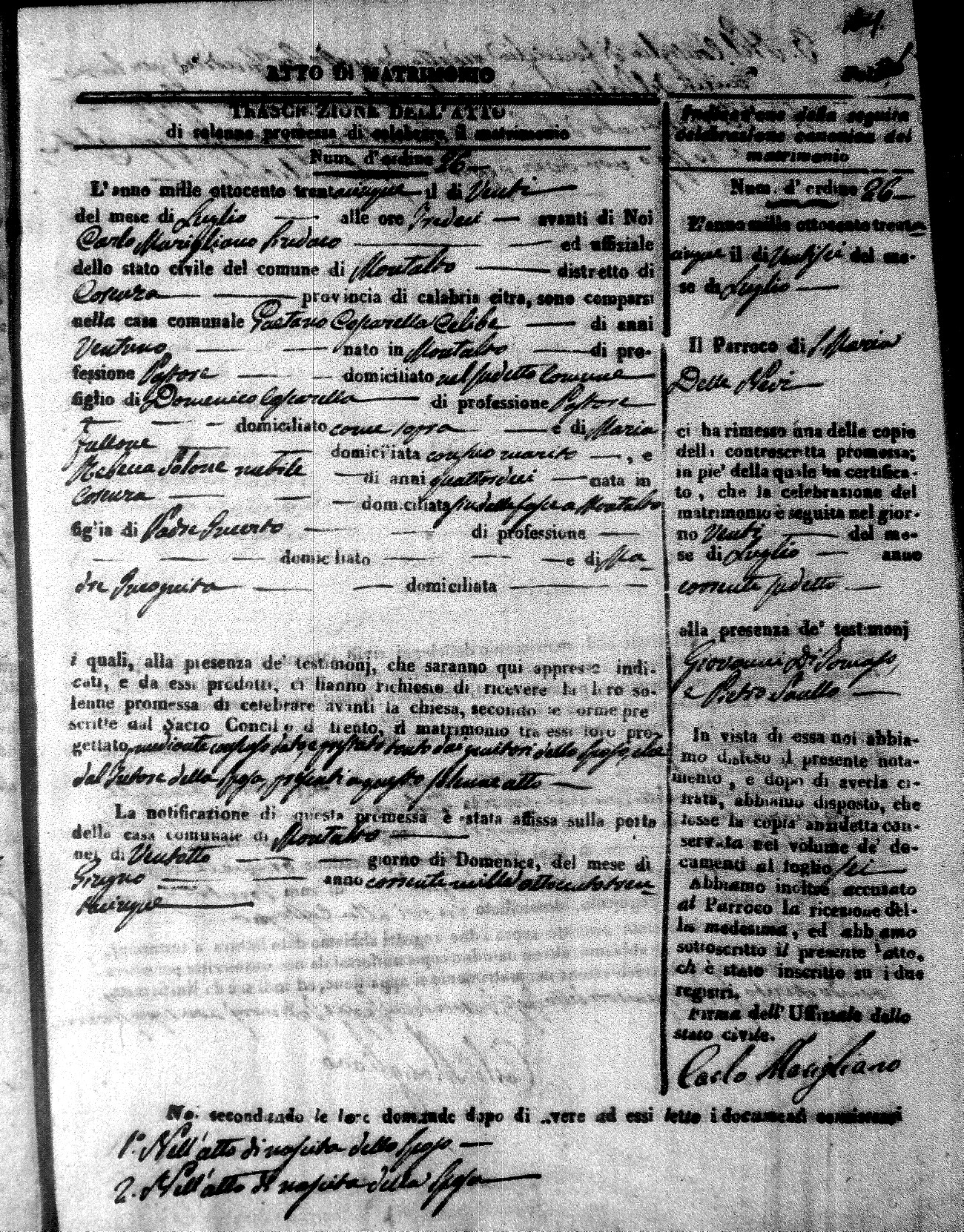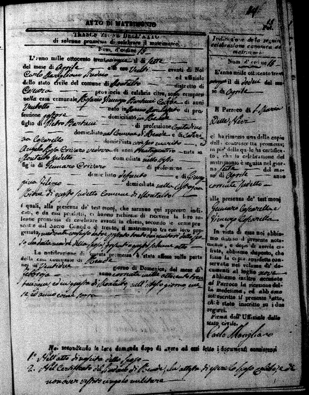 Here are the extractions for the marriage acts in 1835 for Montalto Uffugo. To save time we have only transcribed the names of the groom and bride. For more information, click on the groom's surname to view page 1 of the copy of the original document and his first name to view page 2.