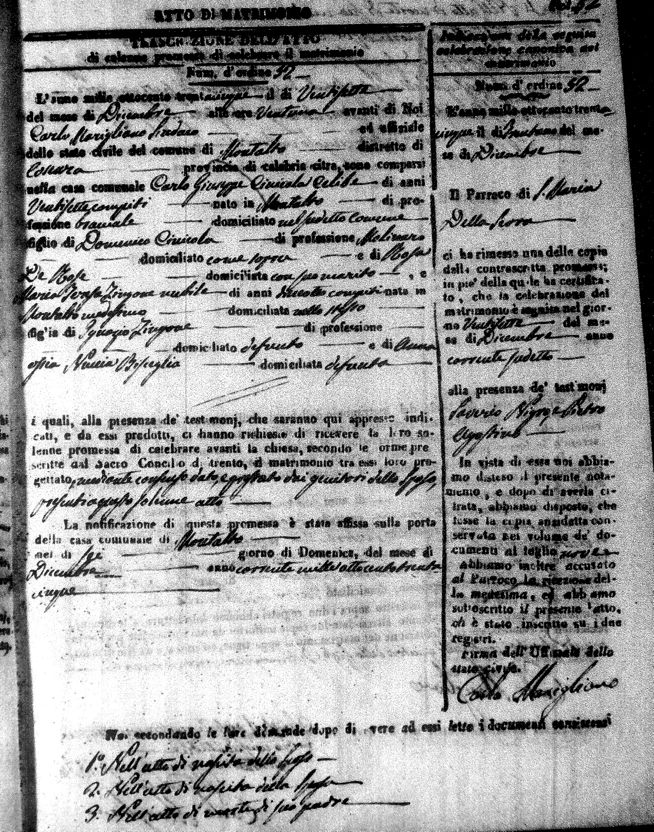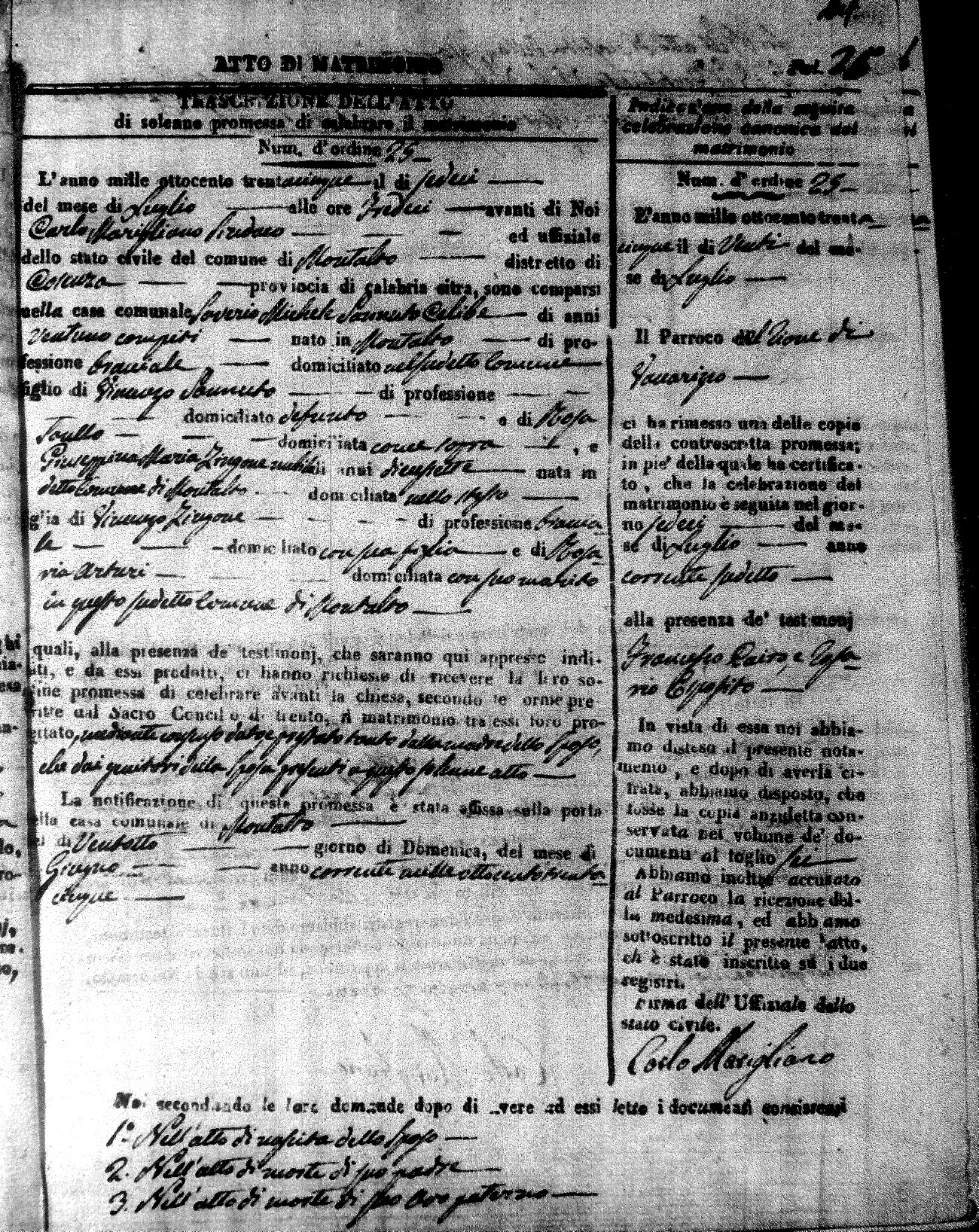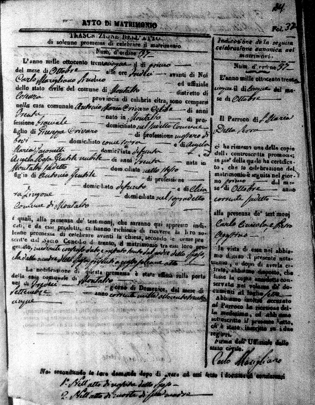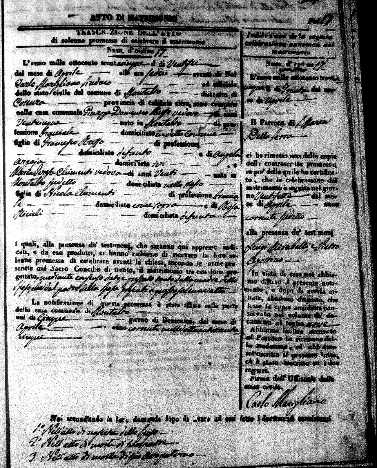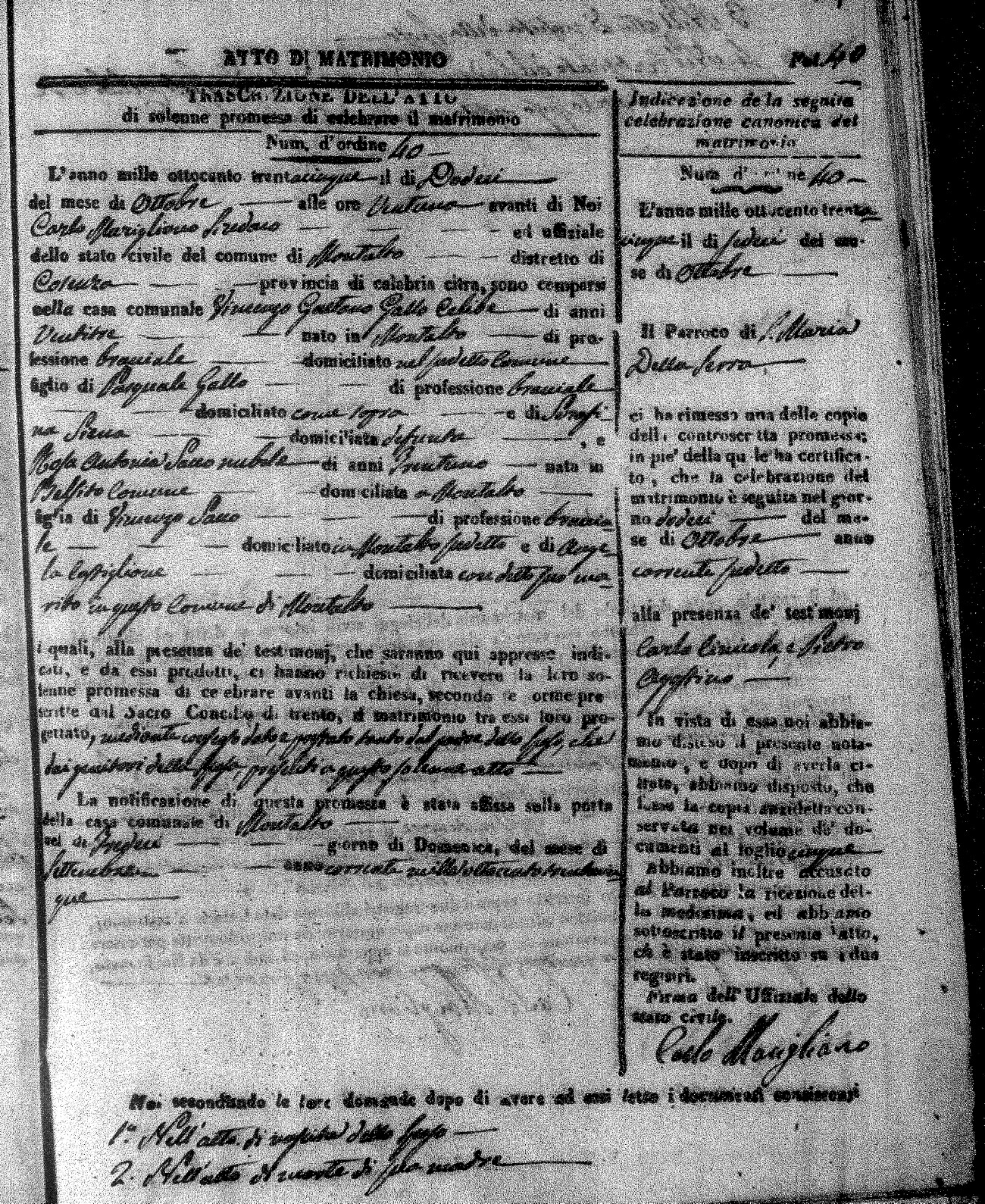 Here are the extractions for the marriage acts in 1835 for Montalto Uffugo. To save time we have only transcribed the names of the groom and bride. For more information, click on the groom's surname to view page 1 of the copy of the original document and his first name to view page 2.