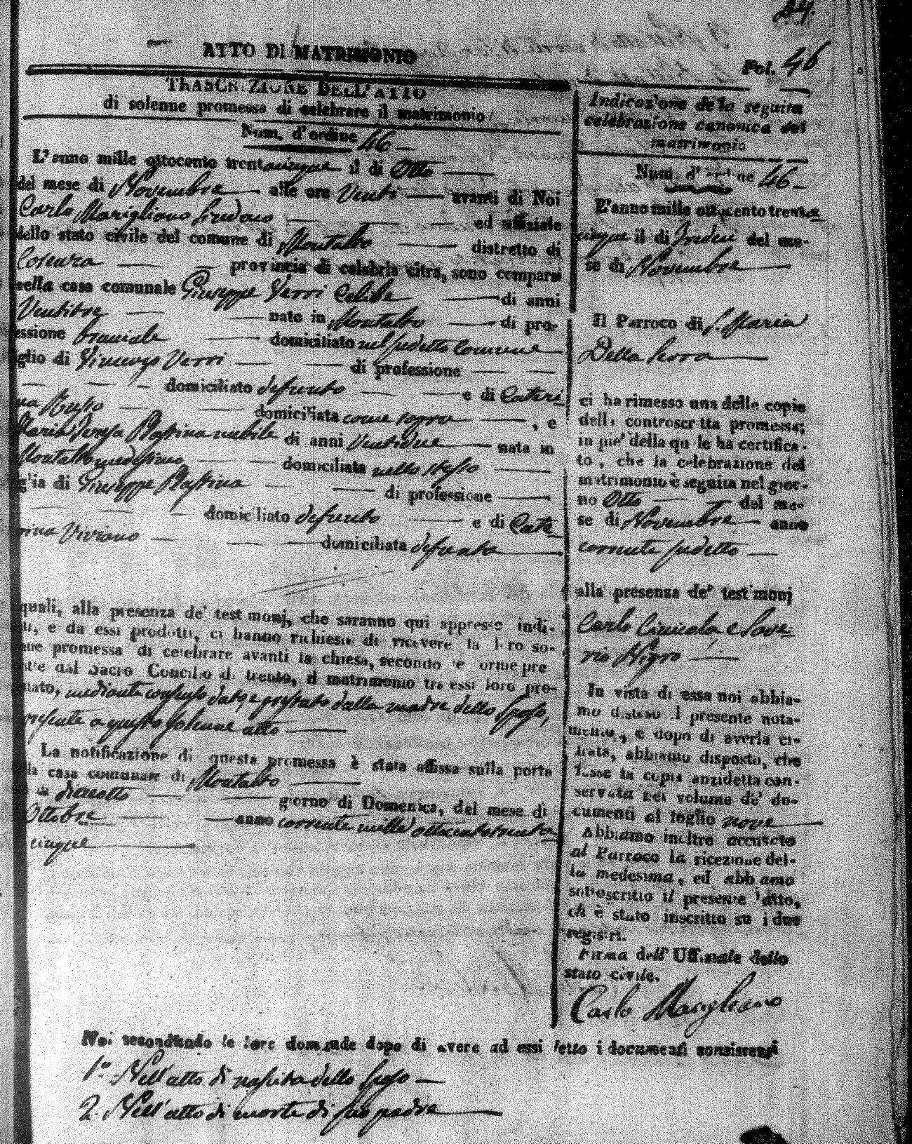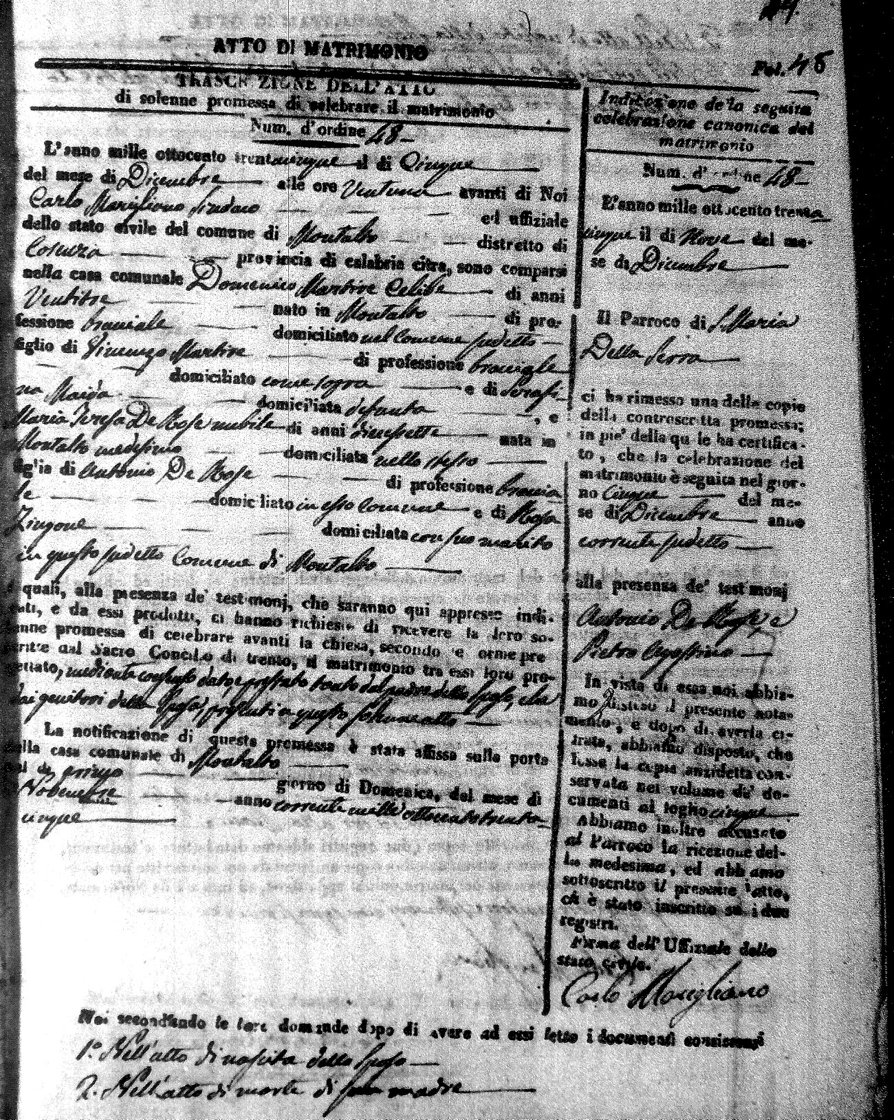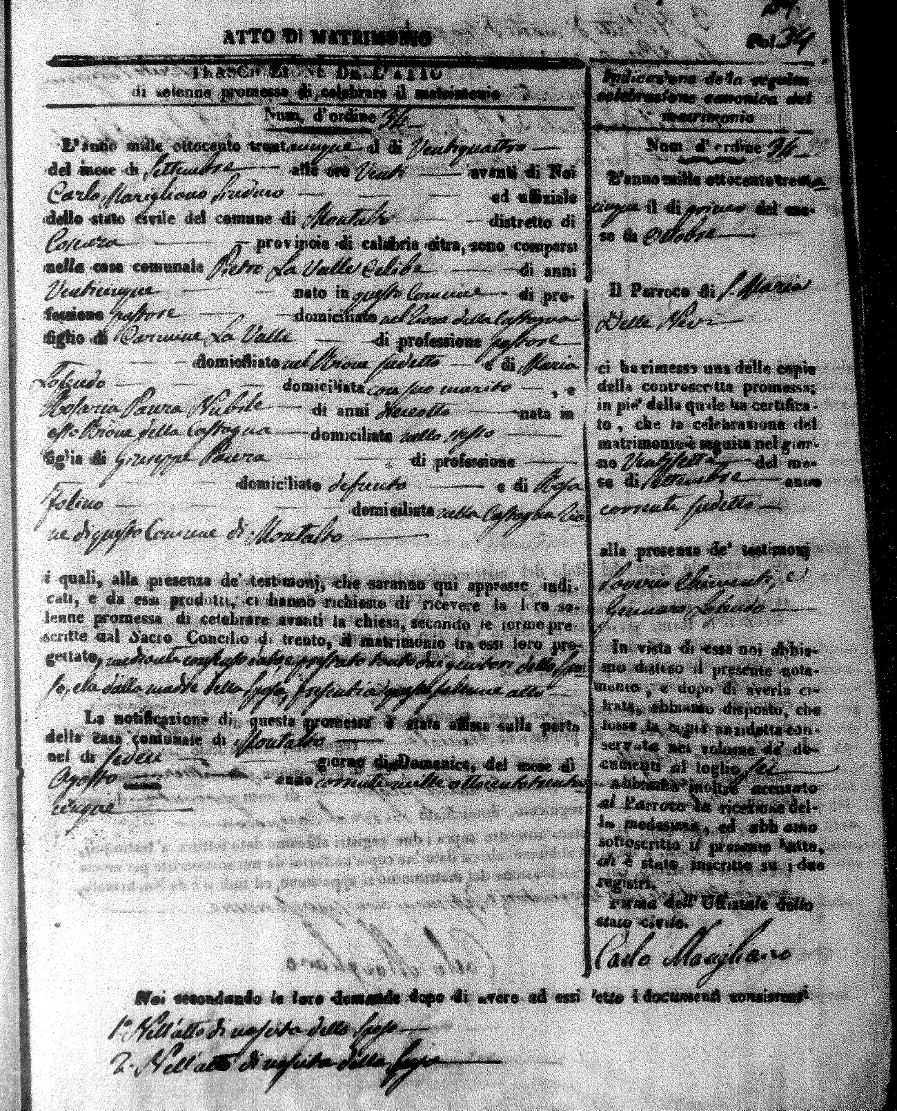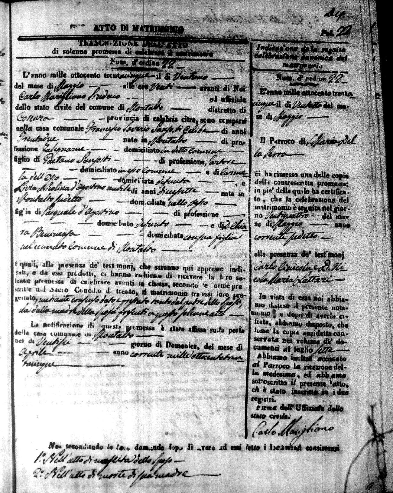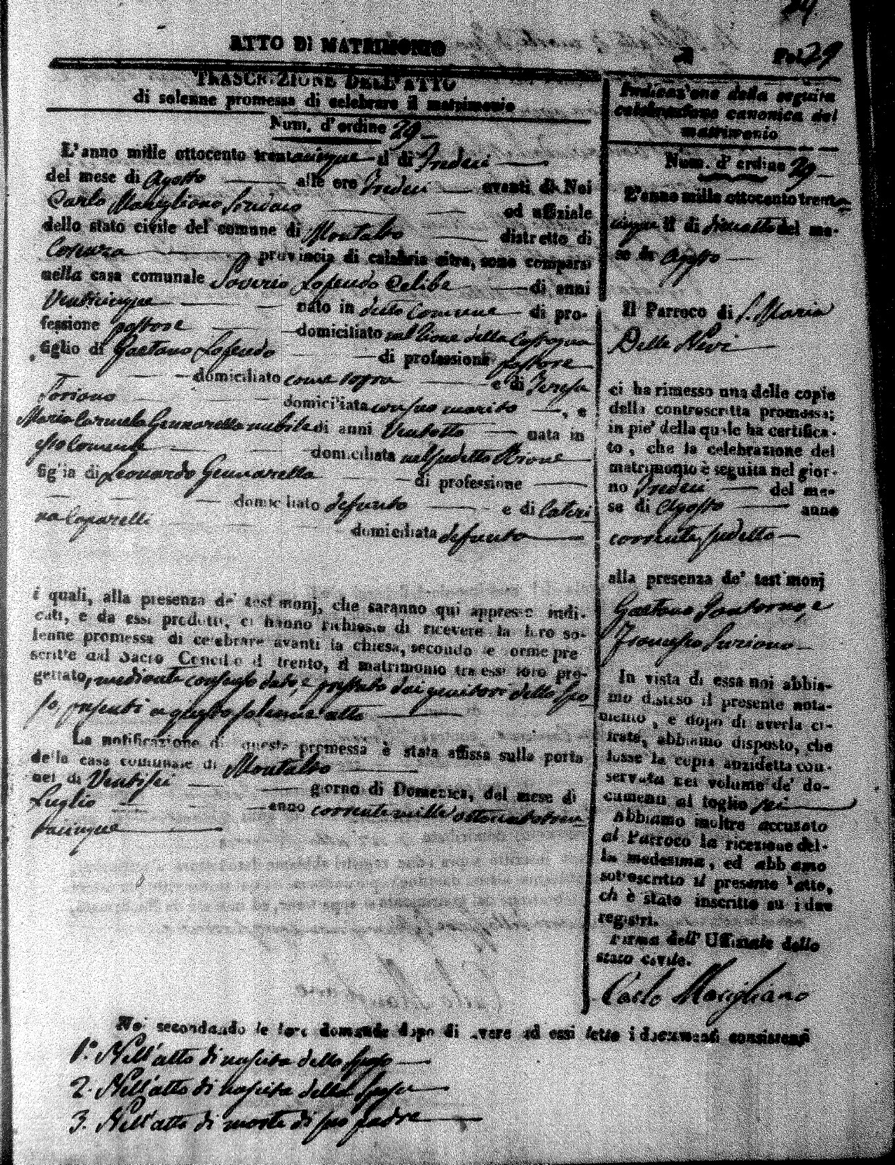 Here are the extractions for the marriage acts in 1835 for Montalto Uffugo. To save time we have only transcribed the names of the groom and bride. For more information, click on the groom's surname to view page 1 of the copy of the original document and his first name to view page 2.