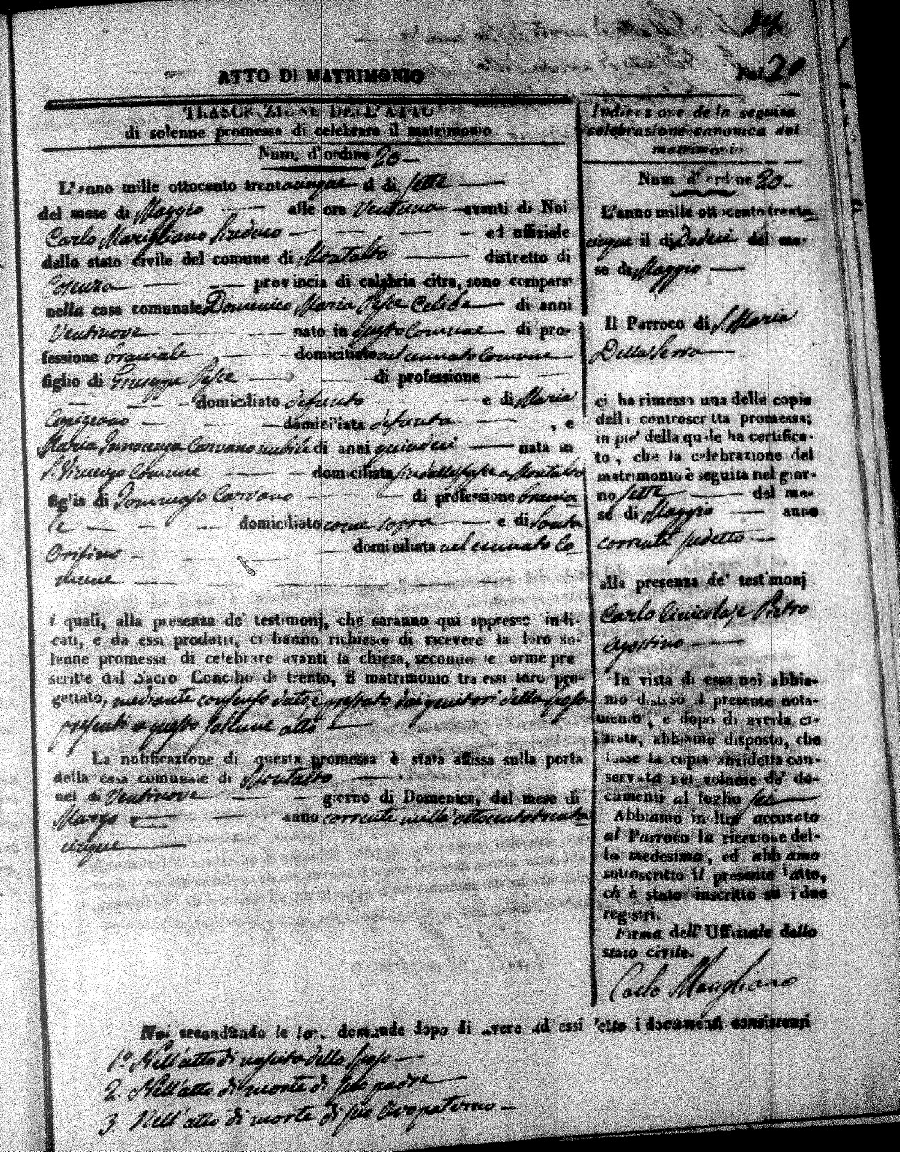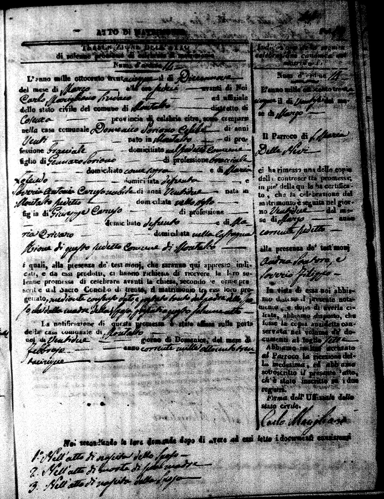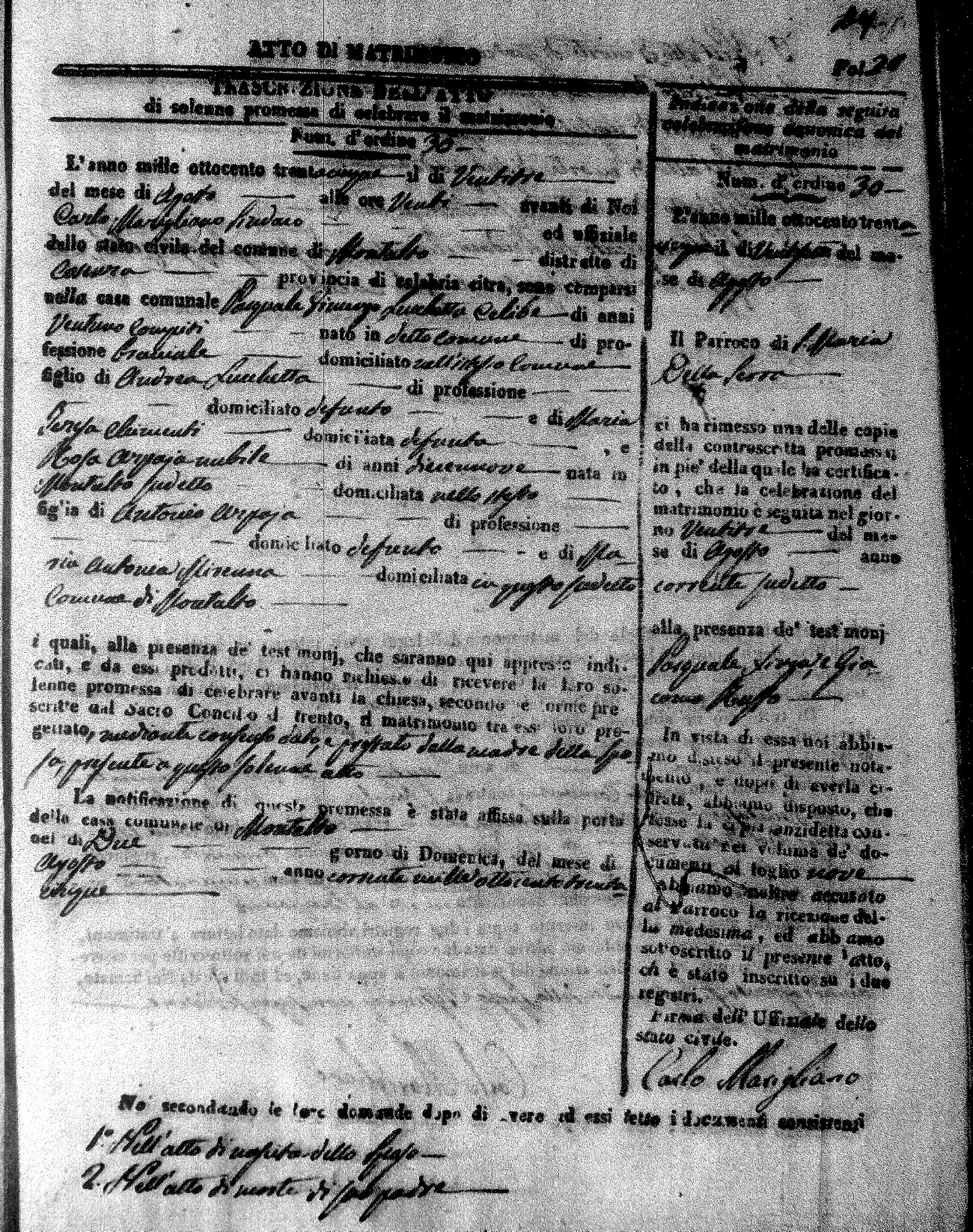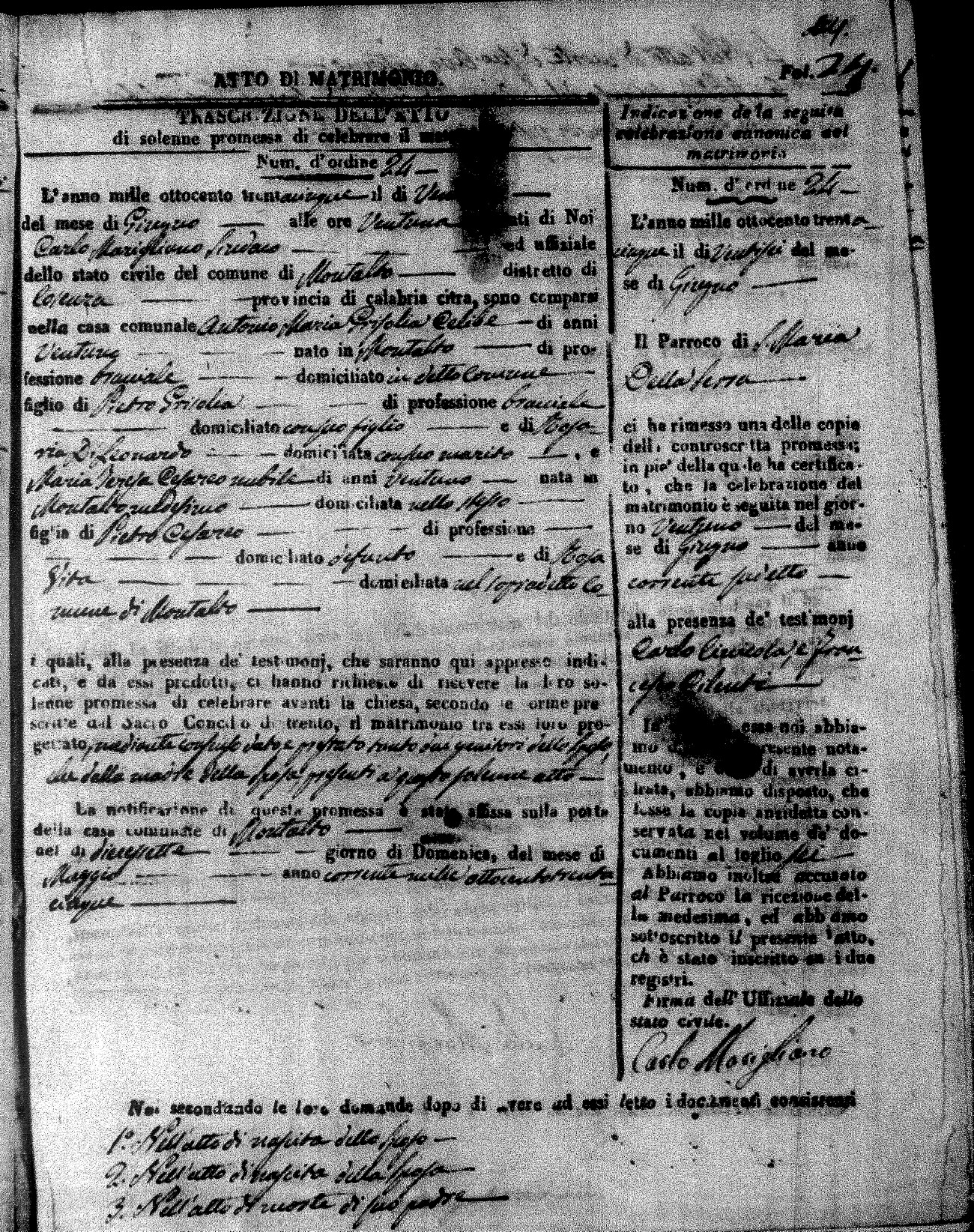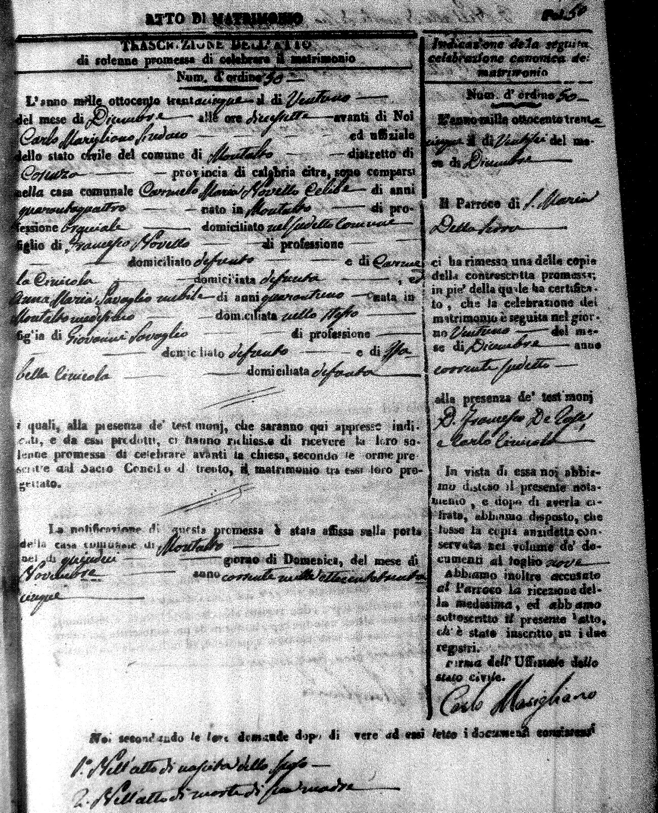 Here are the extractions for the marriage acts in 1835 for Montalto Uffugo. To save time we have only transcribed the names of the groom and bride. For more information, click on the groom's surname to view page 1 of the copy of the original document and his first name to view page 2.