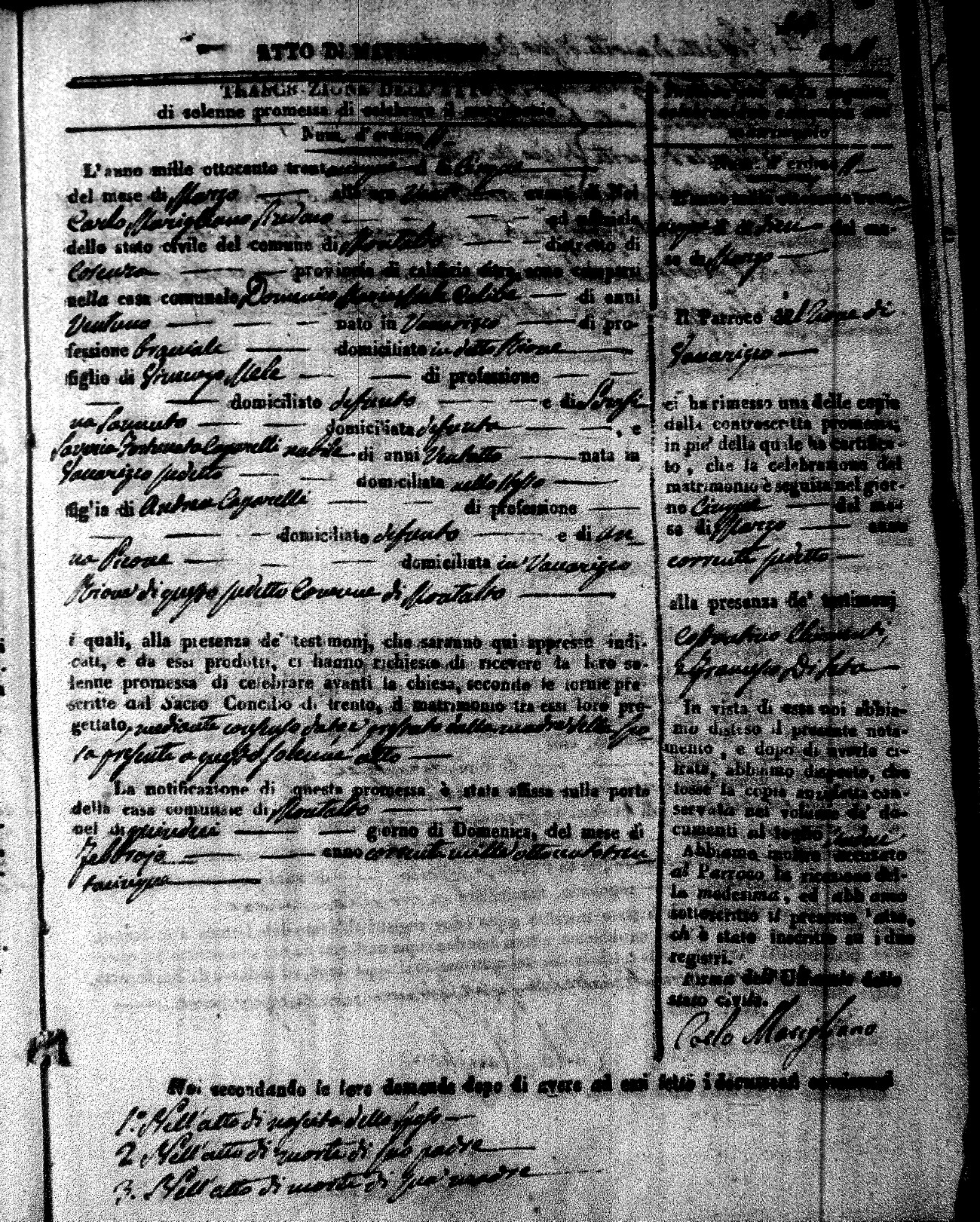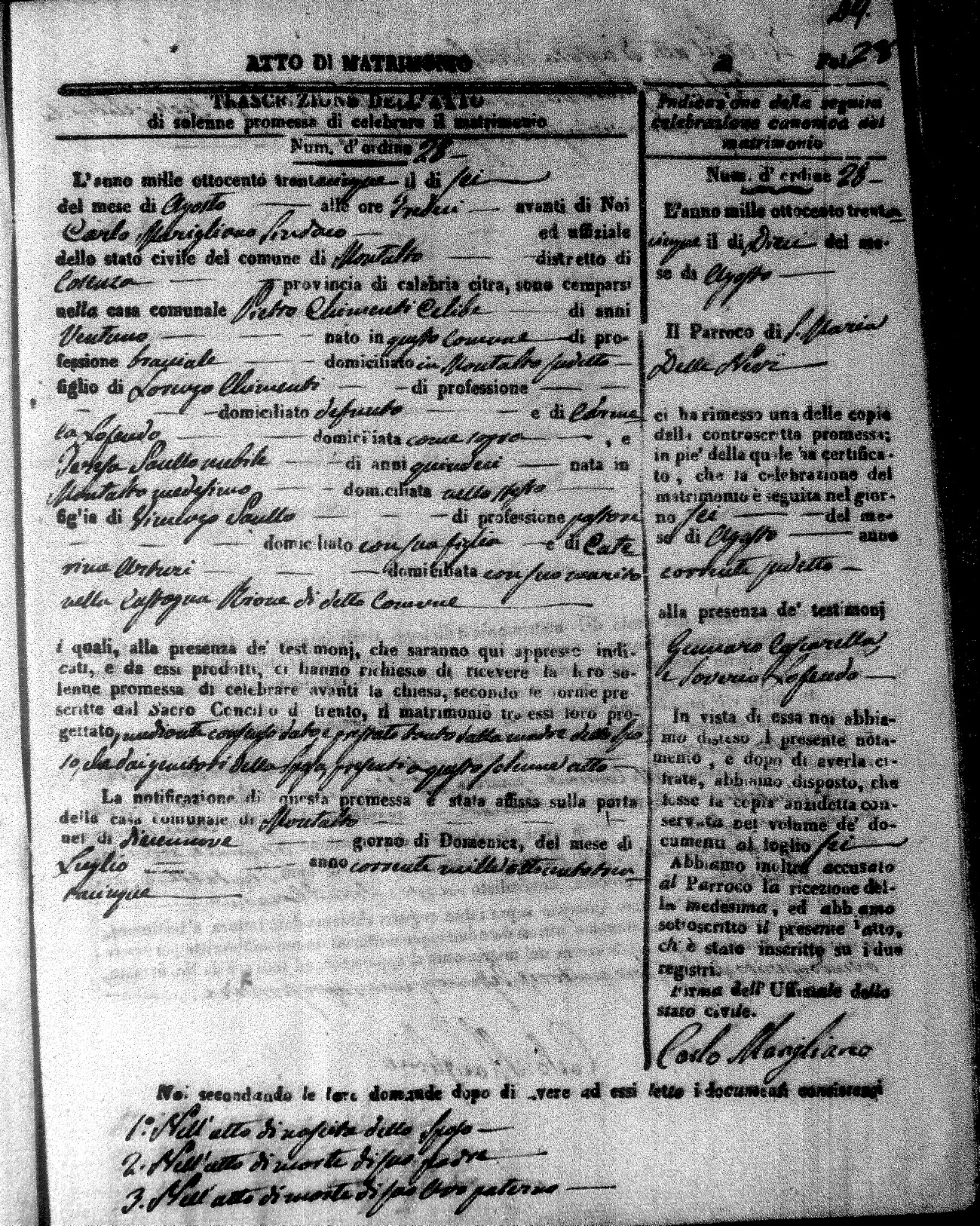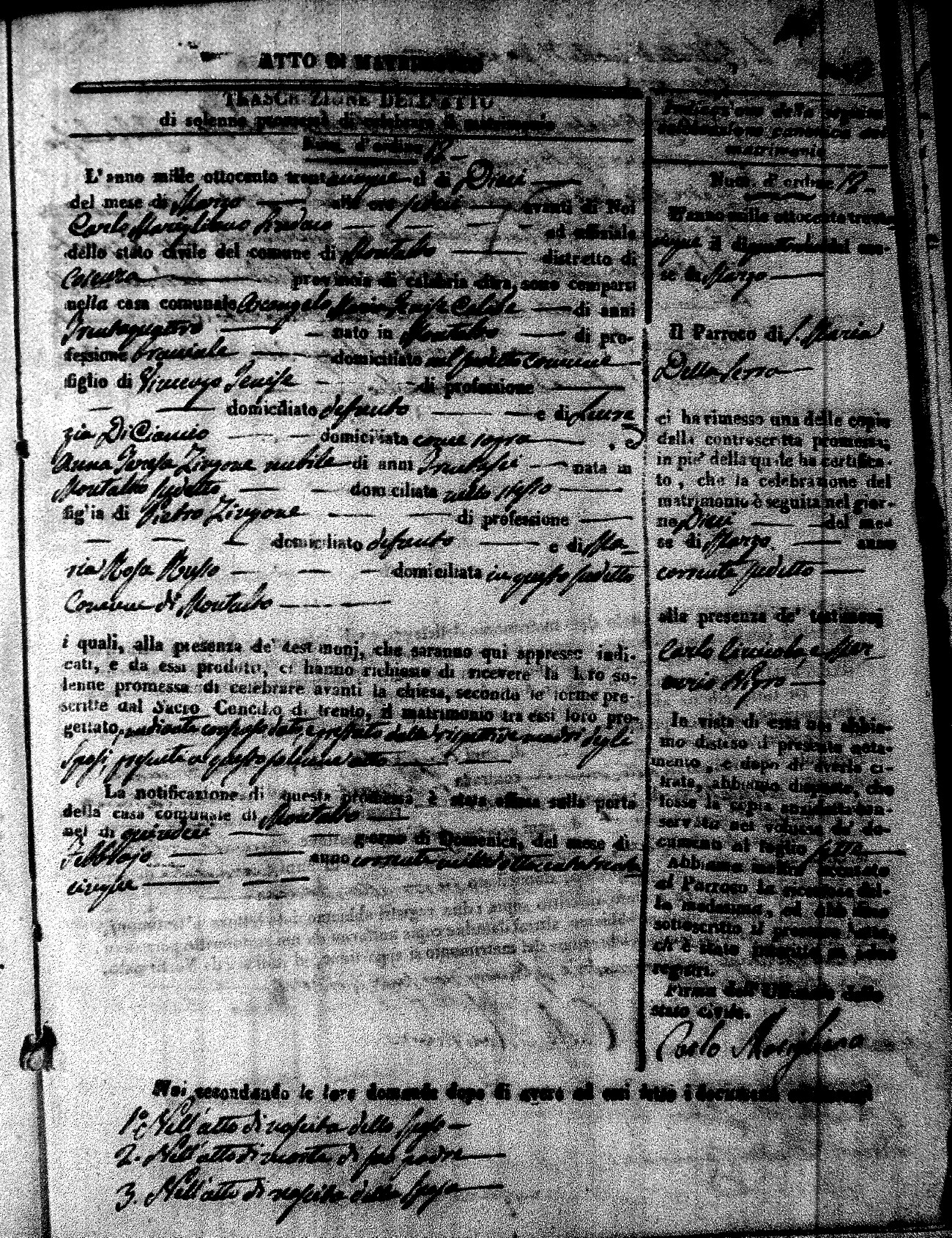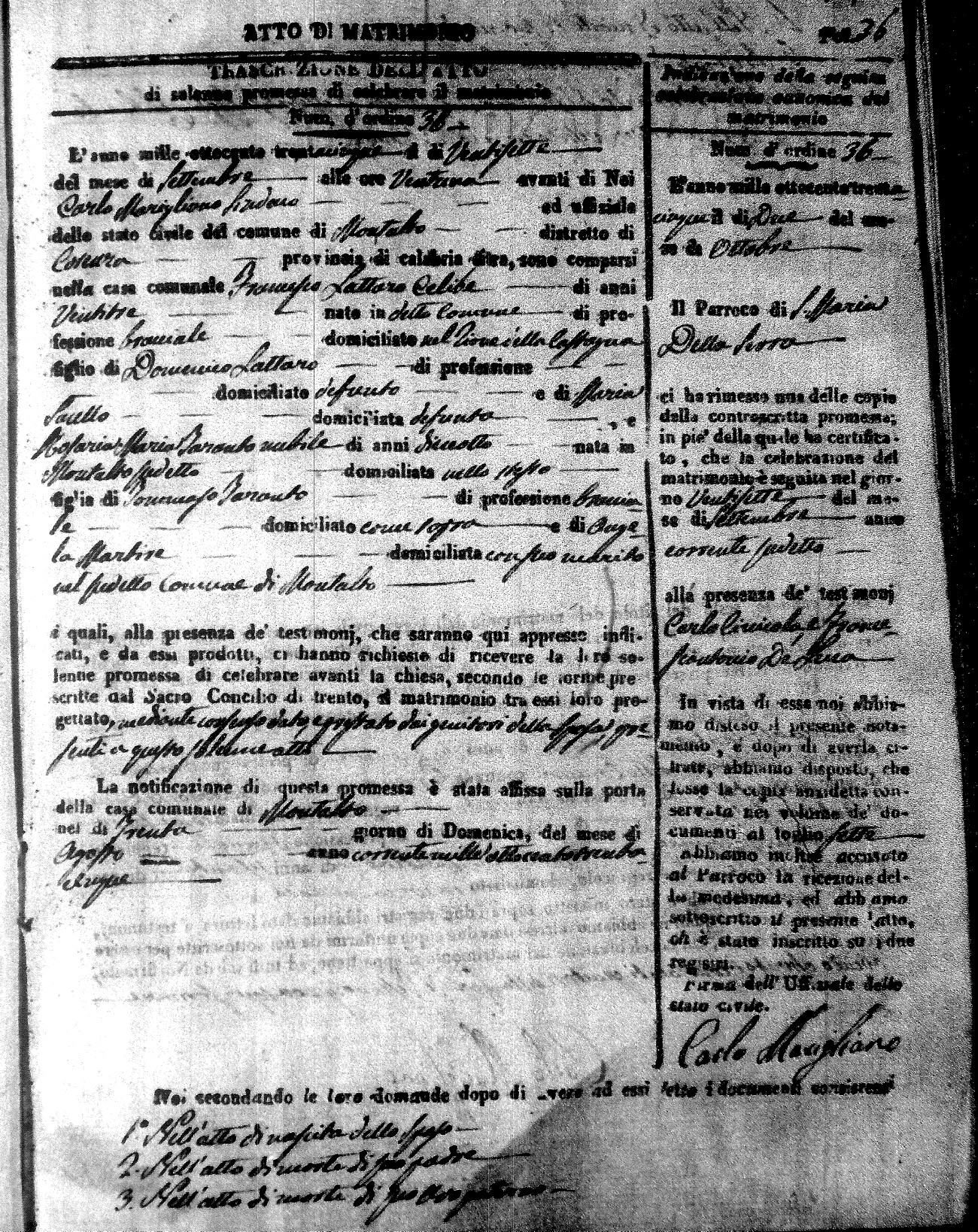 Here are the extractions for the marriage acts in 1835 for Montalto Uffugo. To save time we have only transcribed the names of the groom and bride. For more information, click on the groom's surname to view page 1 of the copy of the original document and his first name to view page 2.