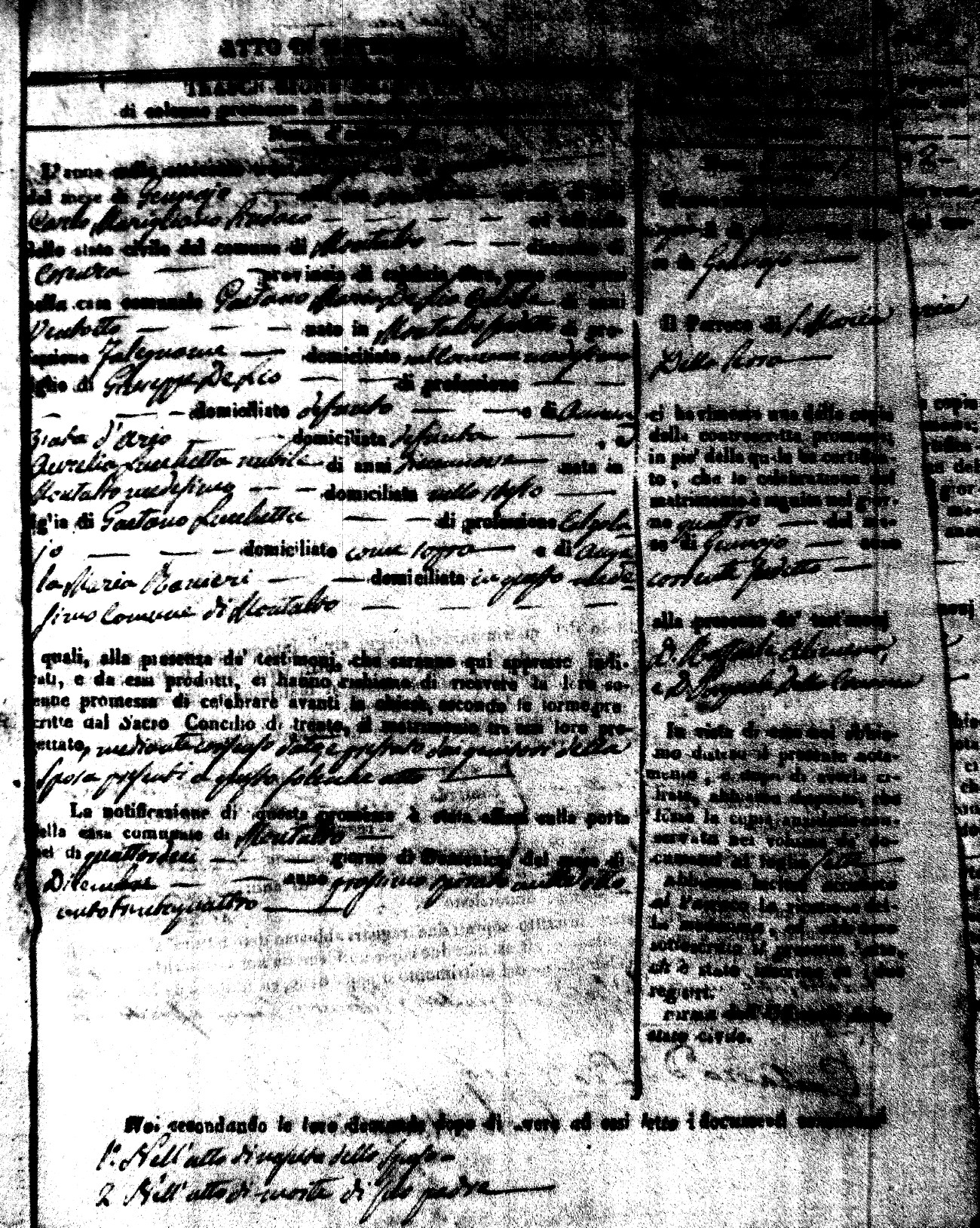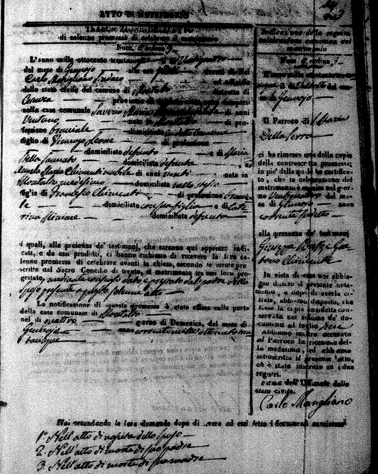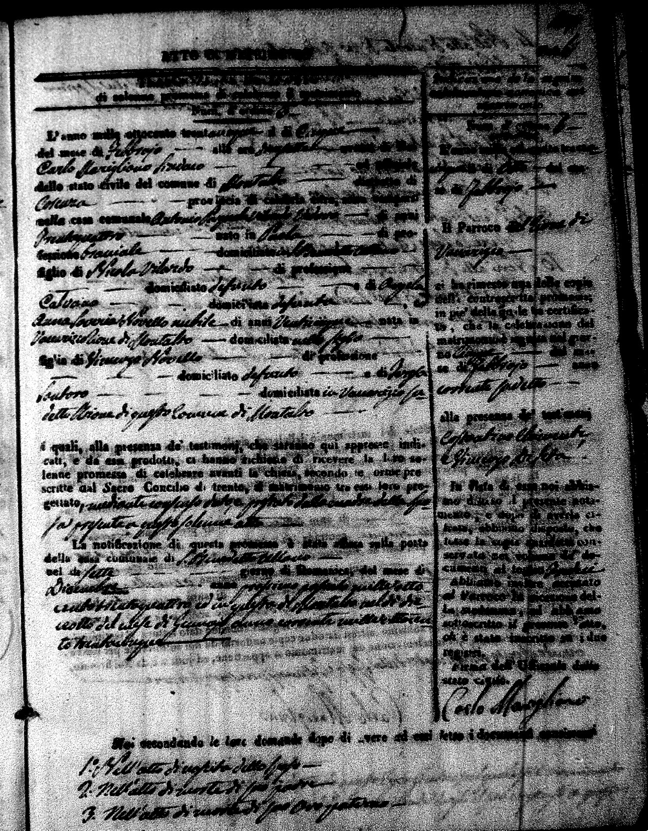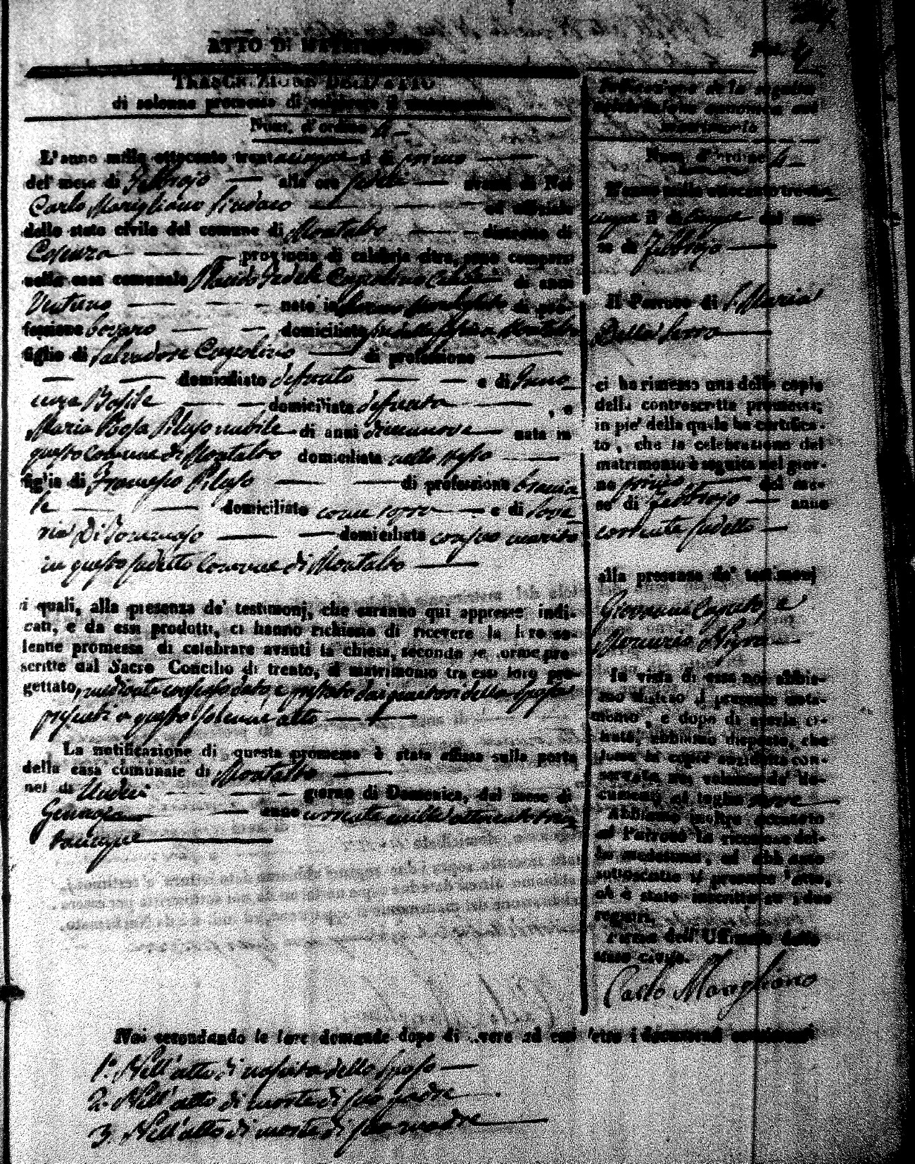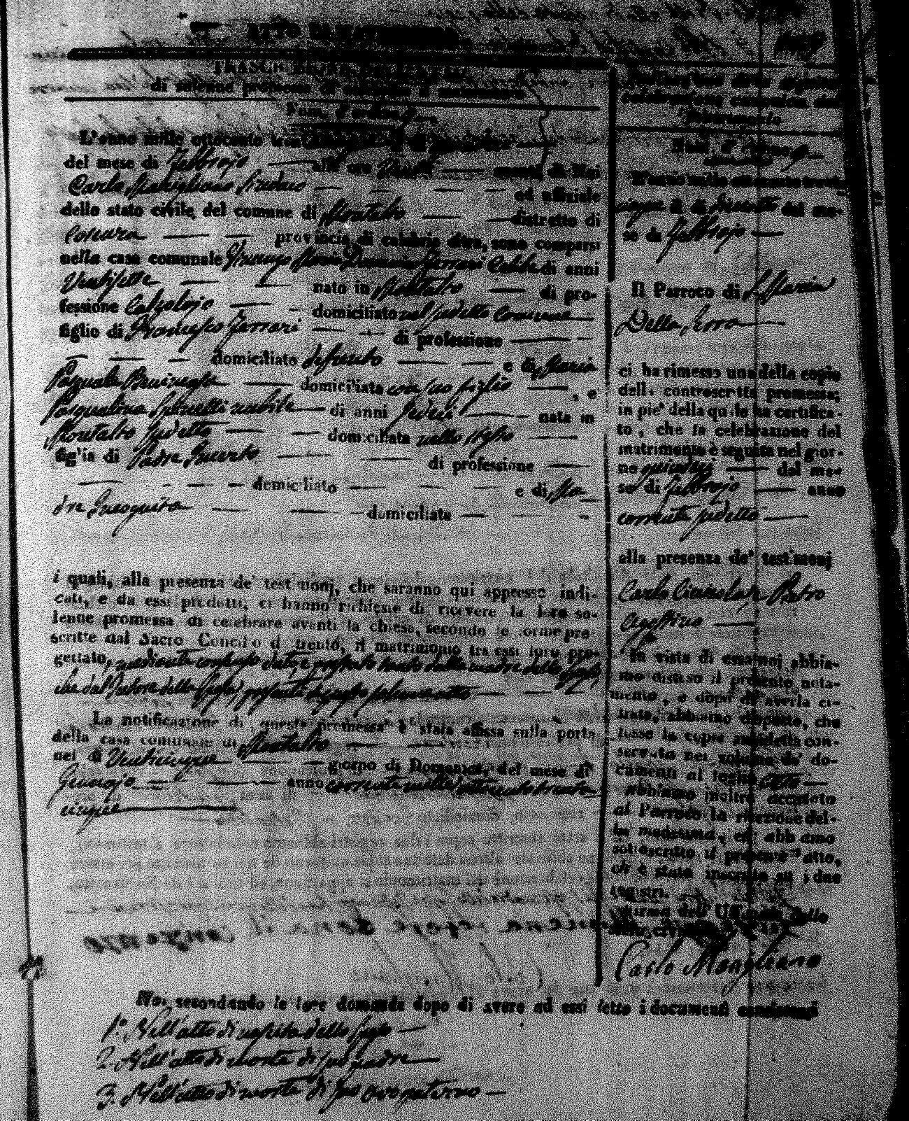 Here are the extractions for the marriage acts in 1835 for Montalto Uffugo. To save time we have only transcribed the names of the groom and bride. For more information, click on the groom's surname to view page 1 of the copy of the original document and his first name to view page 2.