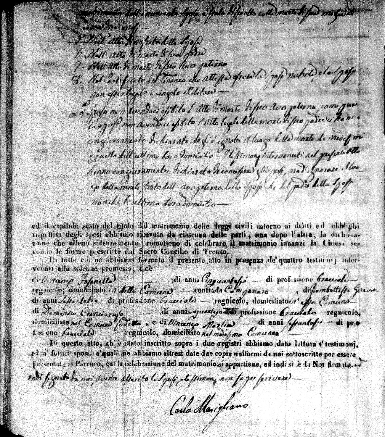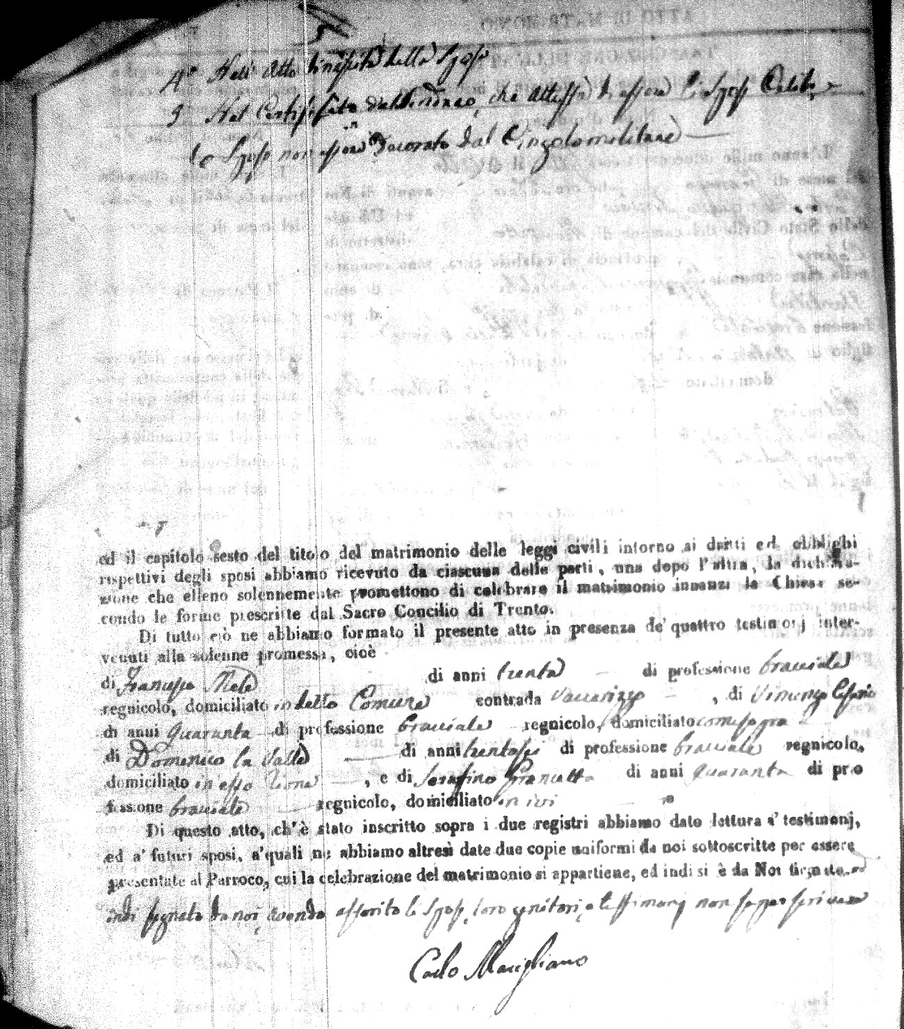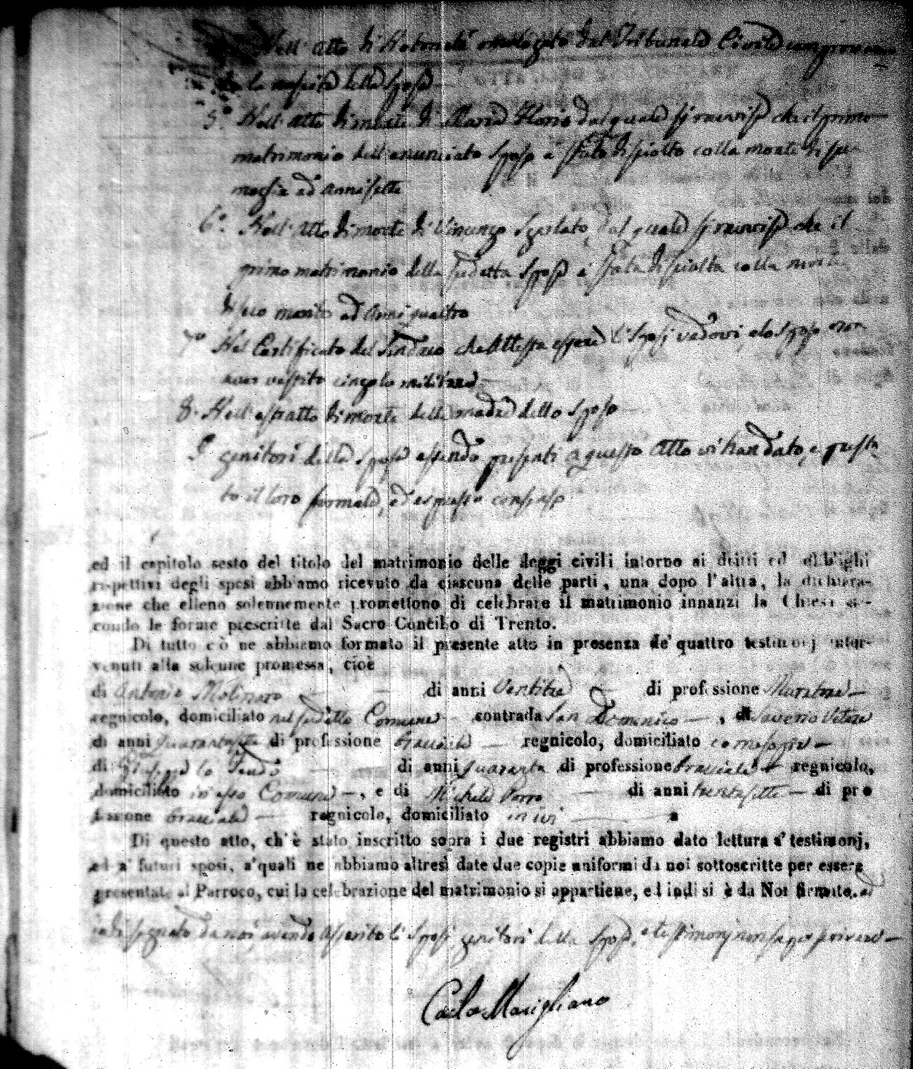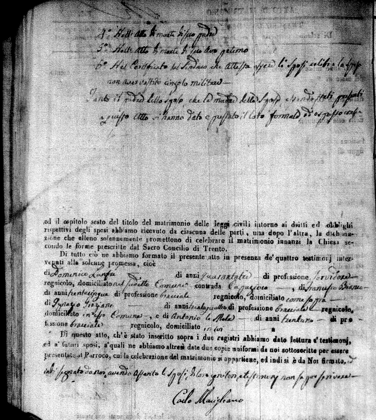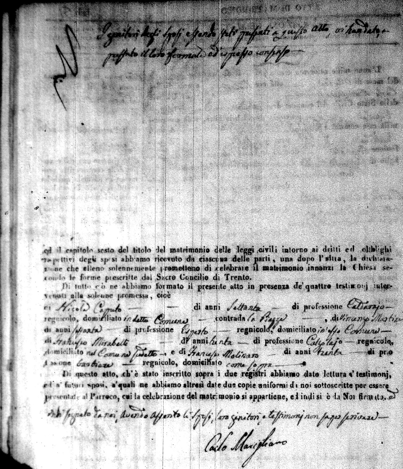 | Caraniolo | Matteo Benedetto Salvatore | Ferdinandp (fu) | Alimena | Maria Gaetana | Alimena | Anna Maria | Antonio (fu) | Barano | Violanta |