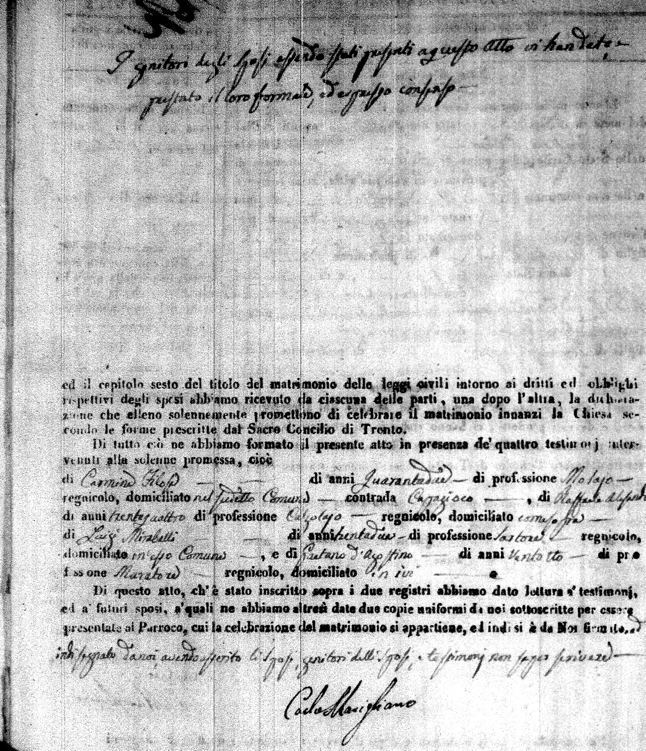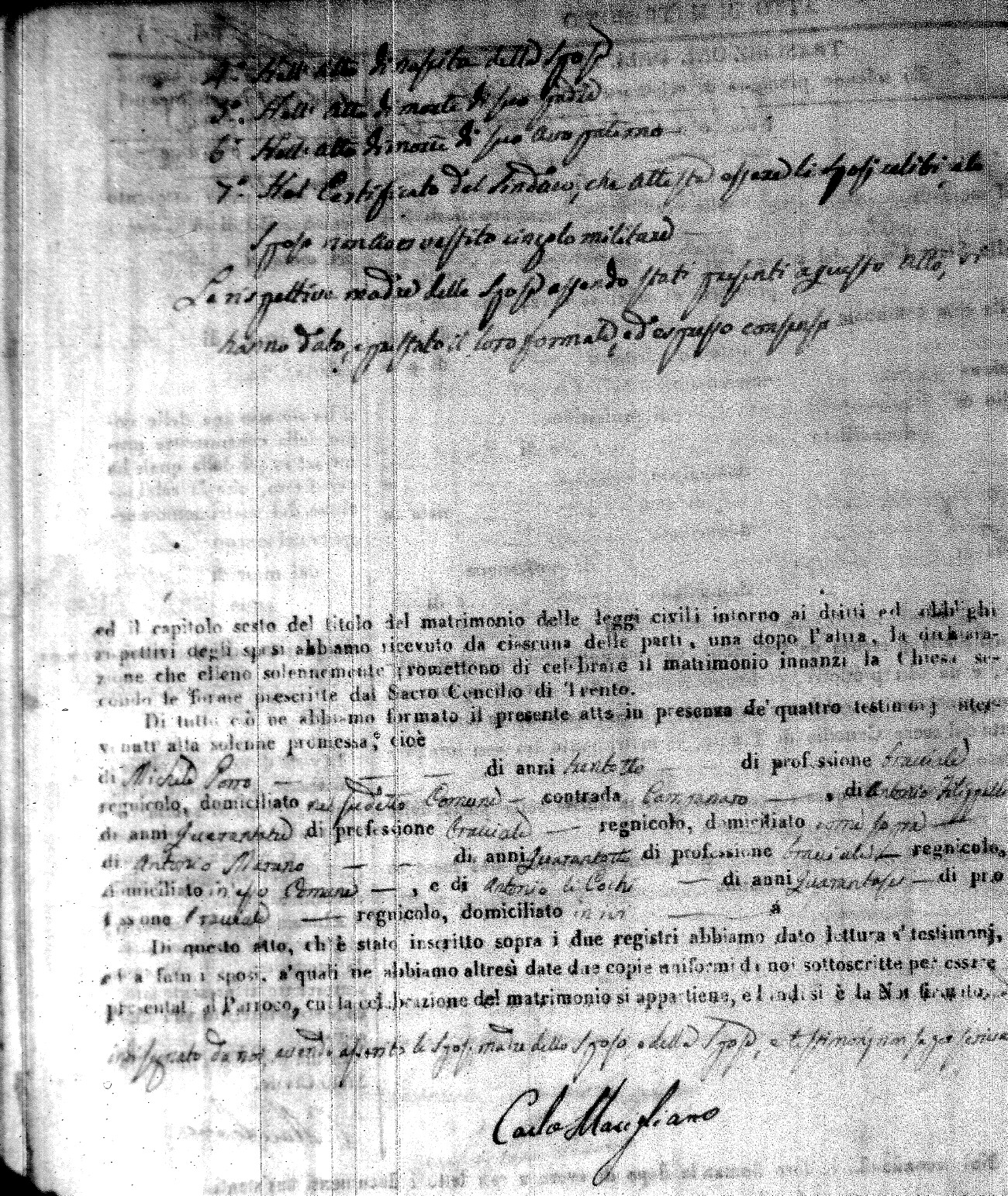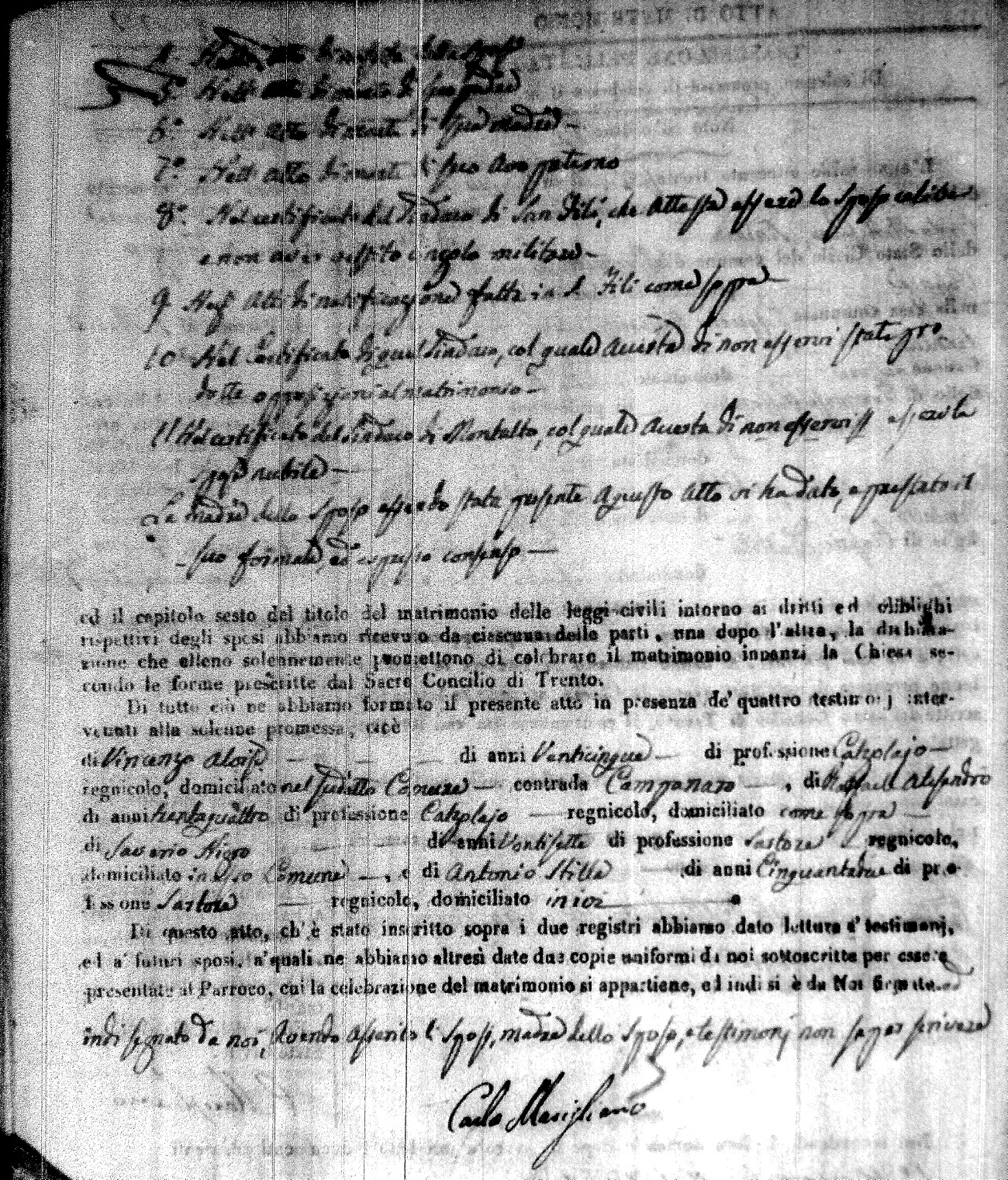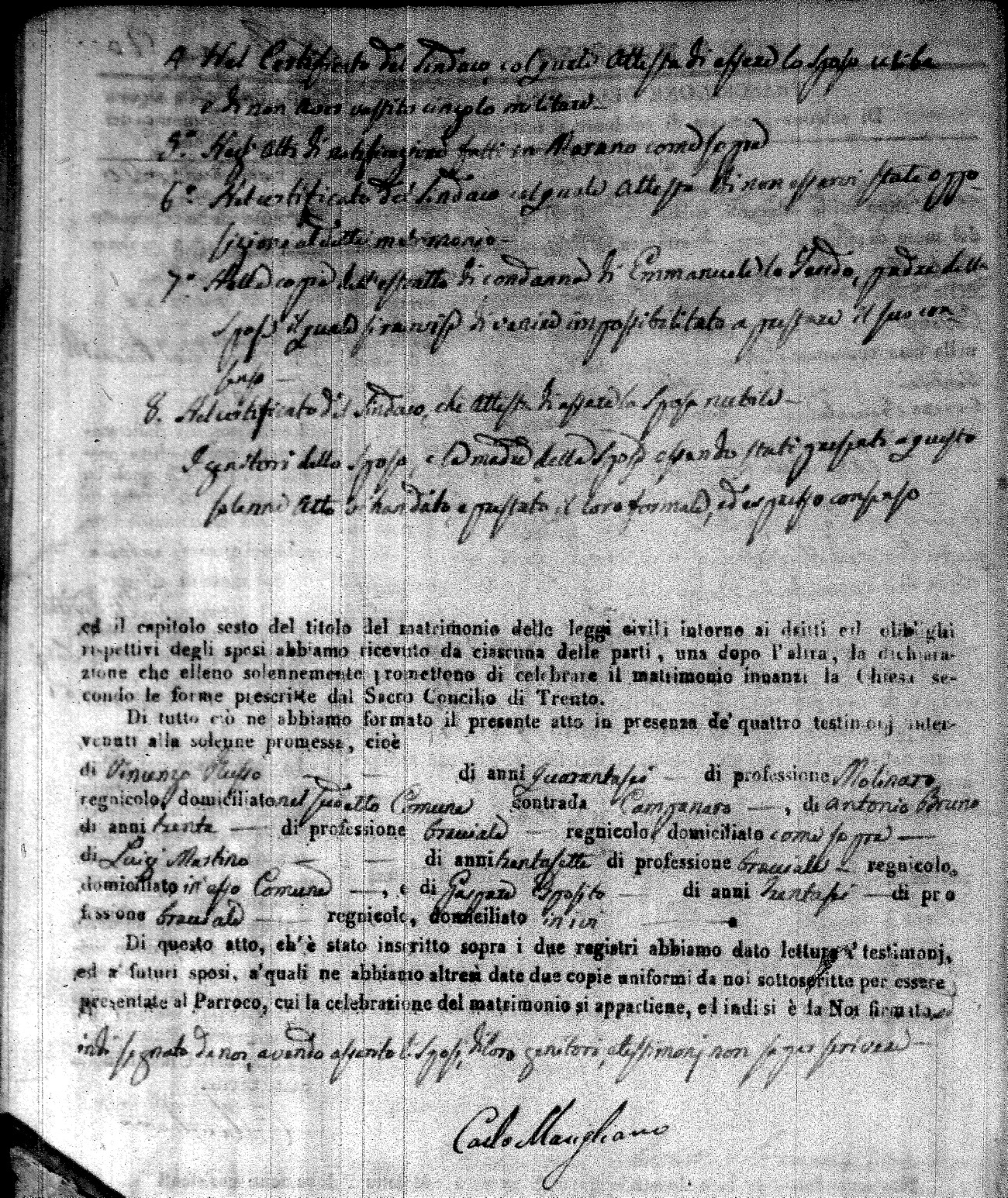 | Caraniolo | Matteo Benedetto Salvatore | Ferdinandp (fu) | Alimena | Maria Gaetana | Alimena | Anna Maria | Antonio (fu) | Barano | Violanta |