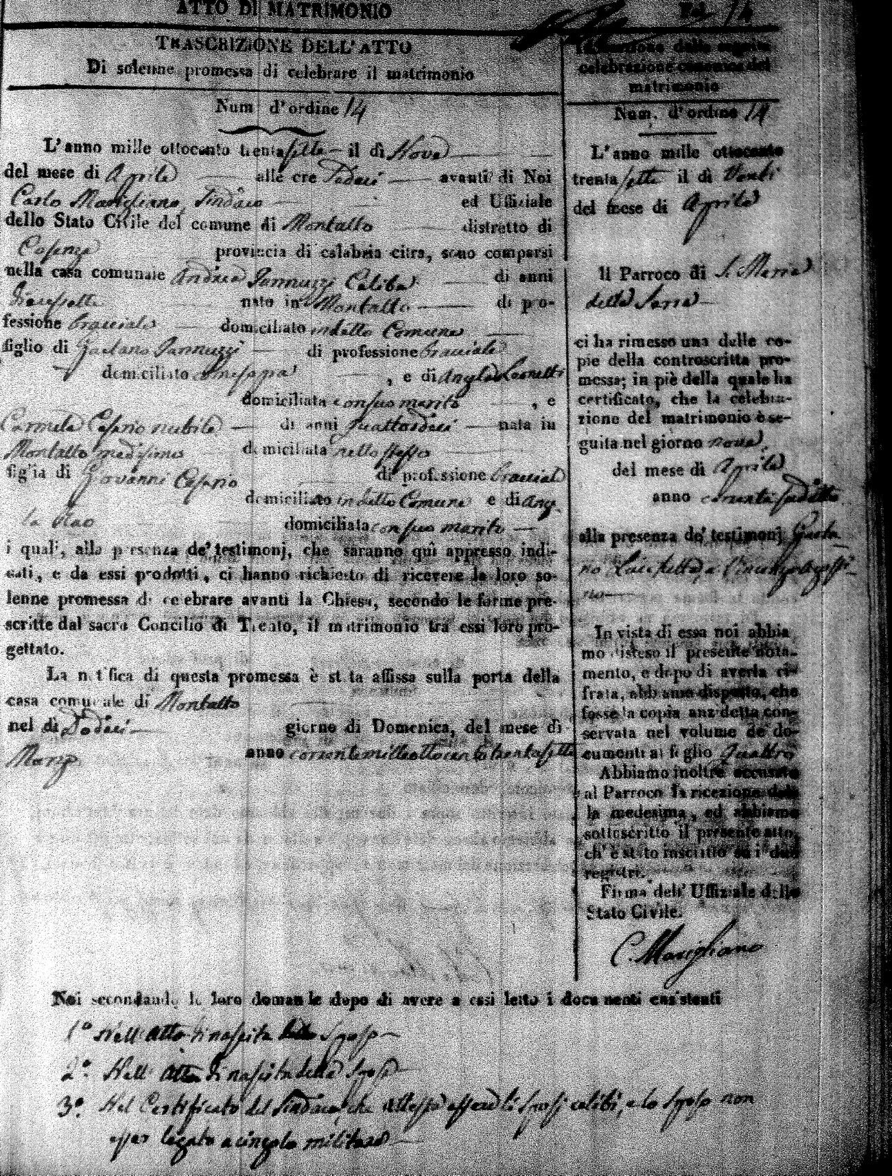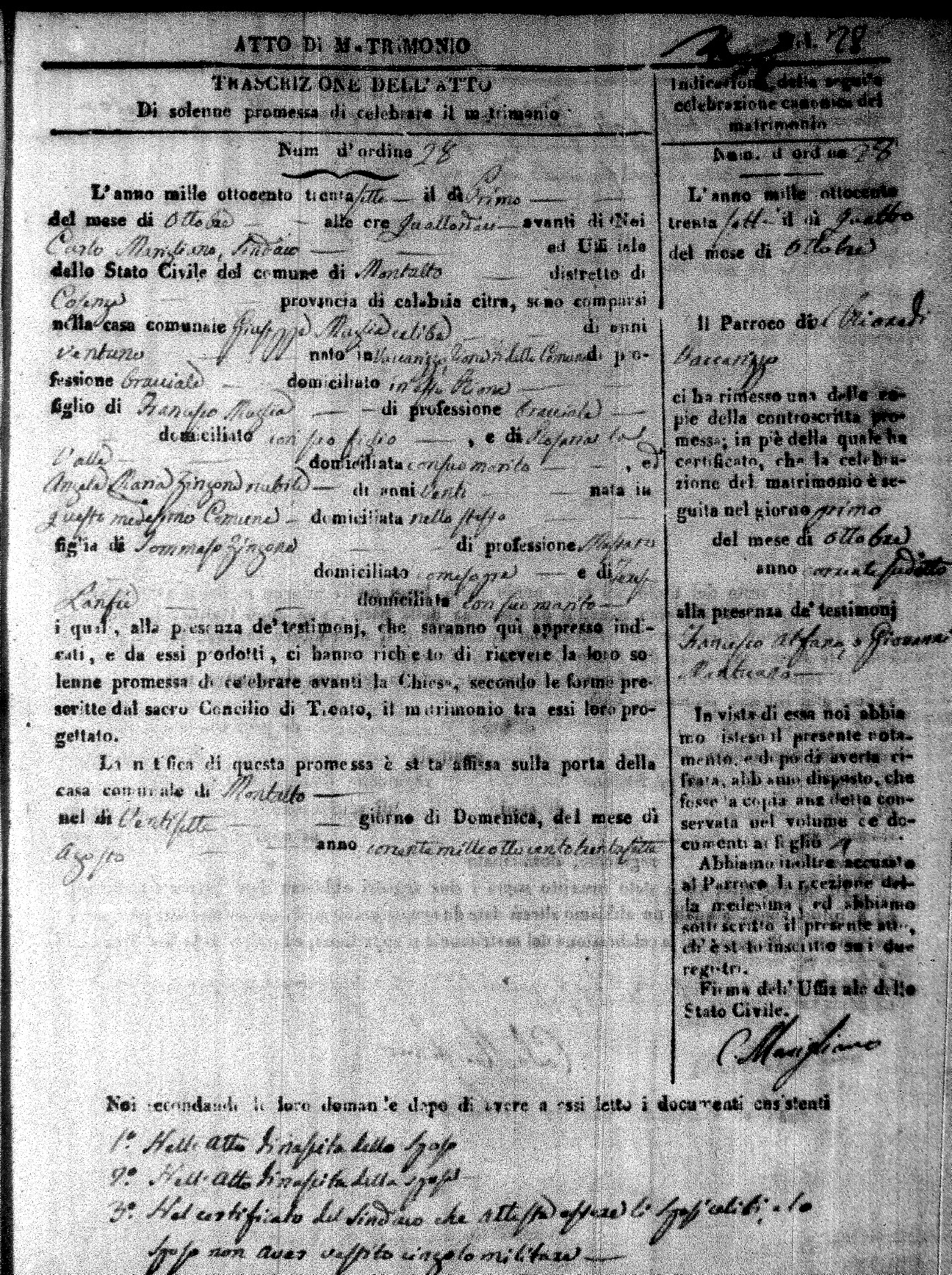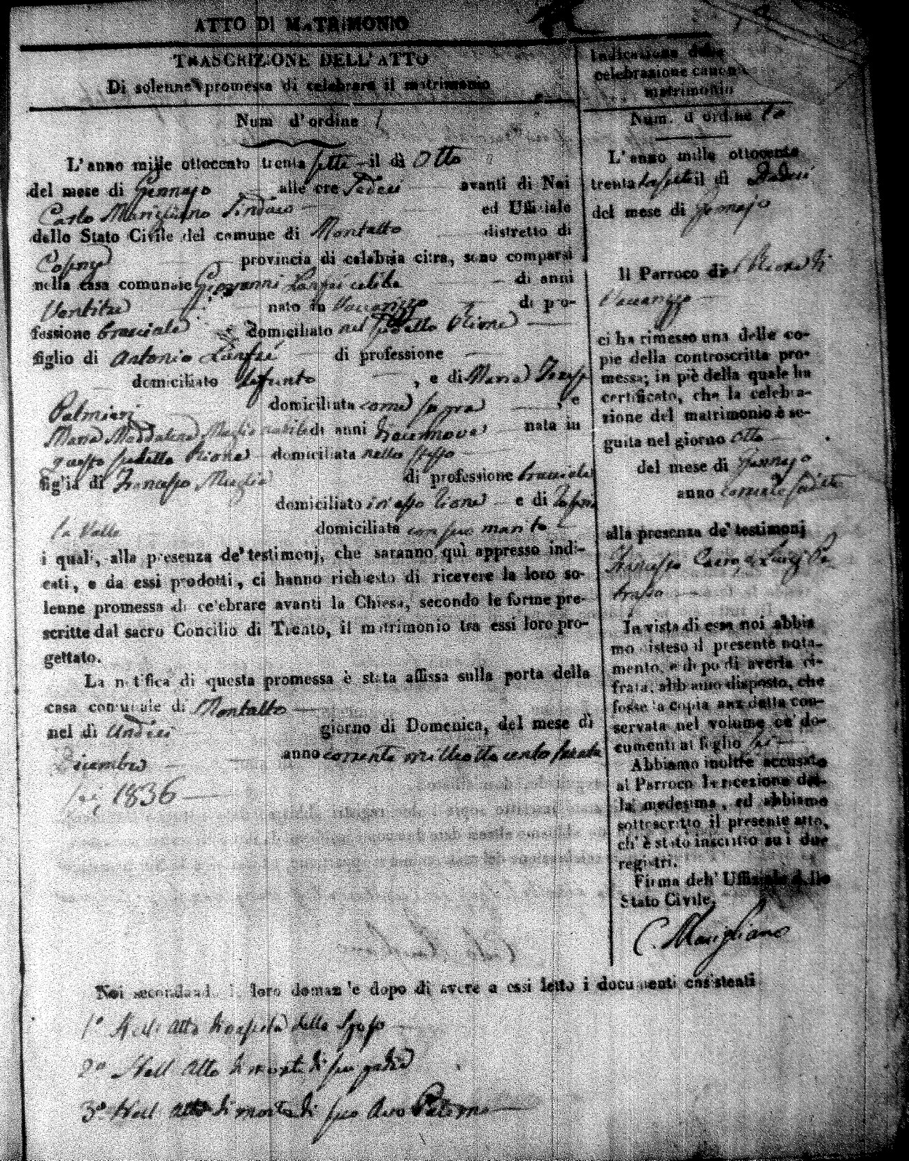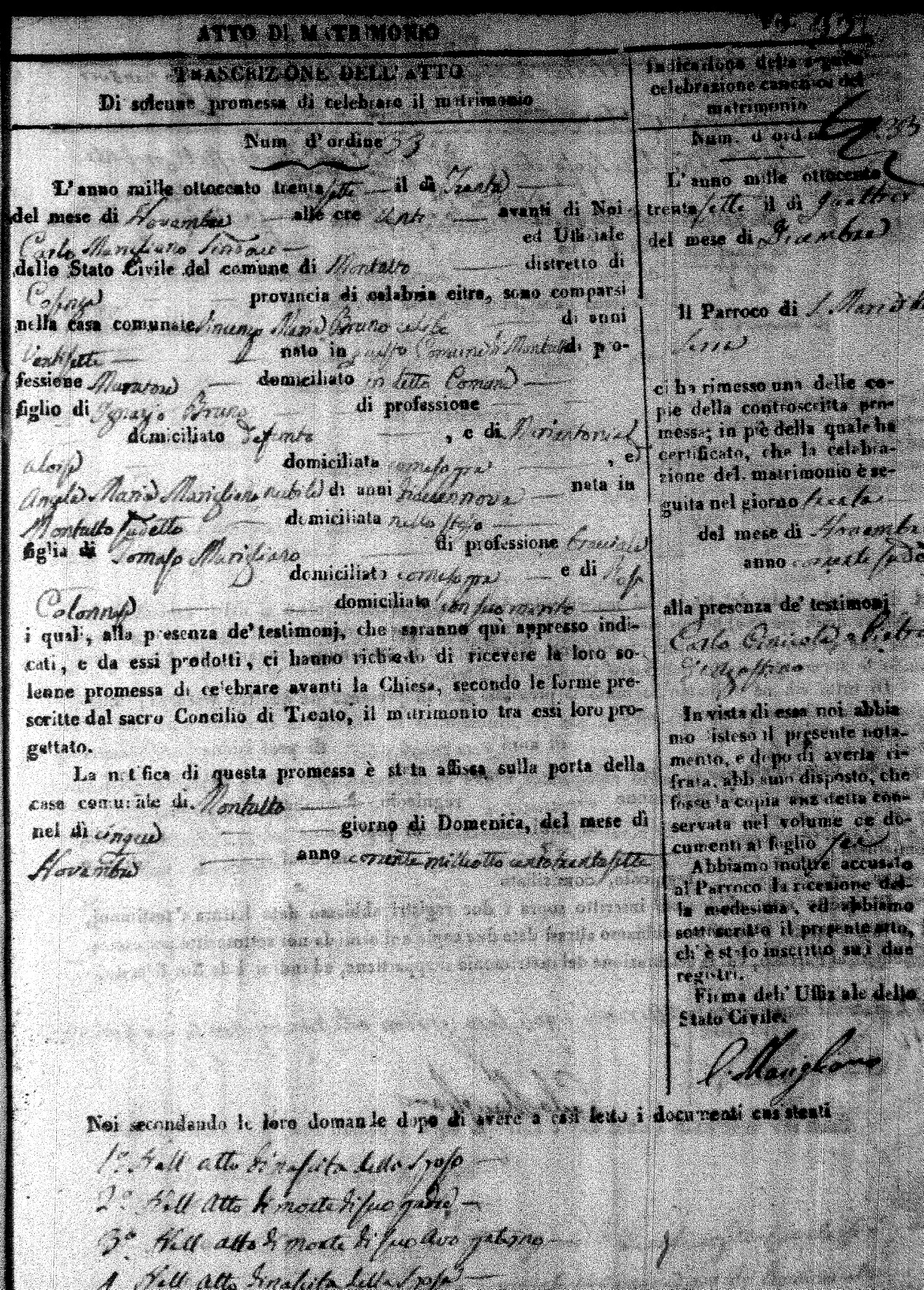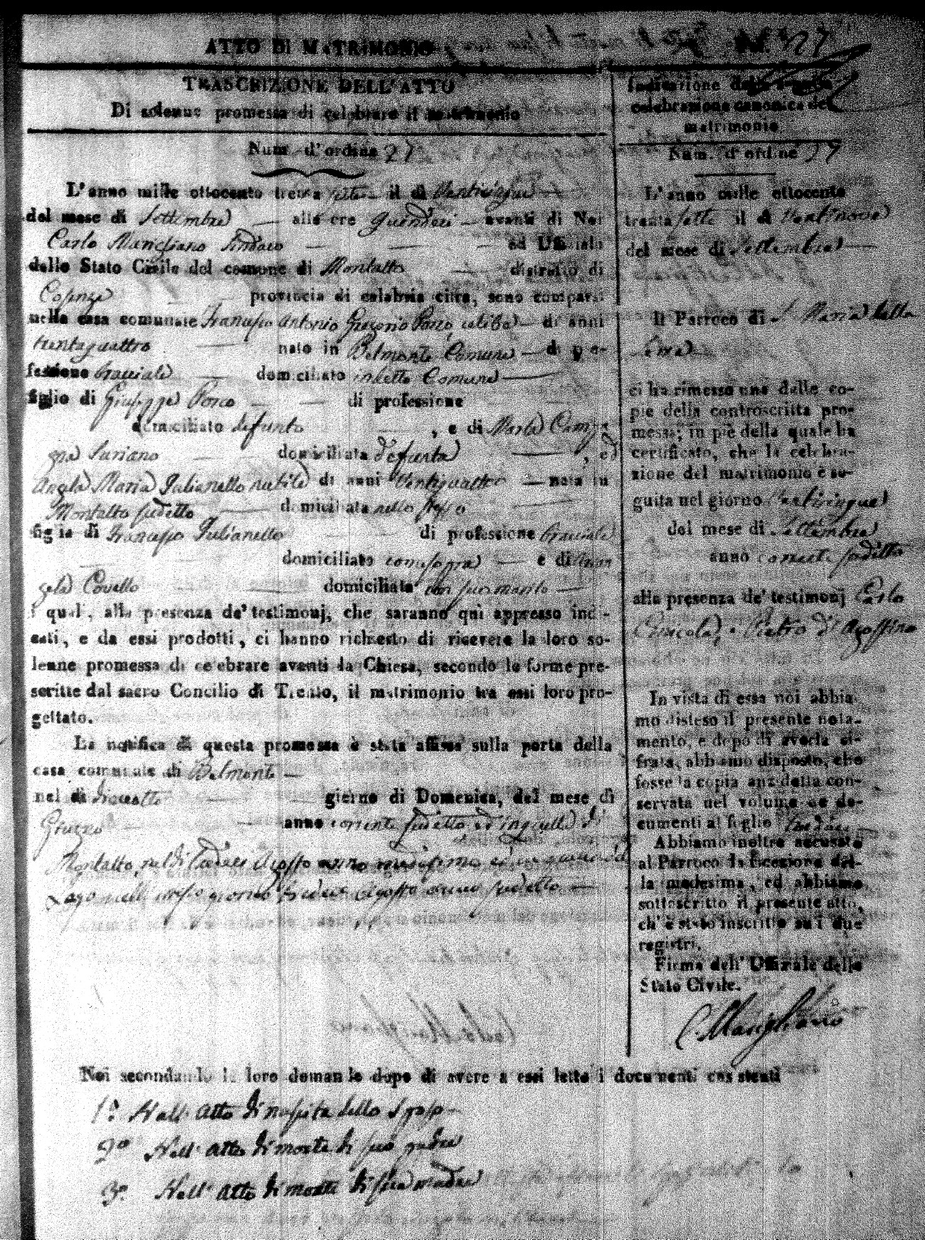 Here are the extractions for the marriage acts in 1837 for Montalto Uffugo. For more information, click on the groom's surname to view page 1 of the copy of the original document and his first name to view page 2.