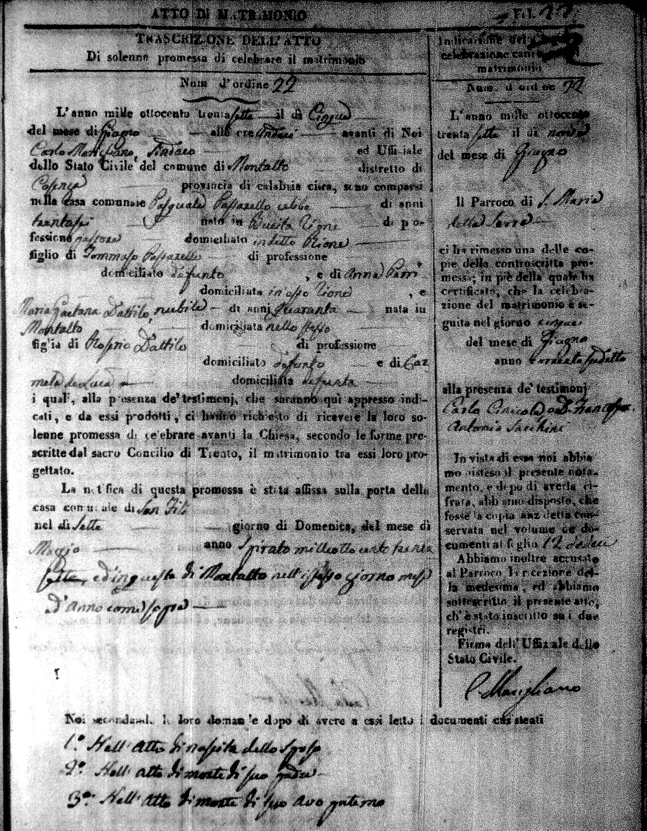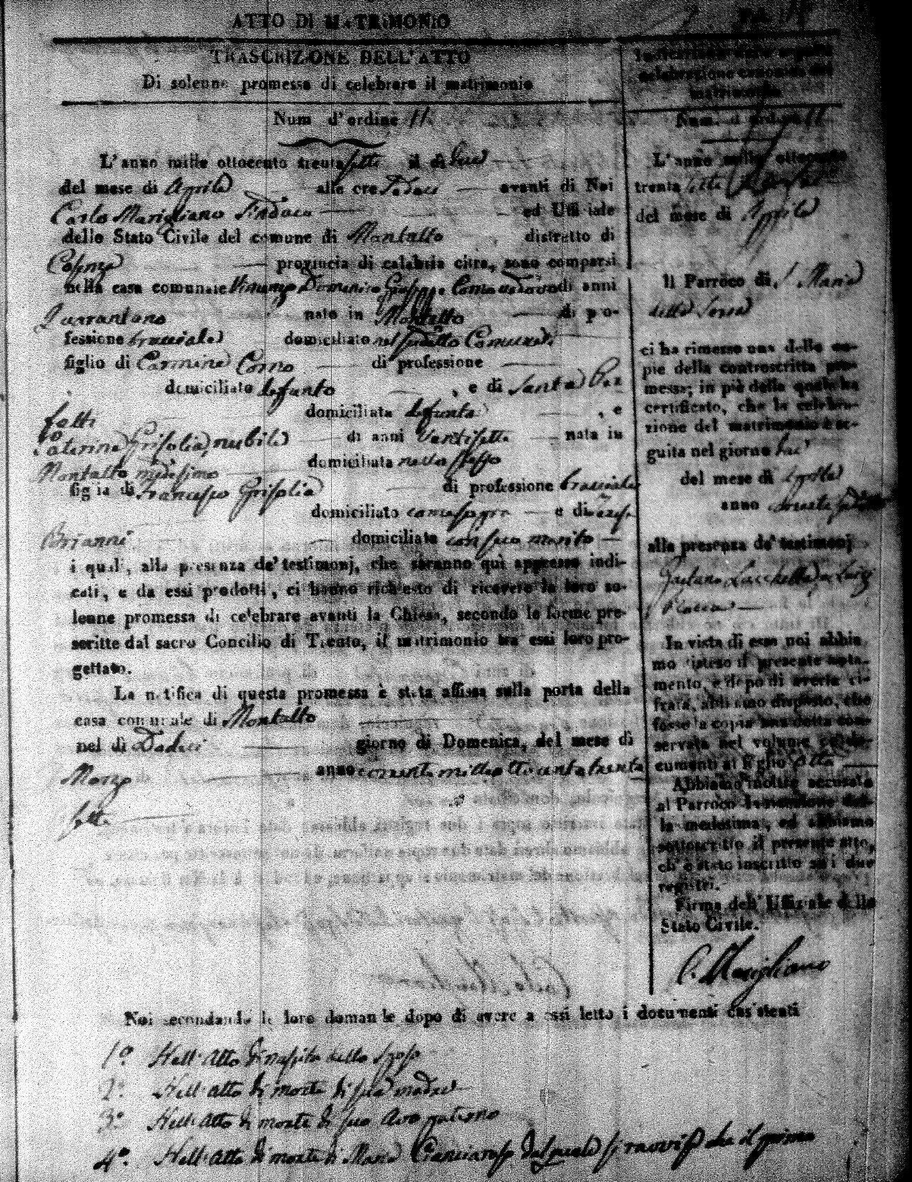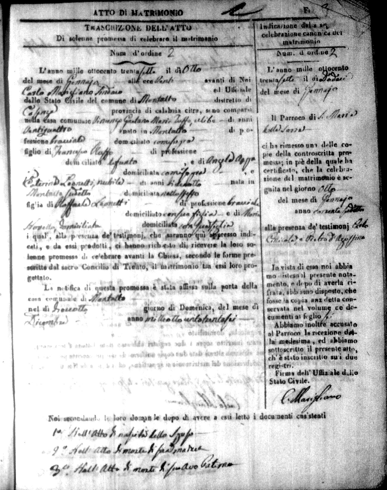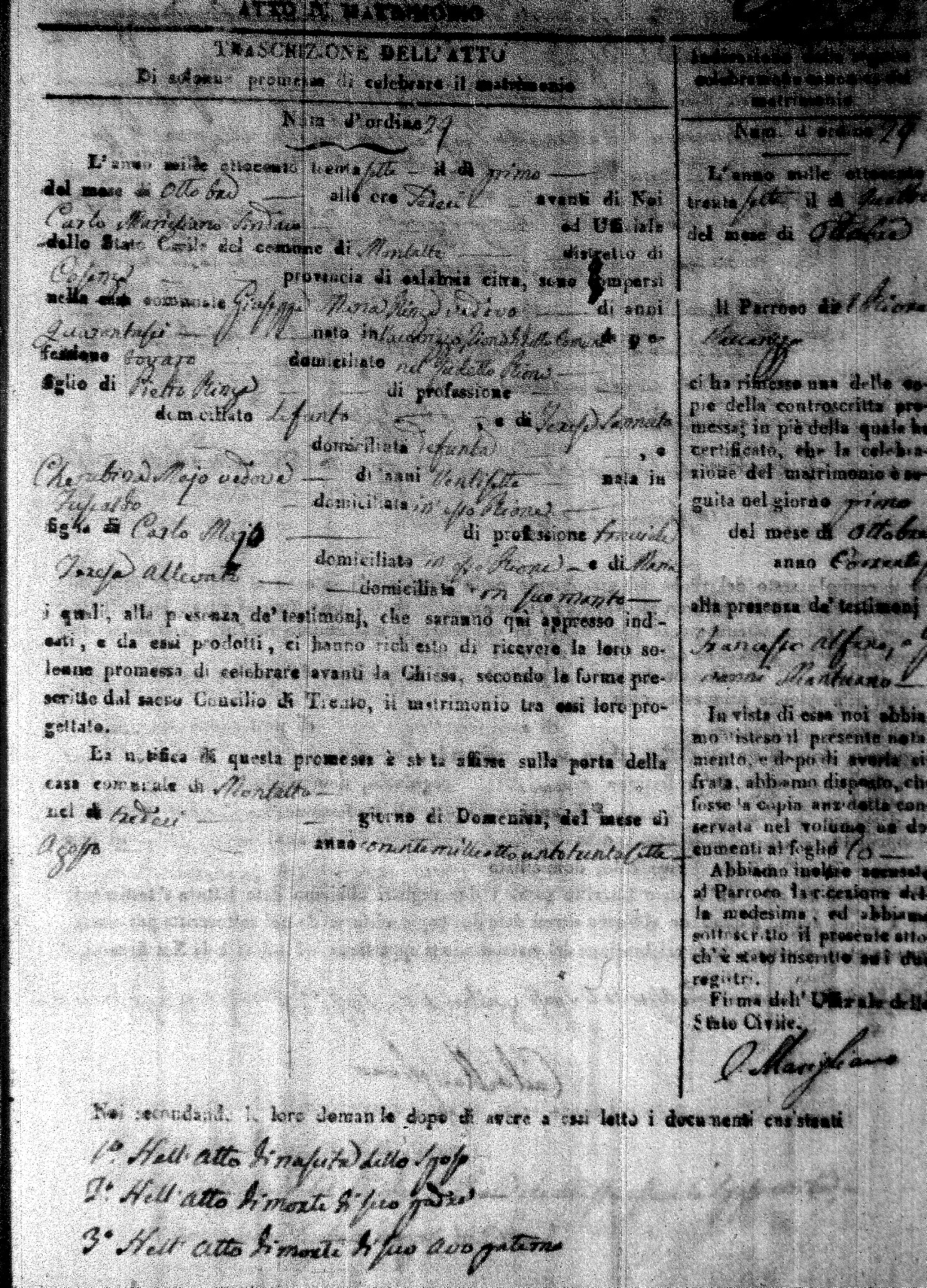 Here are the extractions for the marriage acts in 1837 for Montalto Uffugo. For more information, click on the groom's surname to view page 1 of the copy of the original document and his first name to view page 2.