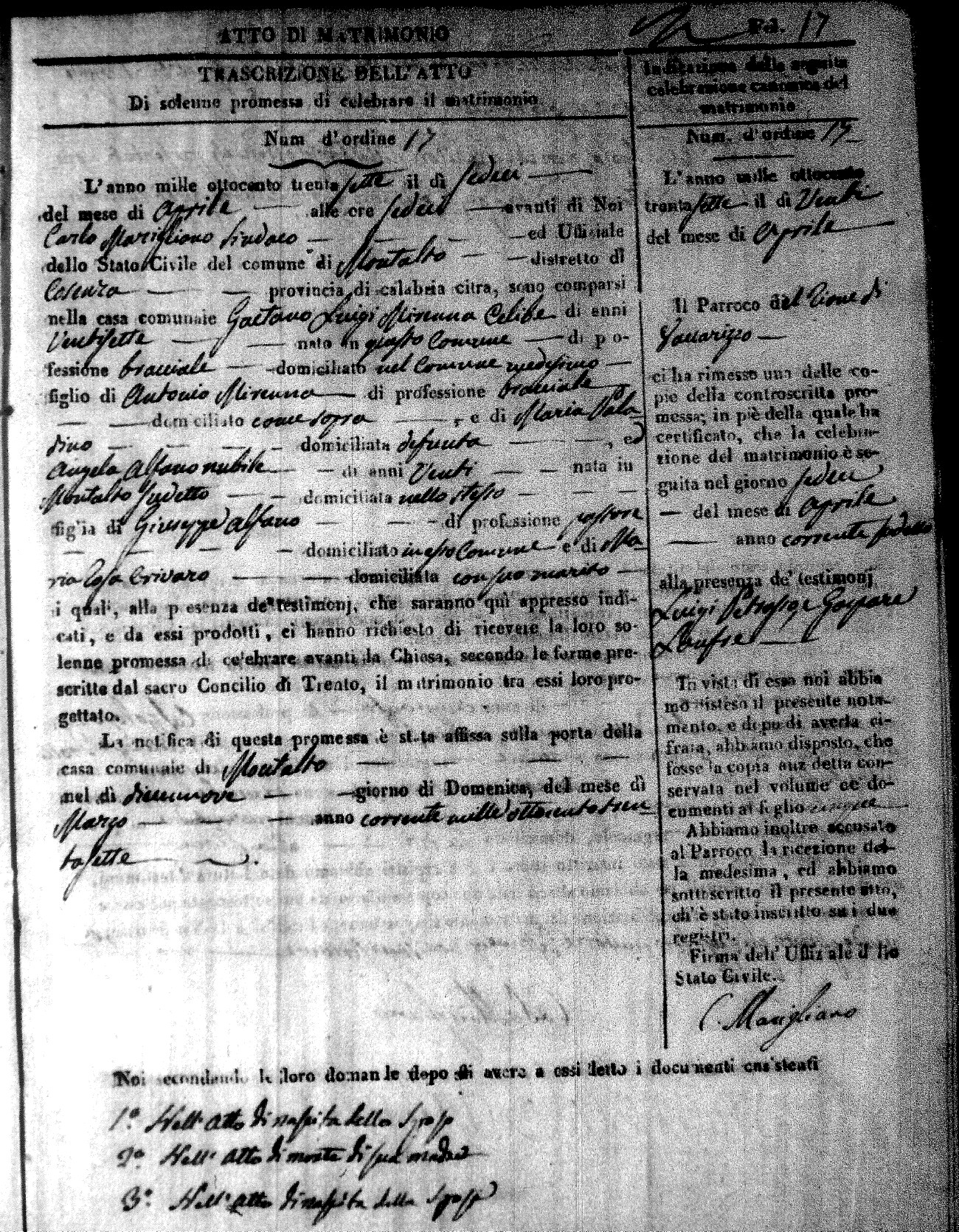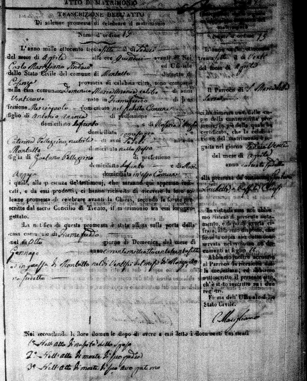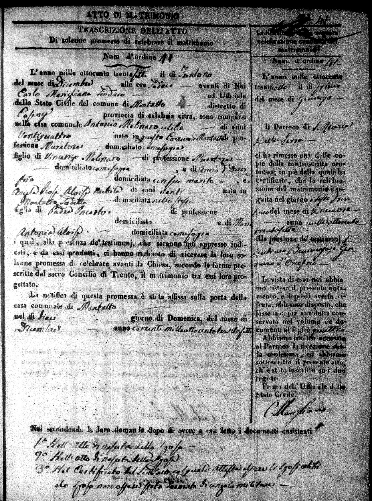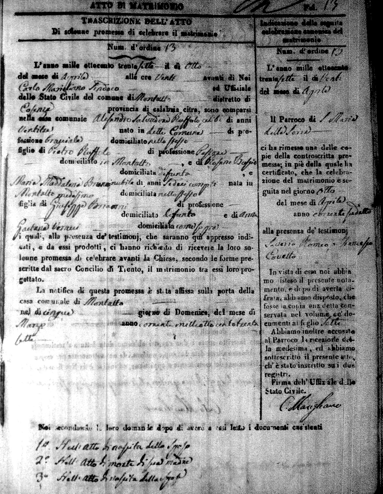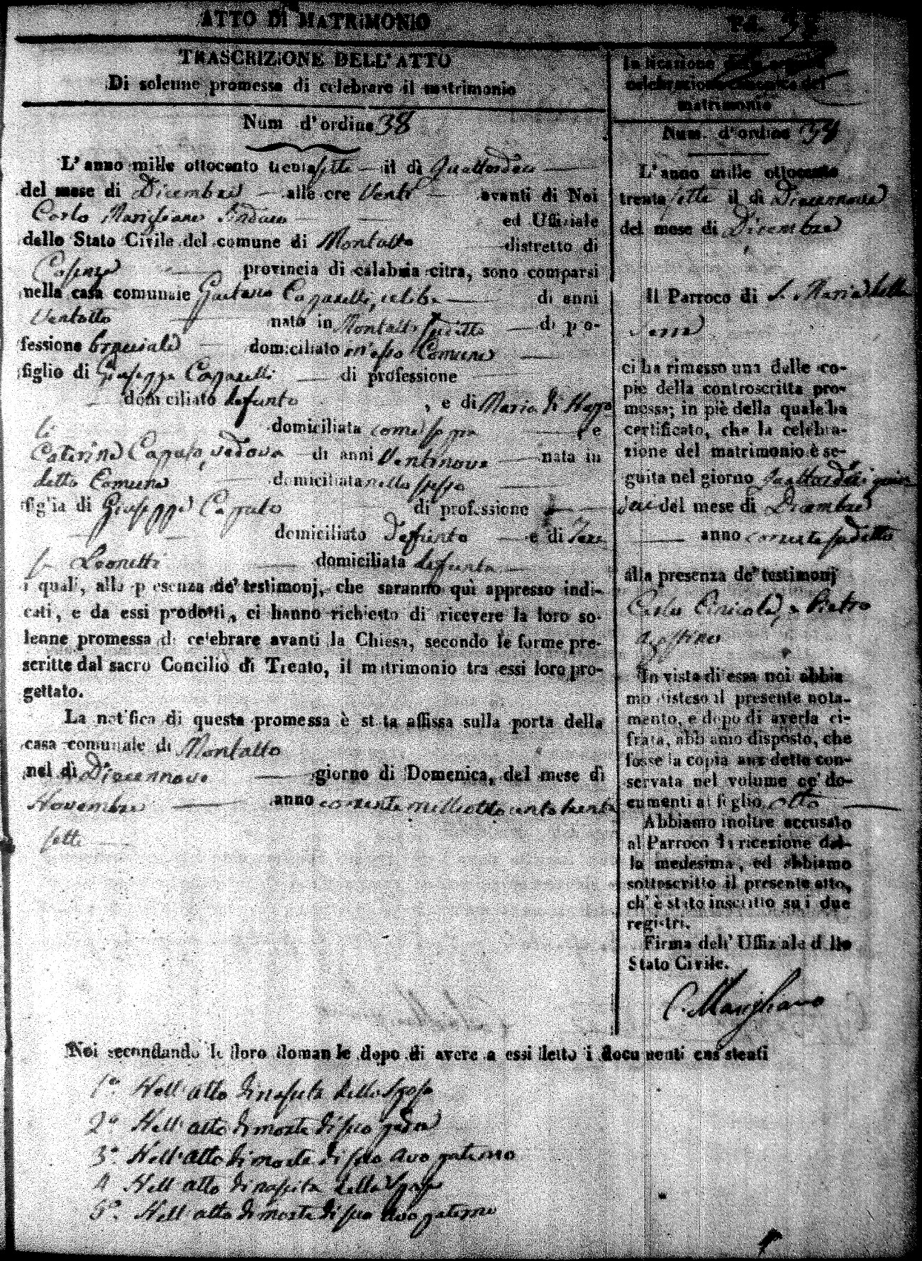 Here are the extractions for the marriage acts in 1837 for Montalto Uffugo. For more information, click on the groom's surname to view page 1 of the copy of the original document and his first name to view page 2.