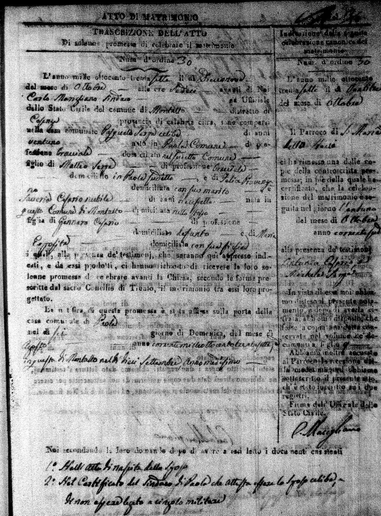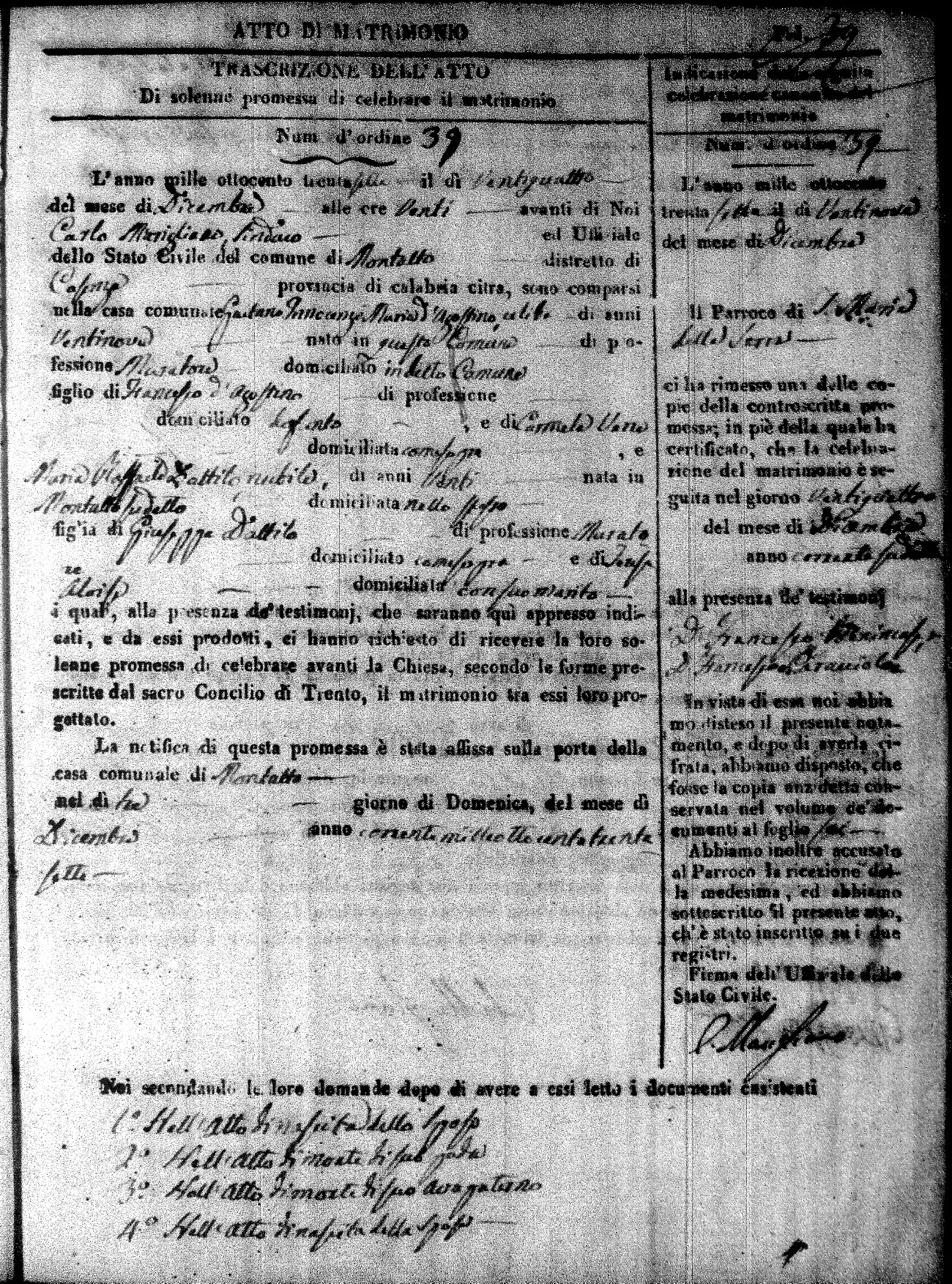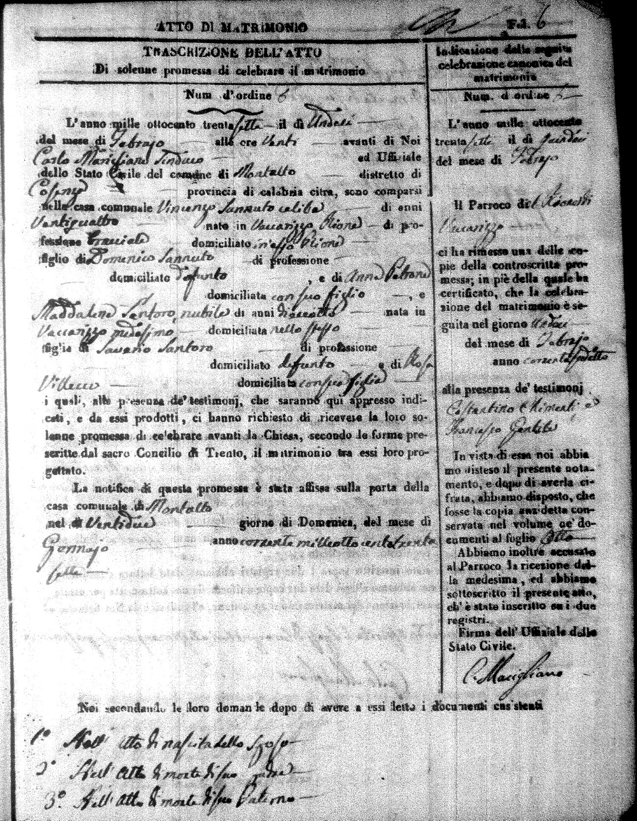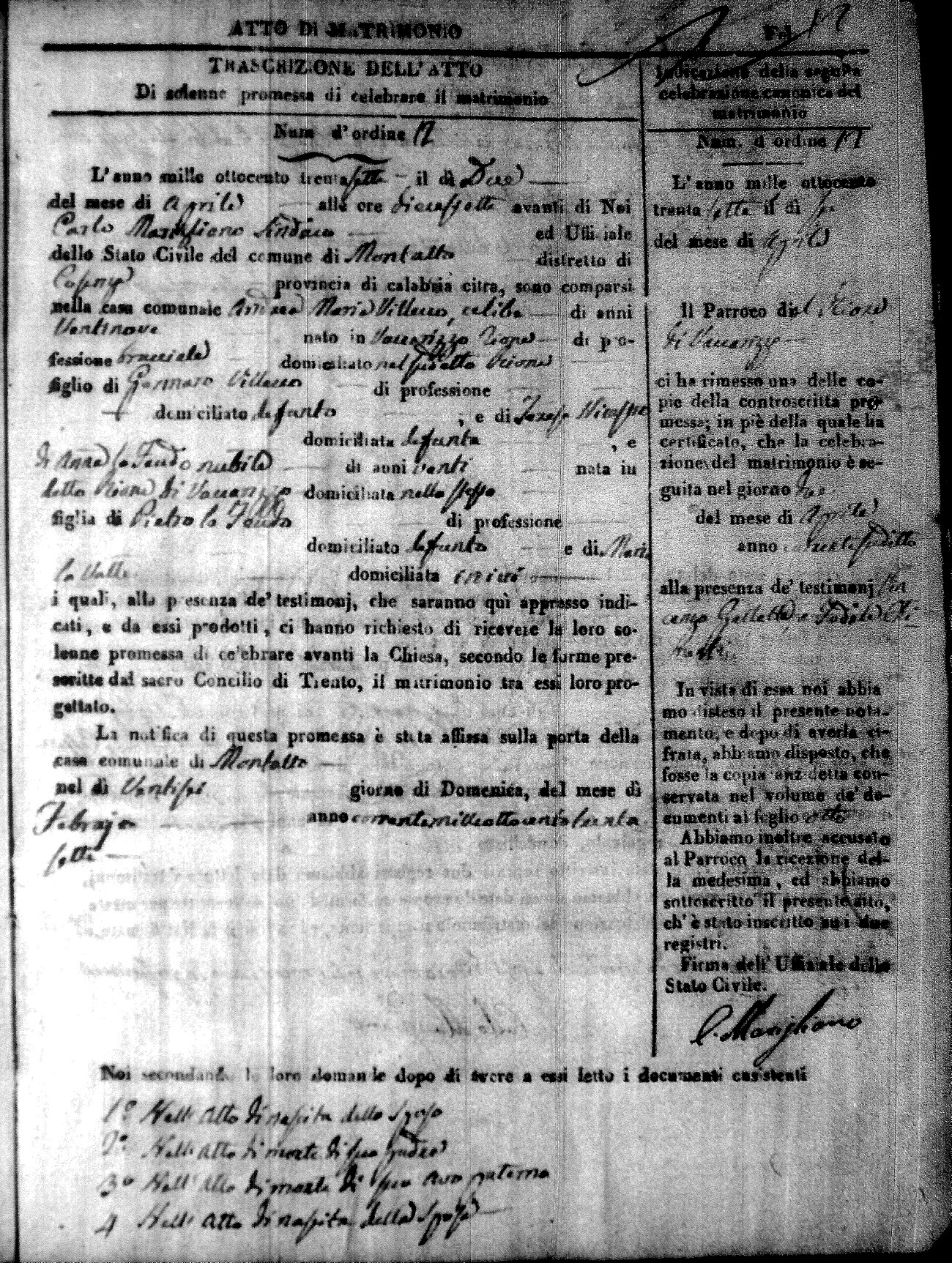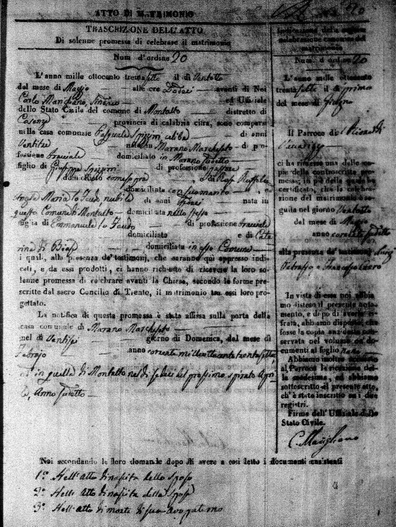 Here are the extractions for the marriage acts in 1837 for Montalto Uffugo. For more information, click on the groom's surname to view page 1 of the copy of the original document and his first name to view page 2.