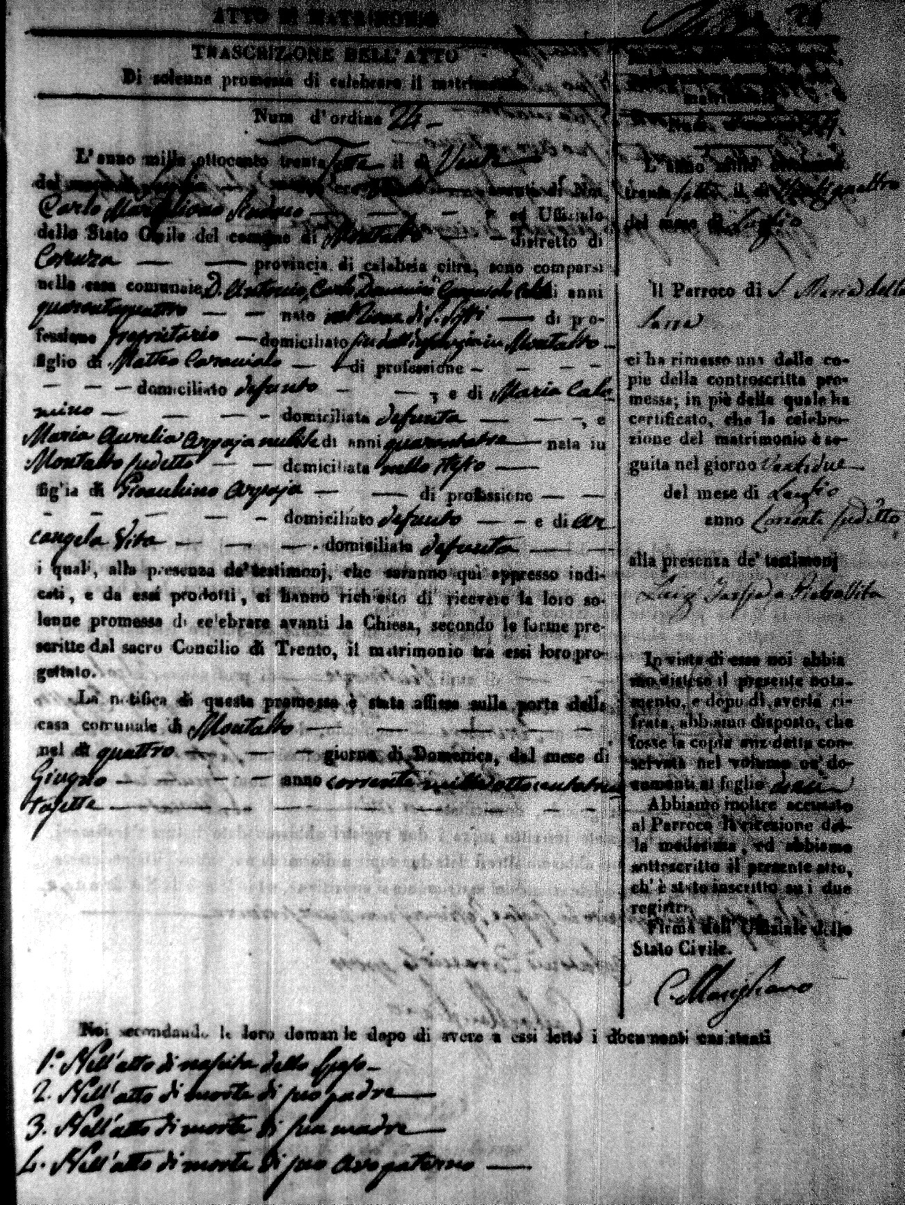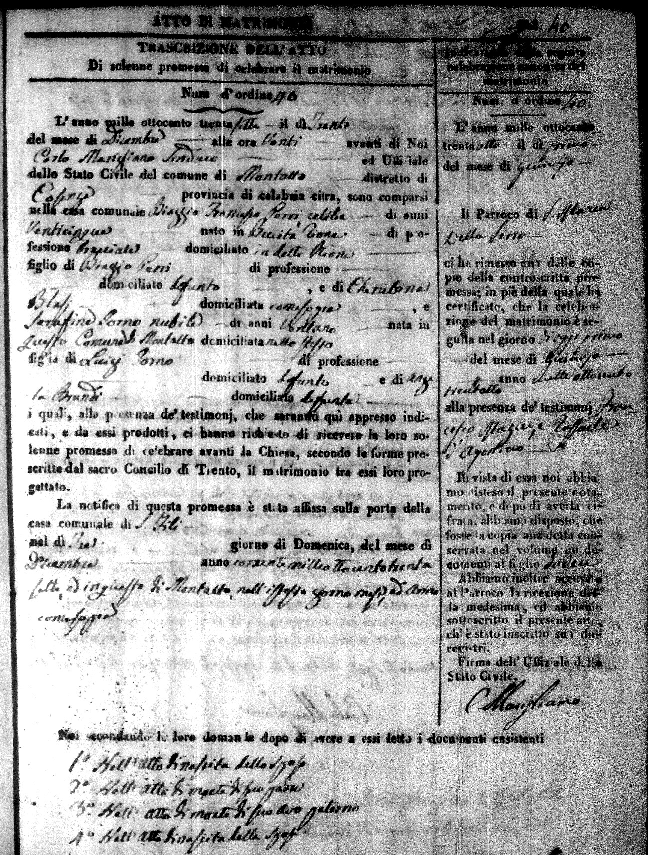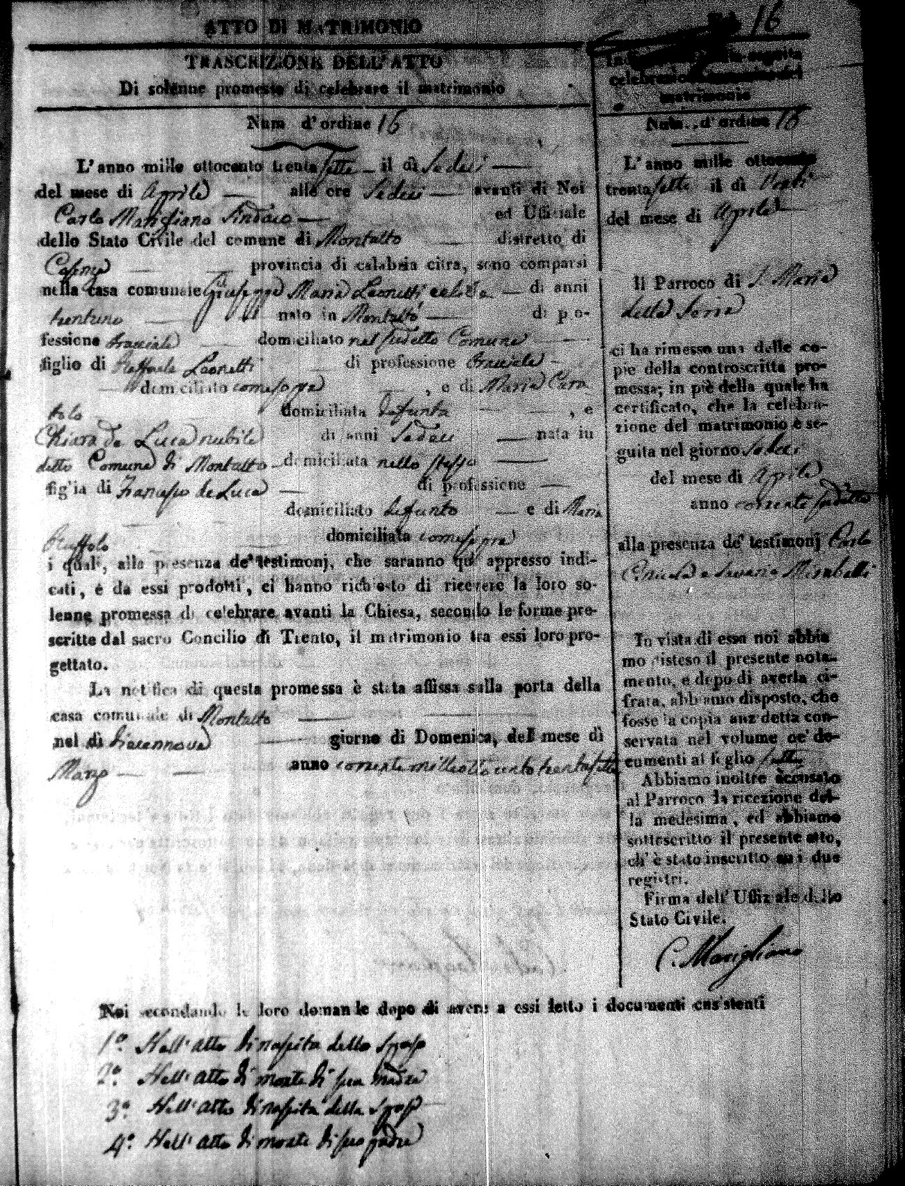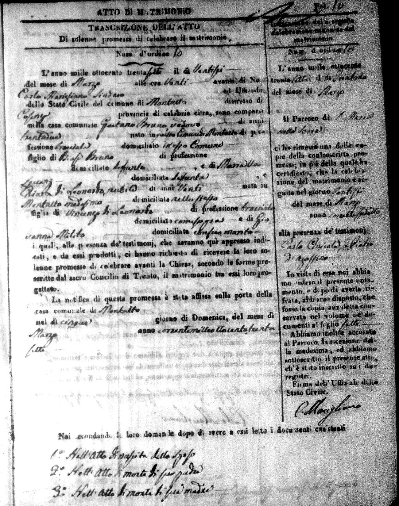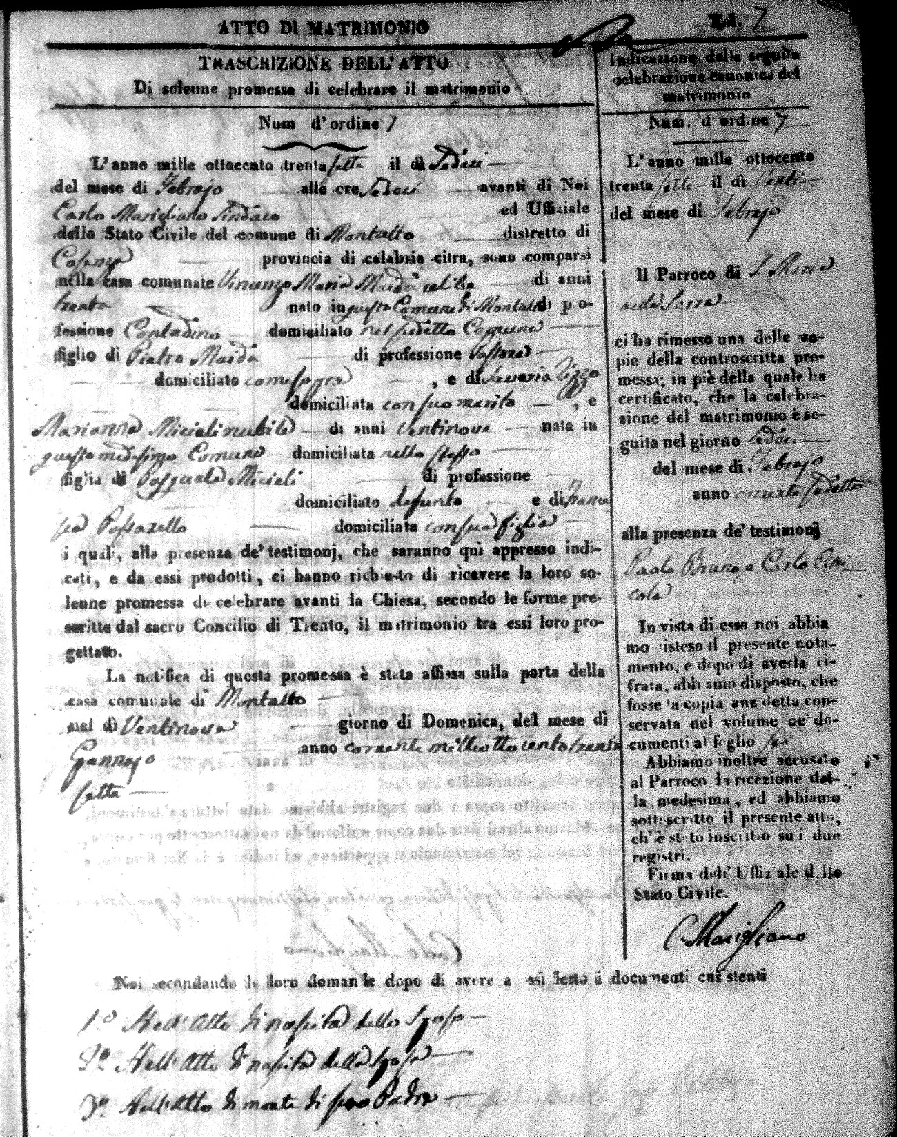 Here are the extractions for the marriage acts in 1837 for Montalto Uffugo. For more information, click on the groom's surname to view page 1 of the copy of the original document and his first name to view page 2.