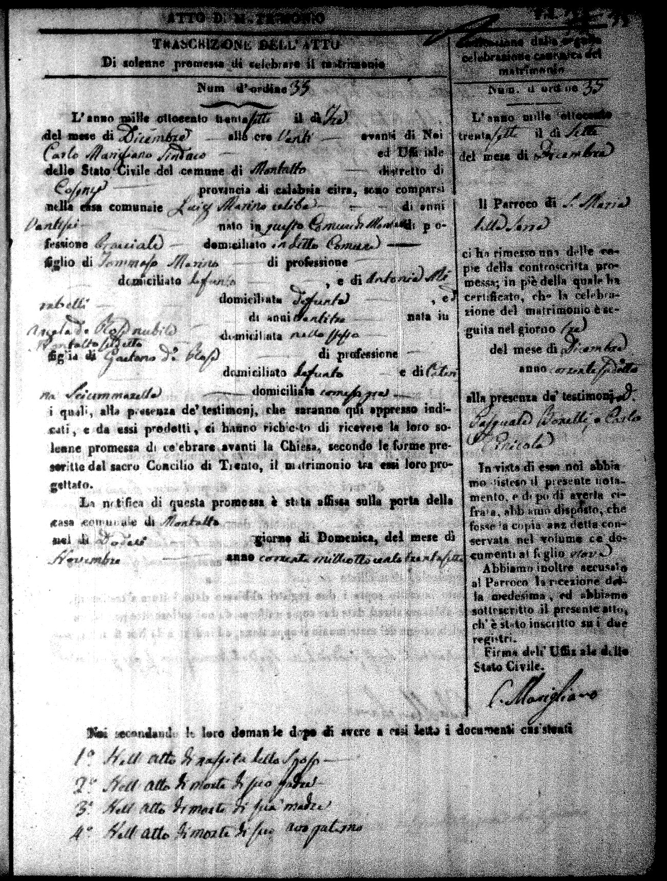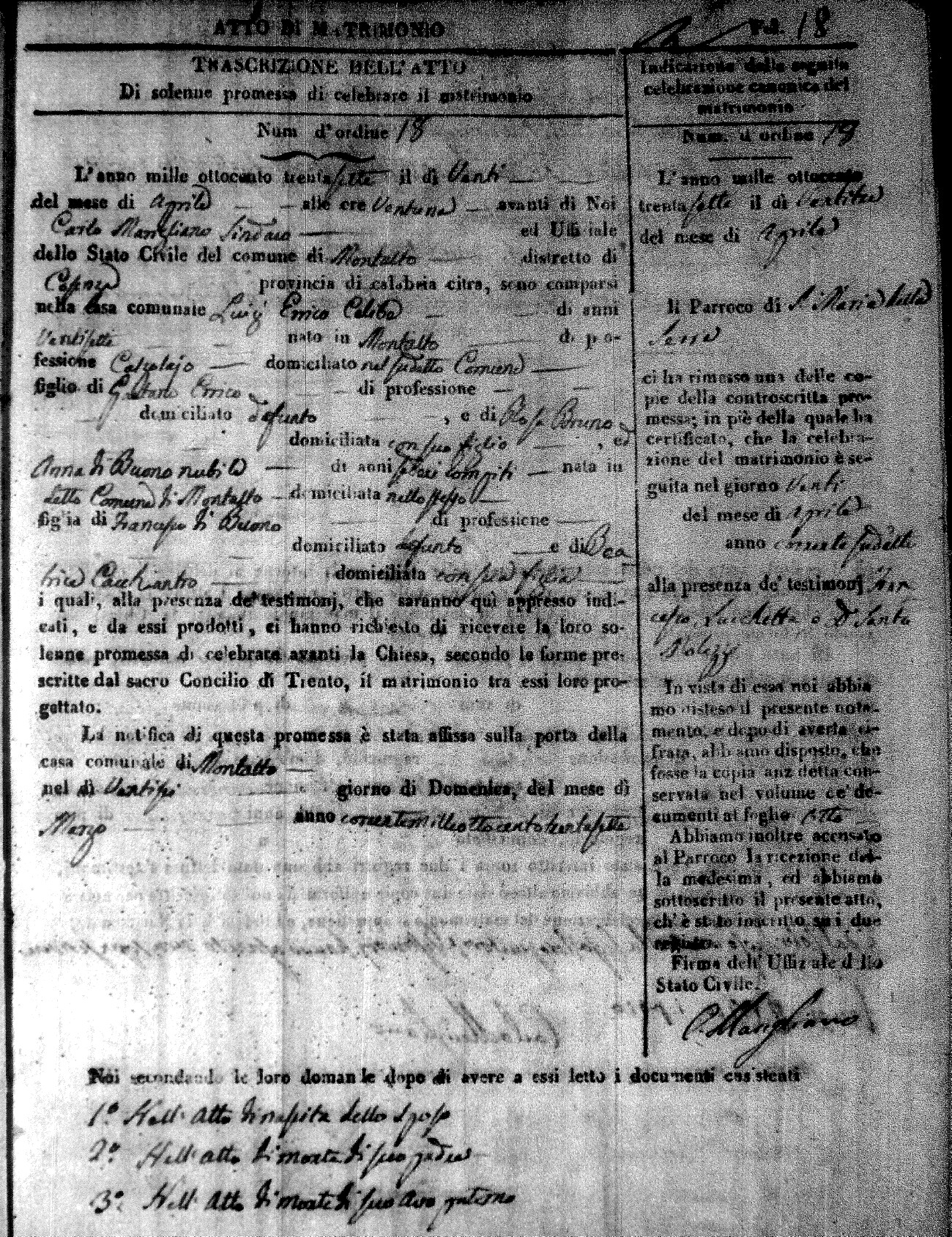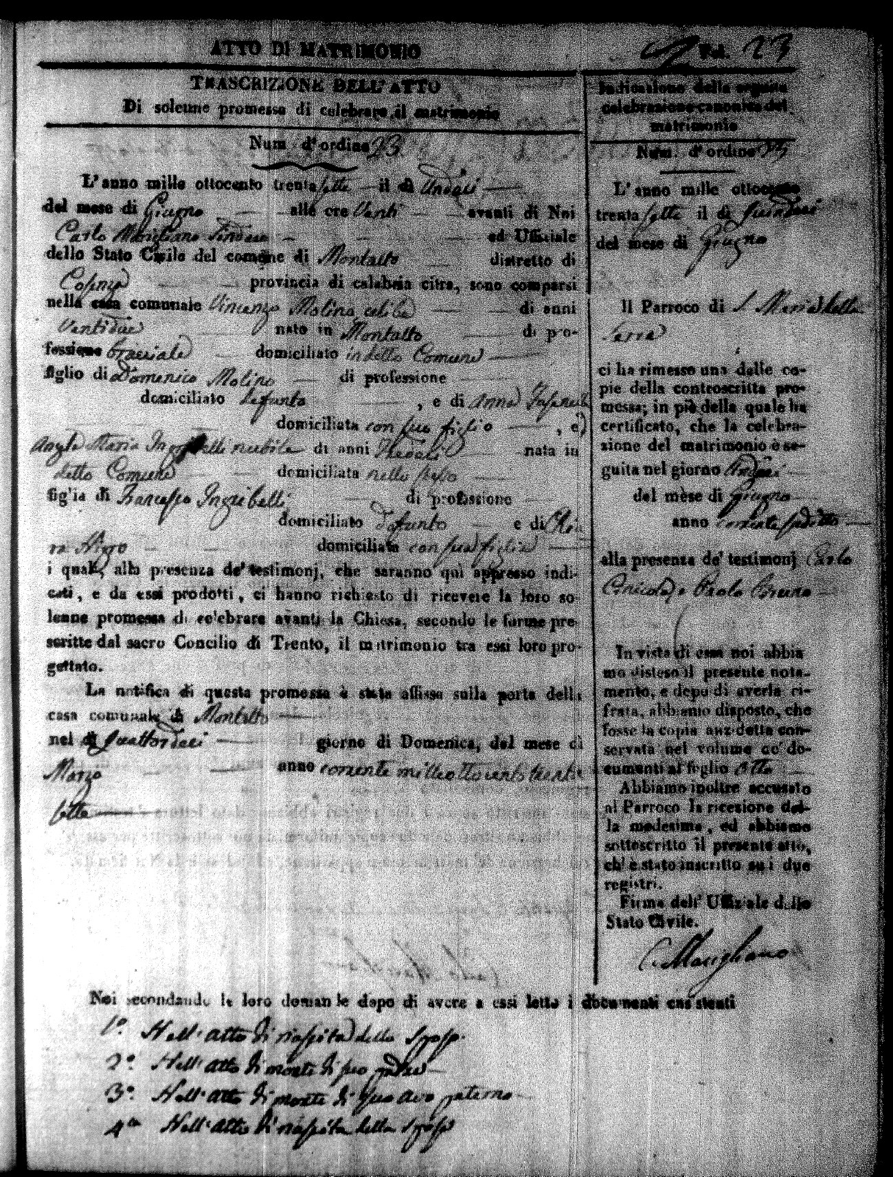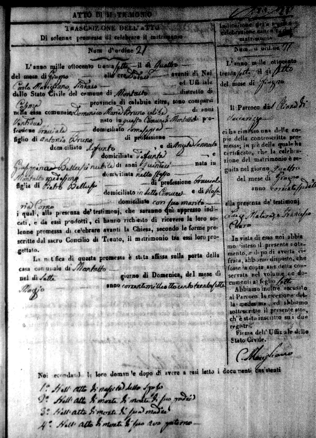 Here are the extractions for the marriage acts in 1837 for Montalto Uffugo. For more information, click on the groom's surname to view page 1 of the copy of the original document and his first name to view page 2.