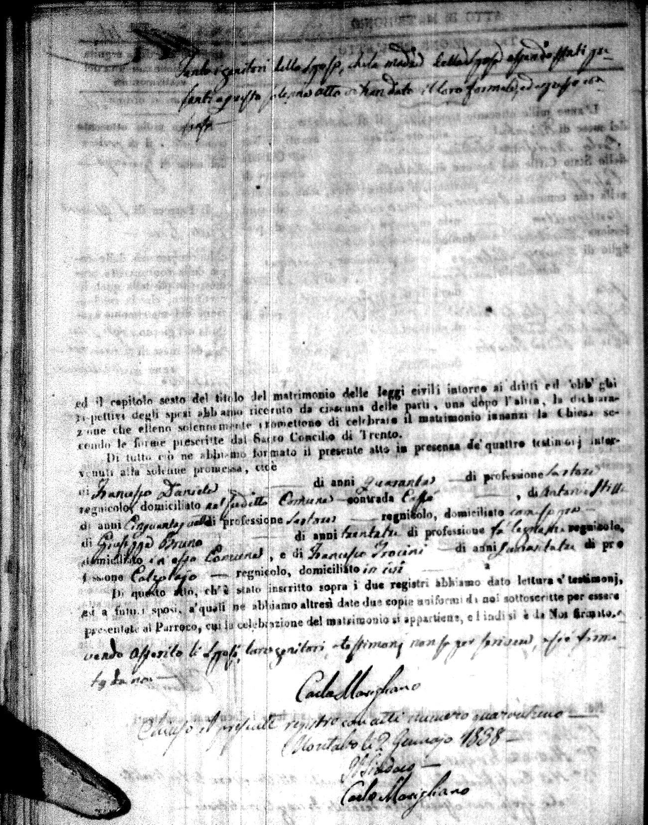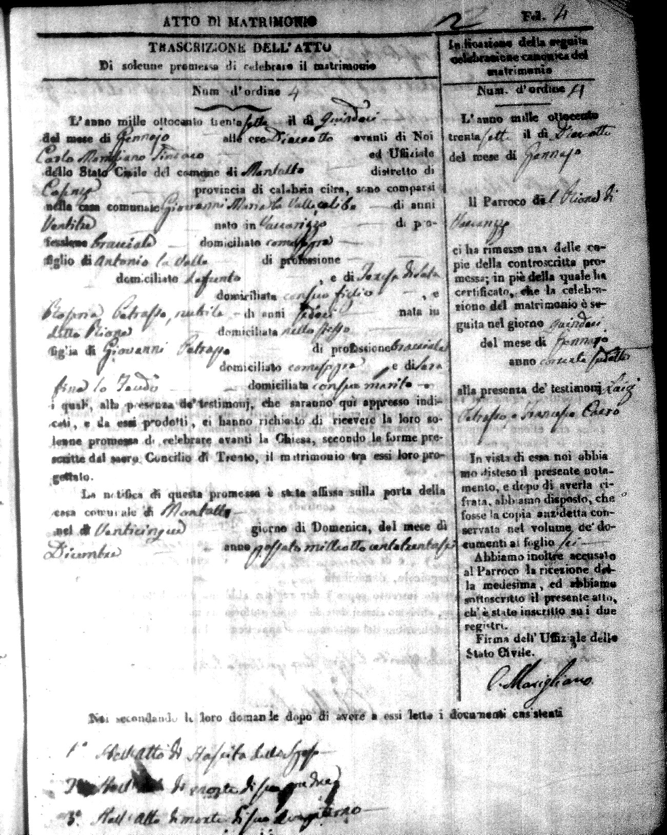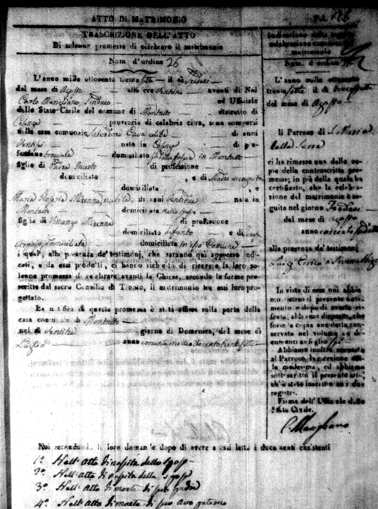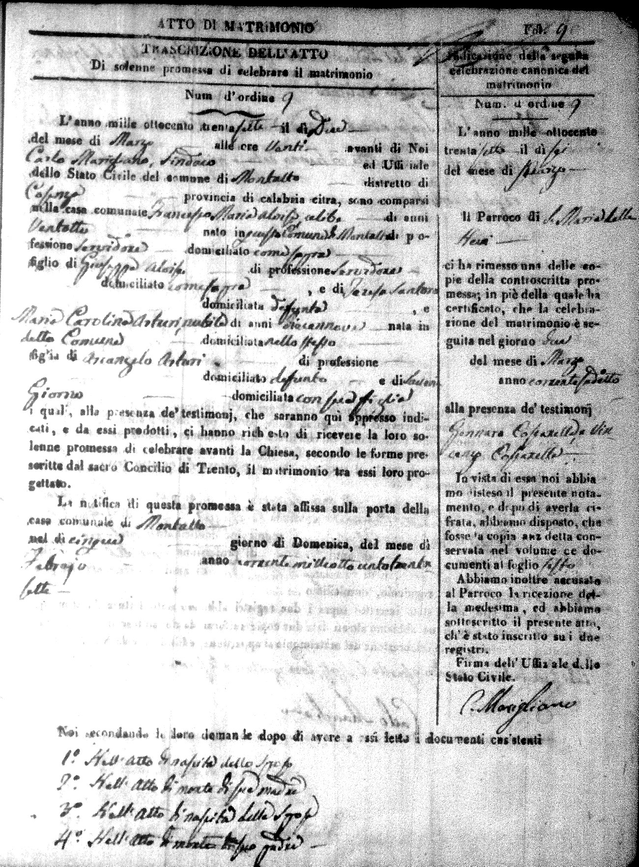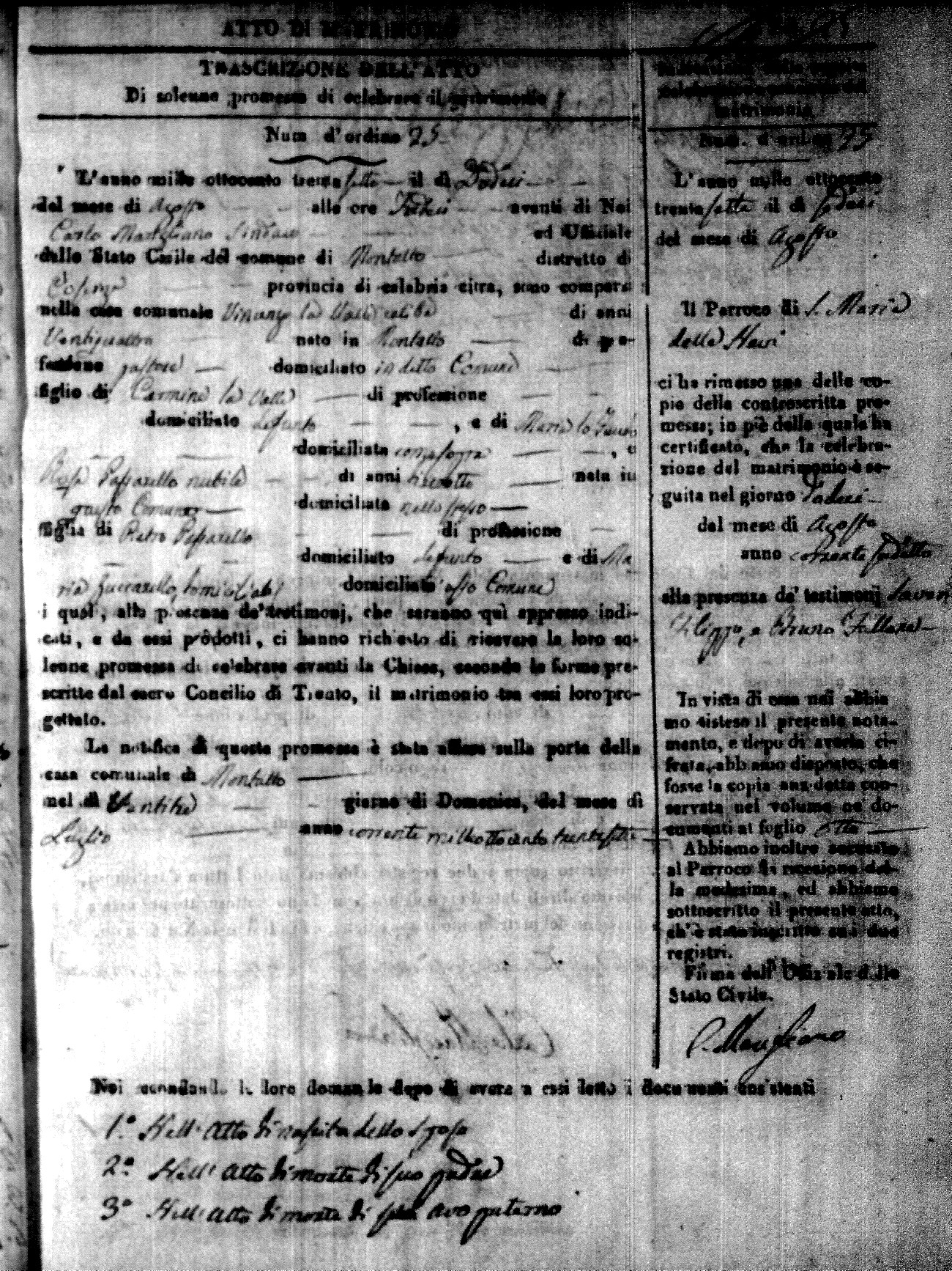 Here are the extractions for the marriage acts in 1837 for Montalto Uffugo. For more information, click on the groom's surname to view page 1 of the copy of the original document and his first name to view page 2.